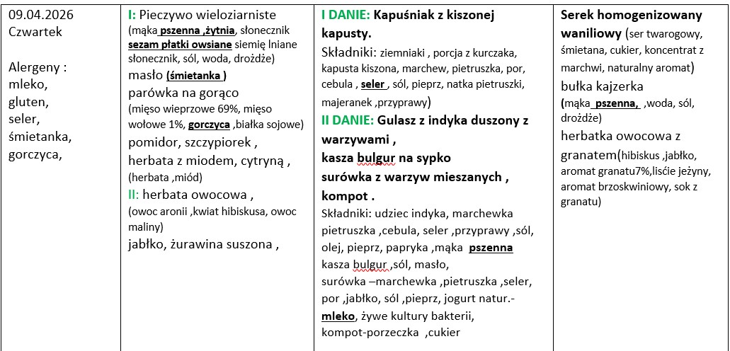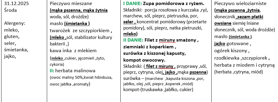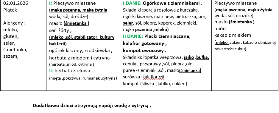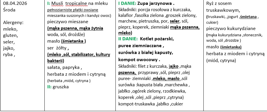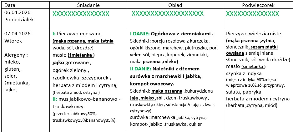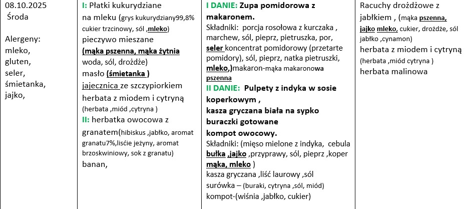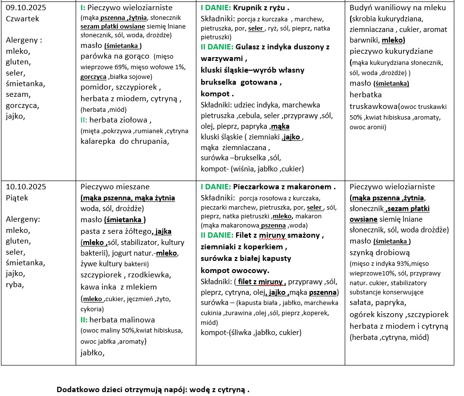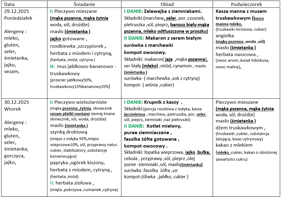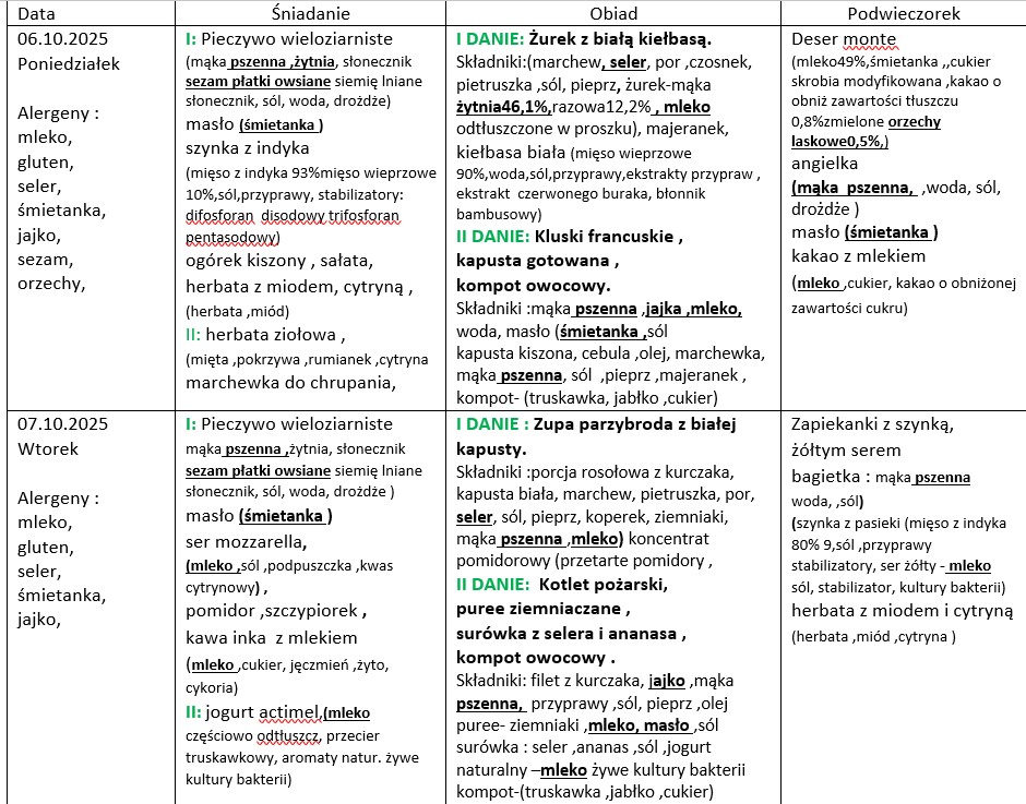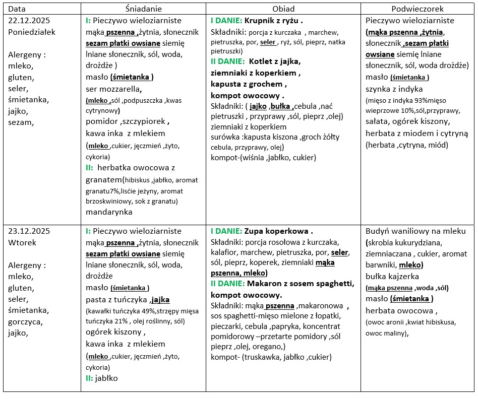 Cyfry umieszczone pod każdym posiłkiem odpowiadają numerom alergenów umieszczonych na liście obok jadłospisu.