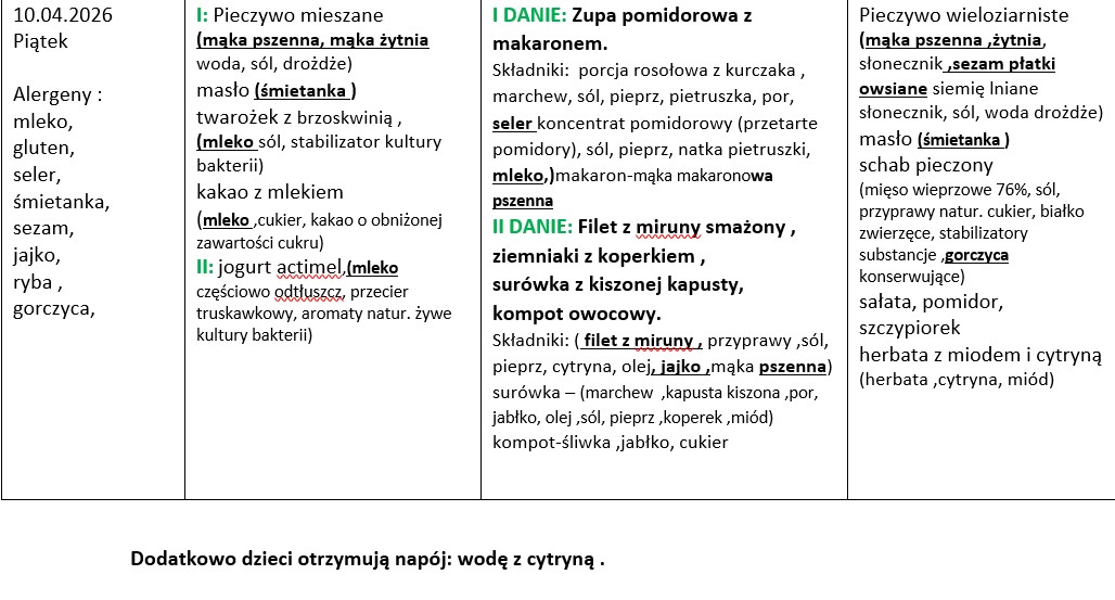 W związku ze stosowaniem między innymi przez placówki przedszkolne od dnia 13.12.2014r roku Rozporządzenia Parlamentu Europejskiego i Rady (UE) nr 1169/2011 z dnia 25 października 2011 roku, które mówi o obowiązku przekazywania konsumentom informacji na temat obecnych w serwowanej żywności składników lub innych substancji mogących powodować alergie lub reakcje nietolerancji oraz wykazywaniu ich przy bieżącym jadłospisie zamieszczamy wykaz alergenów.