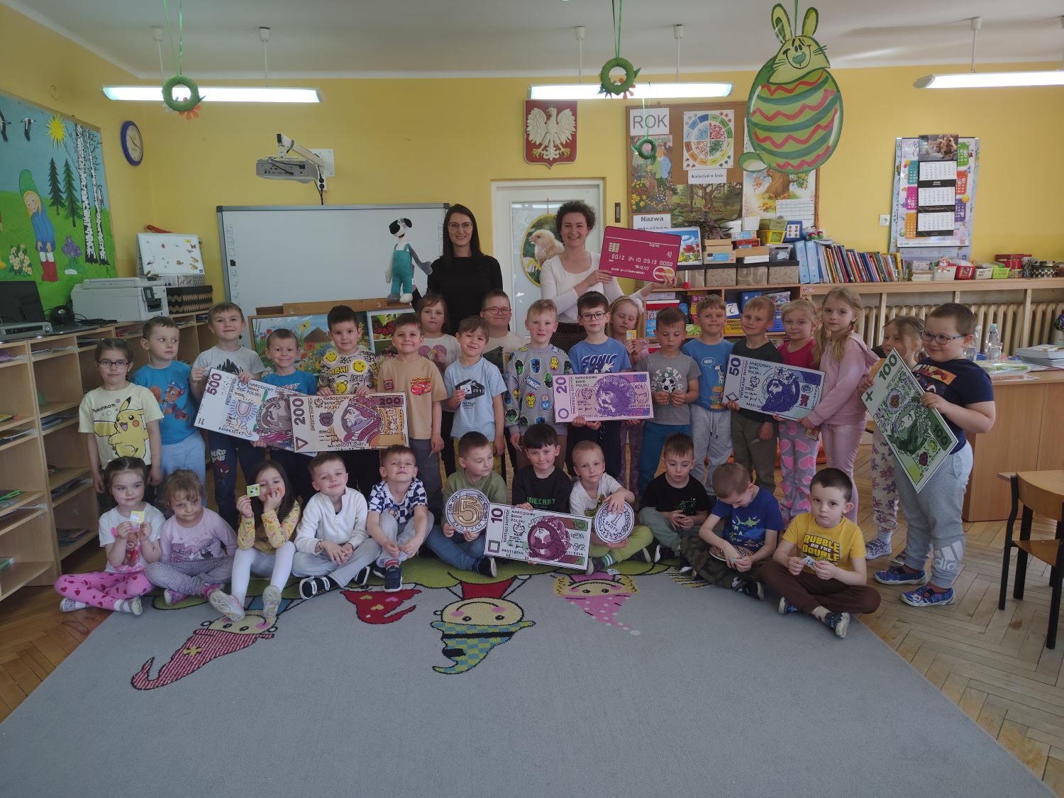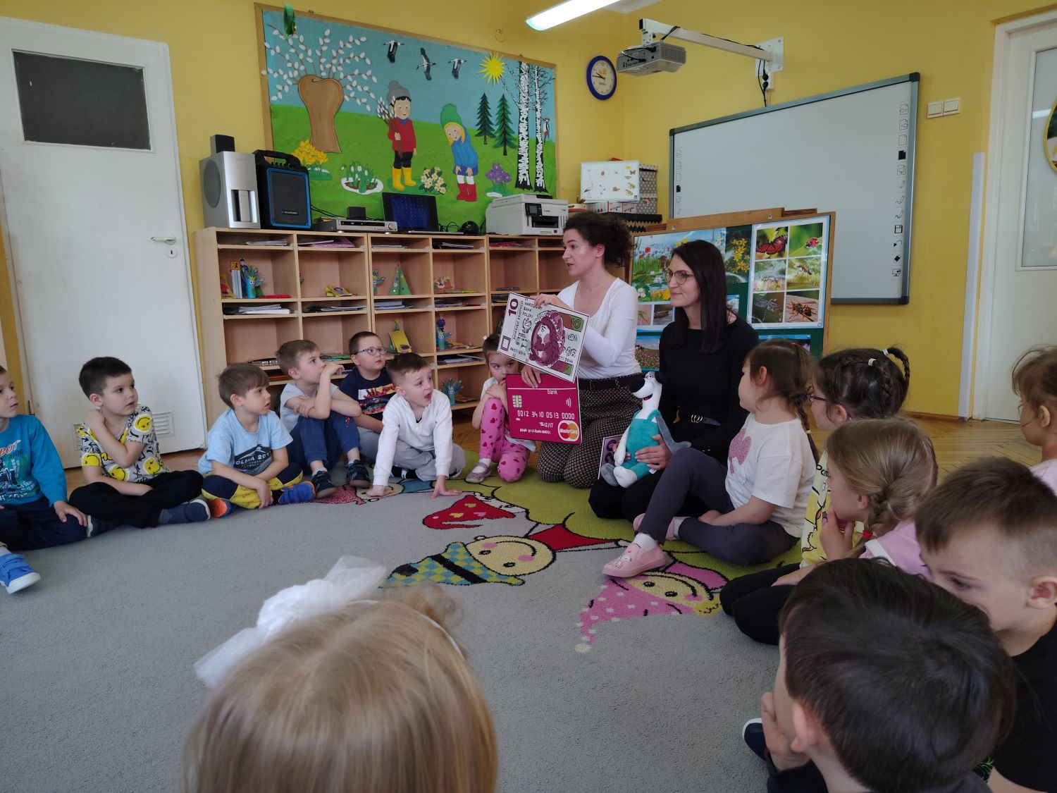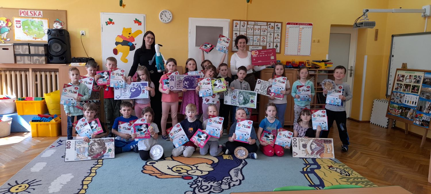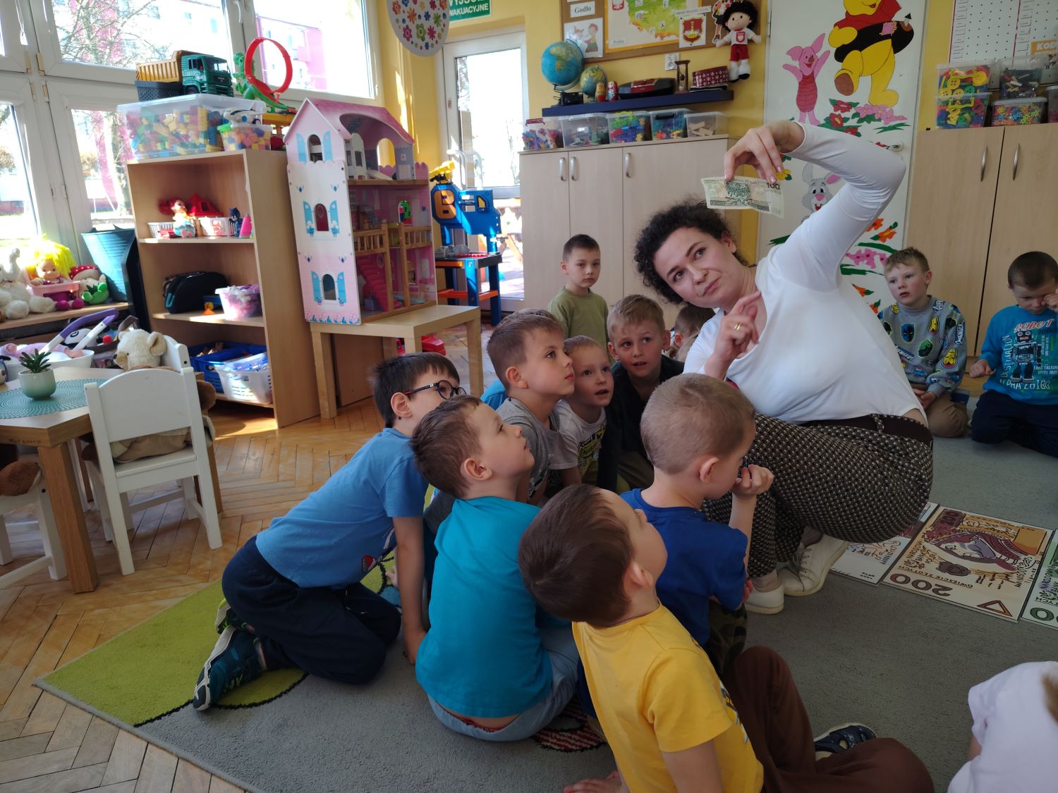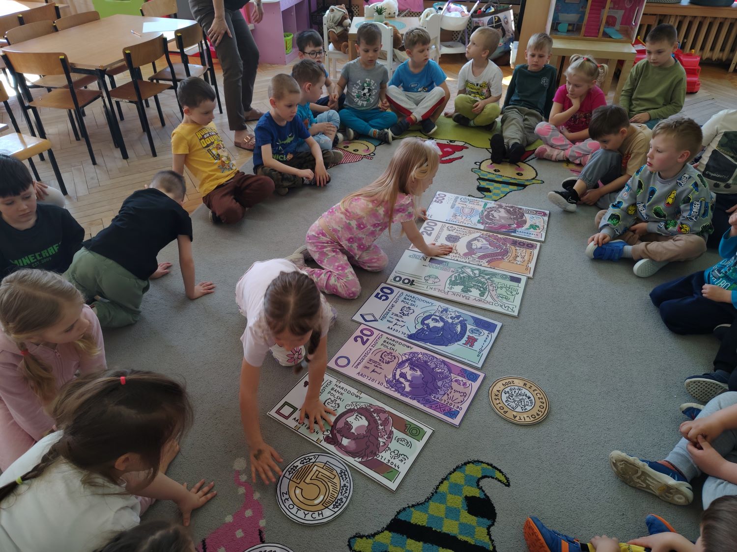 21.04.2026 r. - W naszym przedszkolu odbyły się warsztaty zatytułowane „Finansowy elementarz” w ramach Programu edukacyjnego Fundacji Banku Millennium. Miały one na celu poszerzenie wiedzy przedszkolaków na temat pieniędzy i sposobów posługiwania się nimi. Zajęcia w dwóch grupach, z dziećmi pięcioletnimi z grupy Krasnoludków i Żabek oraz z sześciolatkami z grupy Misiaczkówi Żabek, prowadziły bardzo sympatyczne przedstawicielki Banku Millenium: pani Marlena Urbaniak i pani Izabela Gandziarowska – Stępień. Spotkanie rozpoczęła Pani Iza od zagadki o pieniądzach i krótkiej rozmowy o różnych monetach i banknotach. Pani Marlena przeczytała dzieciom książeczkę pt. „Pan Sebastian i opowieść o Banku” a pani Iza ilustrowała ją śmieszną maskotką Pana Sebastiana. Książeczka opowiadała o różnych, nowoczesnych sposobach płacenia. Podczas omawiania jej treści dzieci wykazały się zaskakującą wiedzą o możliwości płacenia kartą, gotówką, telefonem czy przy pomocy zegarka. Pani Izabela zademonstrowała dużą poglądową kartę płatniczą i w przystępny sposób wyjaśniła na czym polega pobieranie pieniędzy z konta za pomocą karty i 4 cyfrowego PIN-u. Wspólnie z dziećmi omówiła zasady bezpiecznego korzystania z karty. Dzieciaki z zainteresowaniem obserwowały pokaz pani Izabeli z użyciem dużych modeli banknotów, dotyczący wpłat i wypłat z osobistego konta. Przedszkolaki wykazały się umiejętnością liczenia i dodawania. Następnie układały modele pokazowych pieniędzy w odpowiedniej kolejności według wysokości nominału i określały czym się różnią. Prowadząca wyjaśniła dzieciom na czym polega oryginalność banknotu i jakie znaki na banknocie pozwalają rozpoznać jego autentyczność. Dzieci z ciekawością obserwowały znaki wodne pokazywane przez panią Izę. Następnie zaproponowała przedszkolakom zabawę na spostrzegawczość: „Co się zmieniło, czego brakuje?” Dzieci rozpoznawały, które modele pieniędzy zostały zamienione lub schowane. Na koniec pani Izabela wyjaśniła na czym polega płacenie „Blikiem”. Zaprosiła dzieci do zabawy, w której mogły się wykazać znajomością różnych form płacenia. Na zakończenie wszyscy uczestnicy spotkania otrzymali od prowadzących pamiątkowe naklejki, dyplomy oraz książeczki, które utrwalą zdobytą na warsztatach wiedzę. Przedszkolaki sprawiły prowadzącym niespodziankę wręczając kolorową laurkę z podziękowaniami. Pani Iza i pani Marlena chętnie ustawiły się z dziećmi do pamiątkowego zdjęcia. Serdecznie dziękujemy za interesujące zajęcia, a nowe umiejętności przydadzą się przedszkolakom w codziennym życiu.