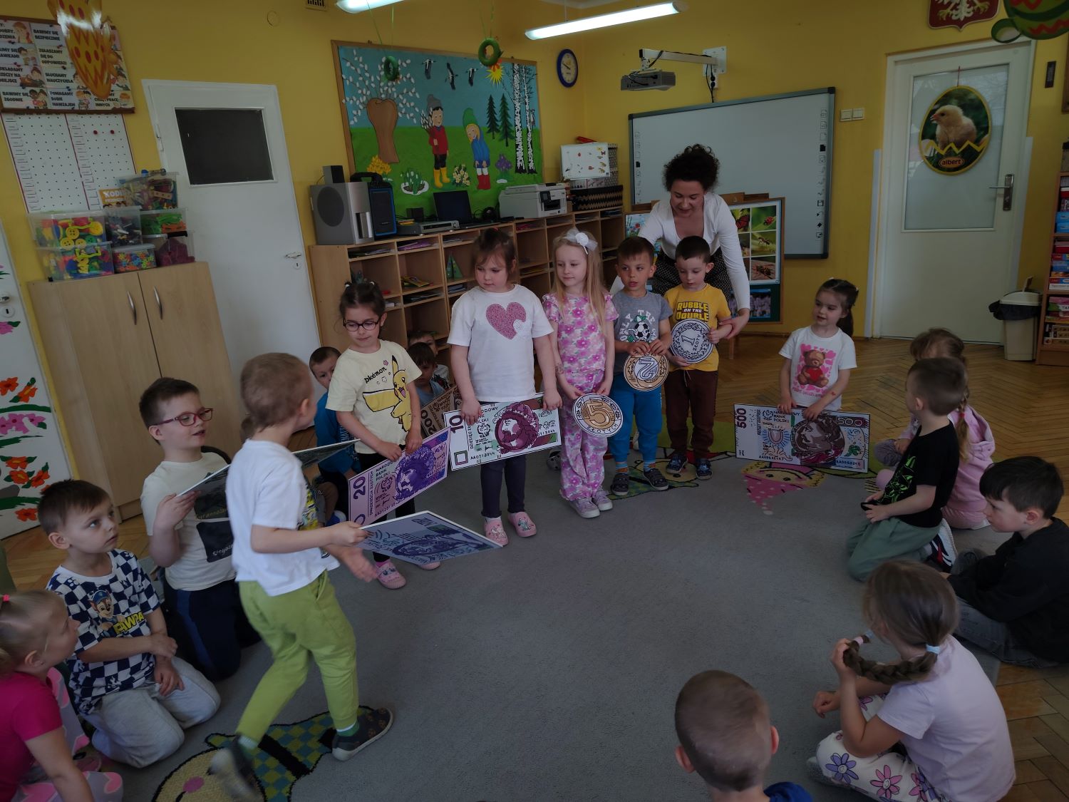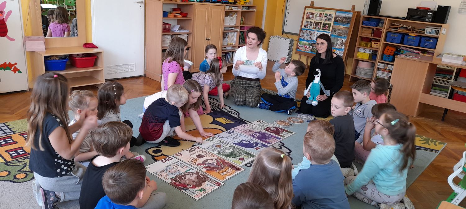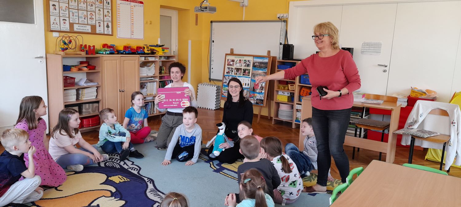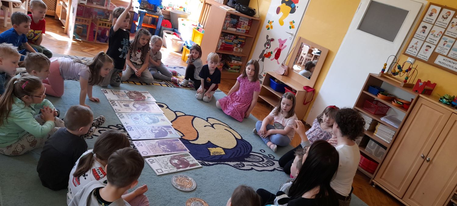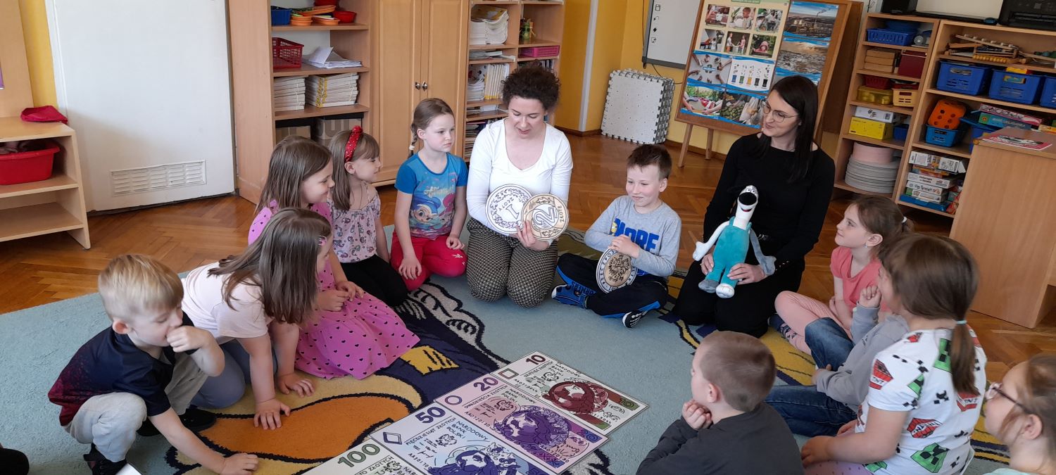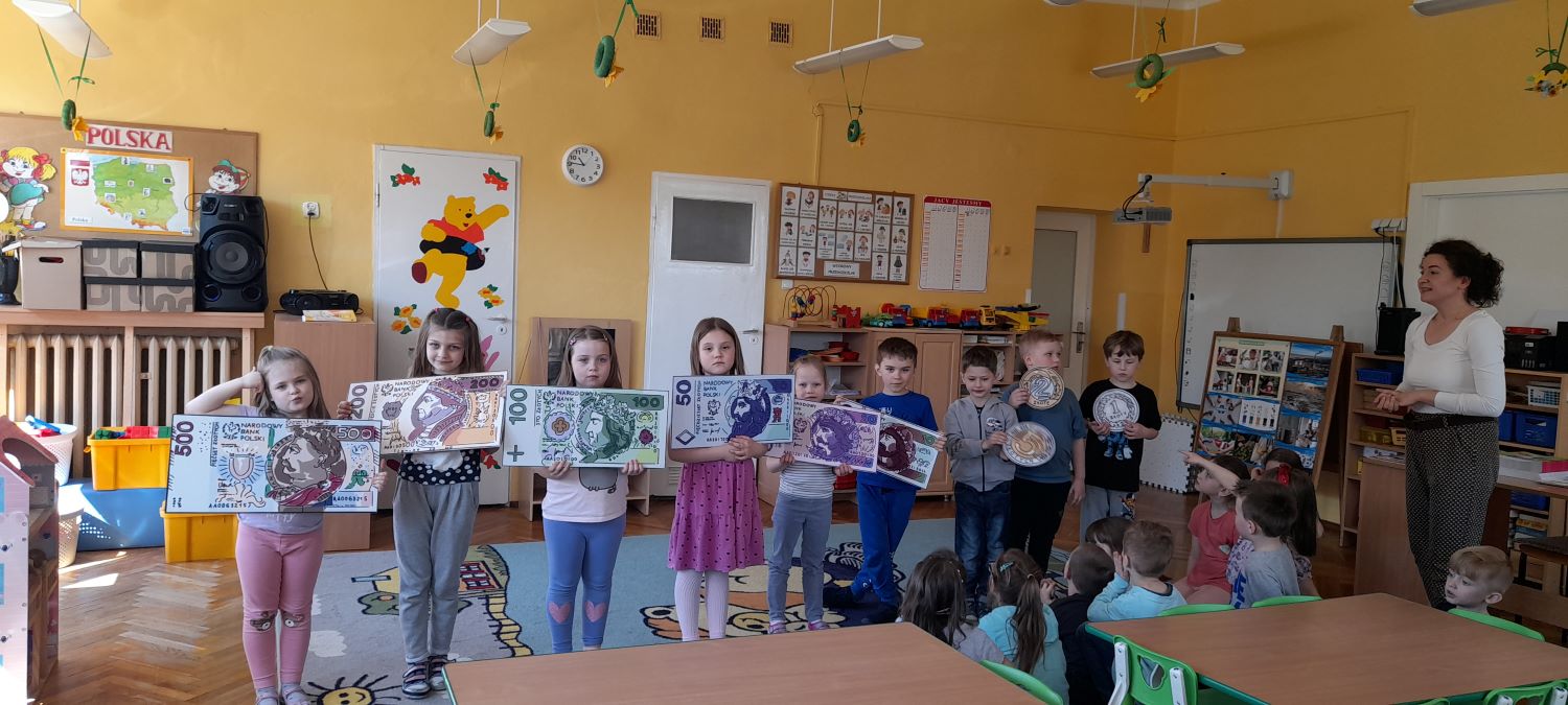 21.04.2026 r. - W naszym przedszkolu odbyły się warsztaty zatytułowane „Finansowy elementarz” w ramach Programu edukacyjnego Fundacji Banku Millennium. Miały one na celu poszerzenie wiedzy przedszkolaków na temat pieniędzy i sposobów posługiwania się nimi. Zajęcia w dwóch grupach, z dziećmi pięcioletnimi z grupy Krasnoludków i Żabek oraz z sześciolatkami z grupy Misiaczkówi Żabek, prowadziły bardzo sympatyczne przedstawicielki Banku Millenium: pani Marlena Urbaniak i pani Izabela Gandziarowska – Stępień. Spotkanie rozpoczęła Pani Iza od zagadki o pieniądzach i krótkiej rozmowy o różnych monetach i banknotach. Pani Marlena przeczytała dzieciom książeczkę pt. „Pan Sebastian i opowieść o Banku” a pani Iza ilustrowała ją śmieszną maskotką Pana Sebastiana. Książeczka opowiadała o różnych, nowoczesnych sposobach płacenia. Podczas omawiania jej treści dzieci wykazały się zaskakującą wiedzą o możliwości płacenia kartą, gotówką, telefonem czy przy pomocy zegarka. Pani Izabela zademonstrowała dużą poglądową kartę płatniczą i w przystępny sposób wyjaśniła na czym polega pobieranie pieniędzy z konta za pomocą karty i 4 cyfrowego PIN-u. Wspólnie z dziećmi omówiła zasady bezpiecznego korzystania z karty. Dzieciaki z zainteresowaniem obserwowały pokaz pani Izabeli z użyciem dużych modeli banknotów, dotyczący wpłat i wypłat z osobistego konta. Przedszkolaki wykazały się umiejętnością liczenia i dodawania. Następnie układały modele pokazowych pieniędzy w odpowiedniej kolejności według wysokości nominału i określały czym się różnią. Prowadząca wyjaśniła dzieciom na czym polega oryginalność banknotu i jakie znaki na banknocie pozwalają rozpoznać jego autentyczność. Dzieci z ciekawością obserwowały znaki wodne pokazywane przez panią Izę. Następnie zaproponowała przedszkolakom zabawę na spostrzegawczość: „Co się zmieniło, czego brakuje?” Dzieci rozpoznawały, które modele pieniędzy zostały zamienione lub schowane. Na koniec pani Izabela wyjaśniła na czym polega płacenie „Blikiem”. Zaprosiła dzieci do zabawy, w której mogły się wykazać znajomością różnych form płacenia. Na zakończenie wszyscy uczestnicy spotkania otrzymali od prowadzących pamiątkowe naklejki, dyplomy oraz książeczki, które utrwalą zdobytą na warsztatach wiedzę. Przedszkolaki sprawiły prowadzącym niespodziankę wręczając kolorową laurkę z podziękowaniami. Pani Iza i pani Marlena chętnie ustawiły się z dziećmi do pamiątkowego zdjęcia. Serdecznie dziękujemy za interesujące zajęcia, a nowe umiejętności przydadzą się przedszkolakom w codziennym życiu.