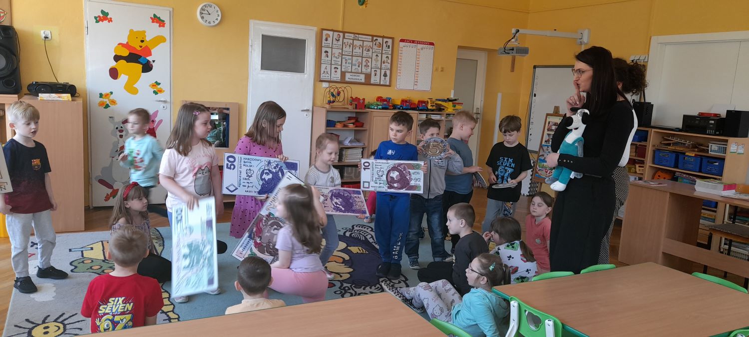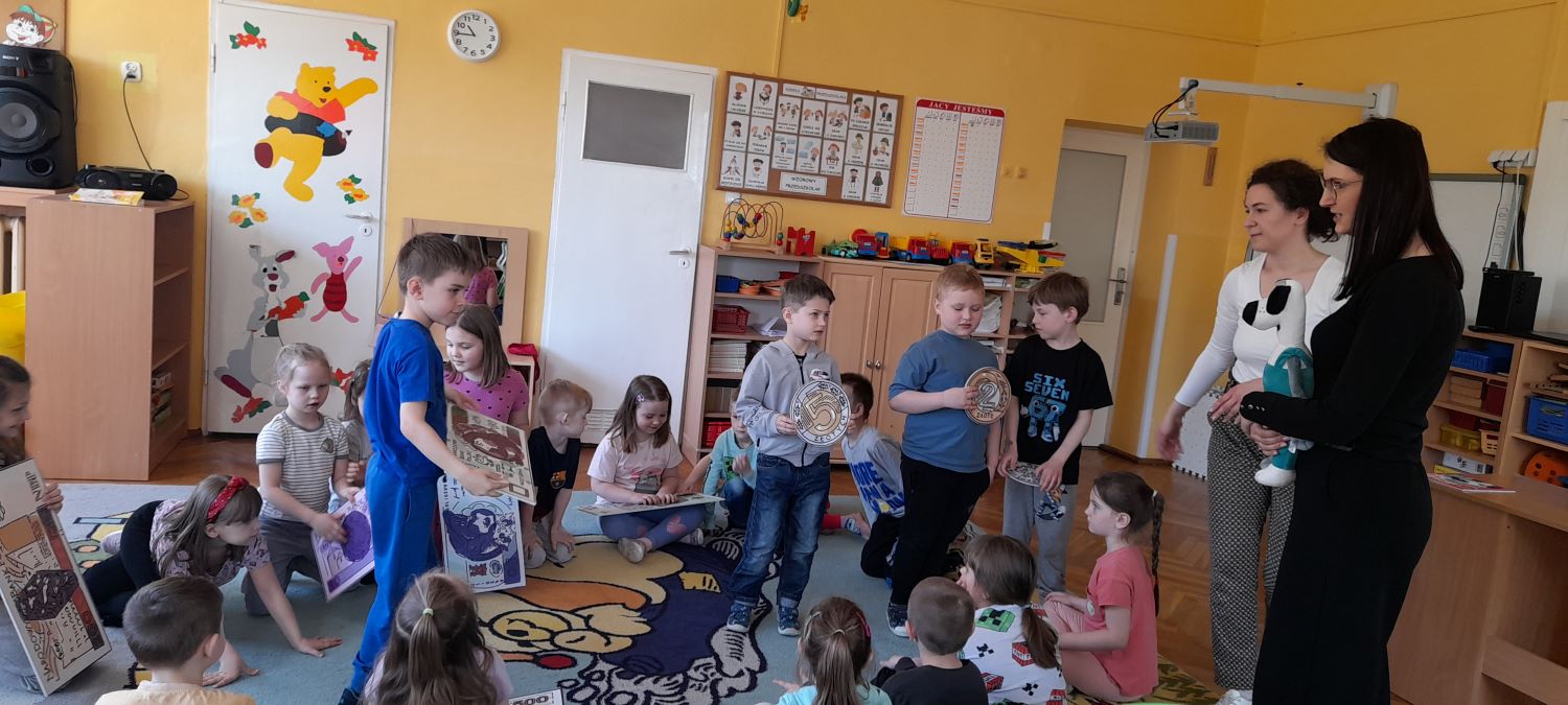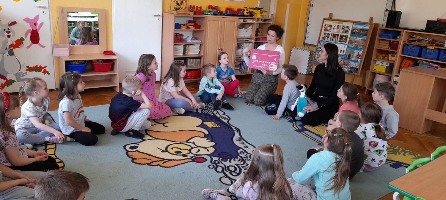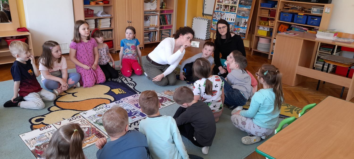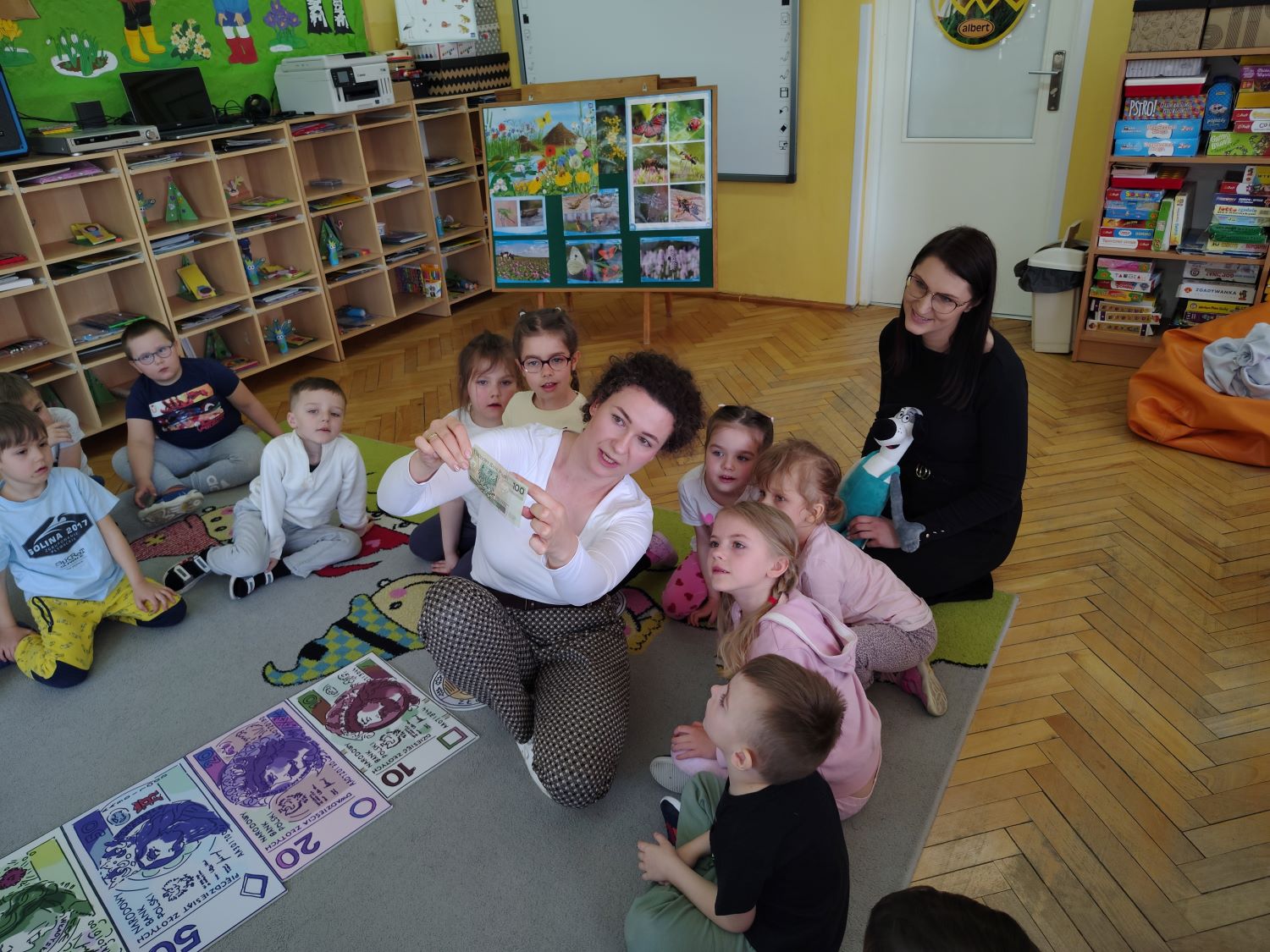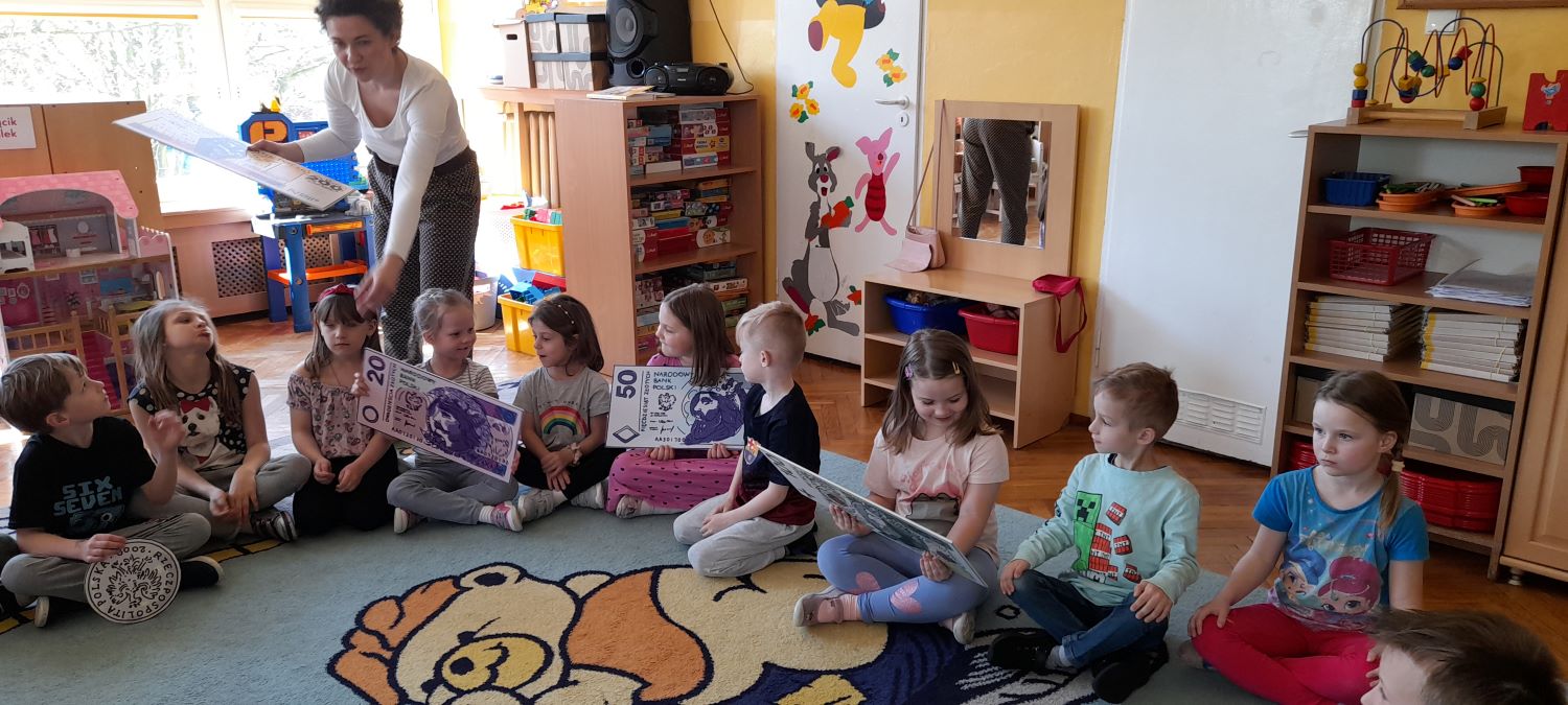 21.04.2026 r. - W naszym przedszkolu odbyły się warsztaty zatytułowane „Finansowy elementarz” w ramach Programu edukacyjnego Fundacji Banku Millennium. Miały one na celu poszerzenie wiedzy przedszkolaków na temat pieniędzy i sposobów posługiwania się nimi. Zajęcia w dwóch grupach, z dziećmi pięcioletnimi z grupy Krasnoludków i Żabek oraz z sześciolatkami z grupy Misiaczkówi Żabek, prowadziły bardzo sympatyczne przedstawicielki Banku Millenium: pani Marlena Urbaniak i pani Izabela Gandziarowska – Stępień. Spotkanie rozpoczęła Pani Iza od zagadki o pieniądzach i krótkiej rozmowy o różnych monetach i banknotach. Pani Marlena przeczytała dzieciom książeczkę pt. „Pan Sebastian i opowieść o Banku” a pani Iza ilustrowała ją śmieszną maskotką Pana Sebastiana. Książeczka opowiadała o różnych, nowoczesnych sposobach płacenia. Podczas omawiania jej treści dzieci wykazały się zaskakującą wiedzą o możliwości płacenia kartą, gotówką, telefonem czy przy pomocy zegarka. Pani Izabela zademonstrowała dużą poglądową kartę płatniczą i w przystępny sposób wyjaśniła na czym polega pobieranie pieniędzy z konta za pomocą karty i 4 cyfrowego PIN-u. Wspólnie z dziećmi omówiła zasady bezpiecznego korzystania z karty. Dzieciaki z zainteresowaniem obserwowały pokaz pani Izabeli z użyciem dużych modeli banknotów, dotyczący wpłat i wypłat z osobistego konta. Przedszkolaki wykazały się umiejętnością liczenia i dodawania. Następnie układały modele pokazowych pieniędzy w odpowiedniej kolejności według wysokości nominału i określały czym się różnią. Prowadząca wyjaśniła dzieciom na czym polega oryginalność banknotu i jakie znaki na banknocie pozwalają rozpoznać jego autentyczność. Dzieci z ciekawością obserwowały znaki wodne pokazywane przez panią Izę. Następnie zaproponowała przedszkolakom zabawę na spostrzegawczość: „Co się zmieniło, czego brakuje?” Dzieci rozpoznawały, które modele pieniędzy zostały zamienione lub schowane. Na koniec pani Izabela wyjaśniła na czym polega płacenie „Blikiem”. Zaprosiła dzieci do zabawy, w której mogły się wykazać znajomością różnych form płacenia. Na zakończenie wszyscy uczestnicy spotkania otrzymali od prowadzących pamiątkowe naklejki, dyplomy oraz książeczki, które utrwalą zdobytą na warsztatach wiedzę. Przedszkolaki sprawiły prowadzącym niespodziankę wręczając kolorową laurkę z podziękowaniami. Pani Iza i pani Marlena chętnie ustawiły się z dziećmi do pamiątkowego zdjęcia. Serdecznie dziękujemy za interesujące zajęcia, a nowe umiejętności przydadzą się przedszkolakom w codziennym życiu.