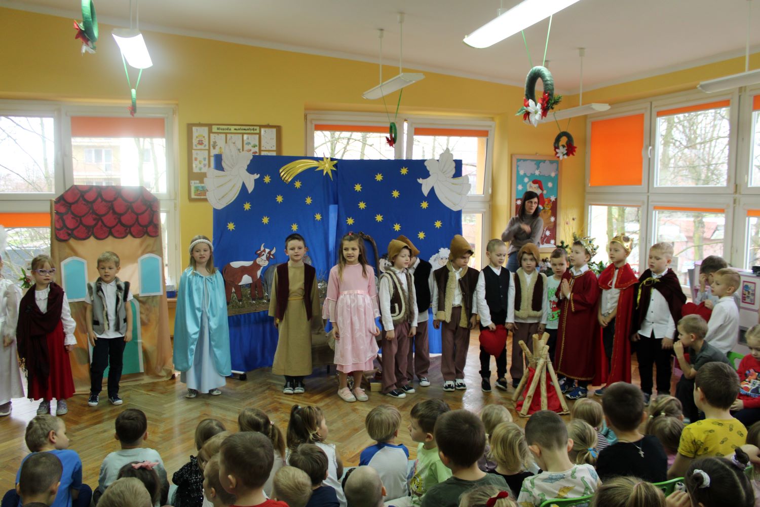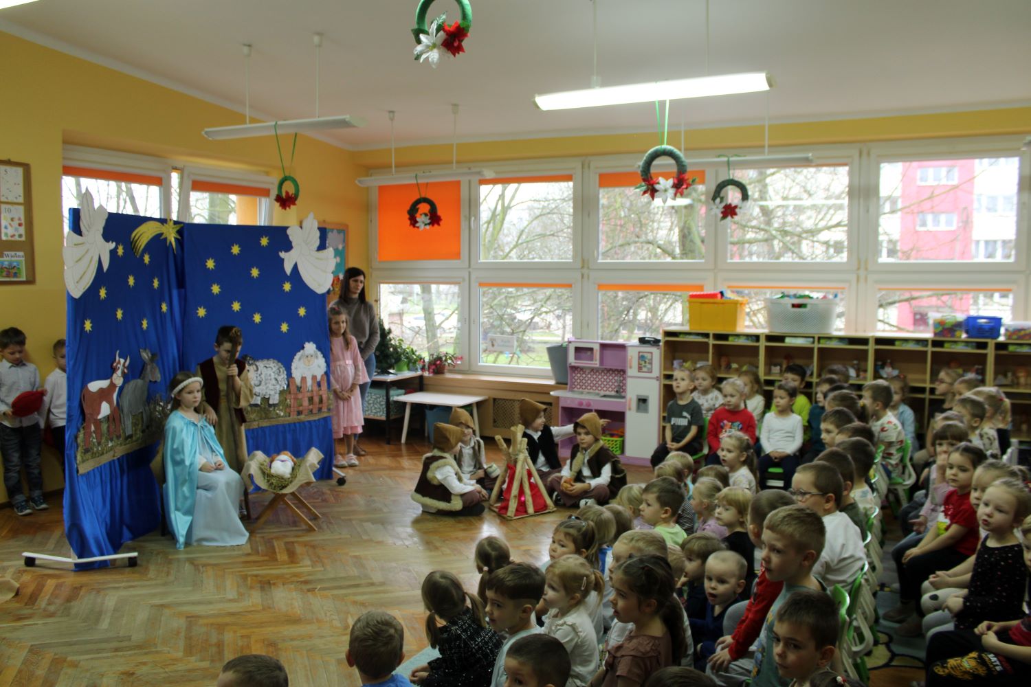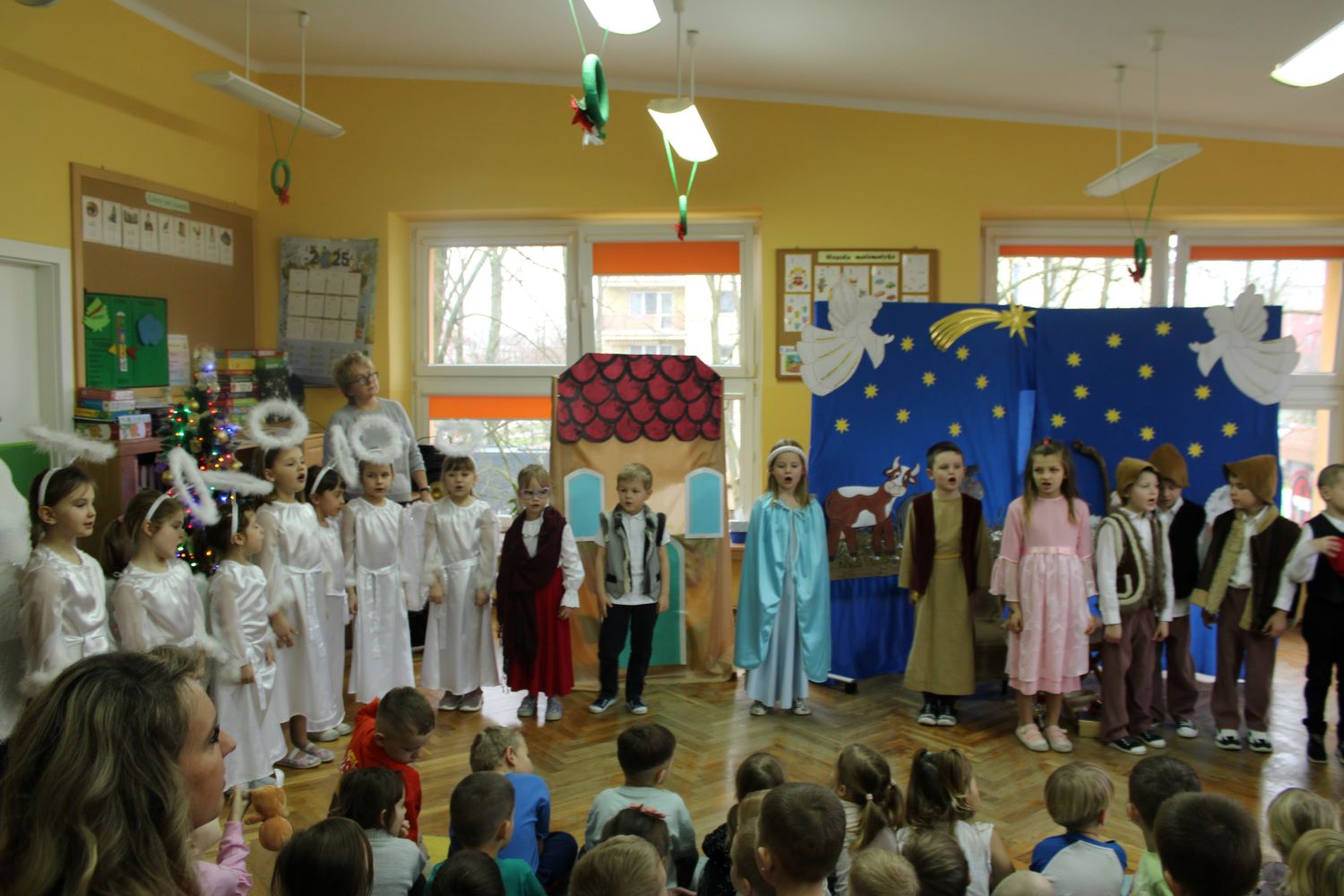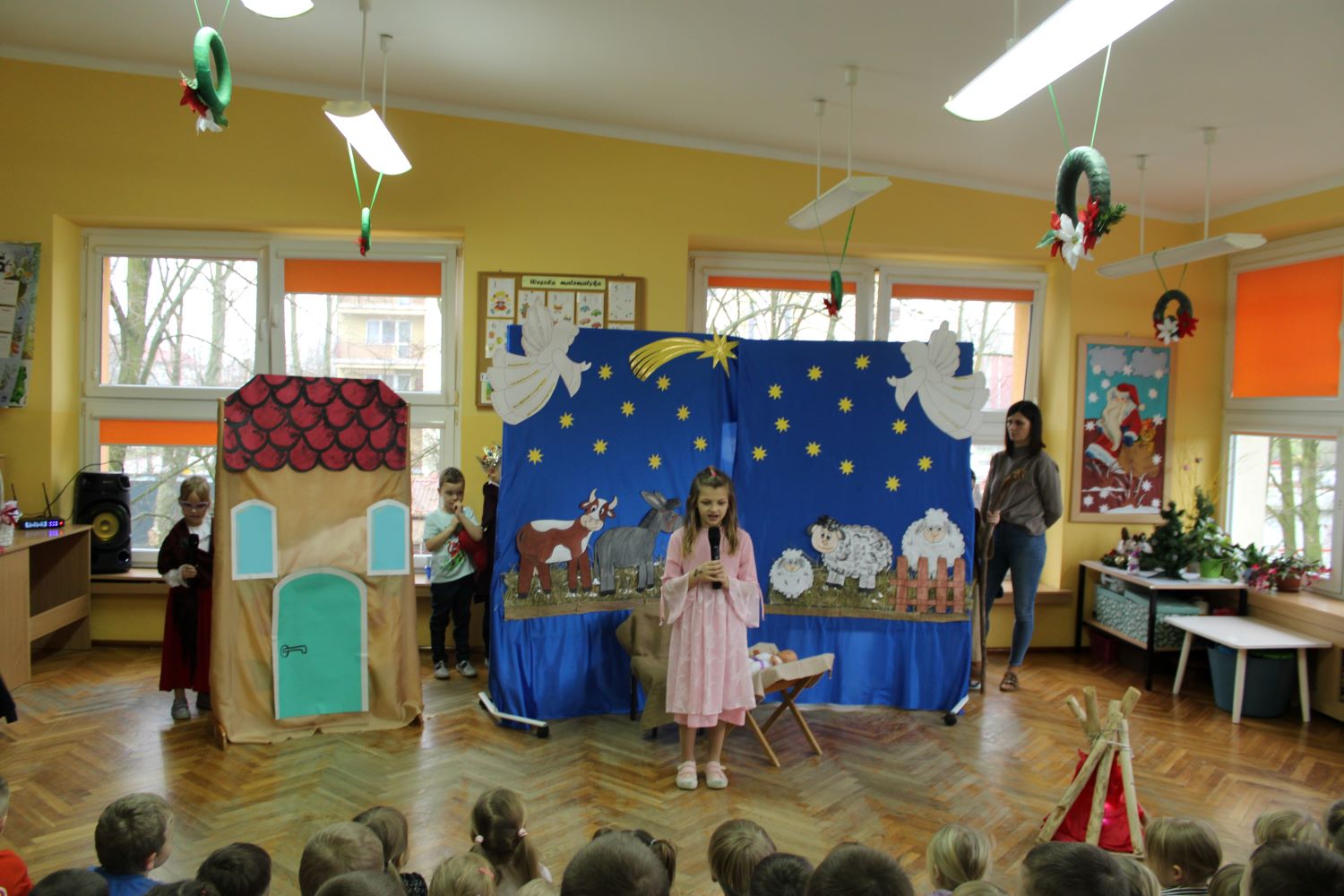 Dnia 15 grudnia okazji zbliżających się Świat Bożego Narodzenia dzieci z grupy „Misiaczki” wystawiły Jasełkę pt. „W Betlejem, w Betlejem wielka radość się dzieje”. Zaproszeni pracownicy przedszkola oraz przedszkolaki z zainteresowaniem śledziły przedstawioną przez małych aktorów historię narodzin Jezusa przeplataną kolędami, pastorałkami oraz tańcem aniołów i wspólnymi życzeniami. Występ Misiaczków wprowadził wszystkich w świąteczną atmosferę i został nagrodzony gromkimi brawami. Kończąc miłe spotkanie Pani Dyrektor Zofia Molenda - Kimla złożyła wszystkim zgromadzonym serdeczne życzenia i obdarowała dzieci słodką niespodzianką.