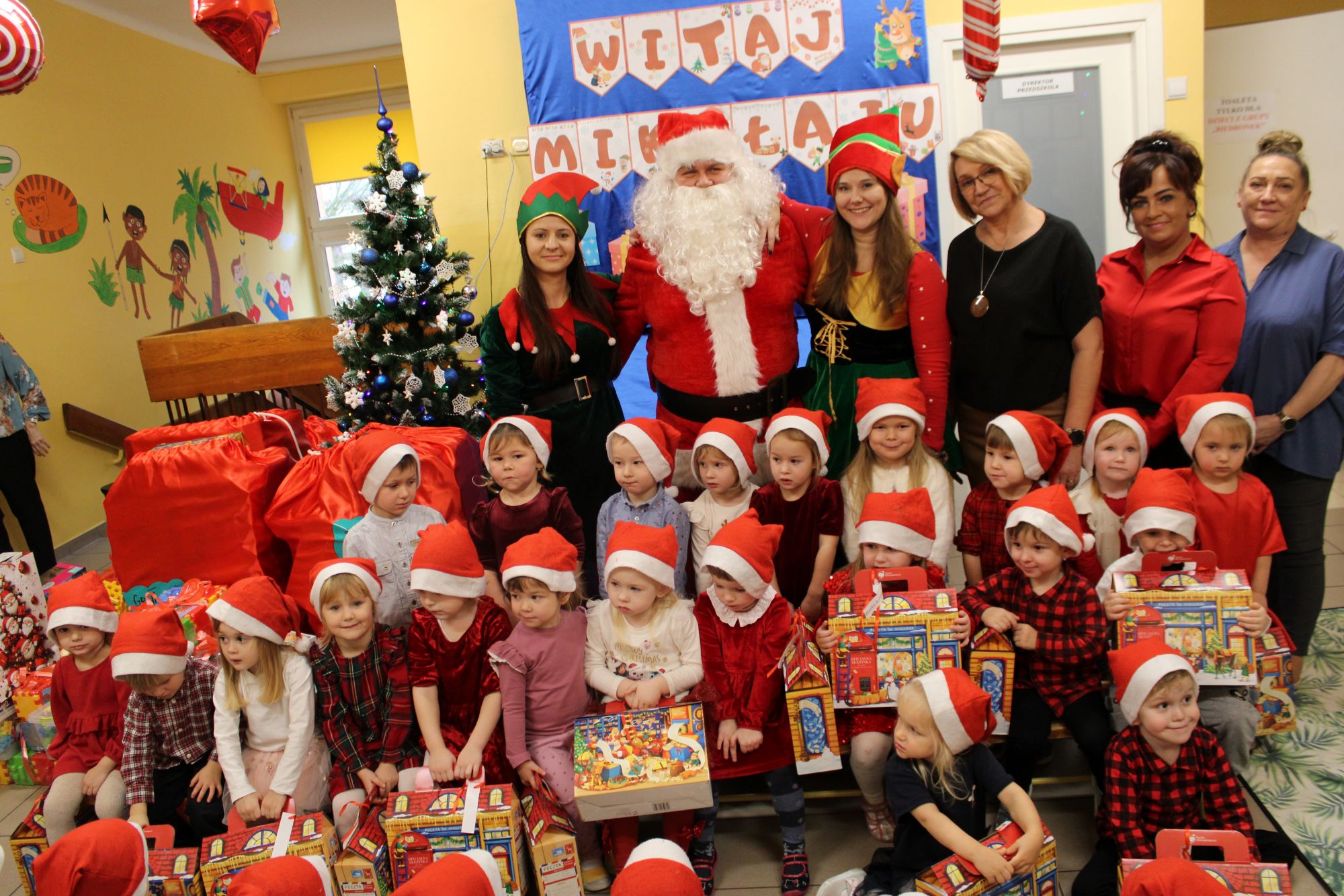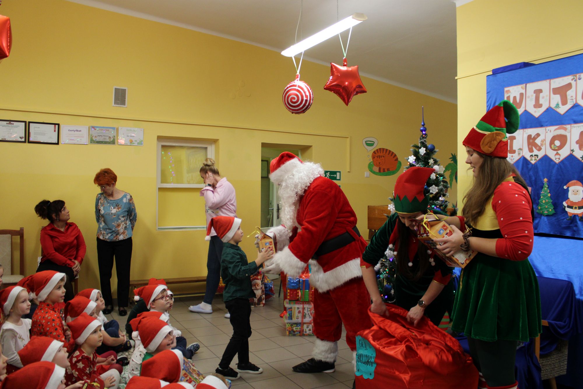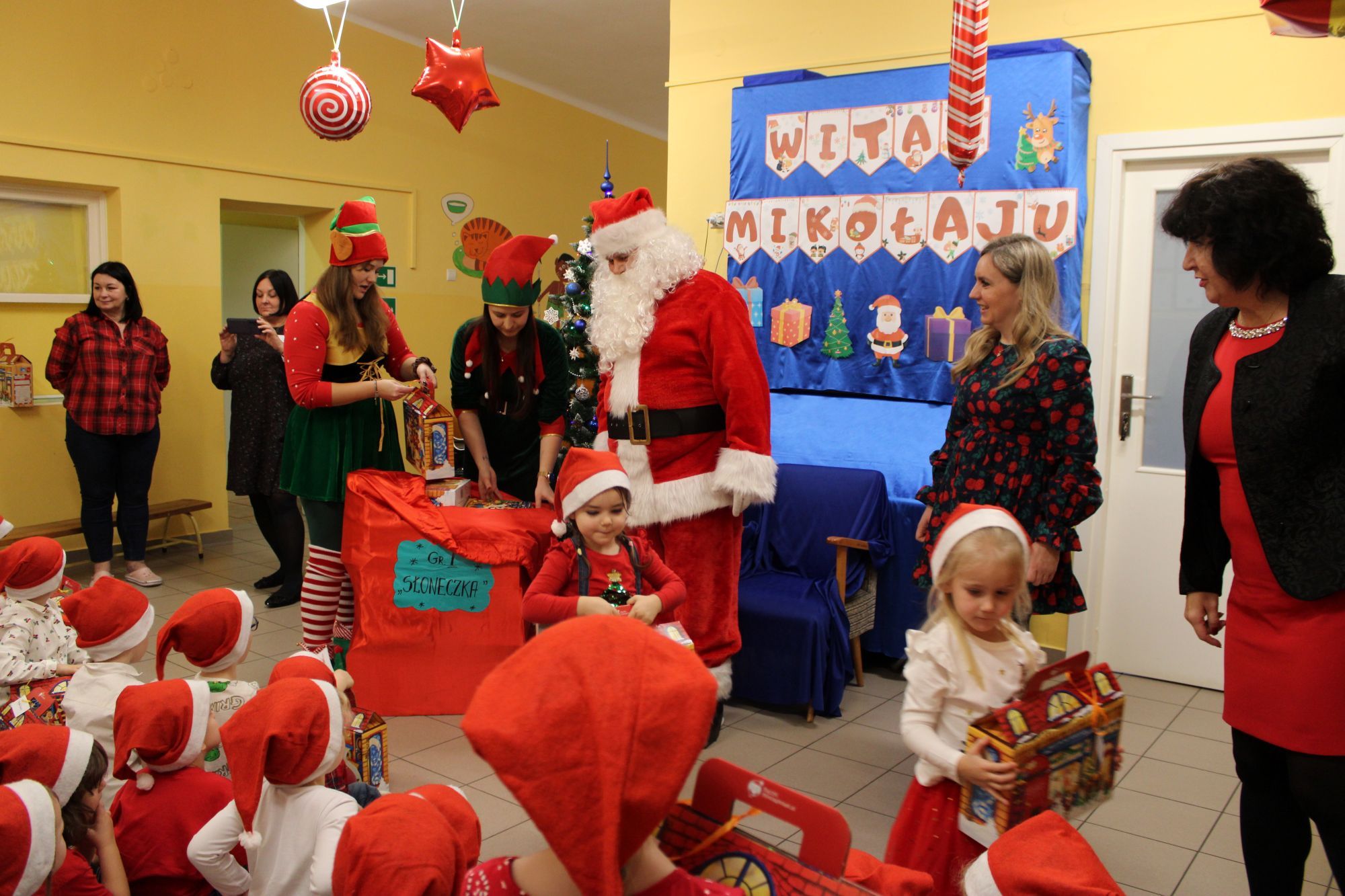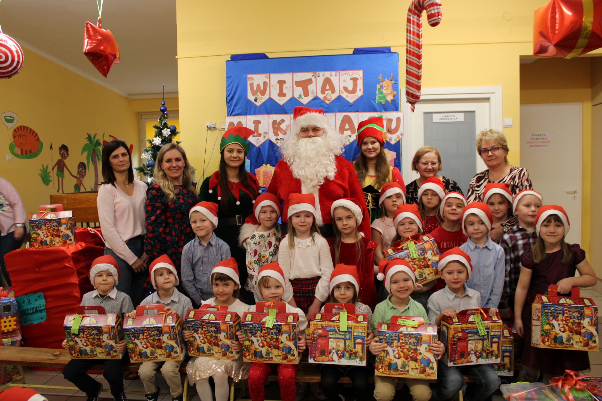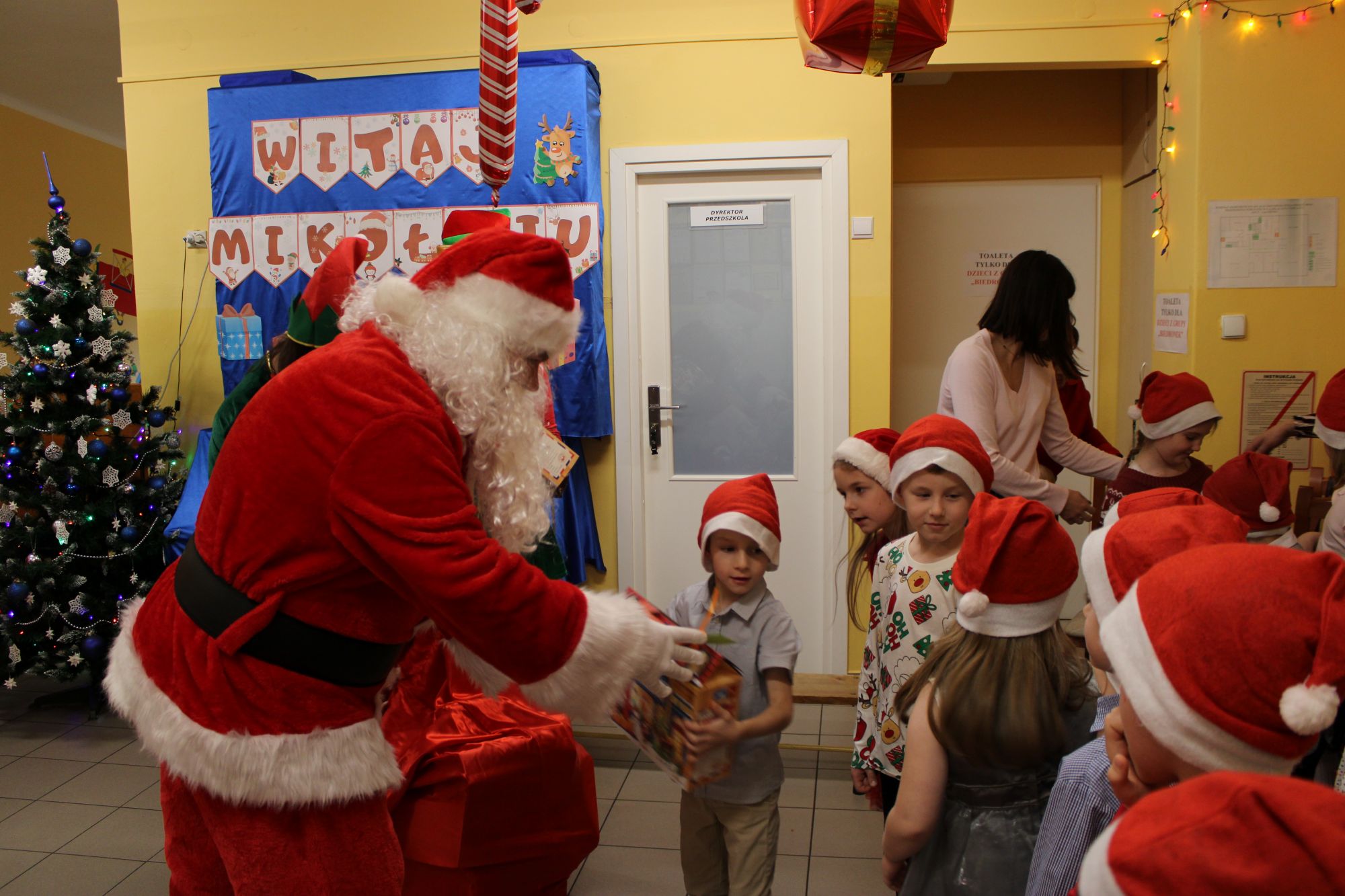 Grudzień to wyjątkowy, magiczny miesiąc, który wszystkim dzieciom kojarzy się z wyczekiwanymi odwiedzinami niezwykłego gościa – Świętego Mikołaja. W piątek 5 grudnia przedszkolaki czekały na niego już od rana. Mikołaj nie zawiódł dzieci i nie kazał długo na siebie czekać. Rozpoznały go po czerwonym ubraniu, długiej brodzie, wąsach oraz czapce. Dzieci nasłuchiwały dźwięku dzwoneczków, które słychać było już z daleka. Jego widok oraz worki pełne prezentów sprawił milusińskim ogromną radość. Mikołaj pojawił się w towarzystwie dwóch przemiłych elfów. Nasz gość przywitał się z przedszkolakami, po czym usiadł wygodnie w fotelu, aby z uśmiechem i radością wysłuchać wierszyków i piosenek przygotowanych przez dzieci specjalnie dla niego. W pięknie udekorowanym holu, w magicznym klimacie kolorowych świateł, nie zabrakło też wspólnych pamiątkowych zdjęć. Święty Mikołaj widząc tak grzeczne dzieci, postanowił je nagrodzić i każdemu wręczył prezent. Przedszkolaki również pomyślały o naszych wyjątkowych gościach. Starszaki w podziękowaniu za wizytę przygotowały laurki życząc im dużo zdrowia, siły oraz aby nie zapomnieli nas odwiedzić za rok. Tego dnia niespodzianek nie było końca. Mikołaj podarował każdej grupie mnóstwo nowych zabawek do sal.