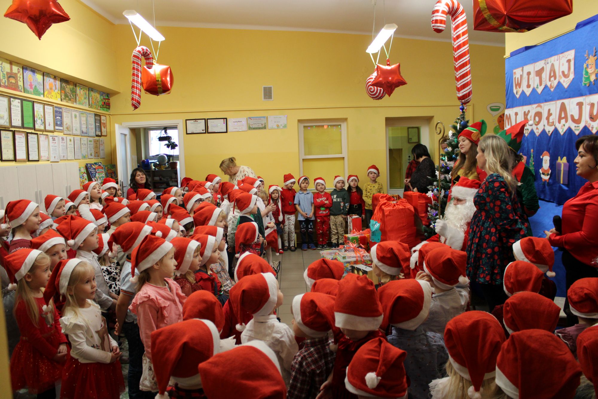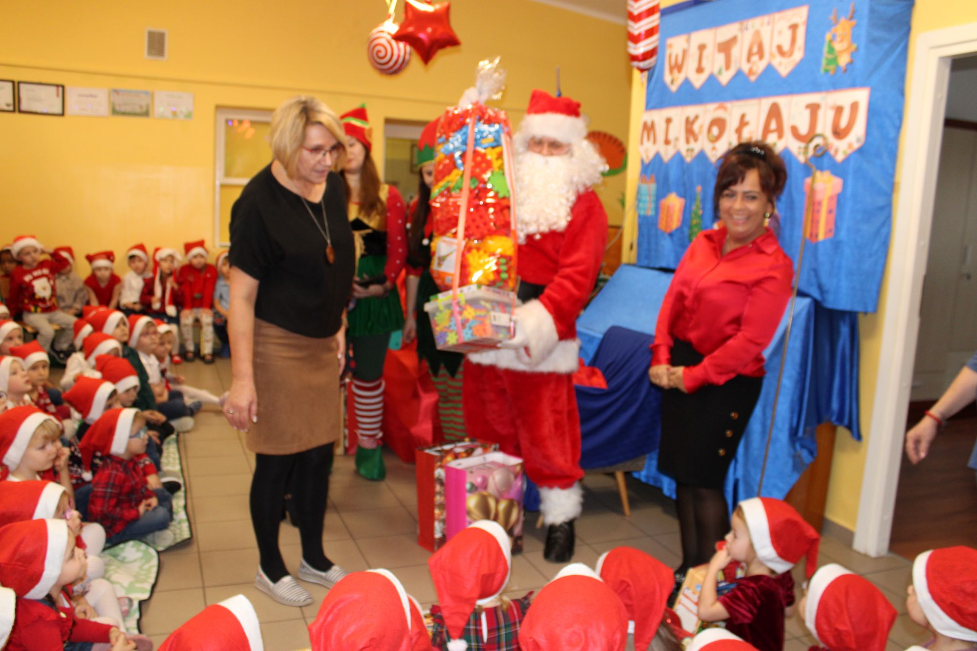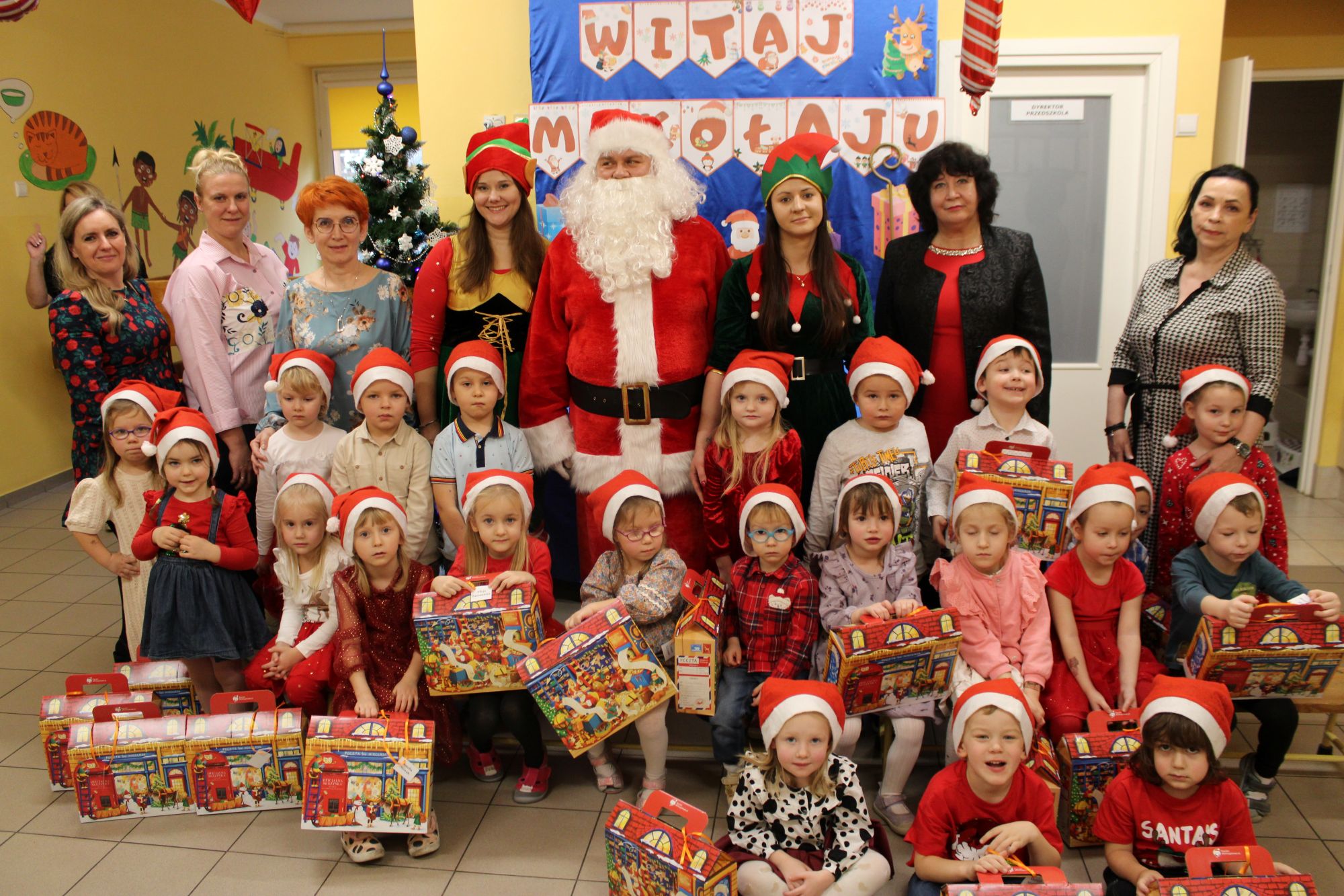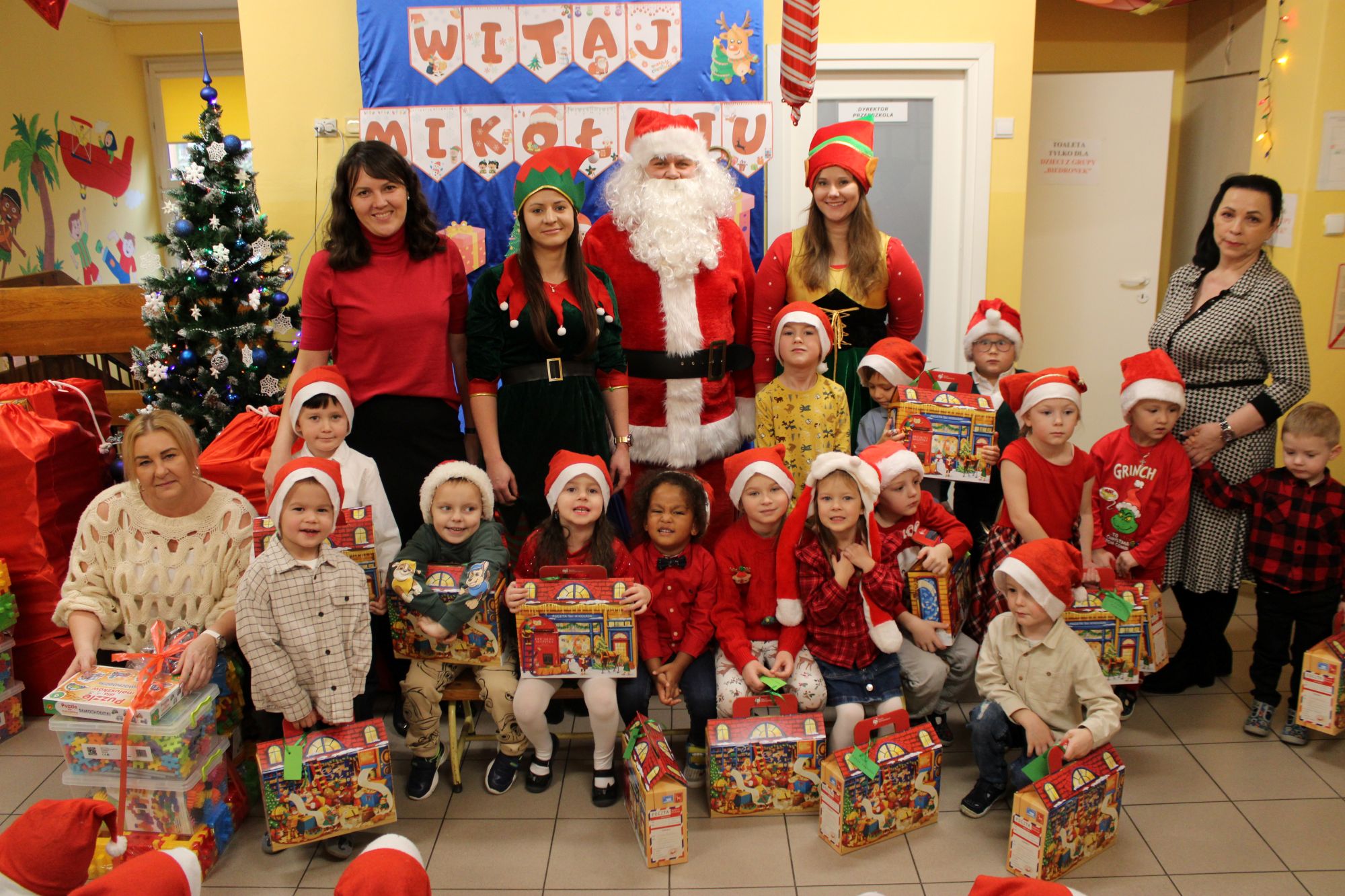 Grudzień to wyjątkowy, magiczny miesiąc, który wszystkim dzieciom kojarzy się z wyczekiwanymi odwiedzinami niezwykłego gościa – Świętego Mikołaja. W piątek 5 grudnia przedszkolaki czekały na niego już od rana. Mikołaj nie zawiódł dzieci i nie kazał długo na siebie czekać. Rozpoznały go po czerwonym ubraniu, długiej brodzie, wąsach oraz czapce. Dzieci nasłuchiwały dźwięku dzwoneczków, które słychać było już z daleka. Jego widok oraz worki pełne prezentów sprawił milusińskim ogromną radość. Mikołaj pojawił się w towarzystwie dwóch przemiłych elfów. Nasz gość przywitał się z przedszkolakami, po czym usiadł wygodnie w fotelu, aby z uśmiechem i radością wysłuchać wierszyków i piosenek przygotowanych przez dzieci specjalnie dla niego. W pięknie udekorowanym holu, w magicznym klimacie kolorowych świateł, nie zabrakło też wspólnych pamiątkowych zdjęć. Święty Mikołaj widząc tak grzeczne dzieci, postanowił je nagrodzić i każdemu wręczył prezent. Przedszkolaki również pomyślały o naszych wyjątkowych gościach. Starszaki w podziękowaniu za wizytę przygotowały laurki życząc im dużo zdrowia, siły oraz aby nie zapomnieli nas odwiedzić za rok. Tego dnia niespodzianek nie było końca. Mikołaj podarował każdej grupie mnóstwo nowych zabawek do sal.