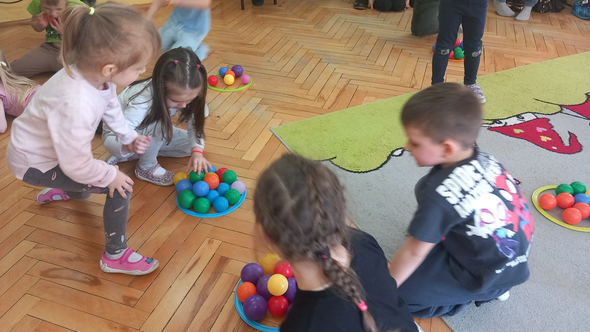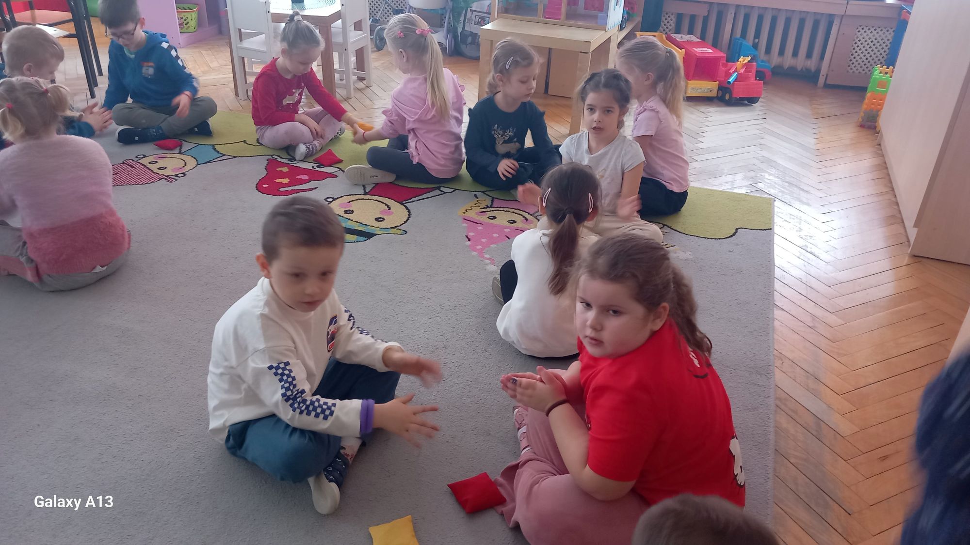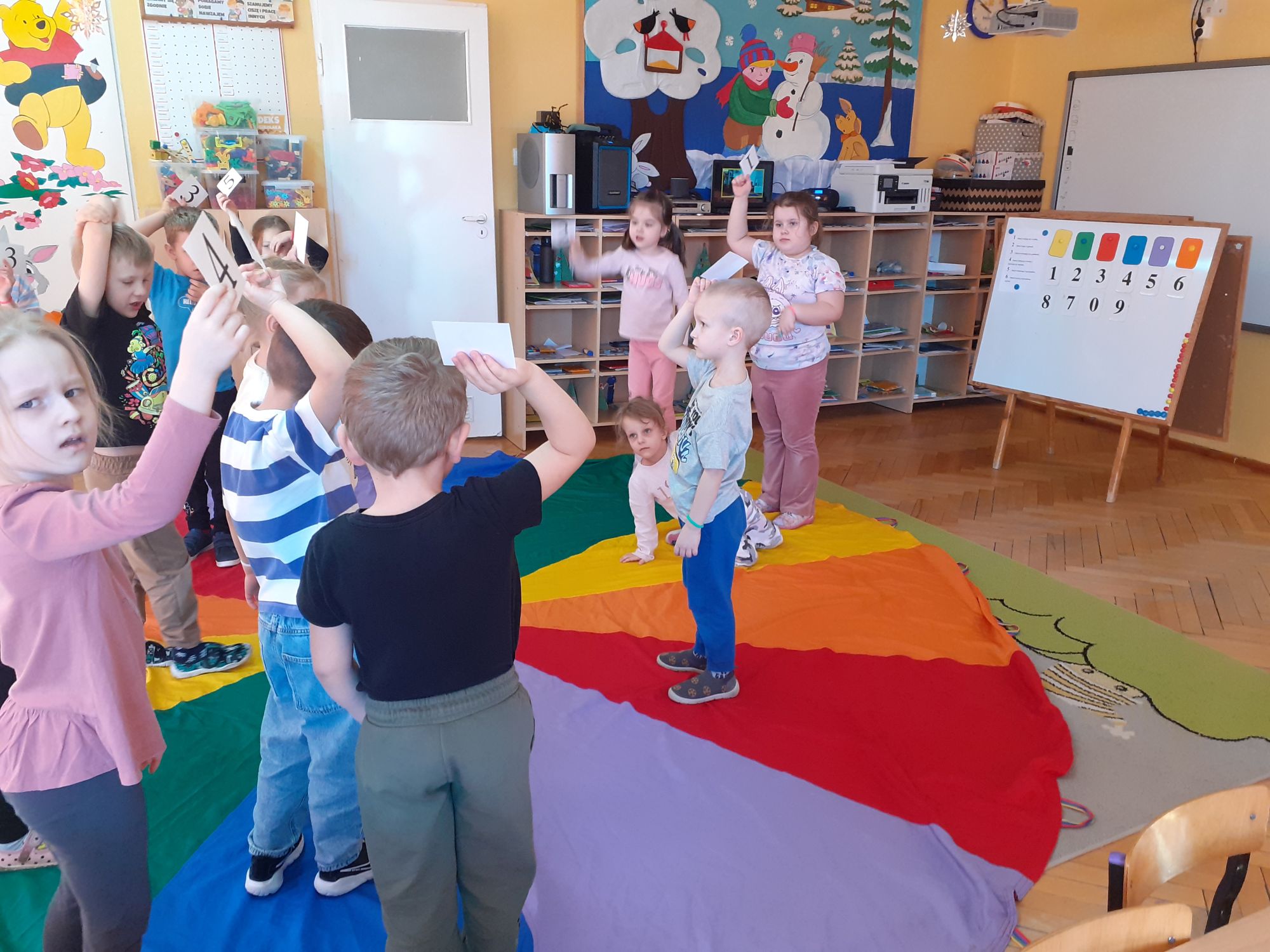 26.02.2026 r. - „Słyszę, liczę, podskakuję” to temat kolejnego zajęcia w ramach realizowanego w grupie „Krasnoludków” projektu - „Muzyczna matematyka”. Wszystkie przeprowadzone podczas zajęcia zabawy integrowały ruch i muzykę do utrwalania pojęć matematycznych. Dzieci sprawnie wykonywały zadania polegające na przeliczaniu, dobieraniu odpowiednich cyfr i kolorów czy rozróżnianiu kierunków w przestrzeni. Największą radość sprawiała im możliwość ilustrowania zadań ruchem przy rytmicznym podkładzie muzycznym.