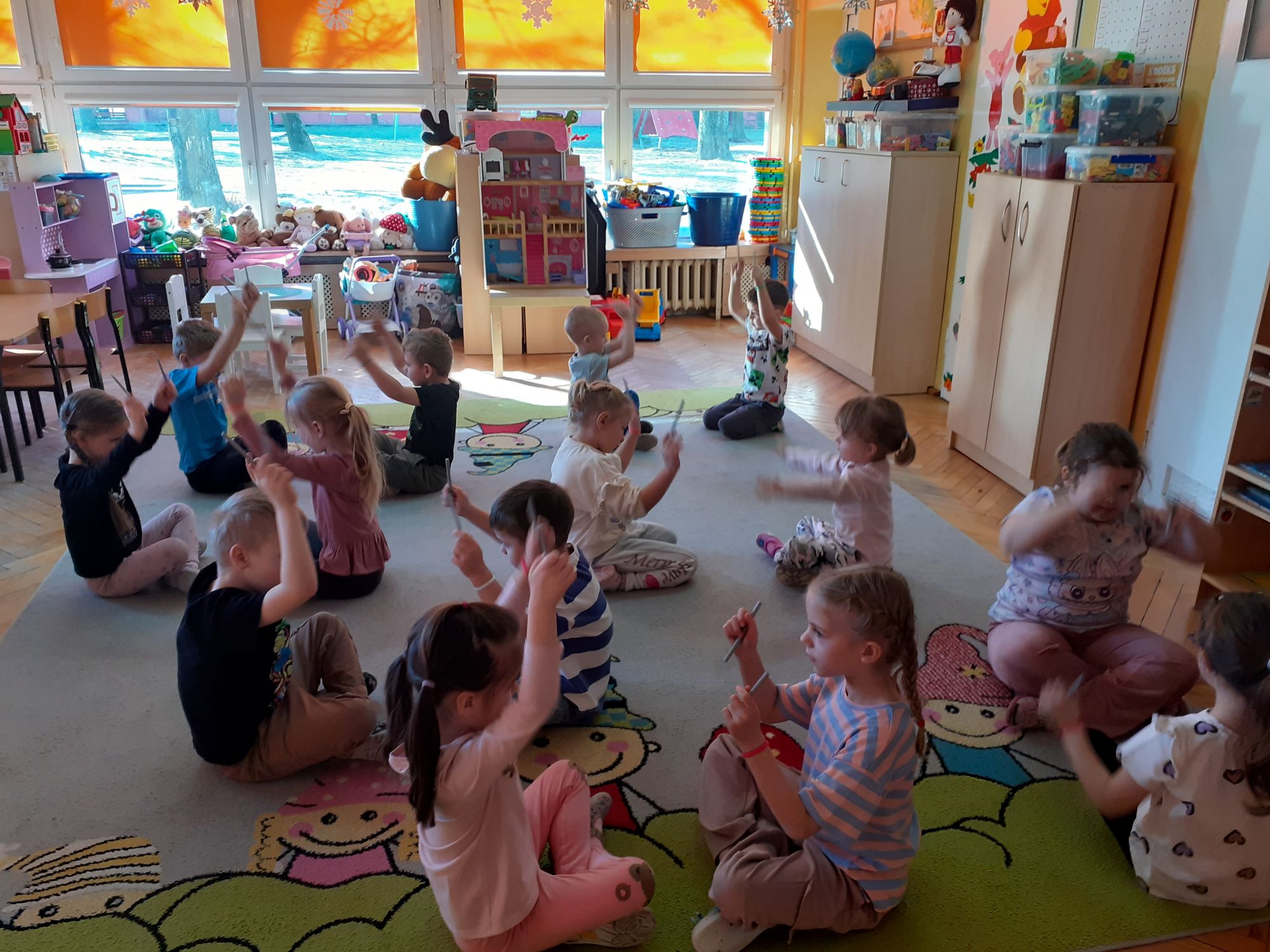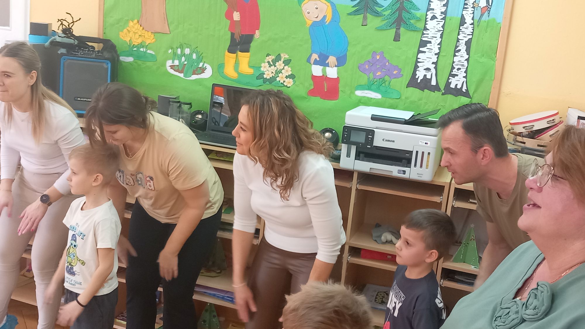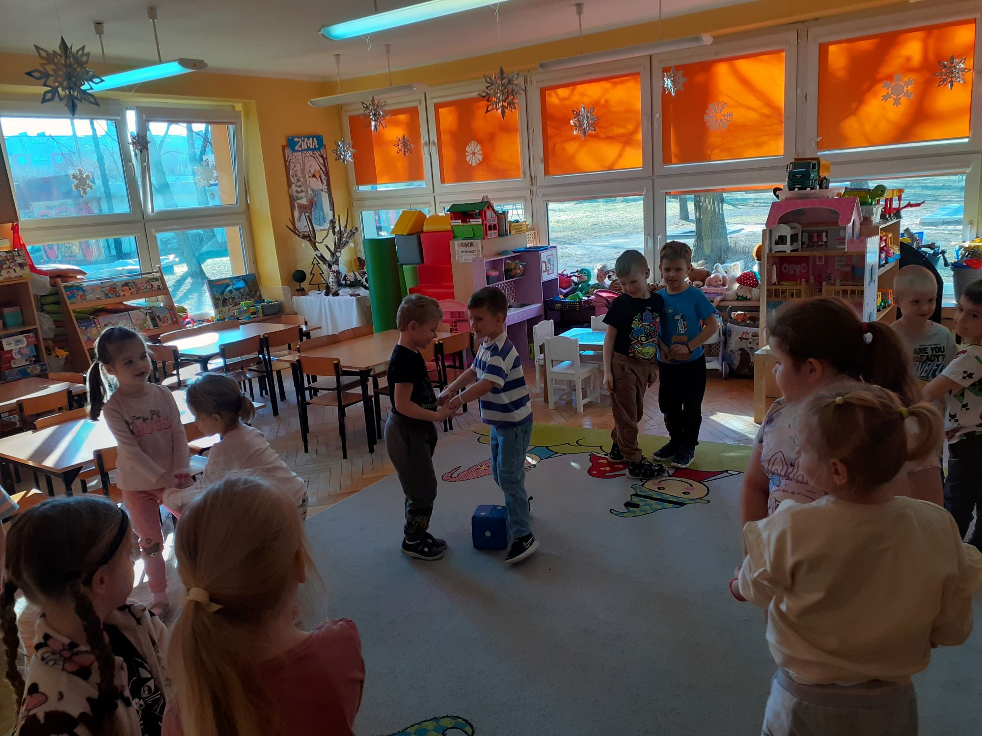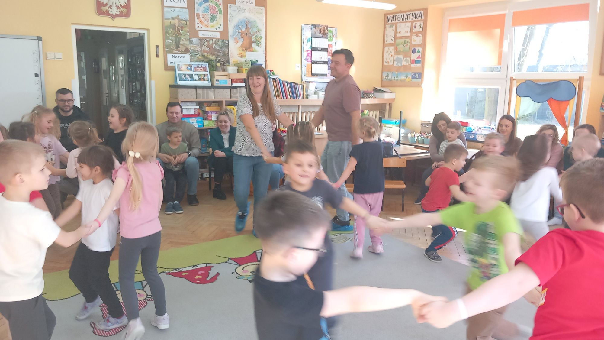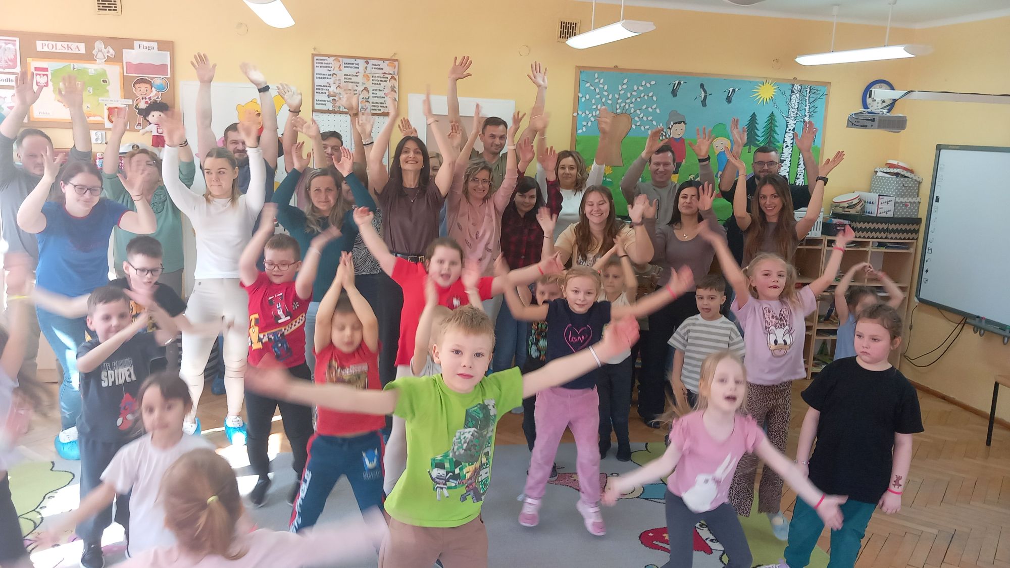 Dnia 18.02.2026 r. dzieci z grupy „Krasnoludków” uczestniczyły w zajęciu muzyczno – ruchowo – matematycznym „ Muzyka to Matematyka”. Zajęcia rozpoczęły się od powitania dzieci w kole przy wesołej piosence. Następnie nauczyciel przeprowadził krótką rozmowę wprowadzającą dotyczącą prawej i lewej strony ciała. Dzieci wskazywały prawą i lewą rękę oraz nogę. Każdy przedszkolak miał założoną kolorową frotkę na lewej ręce aby nie pomylić rąk. Kolejnym elementem była zabawa muzyczno-ruchowa. Podczas słuchania muzyki dzieci wykonywały polecenia nauczyciela, np. podnosiły prawą rękę, stawiały krok w lewą stronę lub klaskały określoną liczbę razy prawą lub lewą ręką. W dalszej części zajęć dzieci uczestniczyły w zabawie „Muzyczne kierunki”. Podczas grania muzyki poruszały się swobodnie po sali, natomiast gdy muzyka zatrzymywała się, nauczyciel podawał polecenie, np. „krok w prawo”, „obrót w lewo”, „podnieś lewą rękę”. Dzieci starały się prawidłowo wykonać polecenia. Następnie wykorzystano elementy matematyczne – dzieci wykonywały określoną liczbę ruchów (np. dwa kroki w prawo, trzy podskoki w lewo), jednocześnie licząc na głos. Na zakończenie odbyła się spokojna zabawa ruchowa przy muzyce relaksacyjnej oraz krótkie podsumowanie zajęć. Dzieci wspólnie przypomniały, która strona jest prawa, a która lewa. Zajęcia wzbudziły duże zainteresowanie i pozwoliły w atrakcyjny sposób połączyć naukę kierunków z zabawą muzyczną. Cele zajęć zostały zrealizowane.