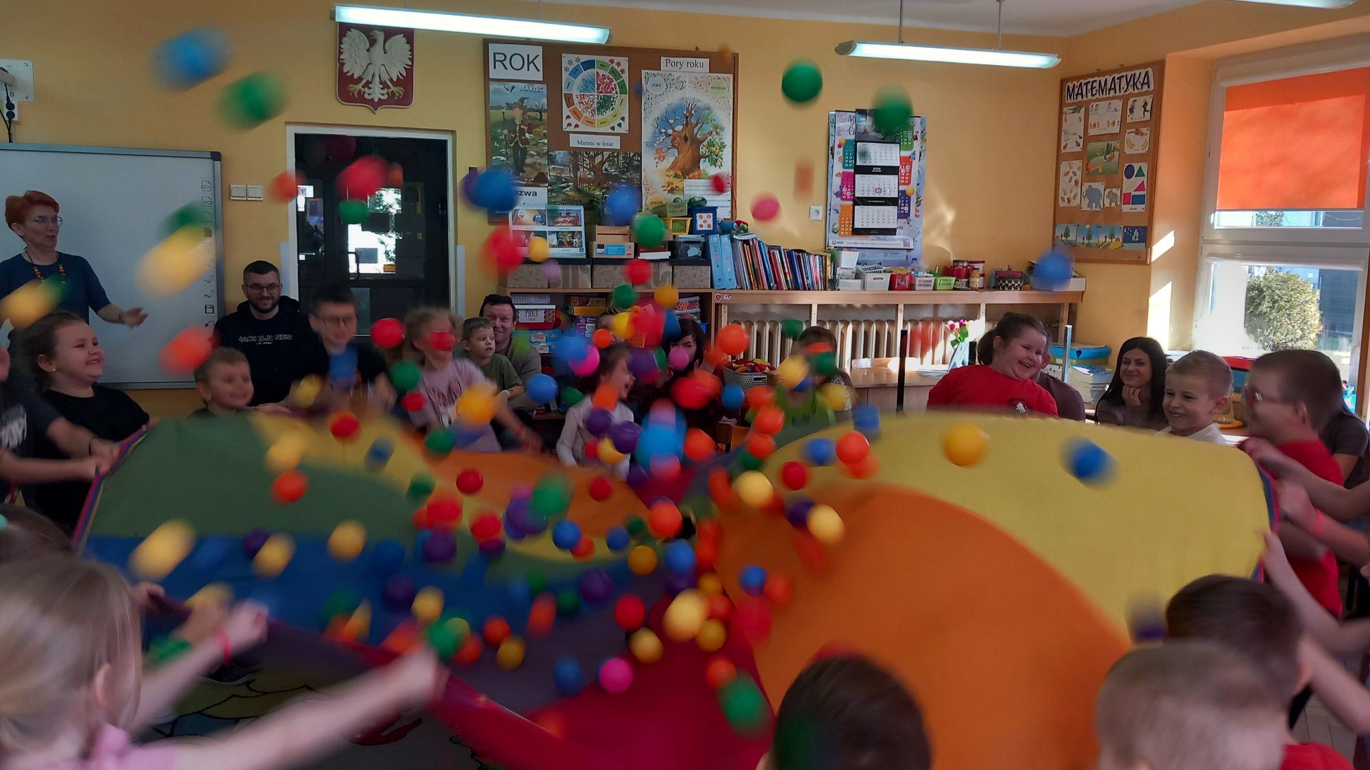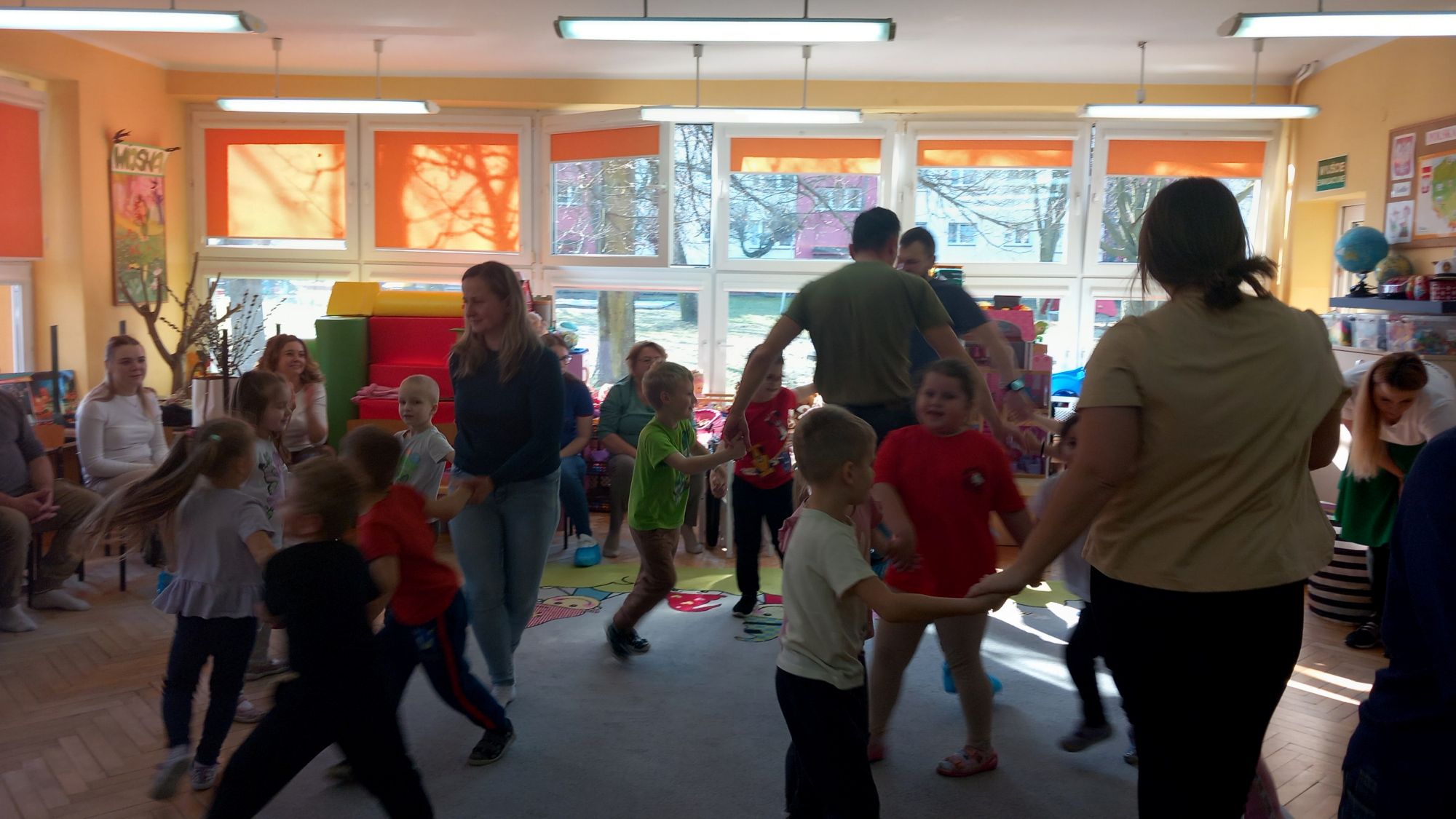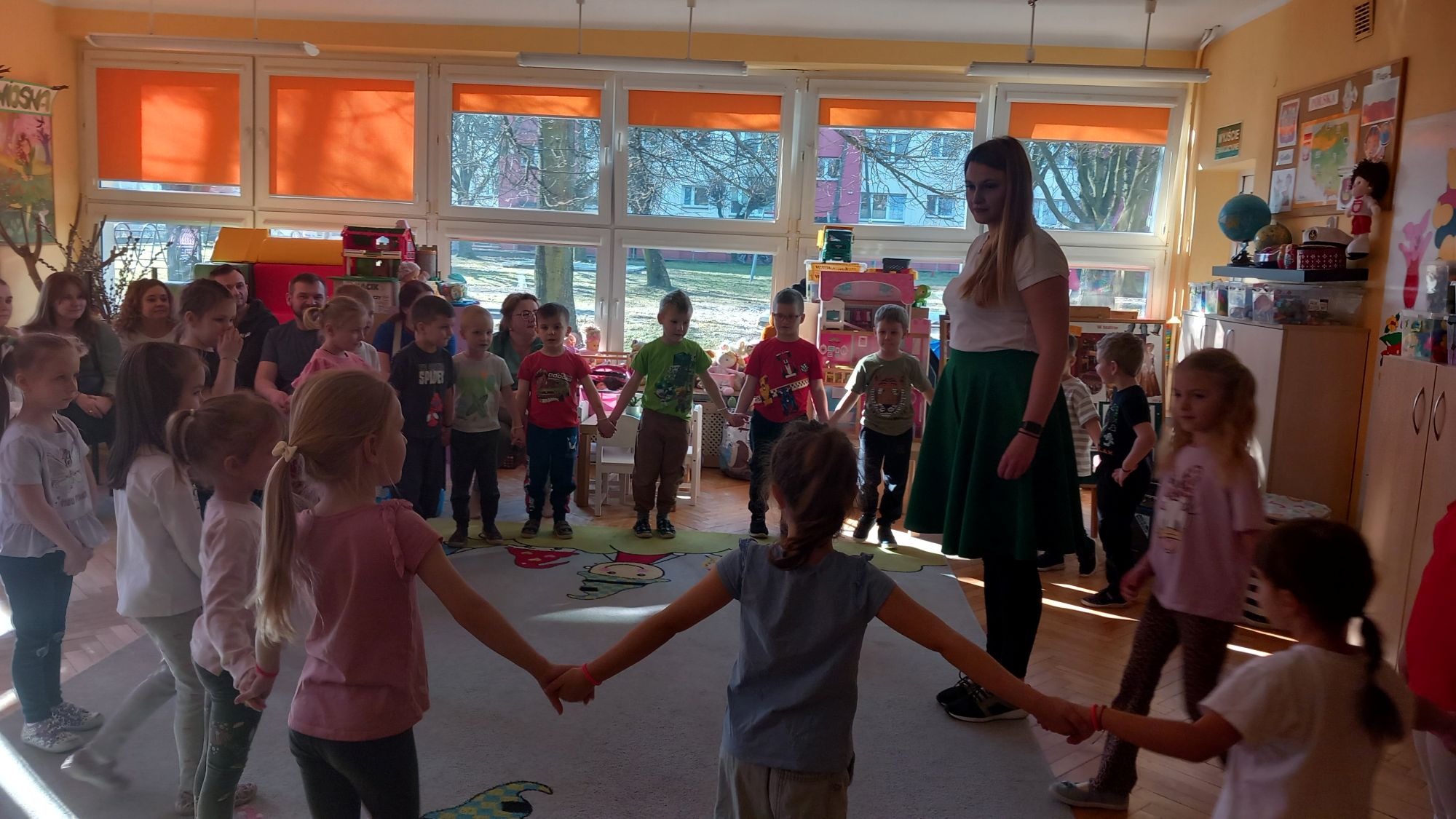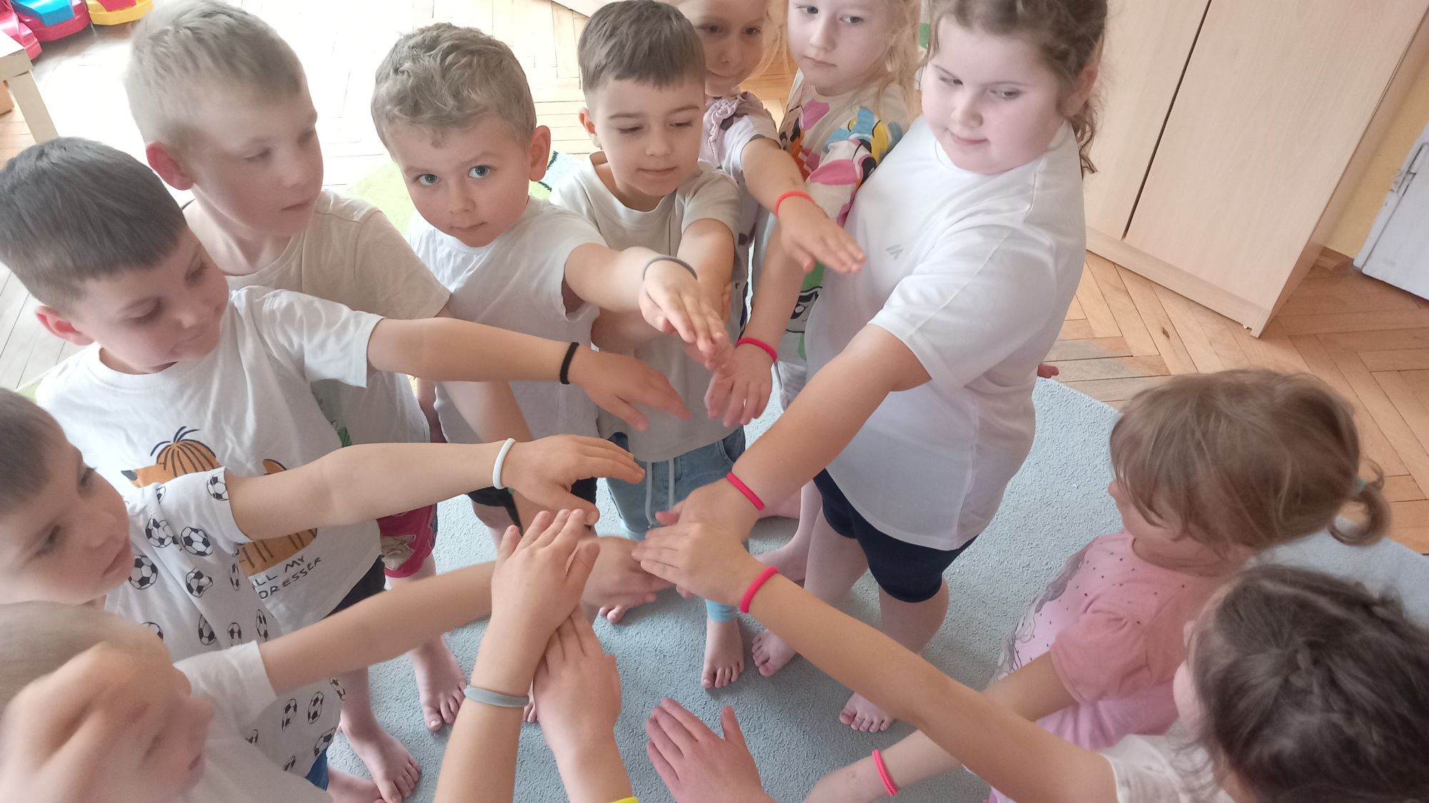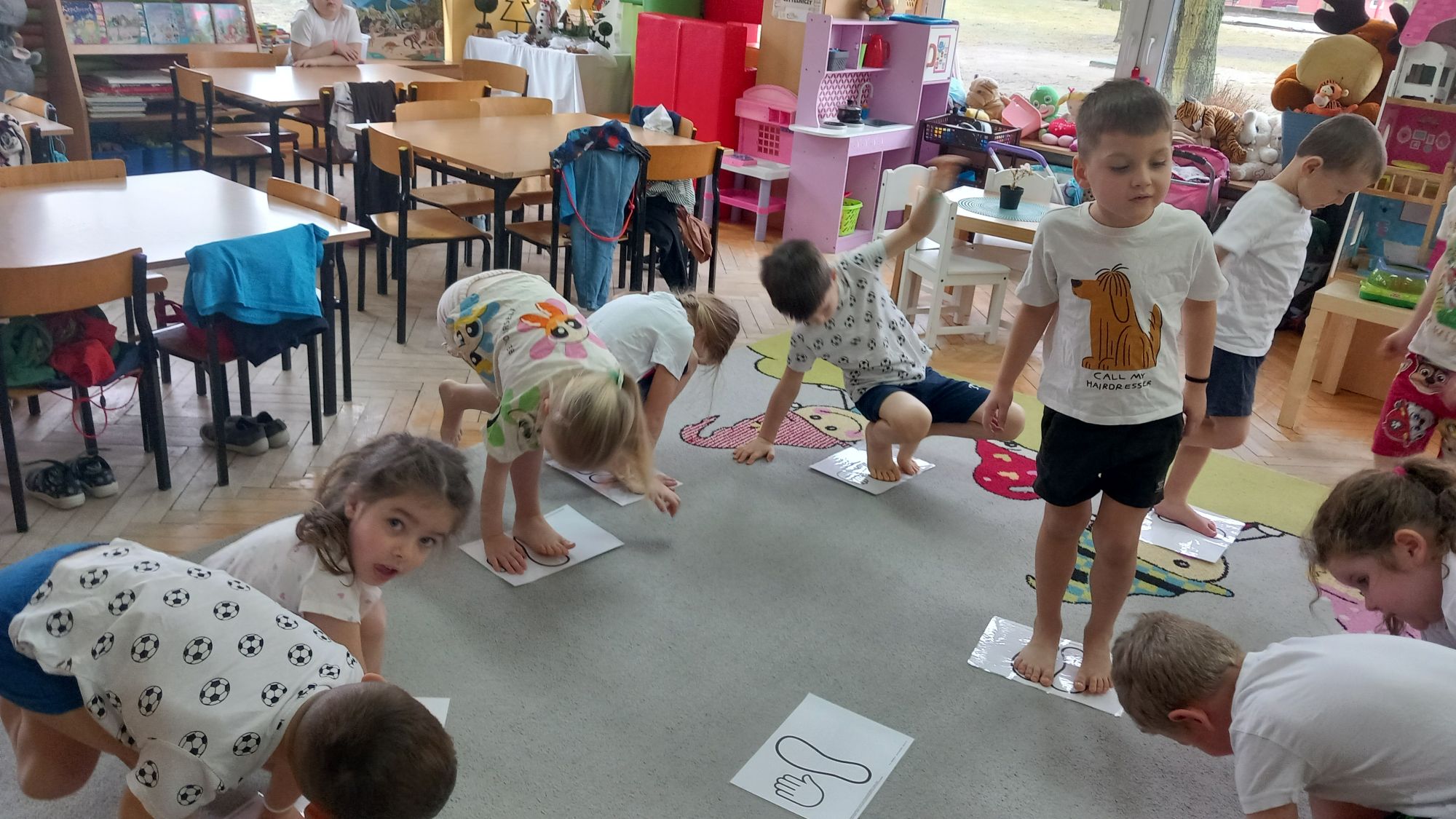 Dnia 18.02.2026 r. dzieci z grupy „Krasnoludków” uczestniczyły w zajęciu muzyczno – ruchowo – matematycznym „ Muzyka to Matematyka”. Zajęcia rozpoczęły się od powitania dzieci w kole przy wesołej piosence. Następnie nauczyciel przeprowadził krótką rozmowę wprowadzającą dotyczącą prawej i lewej strony ciała. Dzieci wskazywały prawą i lewą rękę oraz nogę. Każdy przedszkolak miał założoną kolorową frotkę na lewej ręce aby nie pomylić rąk. Kolejnym elementem była zabawa muzyczno-ruchowa. Podczas słuchania muzyki dzieci wykonywały polecenia nauczyciela, np. podnosiły prawą rękę, stawiały krok w lewą stronę lub klaskały określoną liczbę razy prawą lub lewą ręką. W dalszej części zajęć dzieci uczestniczyły w zabawie „Muzyczne kierunki”. Podczas grania muzyki poruszały się swobodnie po sali, natomiast gdy muzyka zatrzymywała się, nauczyciel podawał polecenie, np. „krok w prawo”, „obrót w lewo”, „podnieś lewą rękę”. Dzieci starały się prawidłowo wykonać polecenia. Następnie wykorzystano elementy matematyczne – dzieci wykonywały określoną liczbę ruchów (np. dwa kroki w prawo, trzy podskoki w lewo), jednocześnie licząc na głos. Na zakończenie odbyła się spokojna zabawa ruchowa przy muzyce relaksacyjnej oraz krótkie podsumowanie zajęć. Dzieci wspólnie przypomniały, która strona jest prawa, a która lewa. Zajęcia wzbudziły duże zainteresowanie i pozwoliły w atrakcyjny sposób połączyć naukę kierunków z zabawą muzyczną. Cele zajęć zostały zrealizowane.
