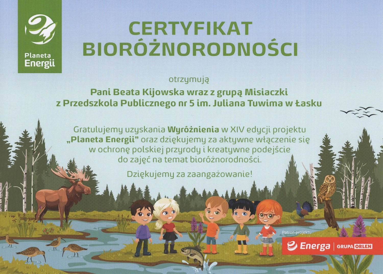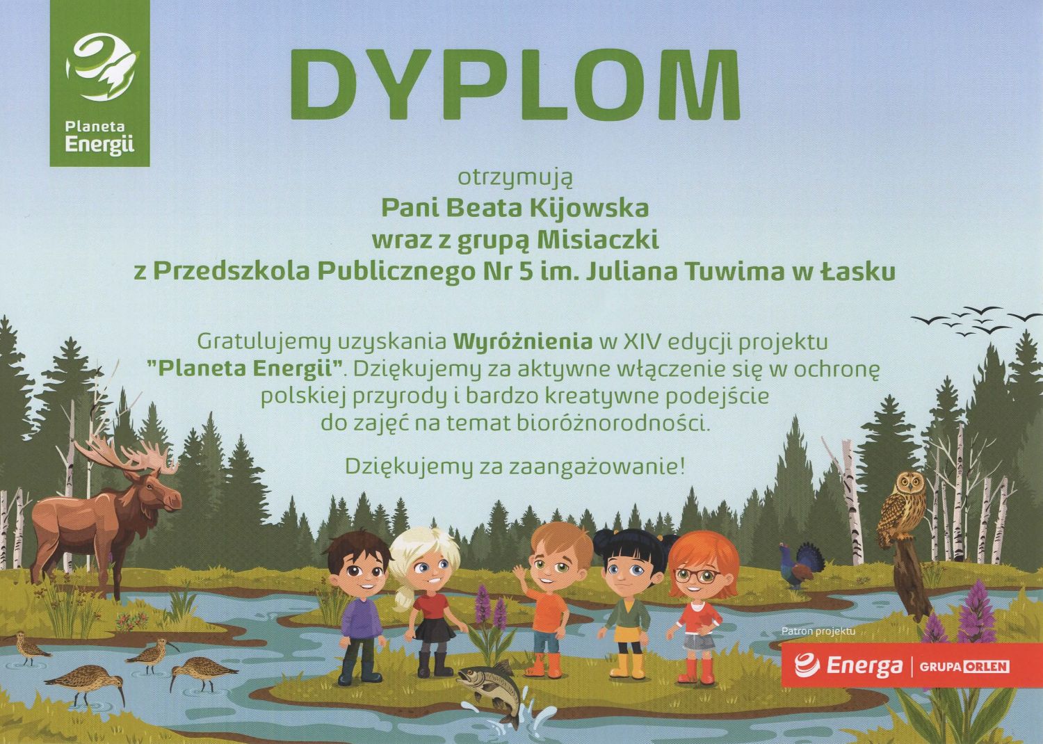 Z radością informujemy, że nasza placówka zdobyła wyróżnienie w 14. Edycji programu Planeta Energii. Łącznie do projektu zgłoszonych zostało ponad 600 nauczycieli, a w realizacji konkursowych scenariuszy zaangażowano ponad 14 tysięcy uczniów, więc konkurencja w tym roku była ogromna.