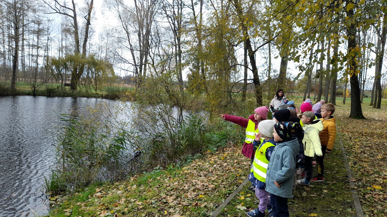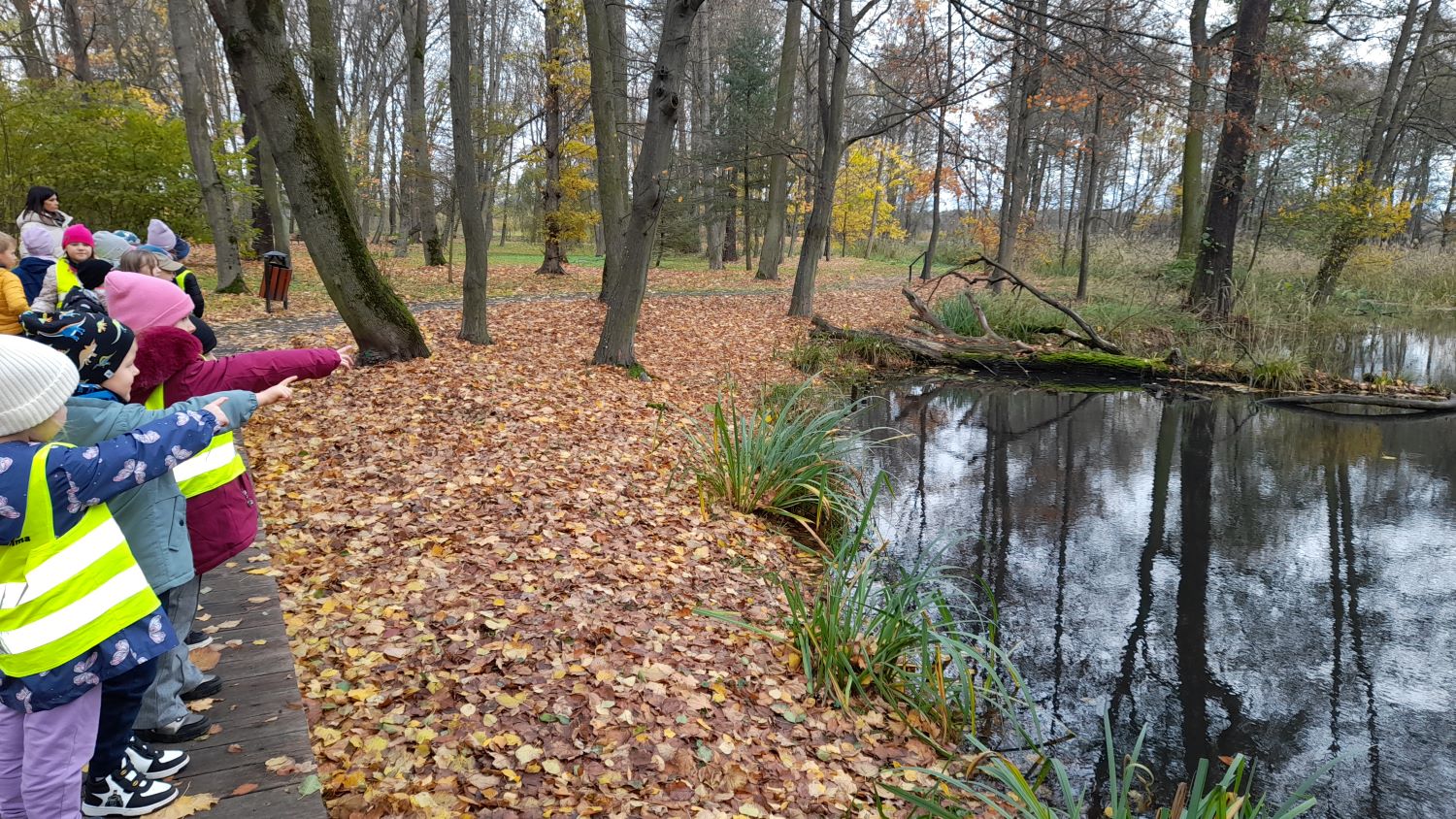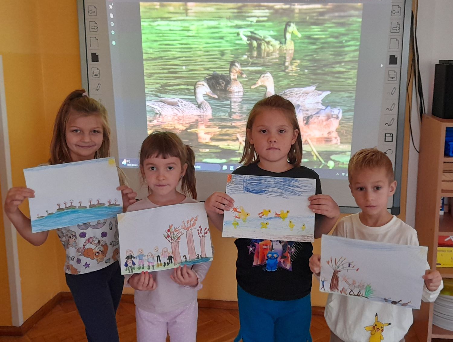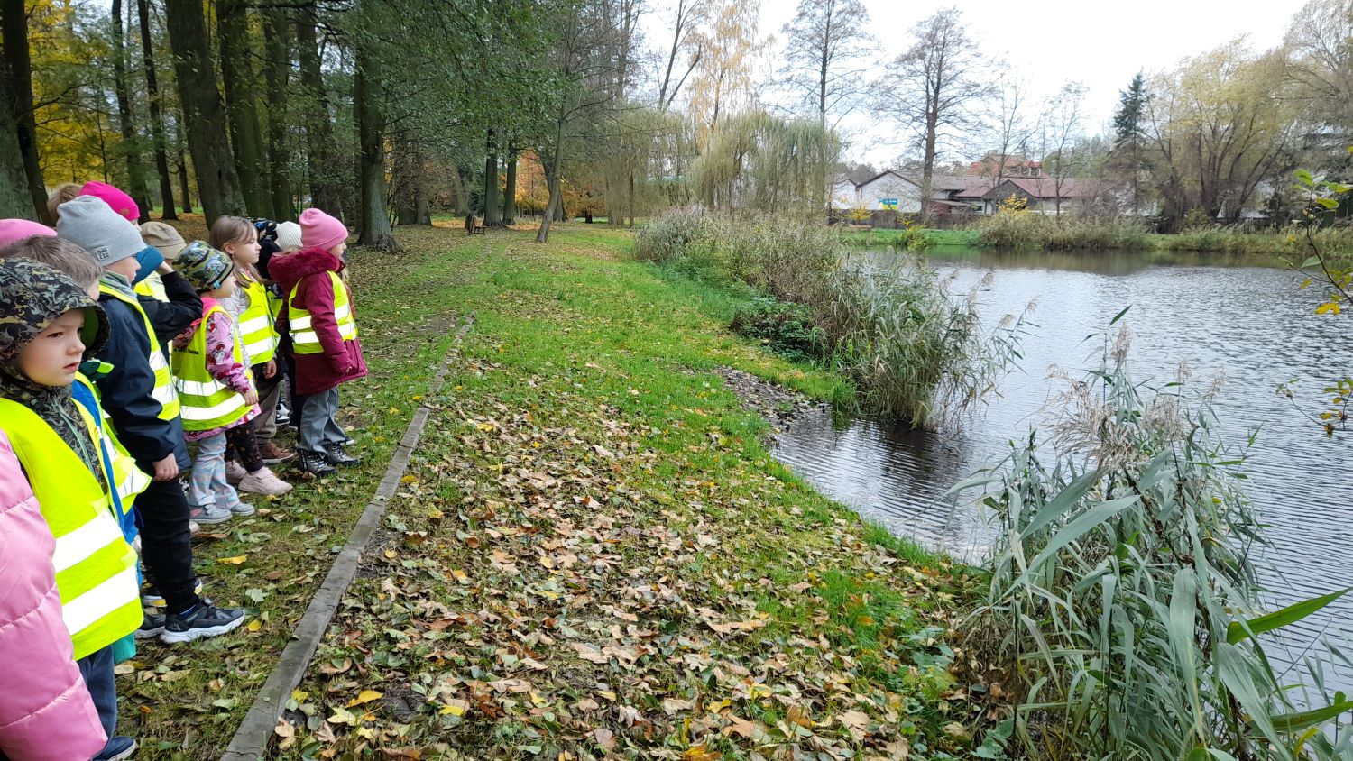 Przygotowując się do realizacji scenariusza: „Gdzie kryje się woda?” rozpoczęliśmy od wycieczki do Parku Miejskiego im. Rodu Łaskich w Łasku. Dzieci podziwiały przede wszystkim stawy, oczka wodne i przepływającą rzekę Grabię, a także piękne stare drzewa i pomniki przyrody. Przedszkolaki zaobserwowały rosnącą wokoło przyrodę, drzewa w pięknej jesiennej szacie oraz zwierzęta: kaczki pływające na stawie, żaby i małe rybki. Dzieci z zainteresowaniem obserwowały przyrodę i zwierzęta. Był też czas na spontaniczne zabawy na świeżym powietrzu. Po powrocie dzieci narysowały na kartkach kadry z naszej wycieczki.