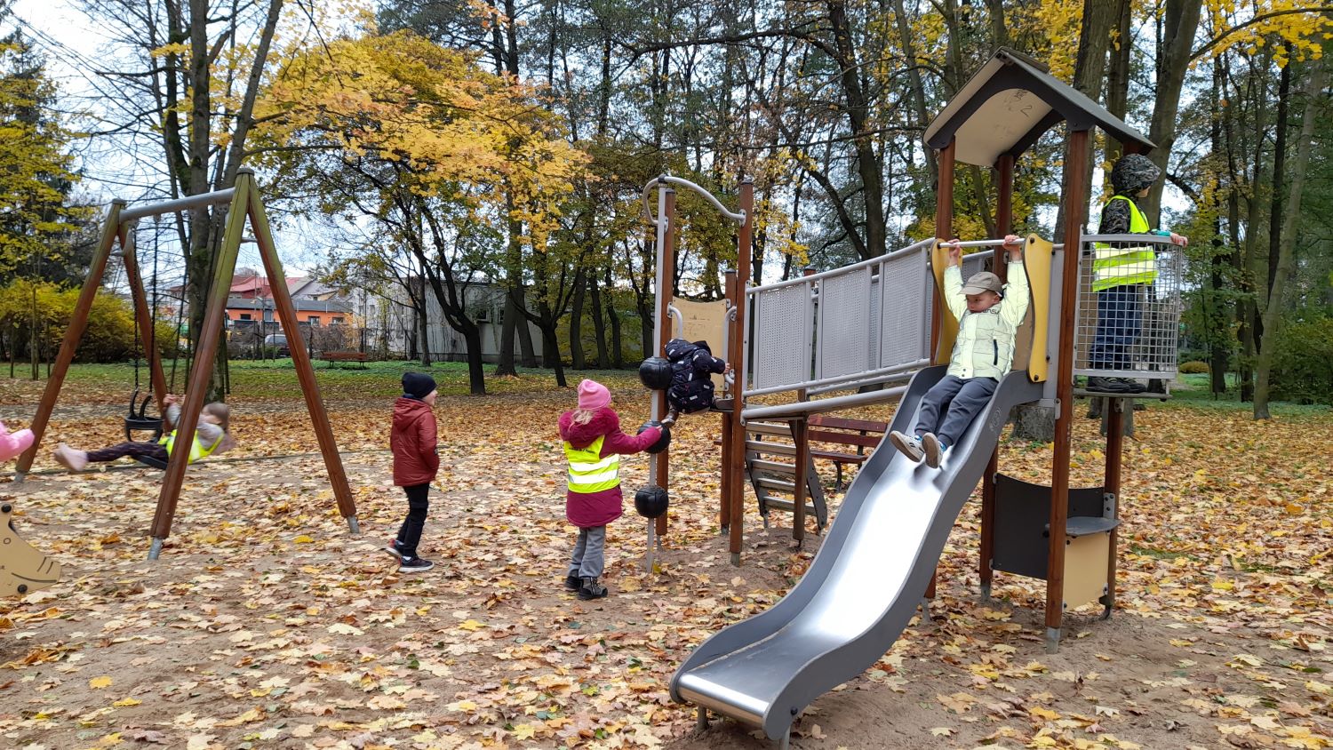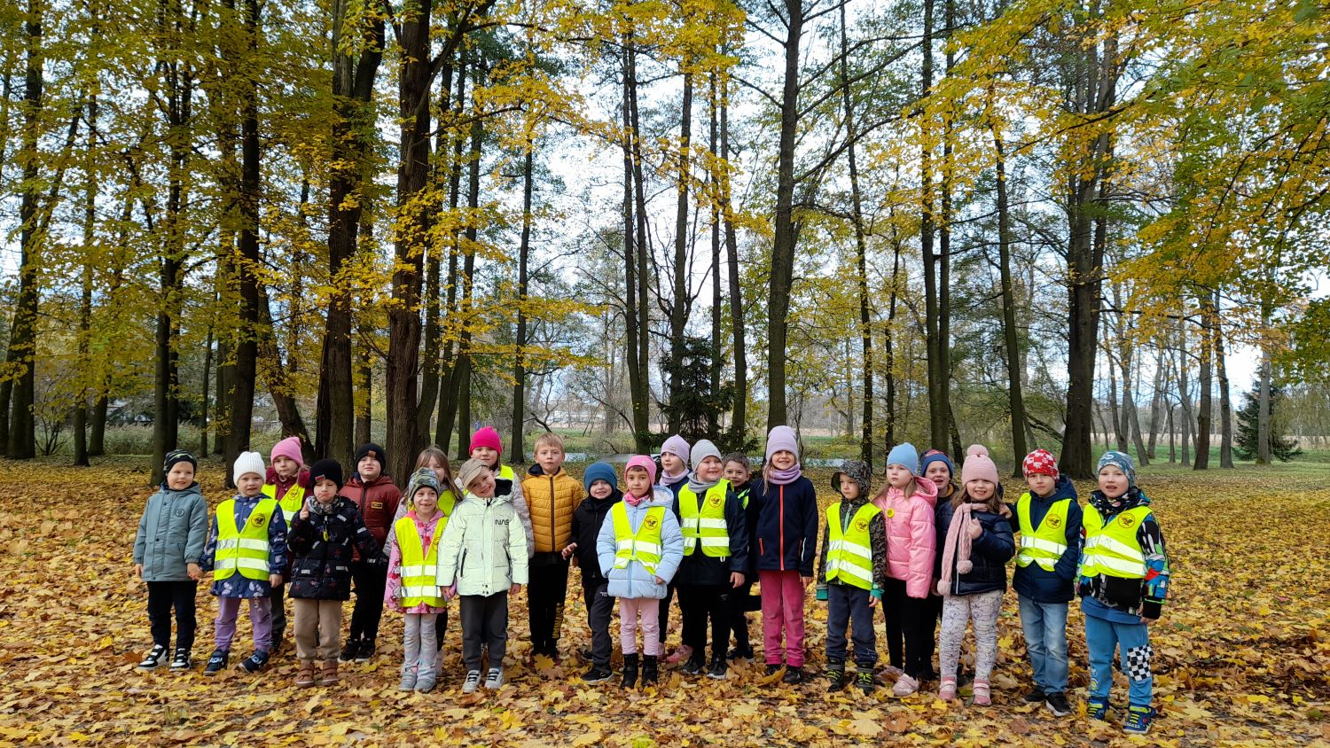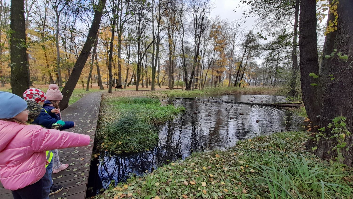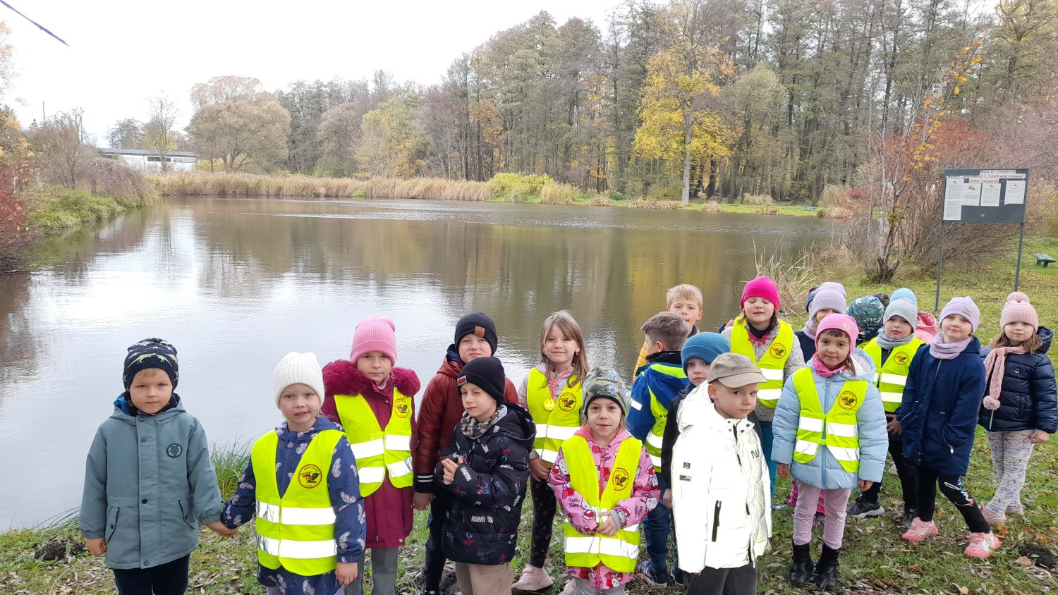 Przygotowując się do realizacji scenariusza: „Gdzie kryje się woda?” rozpoczęliśmy od wycieczki do Parku Miejskiego im. Rodu Łaskich w Łasku. Dzieci podziwiały przede wszystkim stawy, oczka wodne i przepływającą rzekę Grabię, a także piękne stare drzewa i pomniki przyrody. Przedszkolaki zaobserwowały rosnącą wokoło przyrodę, drzewa w pięknej jesiennej szacie oraz zwierzęta: kaczki pływające na stawie, żaby i małe rybki. Dzieci z zainteresowaniem obserwowały przyrodę i zwierzęta. Był też czas na spontaniczne zabawy na świeżym powietrzu. Po powrocie dzieci narysowały na kartkach kadry z naszej wycieczki.