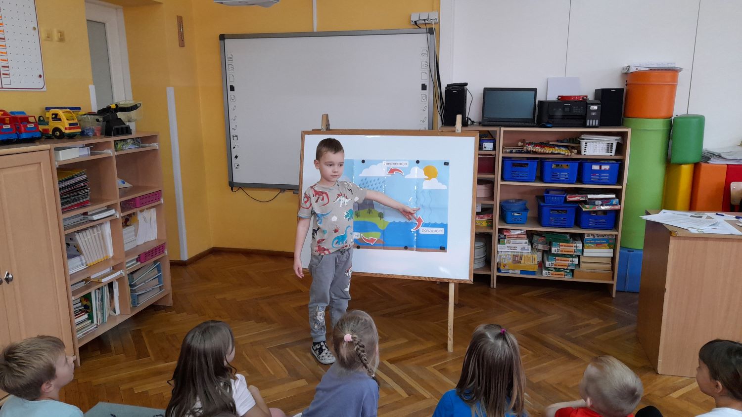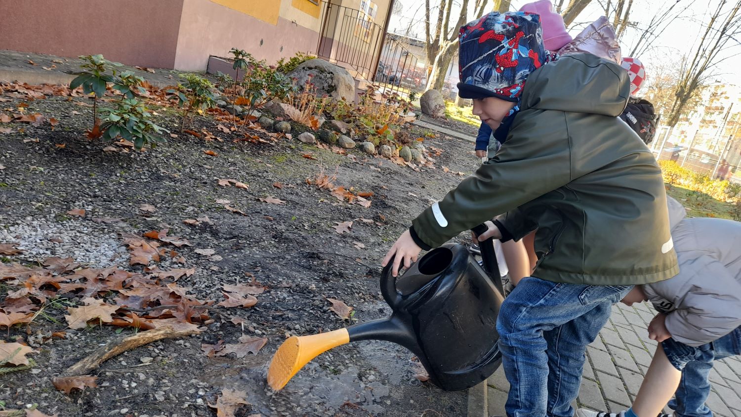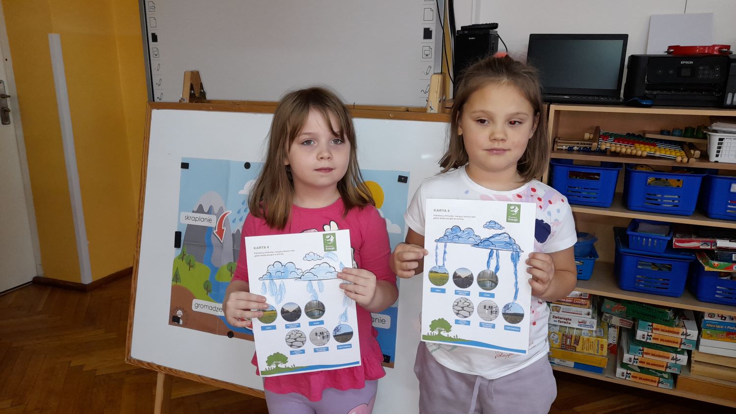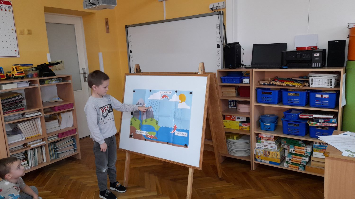 Podczas zabaw w sali dzieci ilustrowały ruchem gdzie można zobaczyć wodę, obserwowały schemat wędrówki wody w przyrodzie. 6-latki dowiedziały się również jakie są sposoby zatrzymywania wody w środowisku. Dzięki uprzejmości rodziców jednego z dzieci, 6-latki mogły własnoręcznie posadzić cebulki kwiatów przed naszym przedszkolem. Każde dziecko wie, że m. in. w taki sposóbmożemy pomagać przyrodzie, aby było więcej wody. Na koniec przedszkolaki utrwaliły poznane wiadomości, wypełniając przygotowane karty pracy.