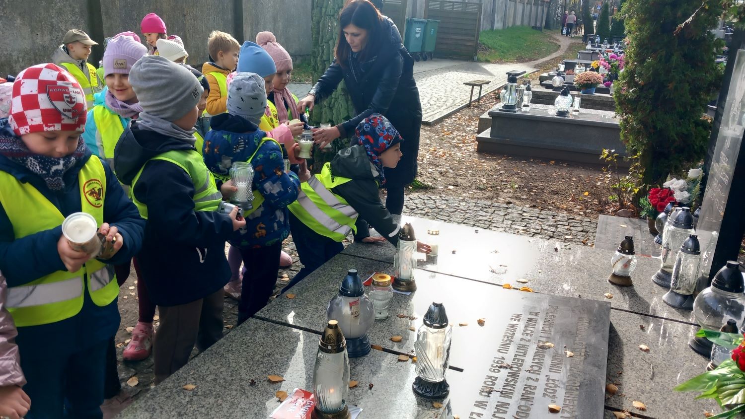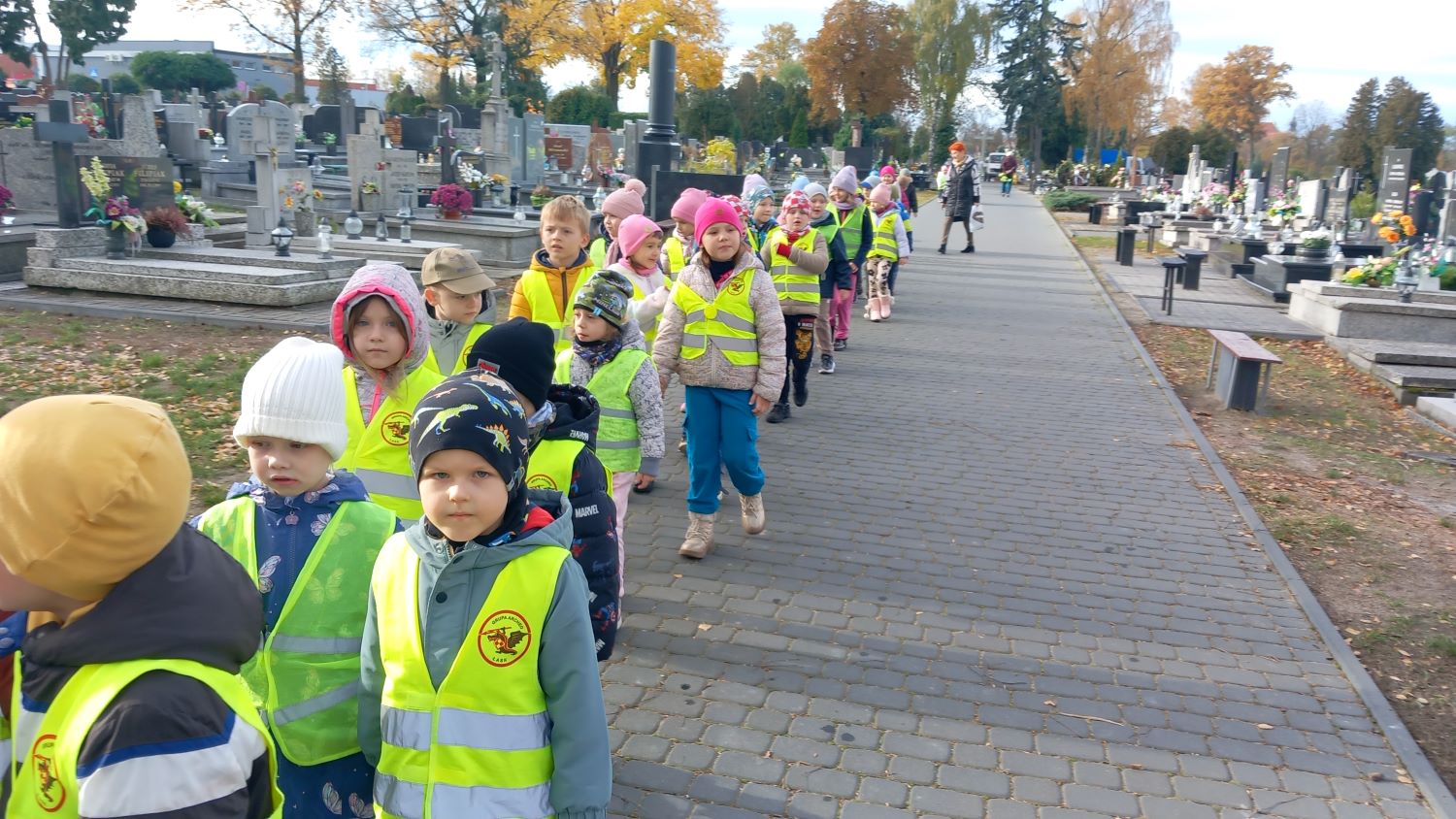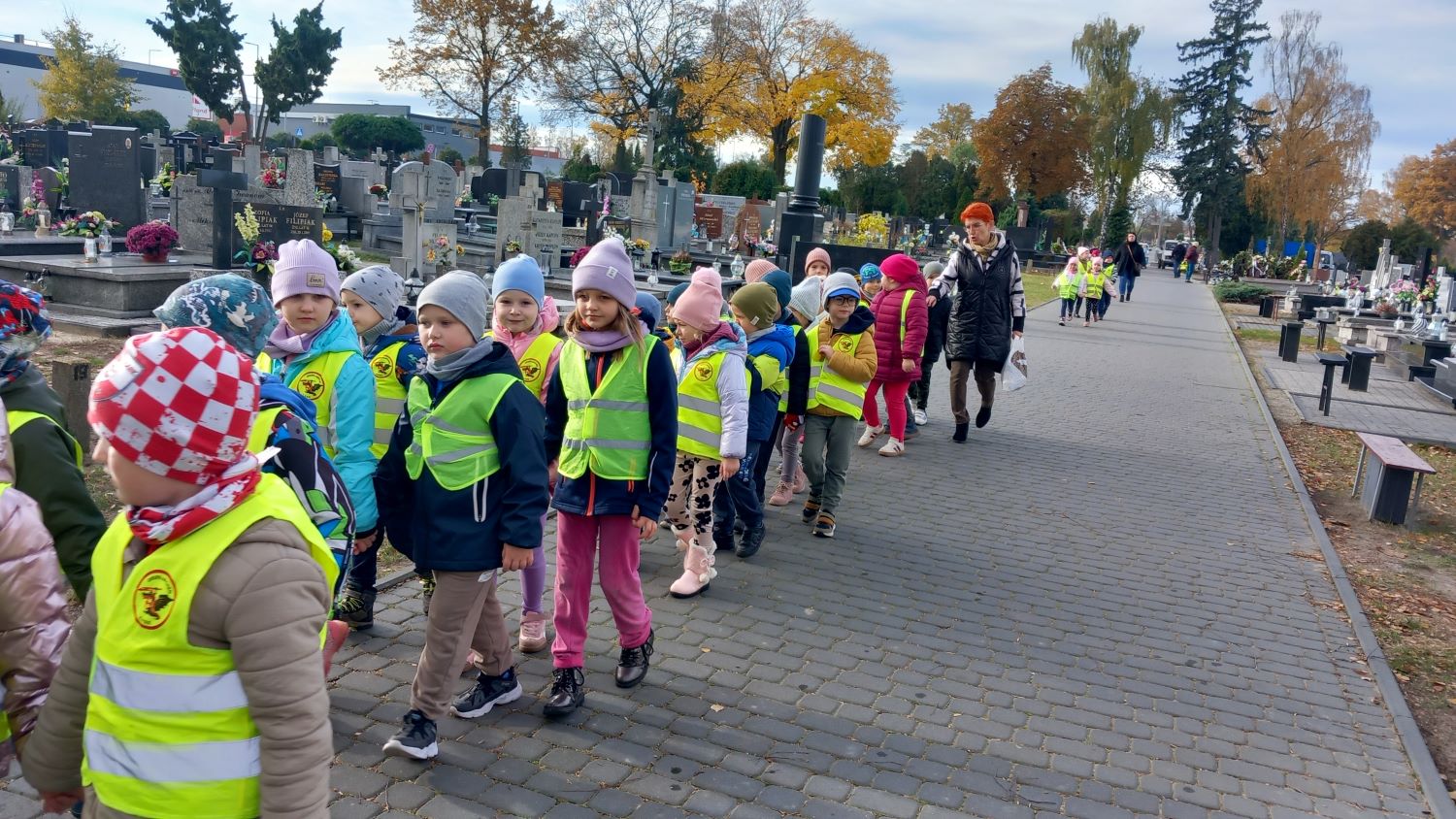 Święto Zmarłych, to czas, w którym odwiedzamy groby i wspominamy tych, którzy od nas odeszli. Kultywując polską tradycję w czwartek 30.10.2025 r. przedszkolaki z grupy „ Krasnoludków” i „ Misiaczków” udały się na Cmentarz parafii Niepokalanego Poczęcia NMP w Łasku. Podczas pobytu na cmentarzu przedszkolaki mogły w ciszy i zadumie posłuchać opowieści na temat przeszłości naszej ojczyzny i zapalić znicze na Grobie Nieznanego Żołnierza oraz oddać hołd poległym, którzy walczyli w obronie naszej ojczyzny. Dzieci dowiedziały się jak należy zachowywać się na cmentarzu, by nie zakłócać spokoju zmarłych i osób odwiedzających to miejsce. Spacer alejkami cmentarza był dla dzieci ogromnym przeżyciem, szły skupione i bardzo zaciekawione. To była jedna z ważniejszych lekcji wychowania rodzinnego, obywatelskiego i patriotycznego, która z pewnością pozostanie w pamięci dzieci.