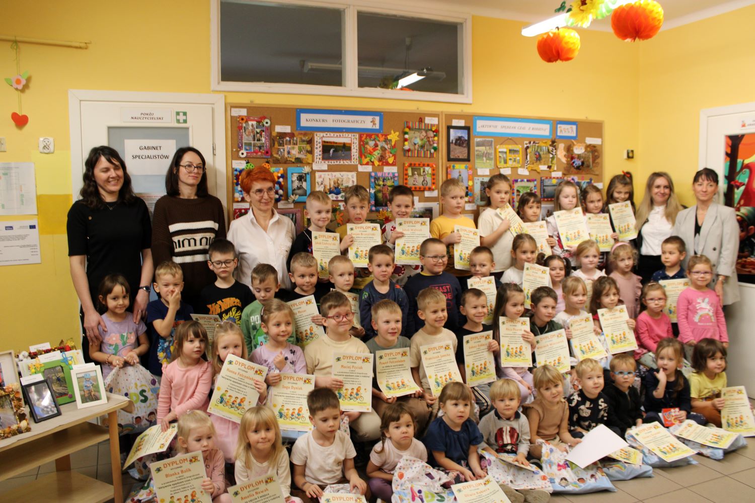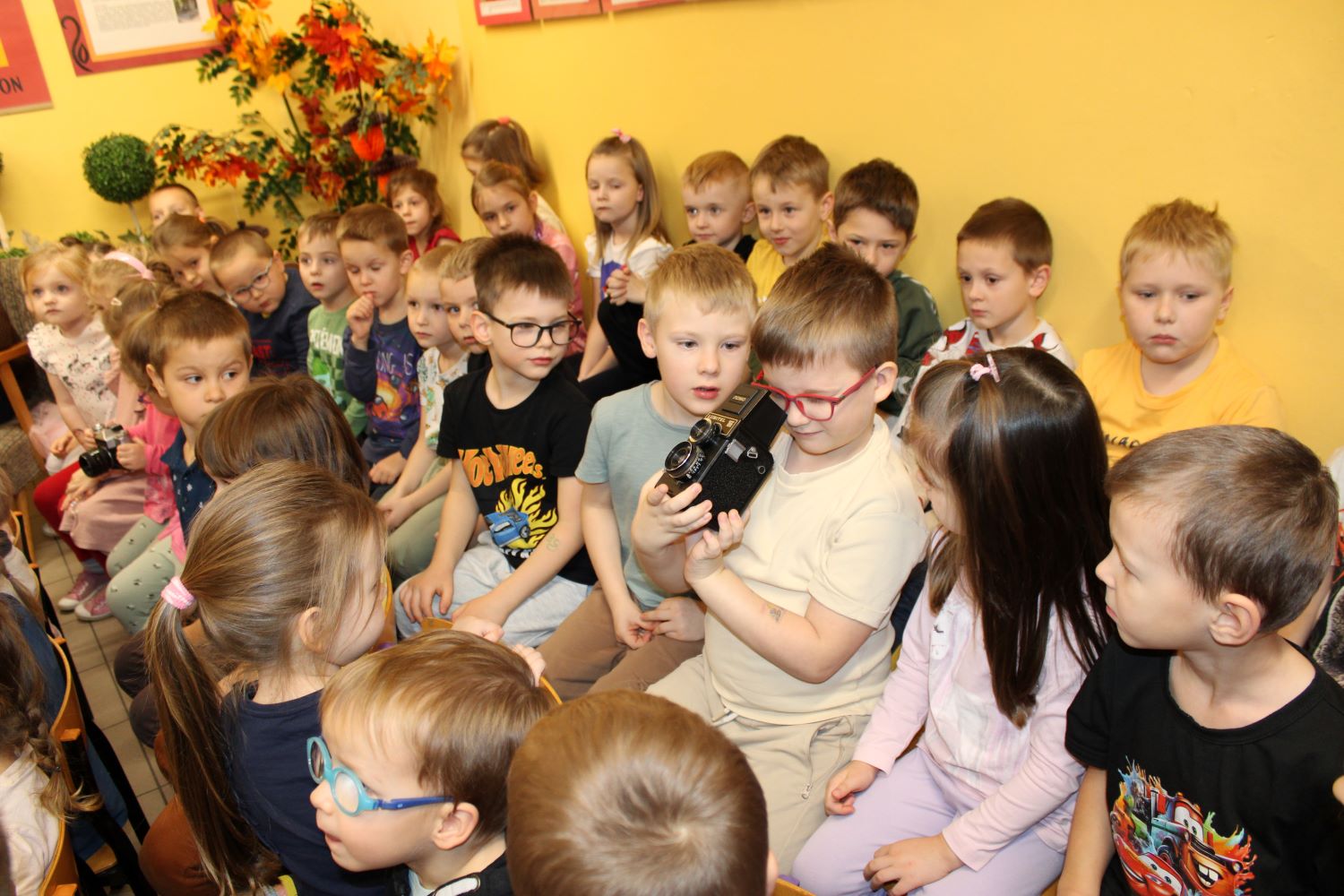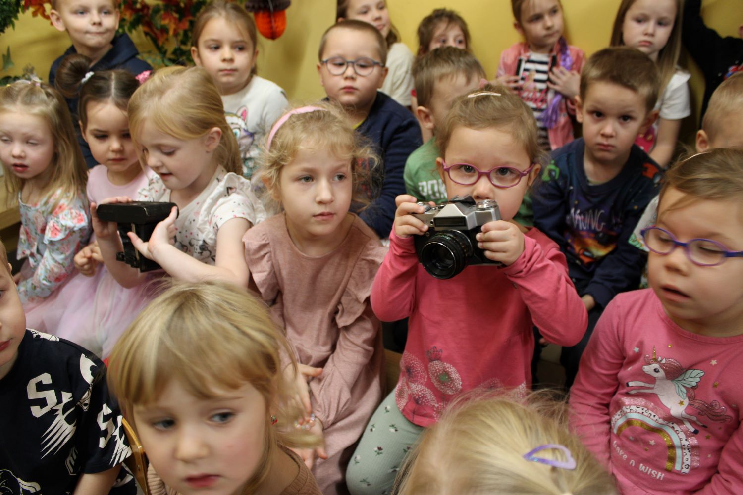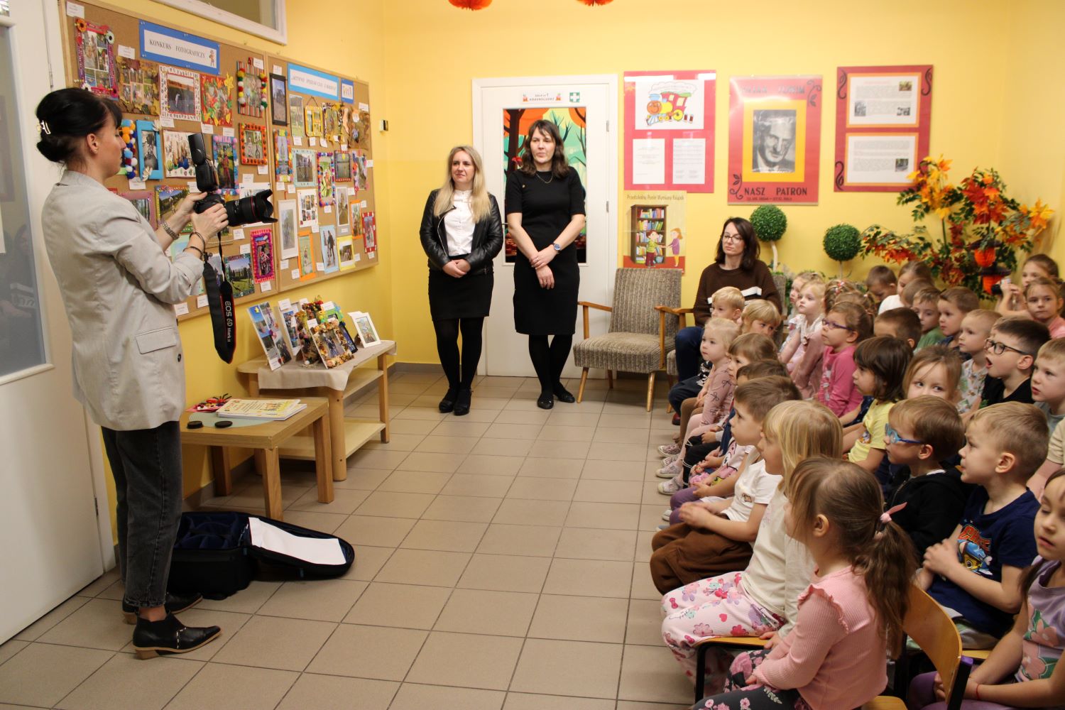 oraz 5 wyróżnień, które otrzymali : Paweł Felcenloben z „Krasnoludków”, Lena Żero ze „Słoneczek”, Fabian Kasprzak z „Żabek”, Kasjan Brzeziński z „Misiaczków” i Alicja Strzopa z „Biedronek”. Wszyscy uczestnicy konkursu, niezależnie od zajętego miejsca, zostali nagrodzeni dyplomami i nagrodami ufundowanymi przez Radę Rodziców i Dyrektora Przedszkola. Każde dziecko otrzymało książkę „101 zabaw” z łamigłówkami, mini kolorowankę, kredki oraz słodkości. Wręczenia nagród dokonały trzy panie, przedstawicielka Rady Rodziców – pani Agata Okrasa, pani dyrektor – Zofia Molenda – Kimla i pani Agnieszka z grupy „Krasnoludków”. Gościem specjalnym rozstrzygnięcia naszego konkursu była pani fotograf - Aneta Nawrocka ze studia fotograficznego „fotoGrafik” na ulicy Kościuszki. Pani Aneta przybliżyła przedszkolakom zawód fotografa. Pokazała zdjęcia wykonywane na sesjach fotograficznych i do dokumentów, różne rodzaje aparatów fotograficznych, od tych najstarszych po nowoczesną lustrzankę. Dzieci z zainteresowaniem oglądały aparaty z czasów ich dziadków i pradziadków oraz dzieliły się swoimi spostrzeżeniami. Odpowiadając na pytania pani dyrektor nasz gość podzielił się z nami swoją wiedzą i pasją do fotografii. Na koniec spotkania pani fotograf zrobiła wszystkim uczestnikom profesjonalne zdjęcie zbiorowe. Bardzo dziękujemy pani Anecie i pani Agacie z Rady Rodziców za przybycie i poświęcony czas. Serdeczne podziękowania i gratulacje kierujemy również do rodziców, którzy wraz ze swoimi pociechami wzięli udział w naszym konkursie. Zachęcamy do wspólnych aktywności z całą rodziną i zapraszamy do udziału w innych przedszkolnych działaniach.