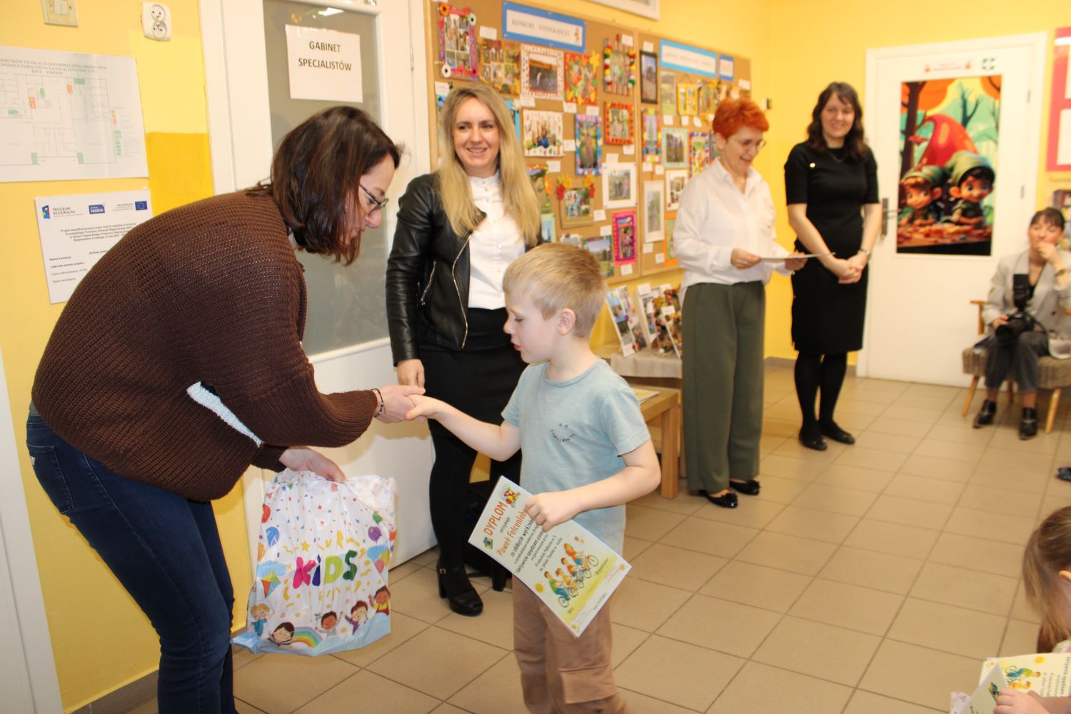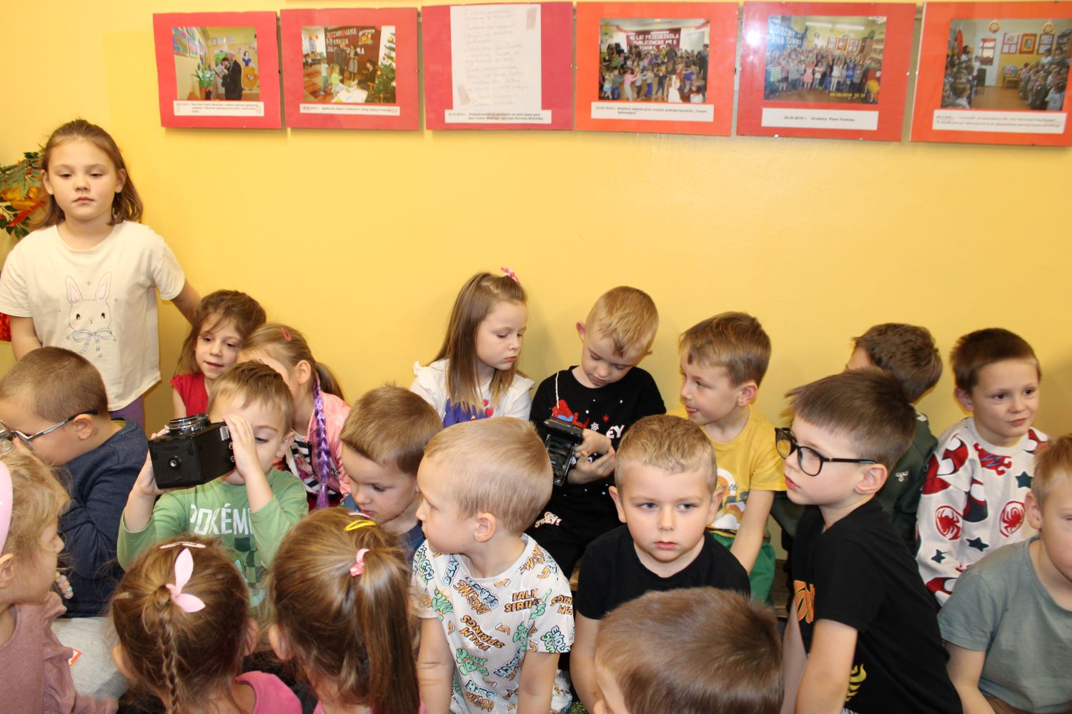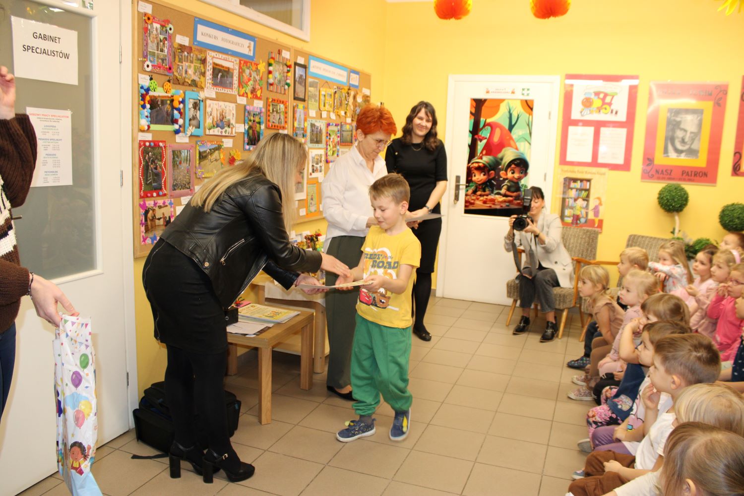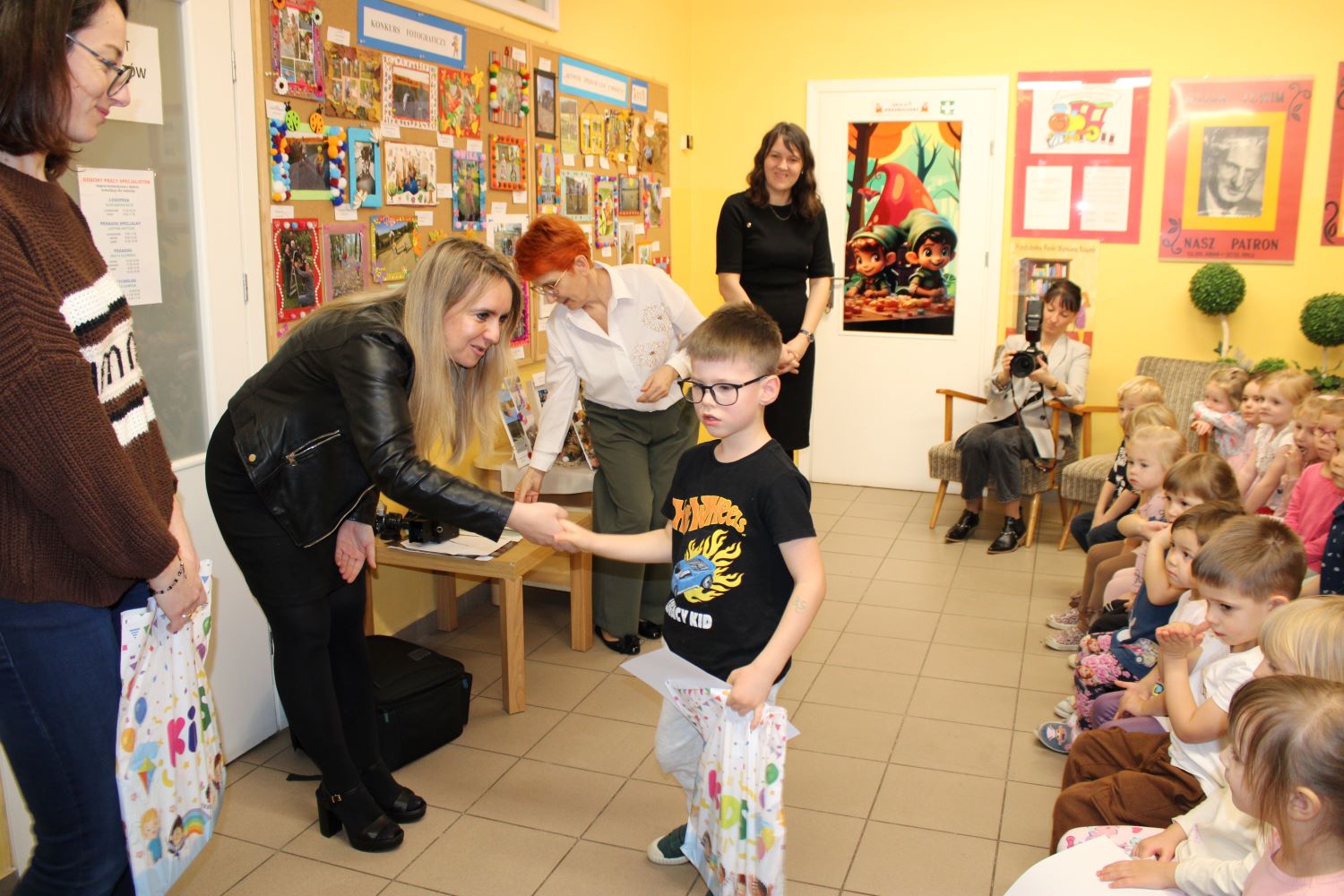 oraz 5 wyróżnień, które otrzymali : Paweł Felcenloben z „Krasnoludków”, Lena Żero ze „Słoneczek”, Fabian Kasprzak z „Żabek”, Kasjan Brzeziński z „Misiaczków” i Alicja Strzopa z „Biedronek”. Wszyscy uczestnicy konkursu, niezależnie od zajętego miejsca, zostali nagrodzeni dyplomami i nagrodami ufundowanymi przez Radę Rodziców i Dyrektora Przedszkola. Każde dziecko otrzymało książkę „101 zabaw” z łamigłówkami, mini kolorowankę, kredki oraz słodkości. Wręczenia nagród dokonały trzy panie, przedstawicielka Rady Rodziców – pani Agata Okrasa, pani dyrektor – Zofia Molenda – Kimla i pani Agnieszka z grupy „Krasnoludków”. Gościem specjalnym rozstrzygnięcia naszego konkursu była pani fotograf - Aneta Nawrocka ze studia fotograficznego „fotoGrafik” na ulicy Kościuszki. Pani Aneta przybliżyła przedszkolakom zawód fotografa. Pokazała zdjęcia wykonywane na sesjach fotograficznych i do dokumentów, różne rodzaje aparatów fotograficznych, od tych najstarszych po nowoczesną lustrzankę. Dzieci z zainteresowaniem oglądały aparaty z czasów ich dziadków i pradziadków oraz dzieliły się swoimi spostrzeżeniami. Odpowiadając na pytania pani dyrektor nasz gość podzielił się z nami swoją wiedzą i pasją do fotografii. Na koniec spotkania pani fotograf zrobiła wszystkim uczestnikom profesjonalne zdjęcie zbiorowe. Bardzo dziękujemy pani Anecie i pani Agacie z Rady Rodziców za przybycie i poświęcony czas. Serdeczne podziękowania i gratulacje kierujemy również do rodziców, którzy wraz ze swoimi pociechami wzięli udział w naszym konkursie. Zachęcamy do wspólnych aktywności z całą rodziną i zapraszamy do udziału w innych przedszkolnych działaniach.