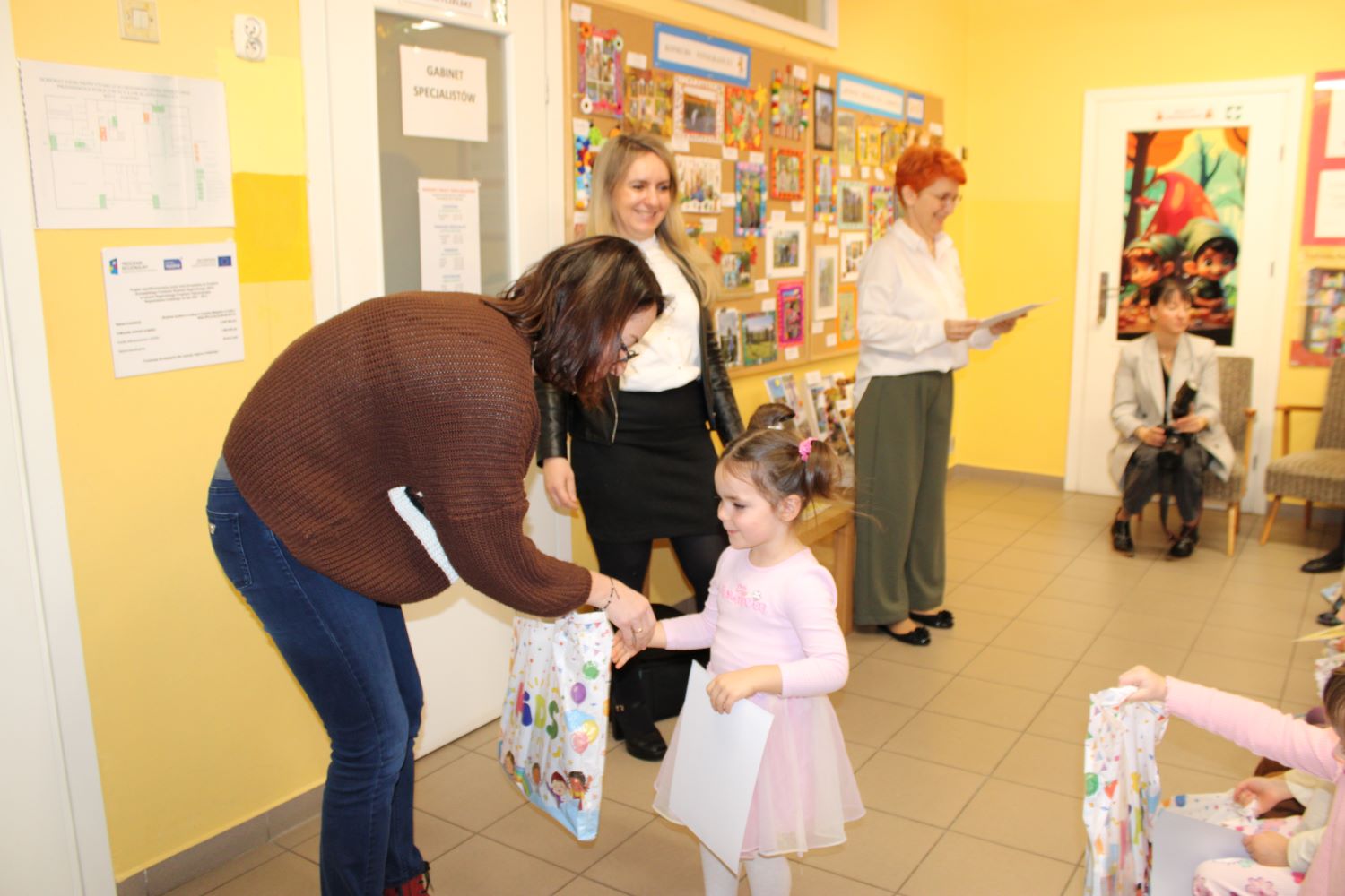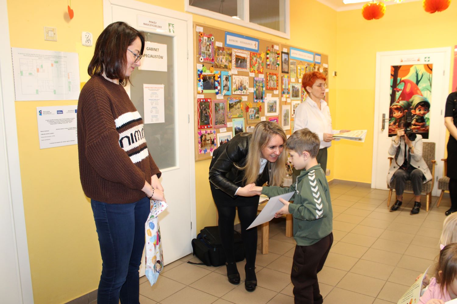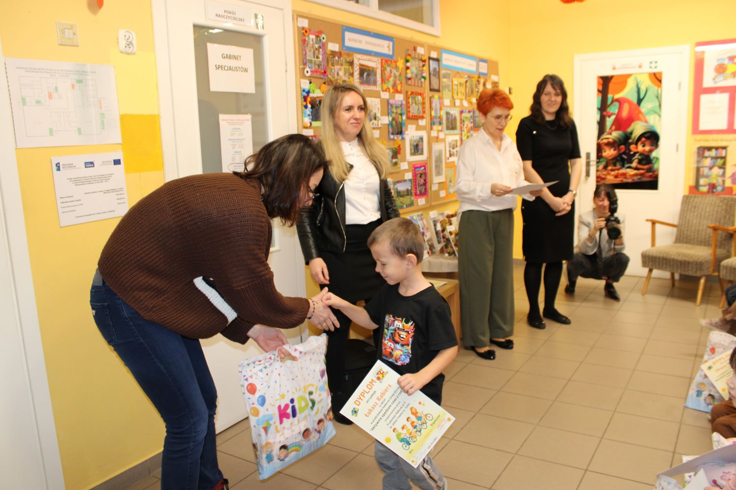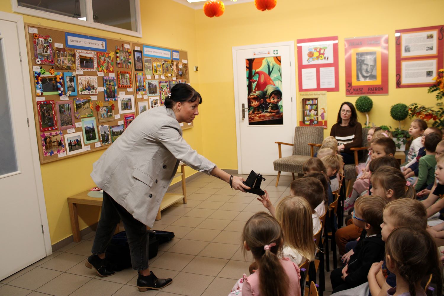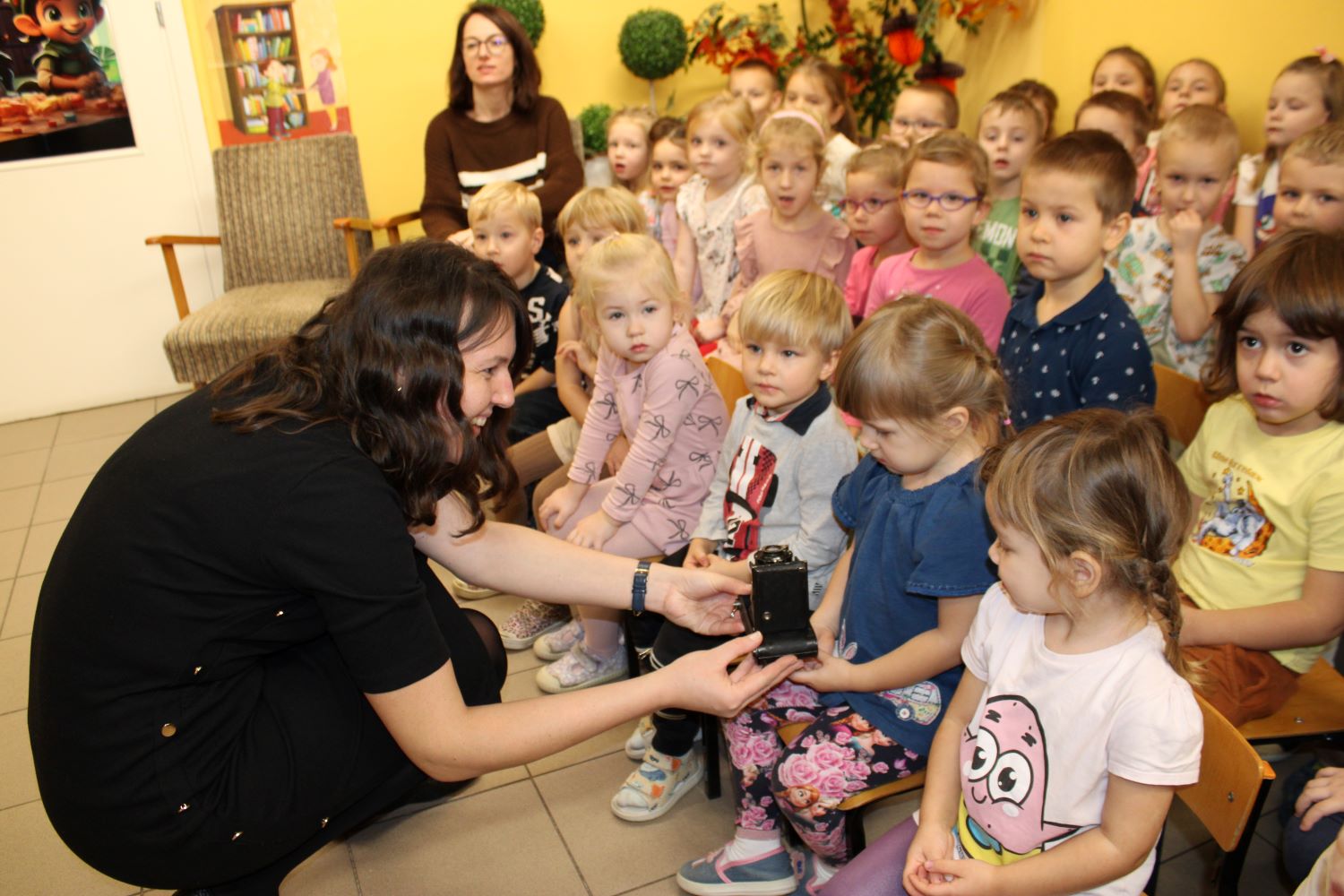 oraz 5 wyróżnień, które otrzymali : Paweł Felcenloben z „Krasnoludków”, Lena Żero ze „Słoneczek”, Fabian Kasprzak z „Żabek”, Kasjan Brzeziński z „Misiaczków” i Alicja Strzopa z „Biedronek”. Wszyscy uczestnicy konkursu, niezależnie od zajętego miejsca, zostali nagrodzeni dyplomami i nagrodami ufundowanymi przez Radę Rodziców i Dyrektora Przedszkola. Każde dziecko otrzymało książkę „101 zabaw” z łamigłówkami, mini kolorowankę, kredki oraz słodkości. Wręczenia nagród dokonały trzy panie, przedstawicielka Rady Rodziców – pani Agata Okrasa, pani dyrektor – Zofia Molenda – Kimla i pani Agnieszka z grupy „Krasnoludków”. Gościem specjalnym rozstrzygnięcia naszego konkursu była pani fotograf - Aneta Nawrocka ze studia fotograficznego „fotoGrafik” na ulicy Kościuszki. Pani Aneta przybliżyła przedszkolakom zawód fotografa. Pokazała zdjęcia wykonywane na sesjach fotograficznych i do dokumentów, różne rodzaje aparatów fotograficznych, od tych najstarszych po nowoczesną lustrzankę. Dzieci z zainteresowaniem oglądały aparaty z czasów ich dziadków i pradziadków oraz dzieliły się swoimi spostrzeżeniami. Odpowiadając na pytania pani dyrektor nasz gość podzielił się z nami swoją wiedzą i pasją do fotografii. Na koniec spotkania pani fotograf zrobiła wszystkim uczestnikom profesjonalne zdjęcie zbiorowe. Bardzo dziękujemy pani Anecie i pani Agacie z Rady Rodziców za przybycie i poświęcony czas. Serdeczne podziękowania i gratulacje kierujemy również do rodziców, którzy wraz ze swoimi pociechami wzięli udział w naszym konkursie. Zachęcamy do wspólnych aktywności z całą rodziną i zapraszamy do udziału w innych przedszkolnych działaniach.