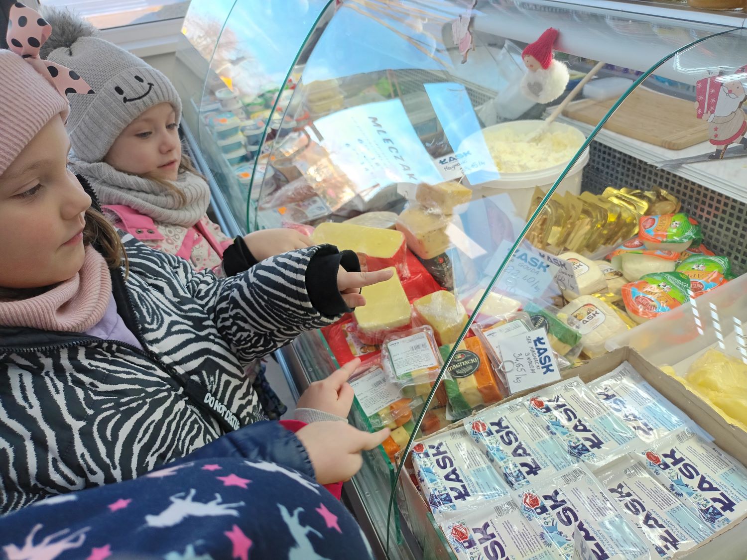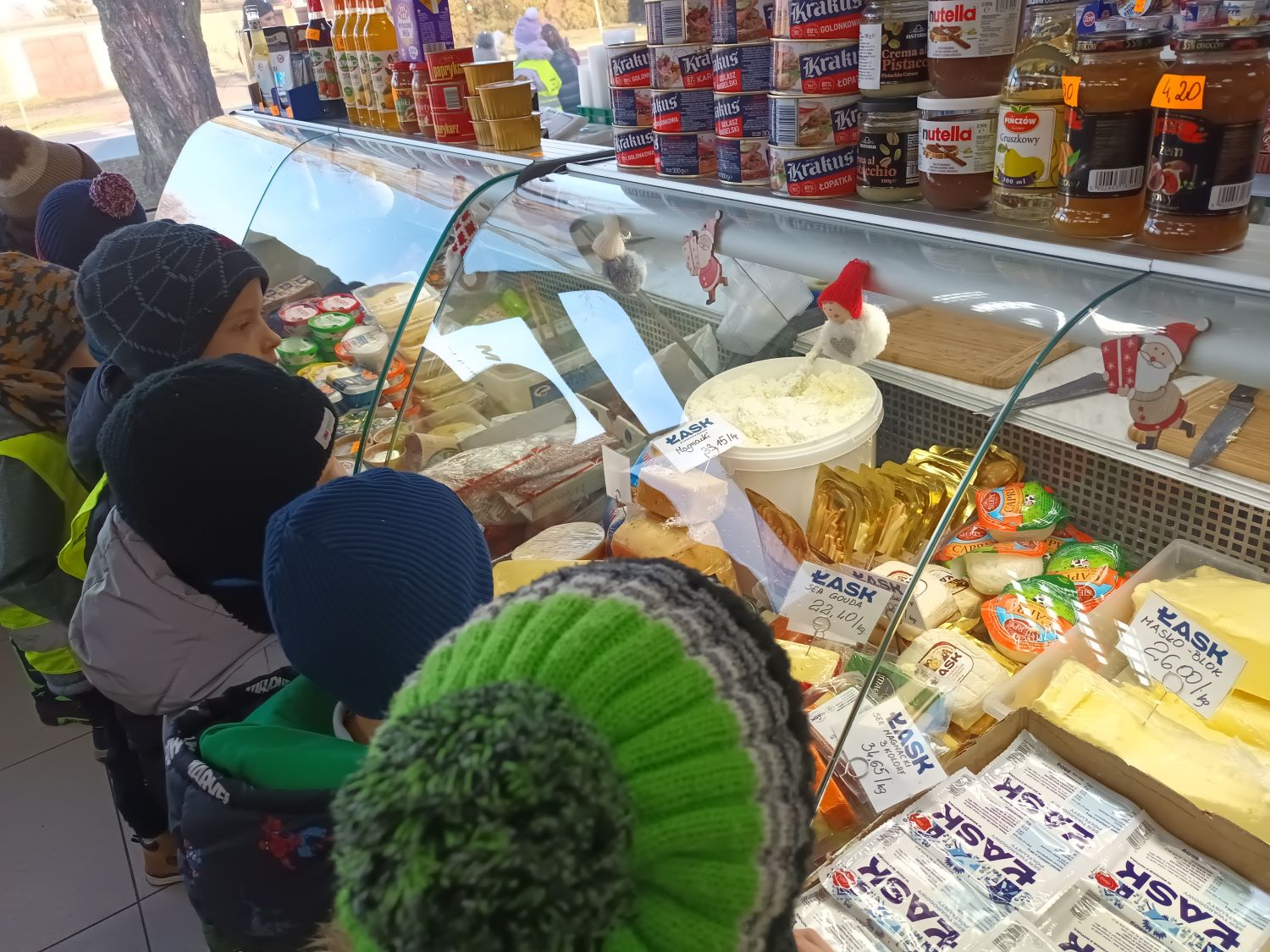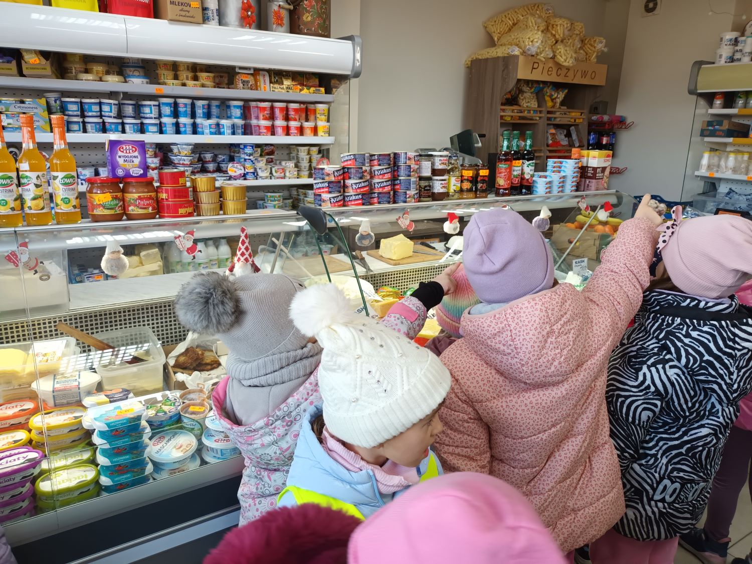 Dnia 10.12.2025r. grupa Misiaczków odwiedziła sklep firmowy OSM Łask „Mleczak”. Jak nazwa wskazuje większą część zaopatrzenia sklepu to produkty mleczne i wykonane z mleka. Dzieci poznały różne rodzaje serów: topione, żółte, sery białe, homogenizowane. Pokazywały półki, na których stały jogurty naturalne i wzbogacone owocami, kefiry, maślanki, śmietany i mleko o różnej zawartości tłuszczu. Przedszkolaki wiedzą, że produkty mleczne są źródłem wapnia i wielu odżywczych składników. Wymieniały produkty, które lubią zjadać i kupują je w tym sklepie wraz z rodzicami.