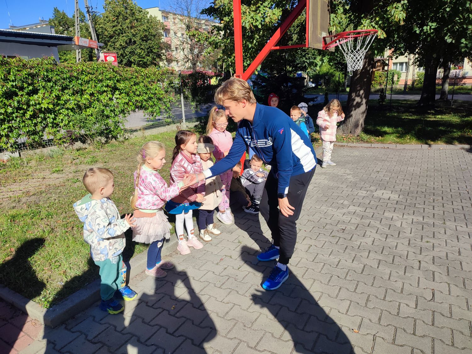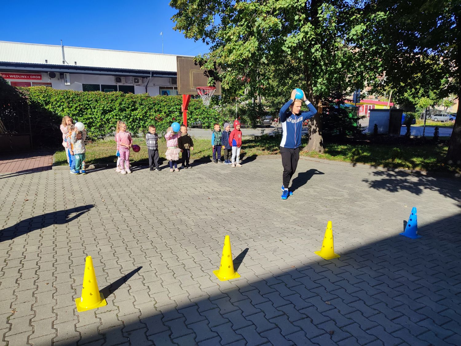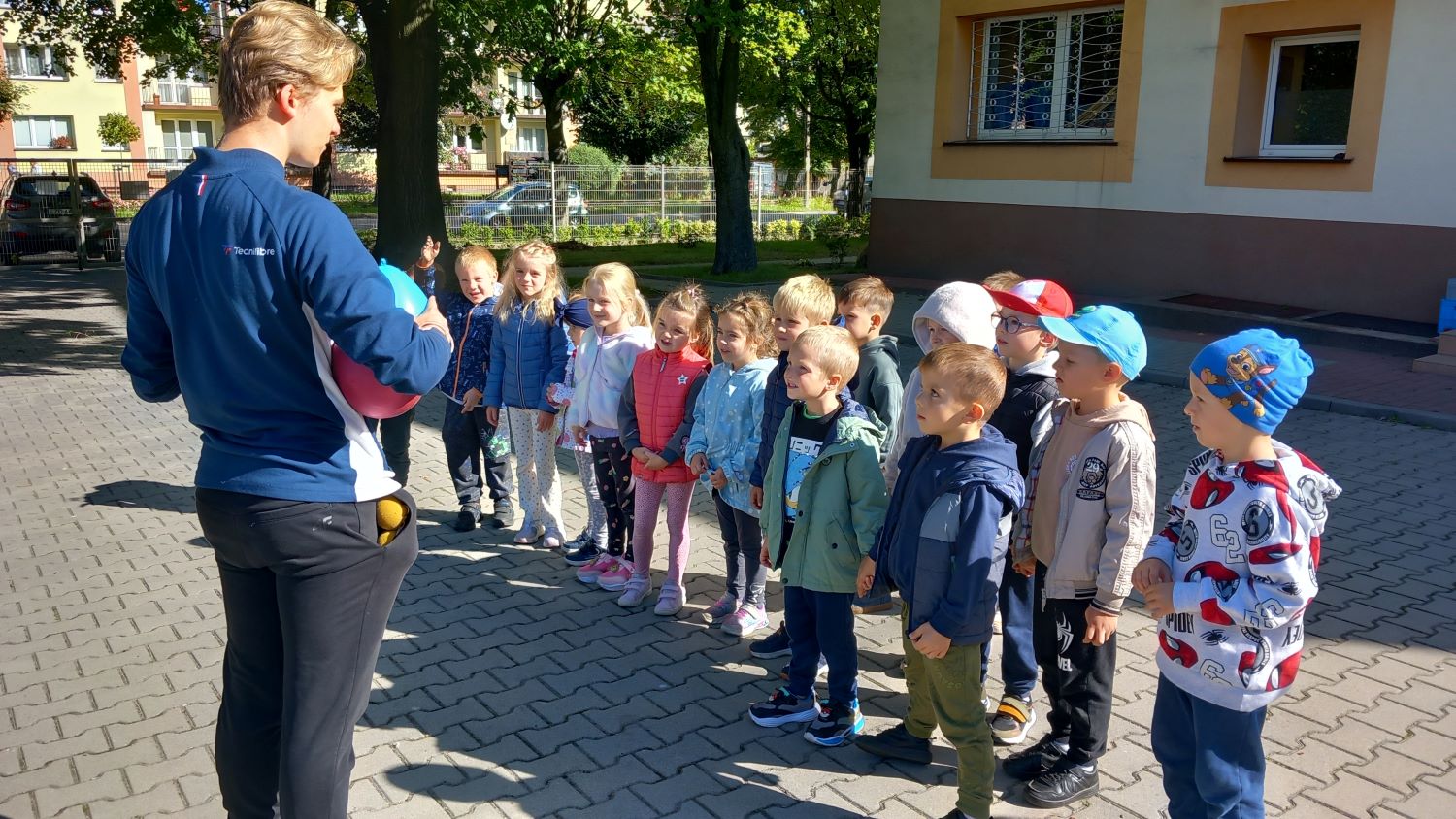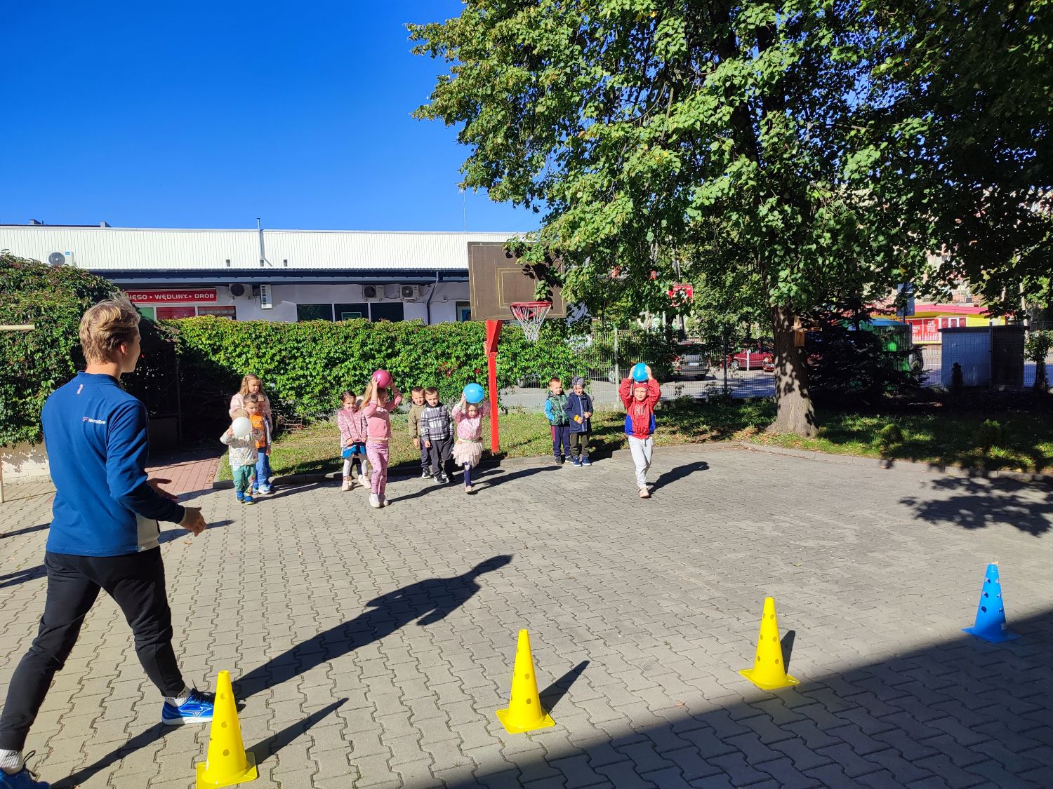 W środę 24.09.2025r. gościliśmy w przedszkolu przedstawiciela firmy Court Masters Academy pana Patryka Niełacnego. Pan Patryk - trener zachęcał wszystkie dzieci do aktywności fizycznej przeprowadzając bezpłatne zajęcia sportowe. Przedszkolaki z zaangażowaniem włączyły się do ćwiczeń i zabaw sportowych z piłką, balonami, drabinkami i innymi akcesoriami sportowymi. Zabawy z elementami współzawodnictwa motywowały dzieci do sprawnego wykonywania zadań i współpracy w grupach. Wspólne zdjęcie z trenerem oraz podziękowania od wszystkich dzieci zakończyły miłe spotkanie.
