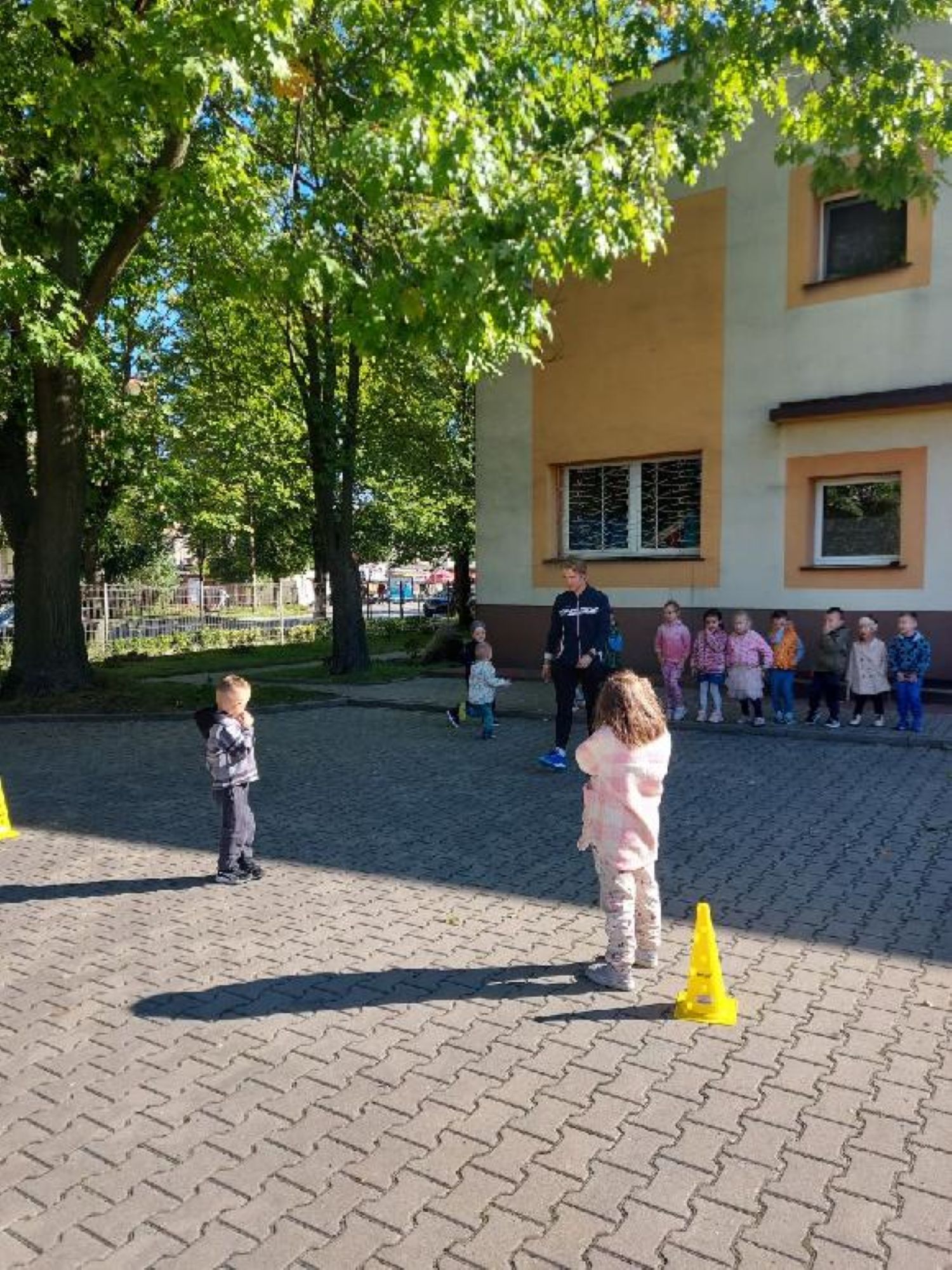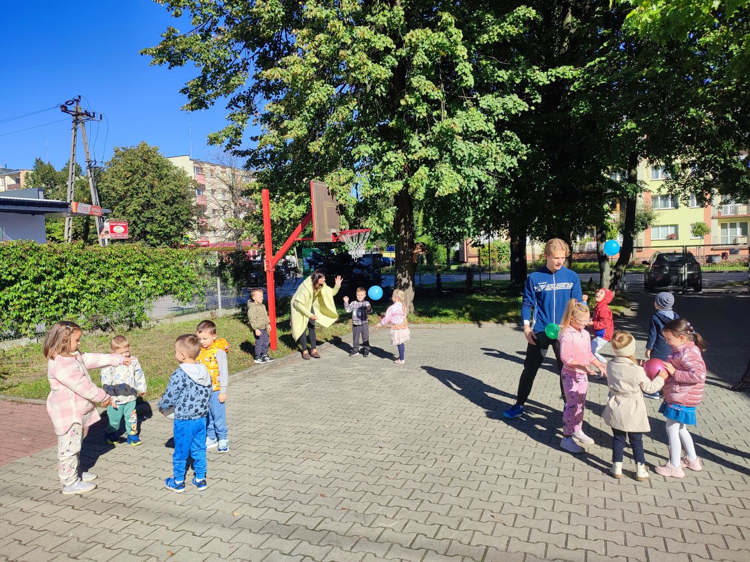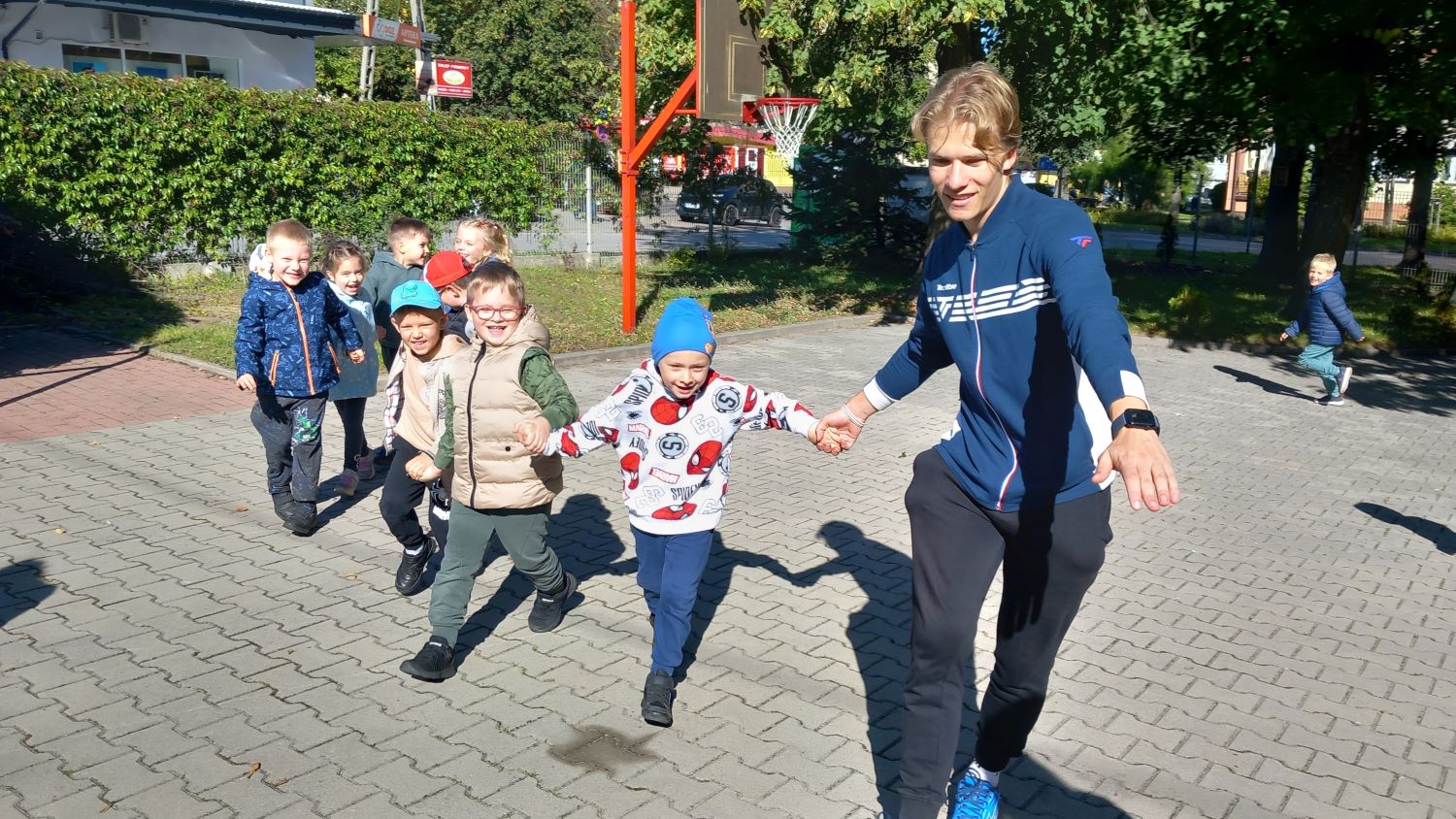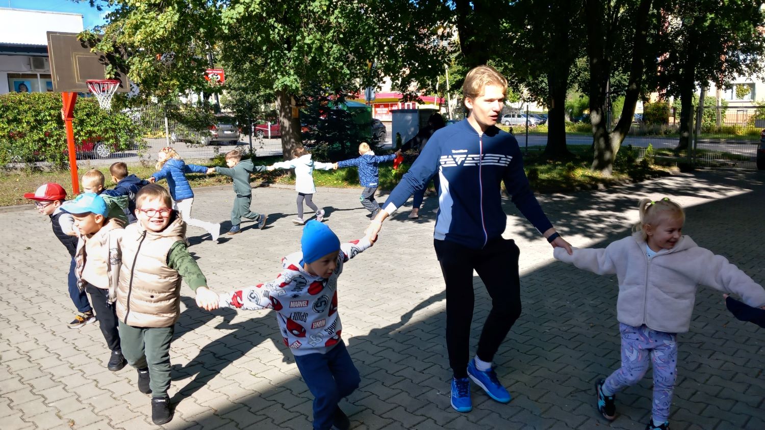 W środę 24.09.2025r. gościliśmy w przedszkolu przedstawiciela firmy Court Masters Academy pana Patryka Niełacnego. Pan Patryk - trener zachęcał wszystkie dzieci do aktywności fizycznej przeprowadzając bezpłatne zajęcia sportowe. Przedszkolaki z zaangażowaniem włączyły się do ćwiczeń i zabaw sportowych z piłką, balonami, drabinkami i innymi akcesoriami sportowymi. Zabawy z elementami współzawodnictwa motywowały dzieci do sprawnego wykonywania zadań i współpracy w grupach. Wspólne zdjęcie z trenerem oraz podziękowania od wszystkich dzieci zakończyły miłe spotkanie.