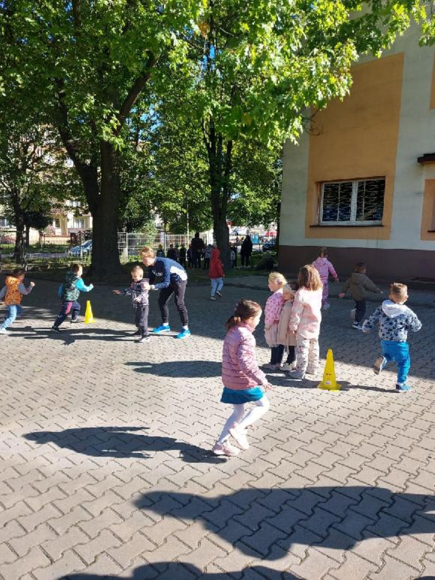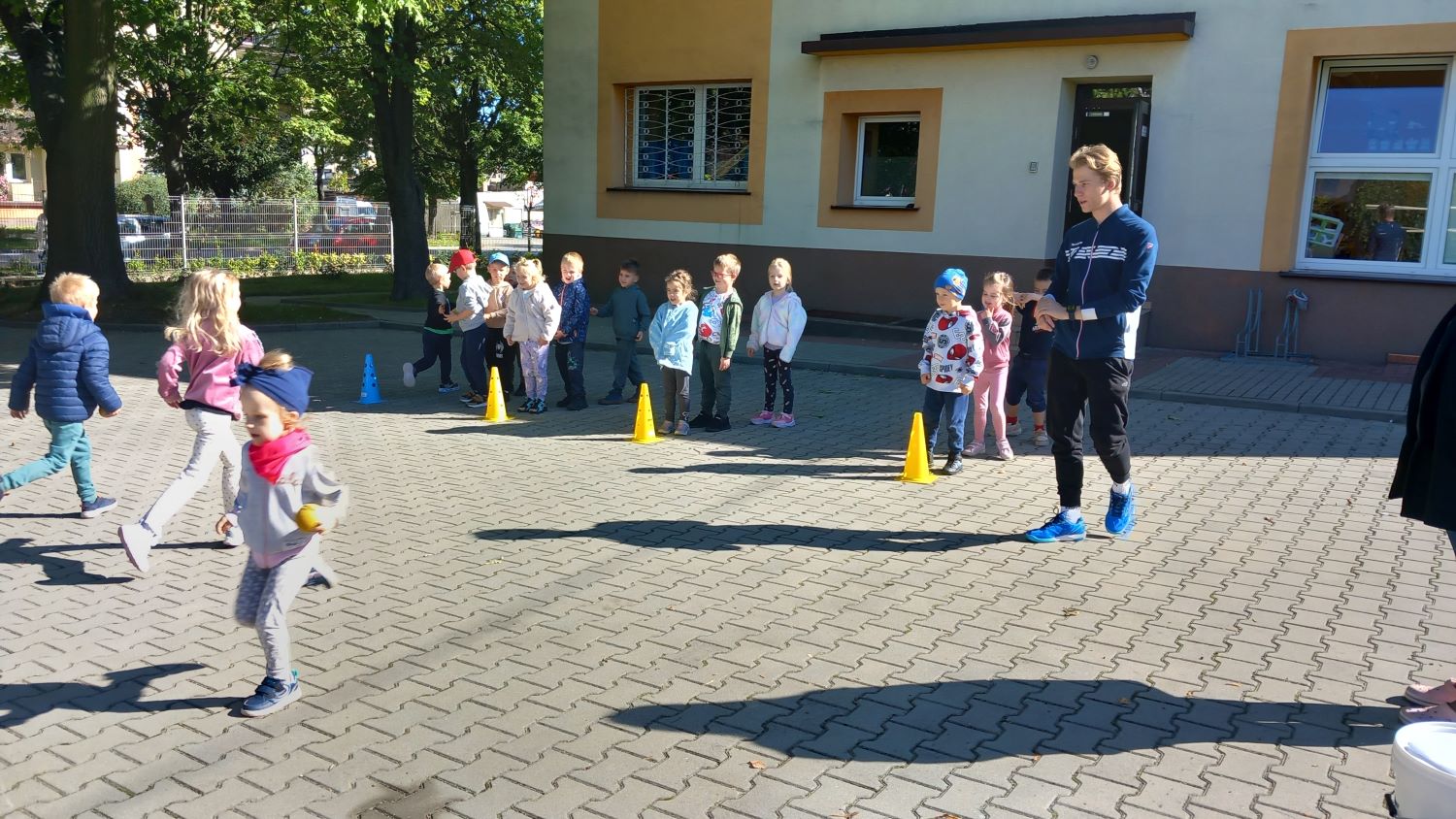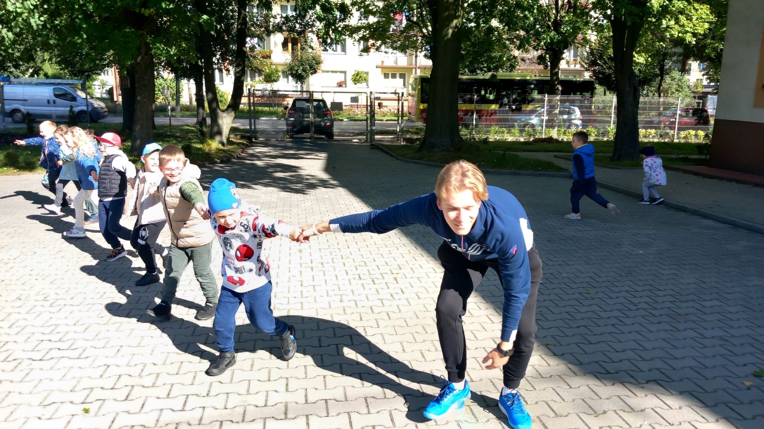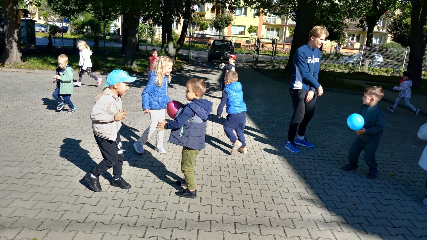 W środę 24.09.2025r. gościliśmy w przedszkolu przedstawiciela firmy Court Masters Academy pana Patryka Niełacnego. Pan Patryk - trener zachęcał wszystkie dzieci do aktywności fizycznej przeprowadzając bezpłatne zajęcia sportowe. Przedszkolaki z zaangażowaniem włączyły się do ćwiczeń i zabaw sportowych z piłką, balonami, drabinkami i innymi akcesoriami sportowymi. Zabawy z elementami współzawodnictwa motywowały dzieci do sprawnego wykonywania zadań i współpracy w grupach. Wspólne zdjęcie z trenerem oraz podziękowania od wszystkich dzieci zakończyły miłe spotkanie.