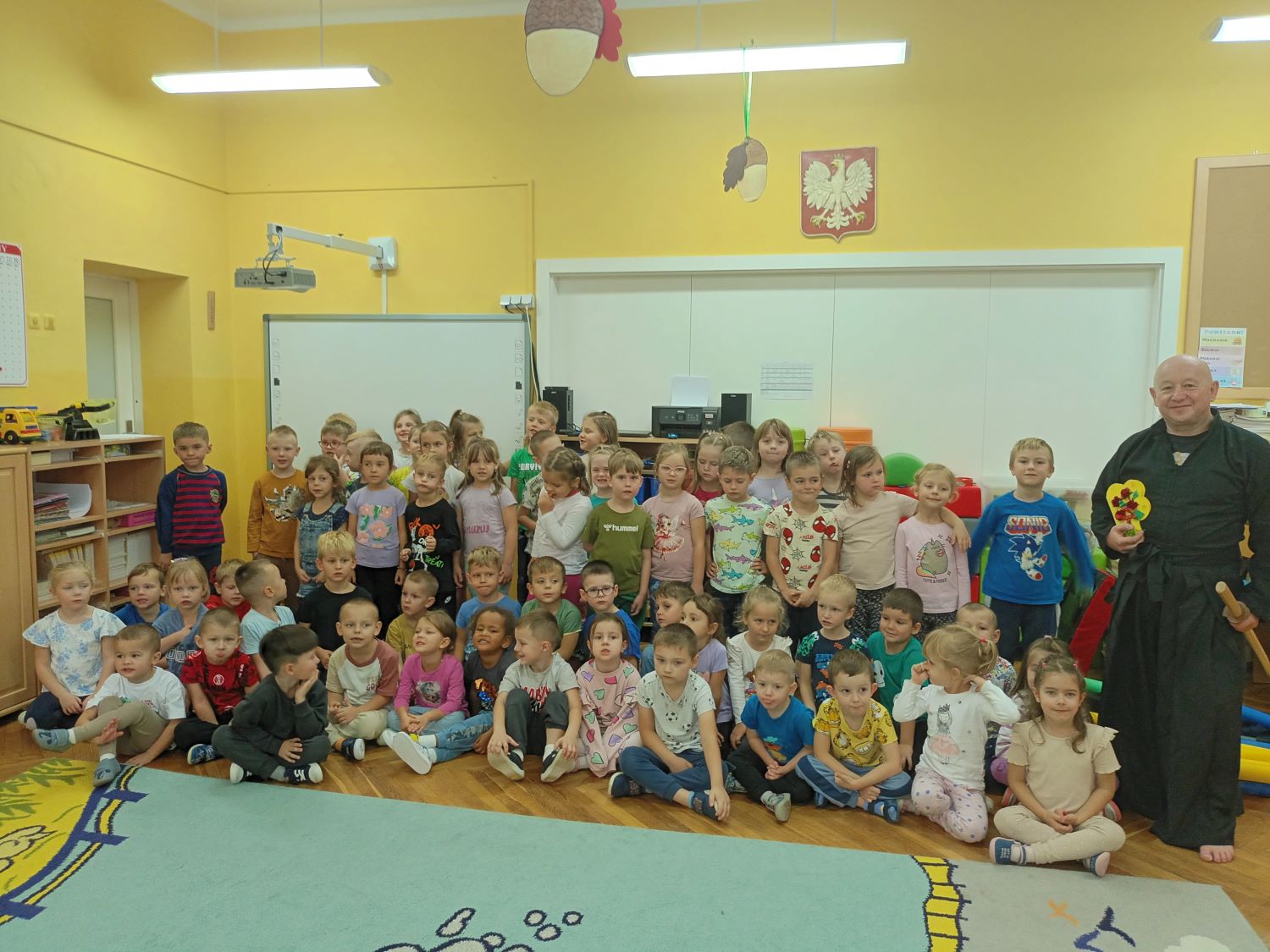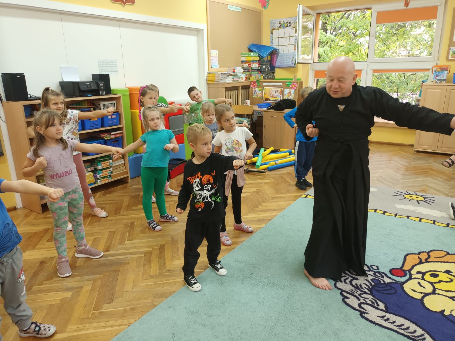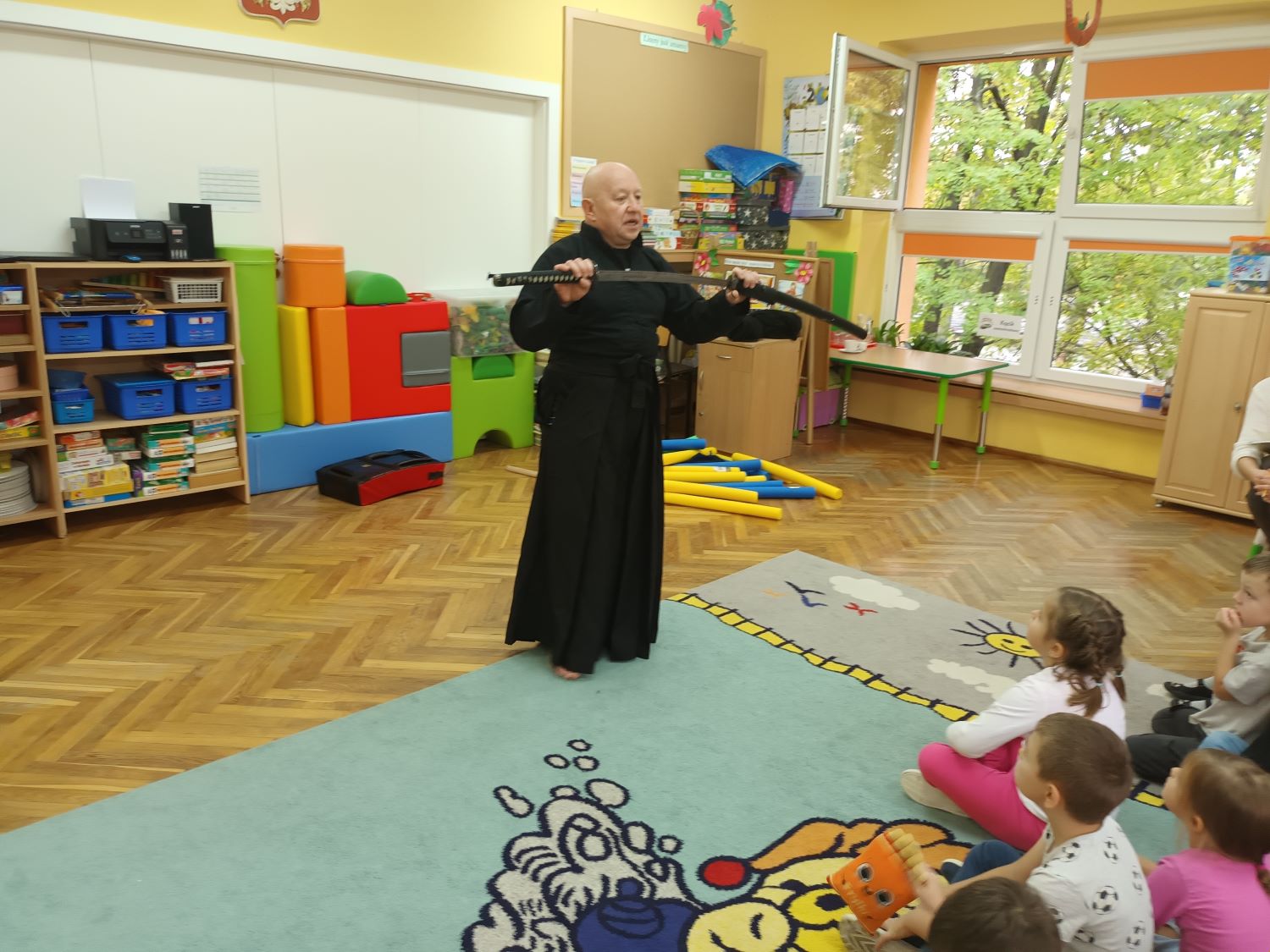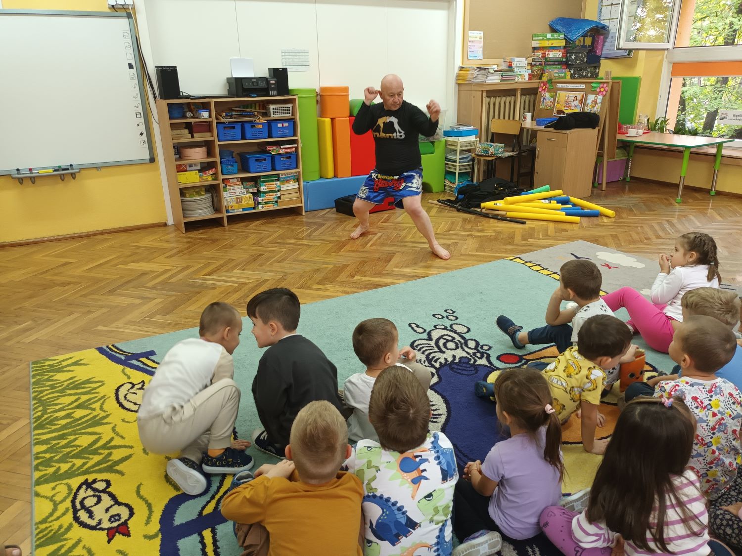 Dzisiaj, 7 października gościliśmy w naszym przedszkolu Pana Pawła Bartosika. To doświadczony instruktor i trener nauk technik wschodnich sztuk walk : karate, kyokushin, muay thai, grappling, krav maga. Elementy tych sztuk walk dzieci z zainteresowaniem obserwowały , a nawet ,,uprawiały” to rzemiosło wojenne pod okiem Pana Pawła. Przedszkolaki dowiedziały się również, że posiadanie takich umiejętności to jeden z najlepszych sposobów na obranę własną czy obronę słabszych. Poznały nazewnictwo i broń, którą posługują się Samurajowie. Pan Paweł zachęcał dzieci do skorzystania z oferty nauki technik wschodnich sztuk walki w Klubach na terenie naszego miasta, w których odbywają się treningi dla osób lubiących sport, prowadzonych przez doświadczonych instruktorów.