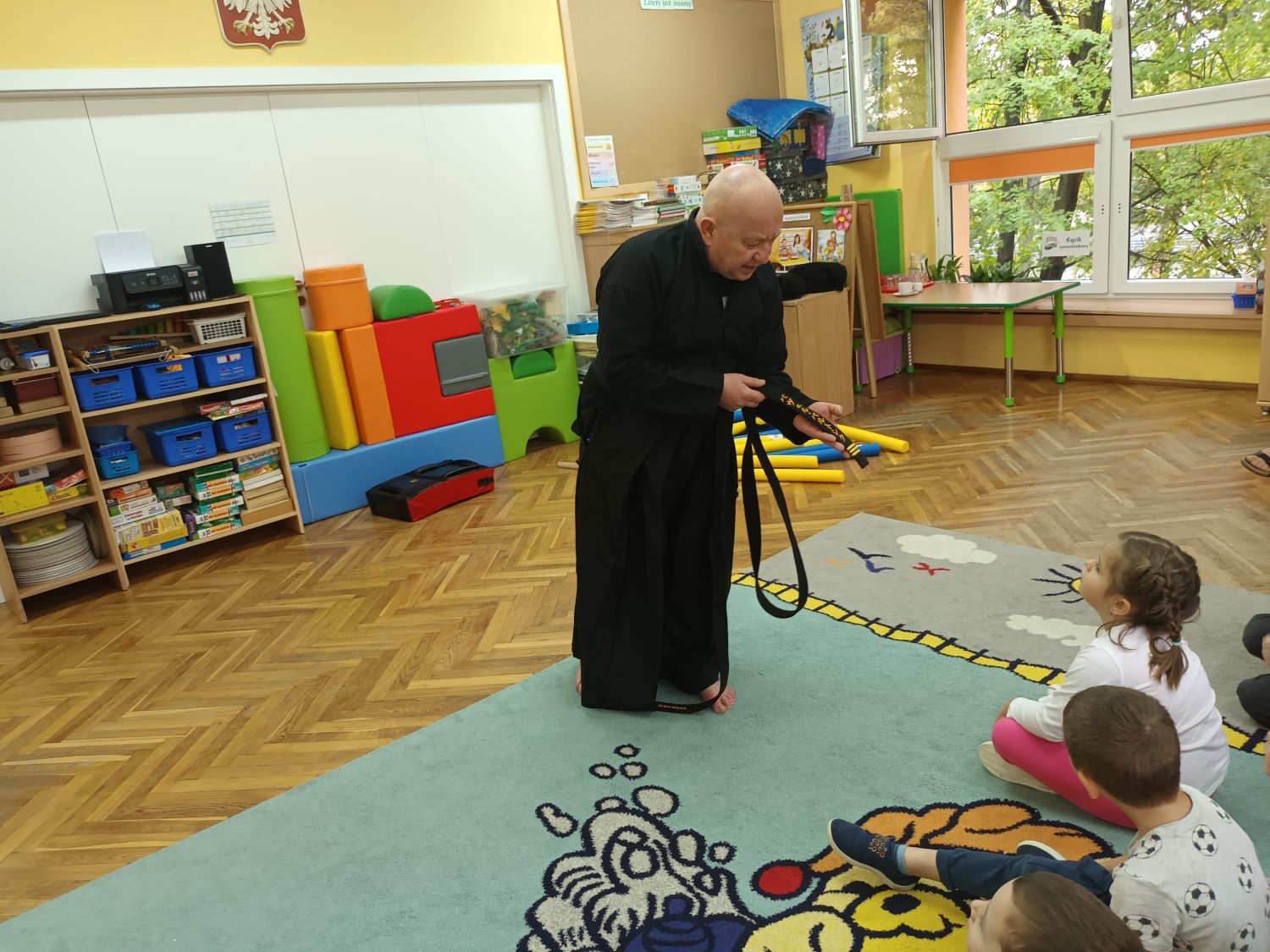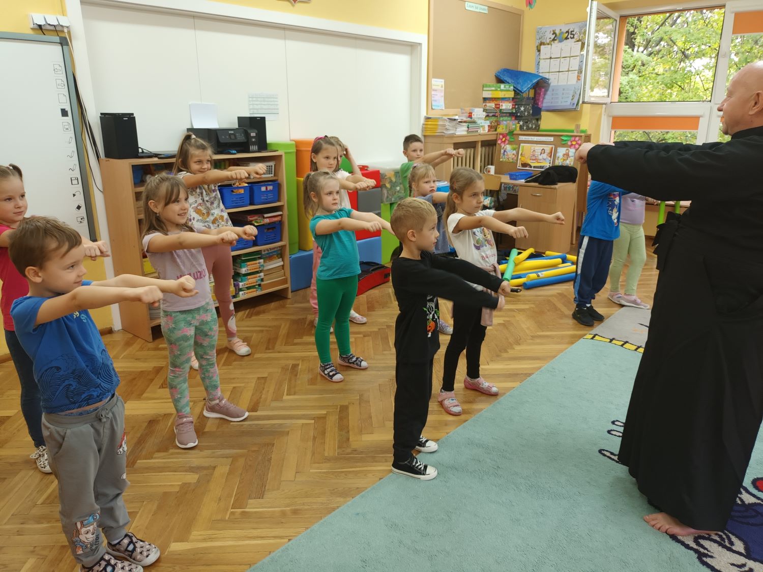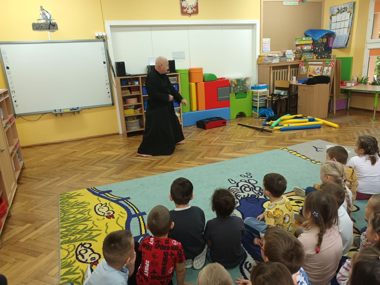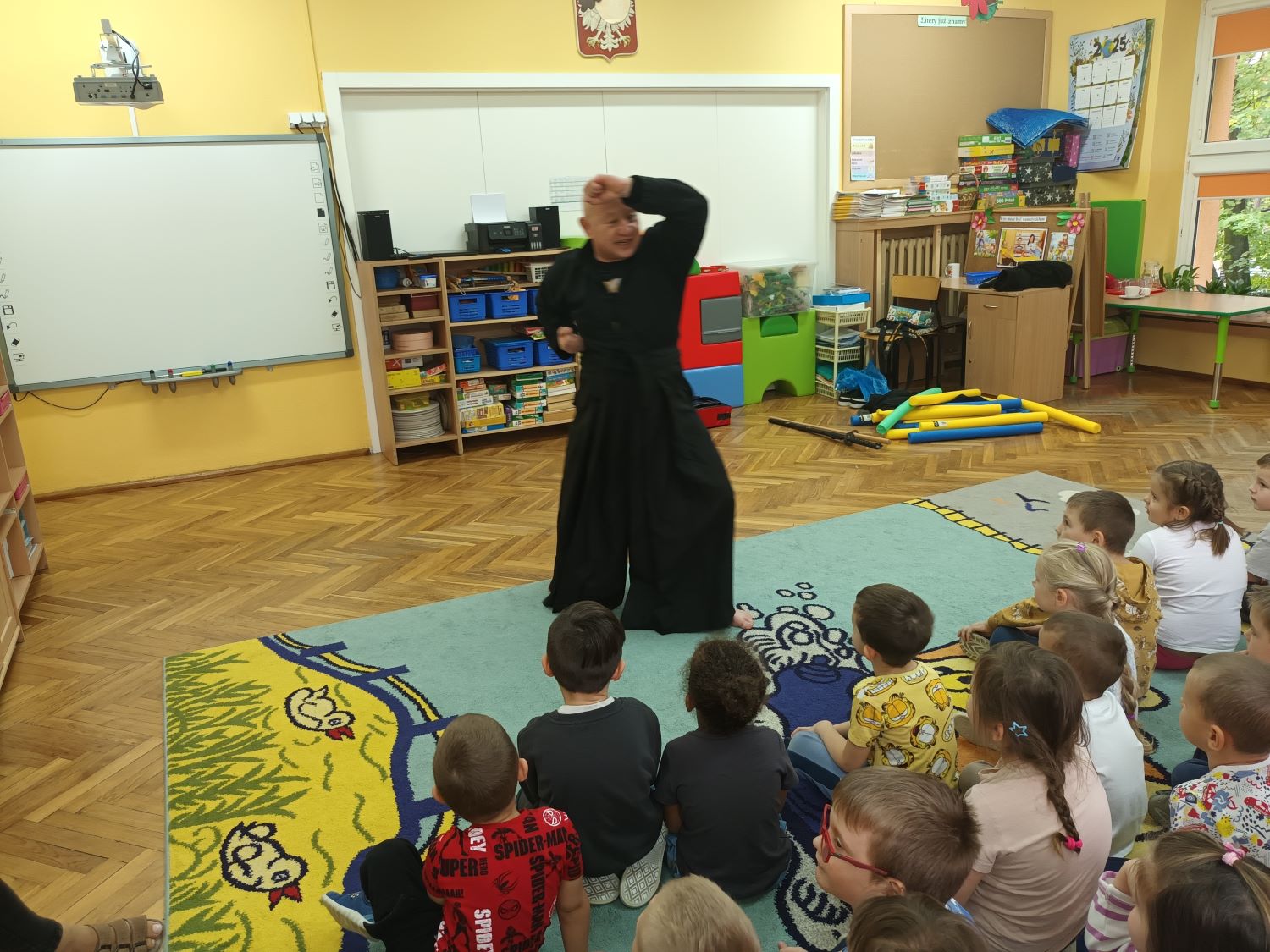 Dzisiaj, 7 października gościliśmy w naszym przedszkolu Pana Pawła Bartosika. To doświadczony instruktor i trener nauk technik wschodnich sztuk walk : karate, kyokushin, muay thai, grappling, krav maga. Elementy tych sztuk walk dzieci z zainteresowaniem obserwowały , a nawet ,,uprawiały” to rzemiosło wojenne pod okiem Pana Pawła. Przedszkolaki dowiedziały się również, że posiadanie takich umiejętności to jeden z najlepszych sposobów na obranę własną czy obronę słabszych. Poznały nazewnictwo i broń, którą posługują się Samurajowie. Pan Paweł zachęcał dzieci do skorzystania z oferty nauki technik wschodnich sztuk walki w Klubach na terenie naszego miasta, w których odbywają się treningi dla osób lubiących sport, prowadzonych przez doświadczonych instruktorów.