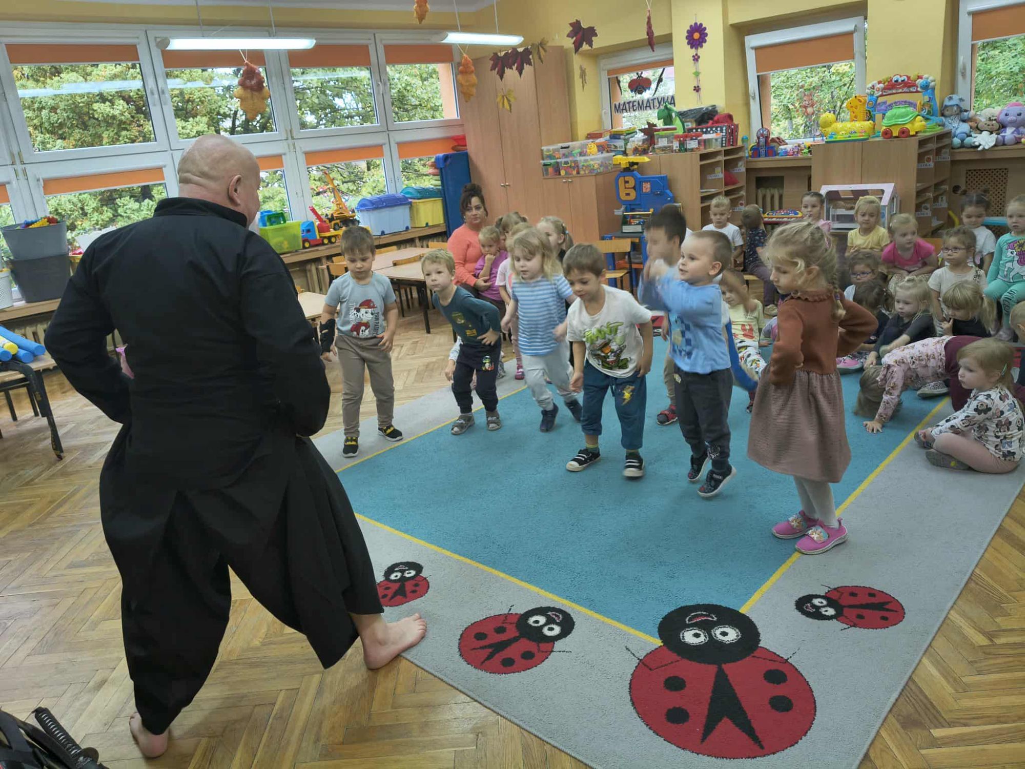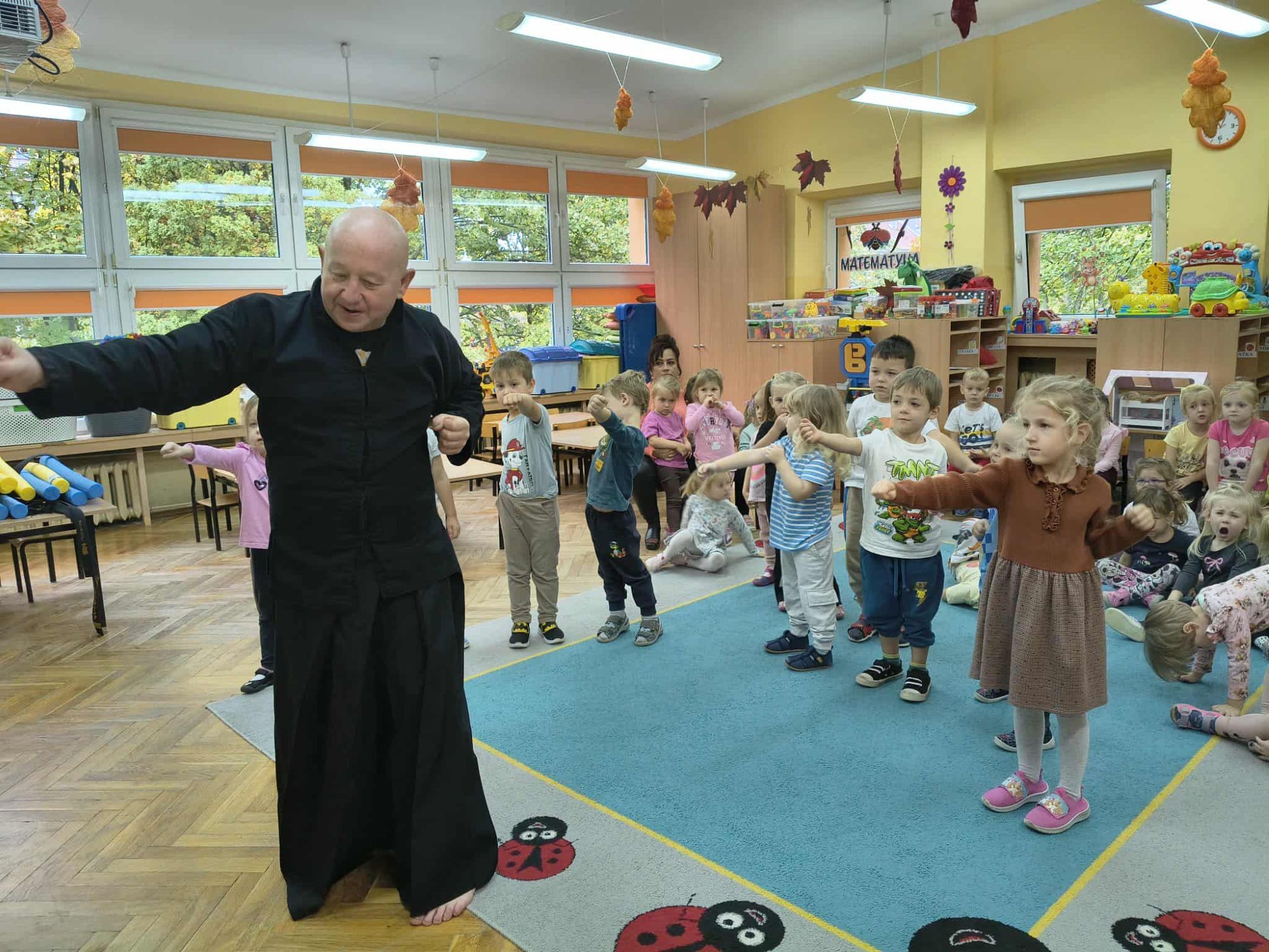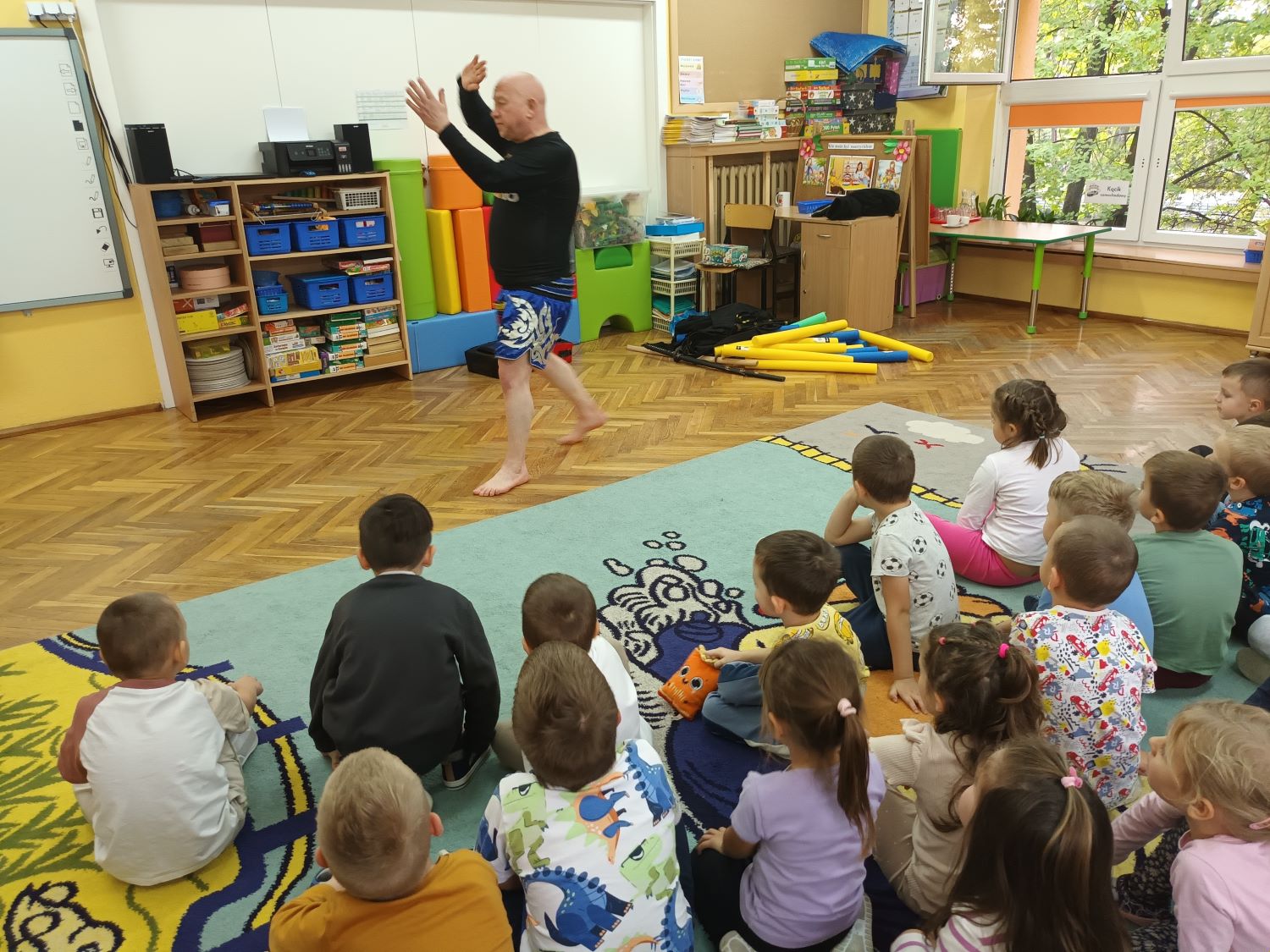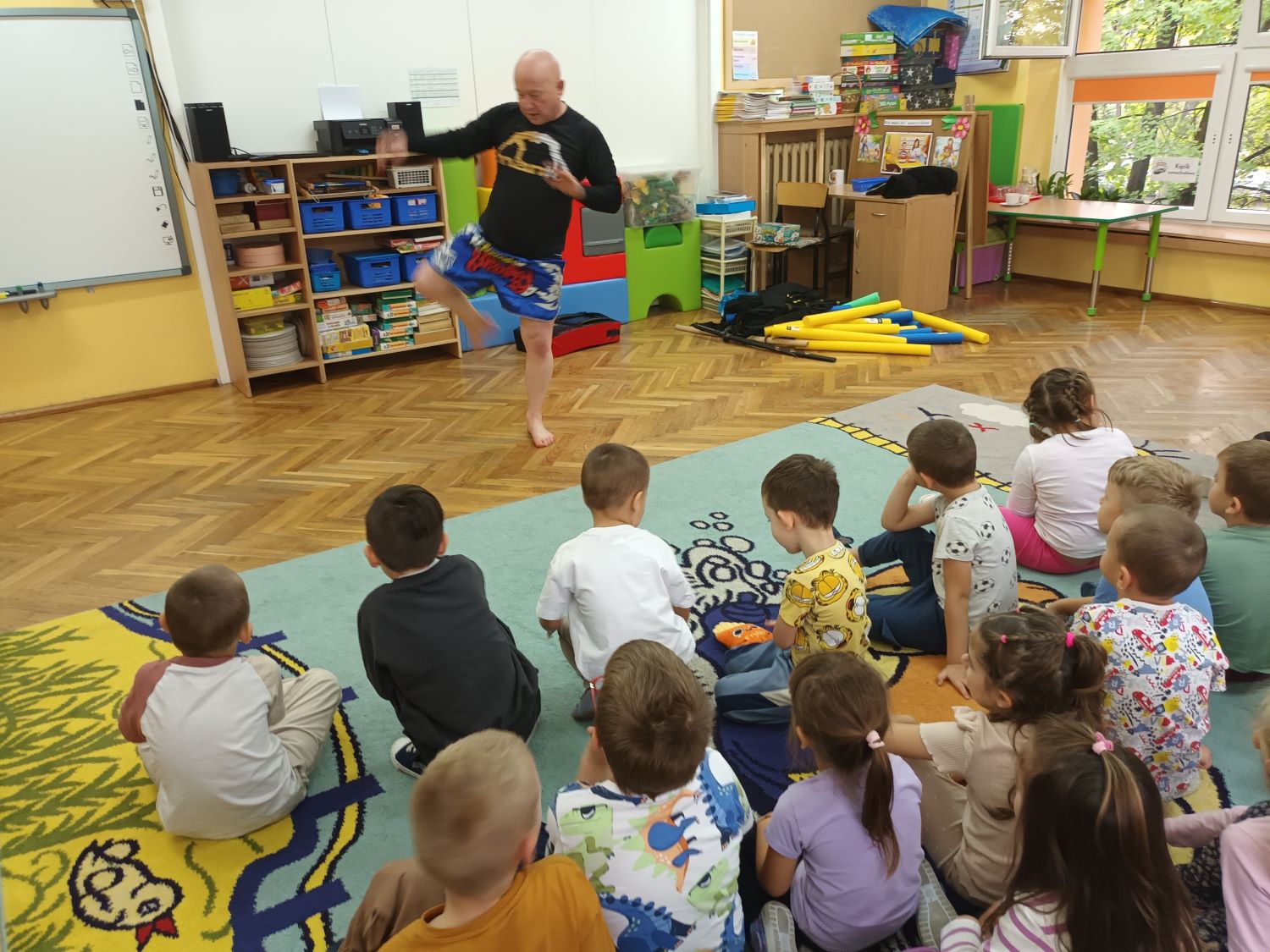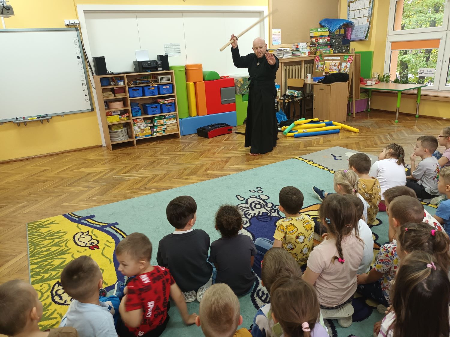 Dzisiaj, 7 października gościliśmy w naszym przedszkolu Pana Pawła Bartosika. To doświadczony instruktor i trener nauk technik wschodnich sztuk walk : karate, kyokushin, muay thai, grappling, krav maga. Elementy tych sztuk walk dzieci z zainteresowaniem obserwowały , a nawet ,,uprawiały” to rzemiosło wojenne pod okiem Pana Pawła. Przedszkolaki dowiedziały się również, że posiadanie takich umiejętności to jeden z najlepszych sposobów na obranę własną czy obronę słabszych. Poznały nazewnictwo i broń, którą posługują się Samurajowie. Pan Paweł zachęcał dzieci do skorzystania z oferty nauki technik wschodnich sztuk walki w Klubach na terenie naszego miasta, w których odbywają się treningi dla osób lubiących sport, prowadzonych przez doświadczonych instruktorów.