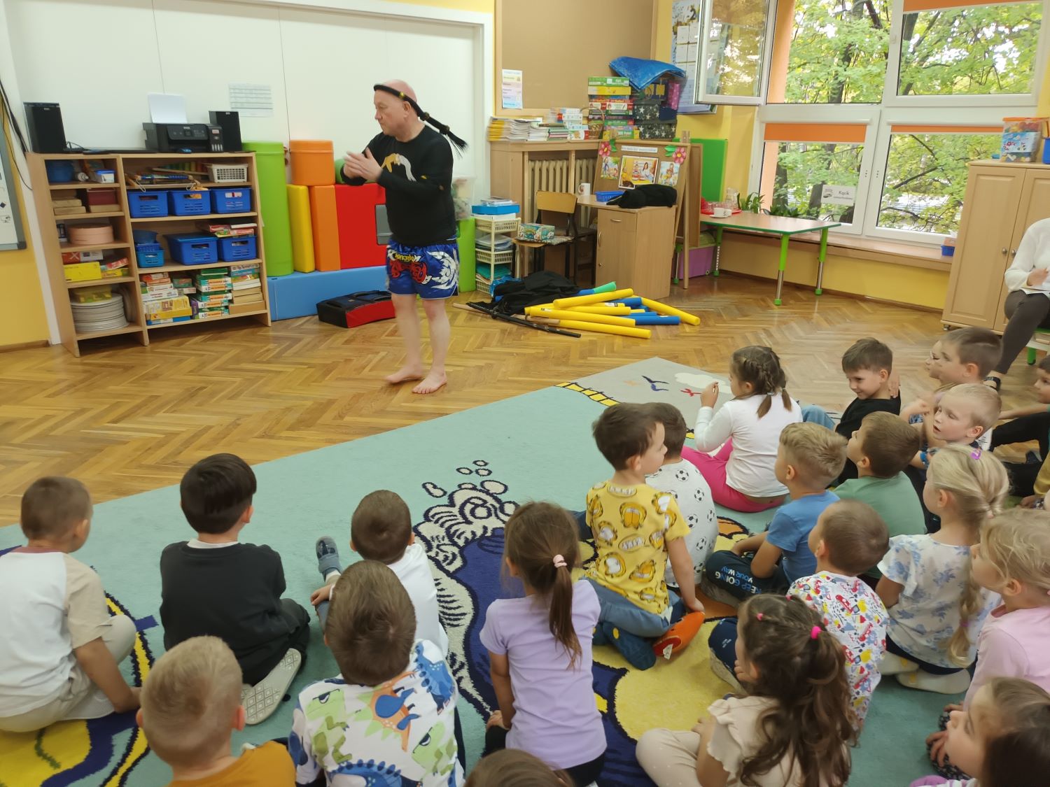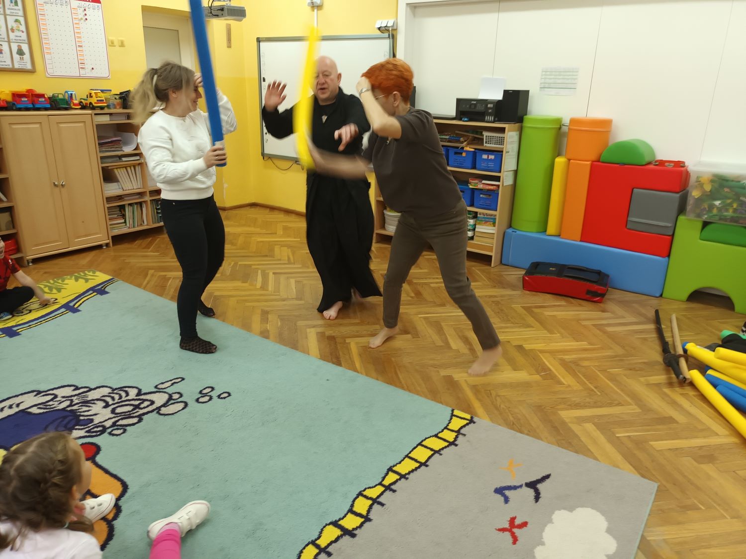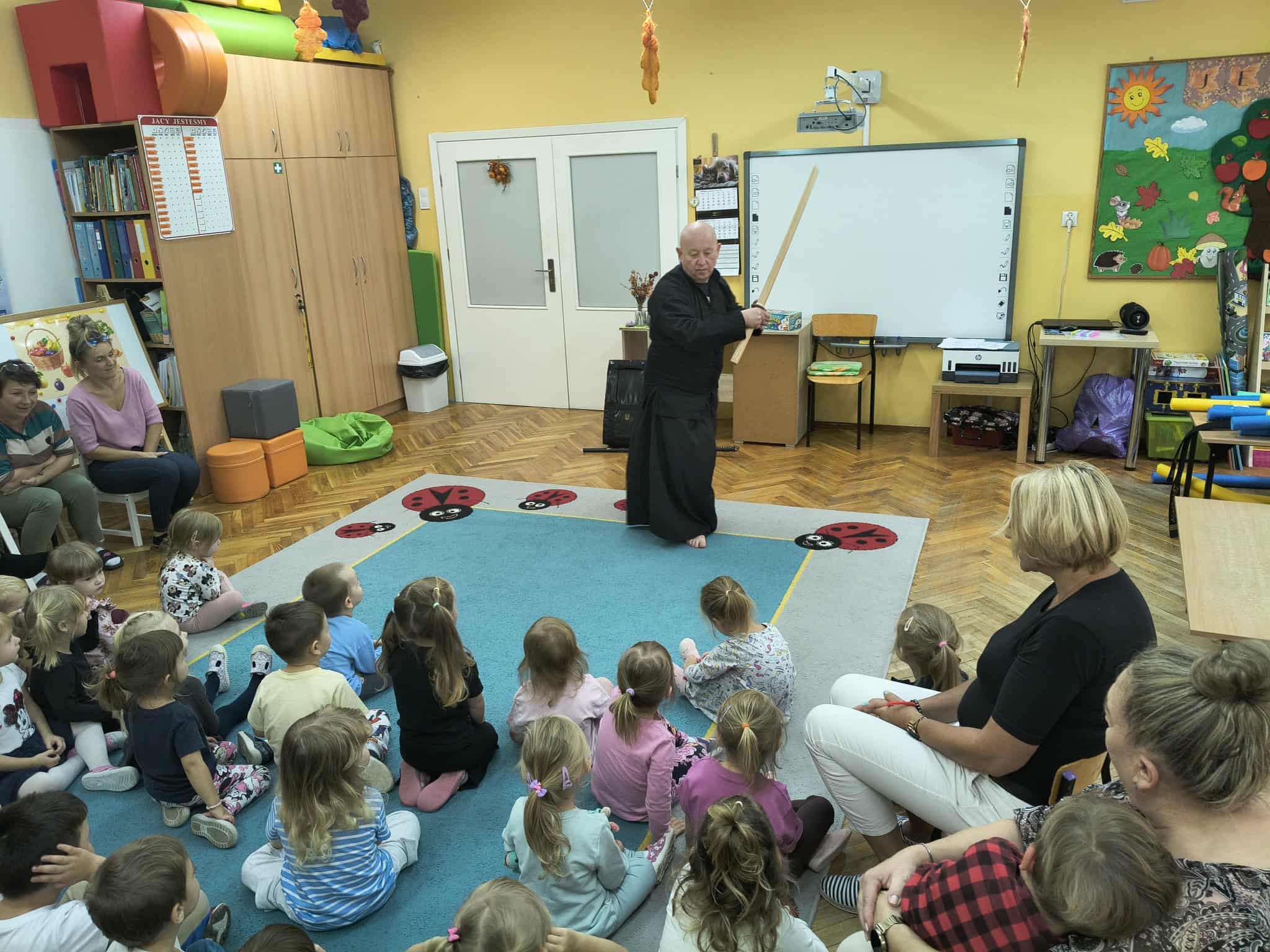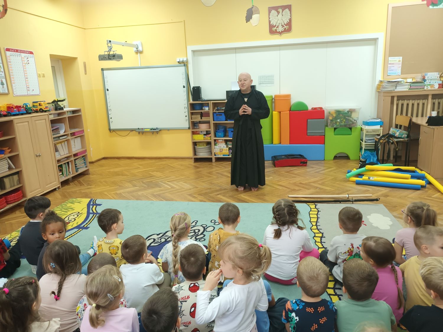 Dzisiaj, 7 października gościliśmy w naszym przedszkolu Pana Pawła Bartosika. To doświadczony instruktor i trener nauk technik wschodnich sztuk walk : karate, kyokushin, muay thai, grappling, krav maga. Elementy tych sztuk walk dzieci z zainteresowaniem obserwowały , a nawet ,,uprawiały” to rzemiosło wojenne pod okiem Pana Pawła. Przedszkolaki dowiedziały się również, że posiadanie takich umiejętności to jeden z najlepszych sposobów na obranę własną czy obronę słabszych. Poznały nazewnictwo i broń, którą posługują się Samurajowie. Pan Paweł zachęcał dzieci do skorzystania z oferty nauki technik wschodnich sztuk walki w Klubach na terenie naszego miasta, w których odbywają się treningi dla osób lubiących sport, prowadzonych przez doświadczonych instruktorów.