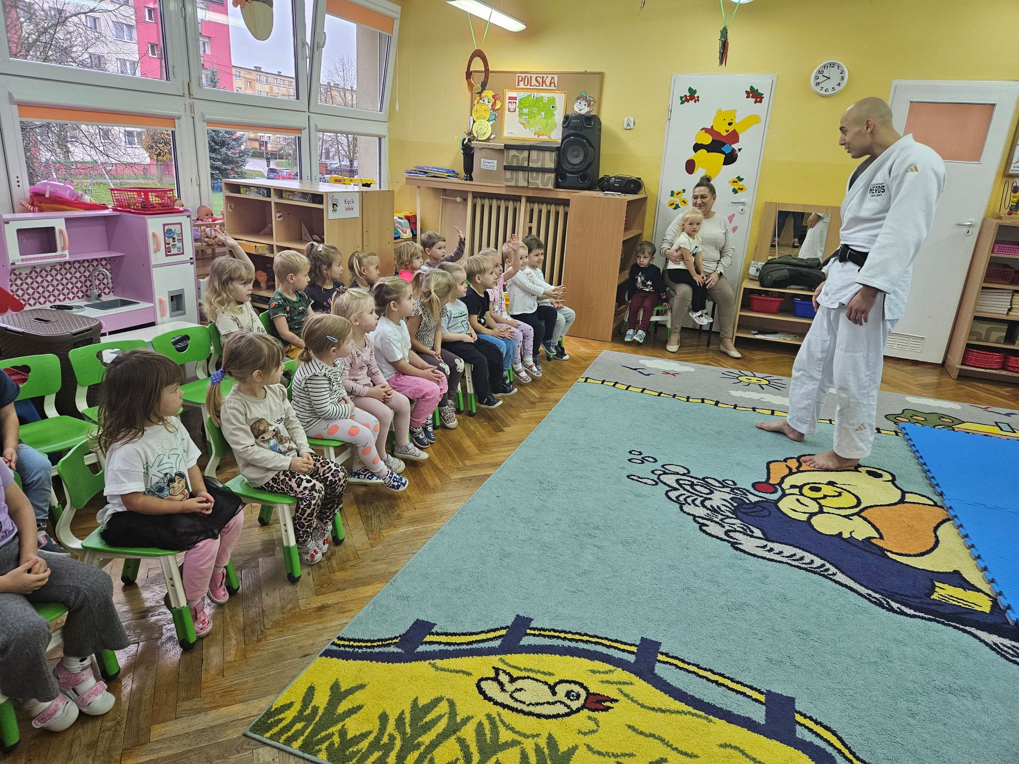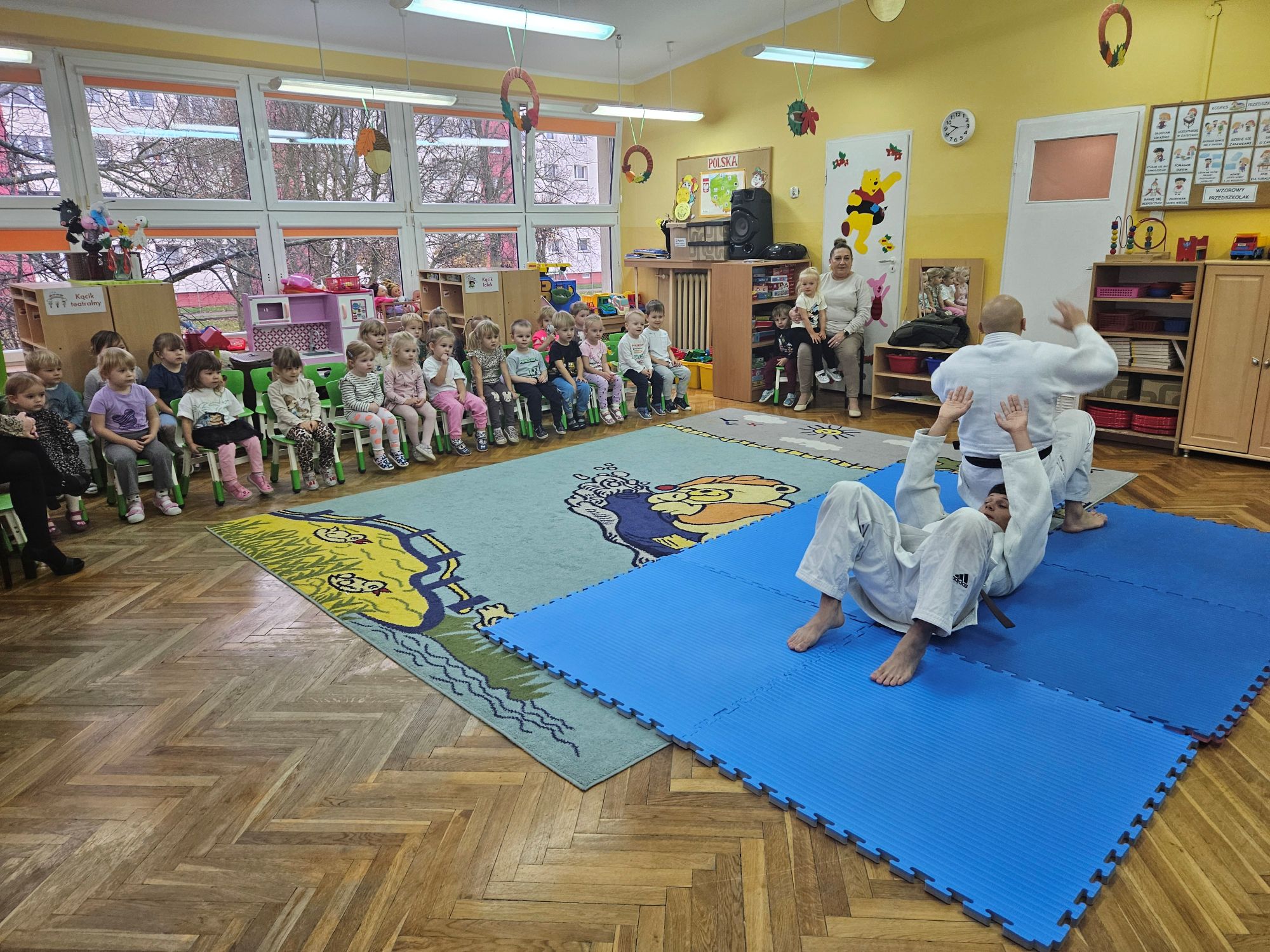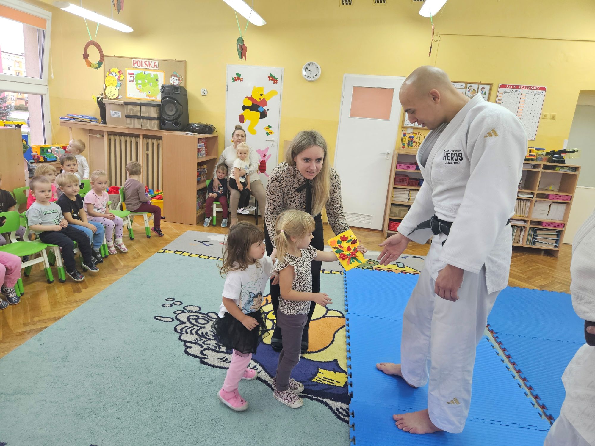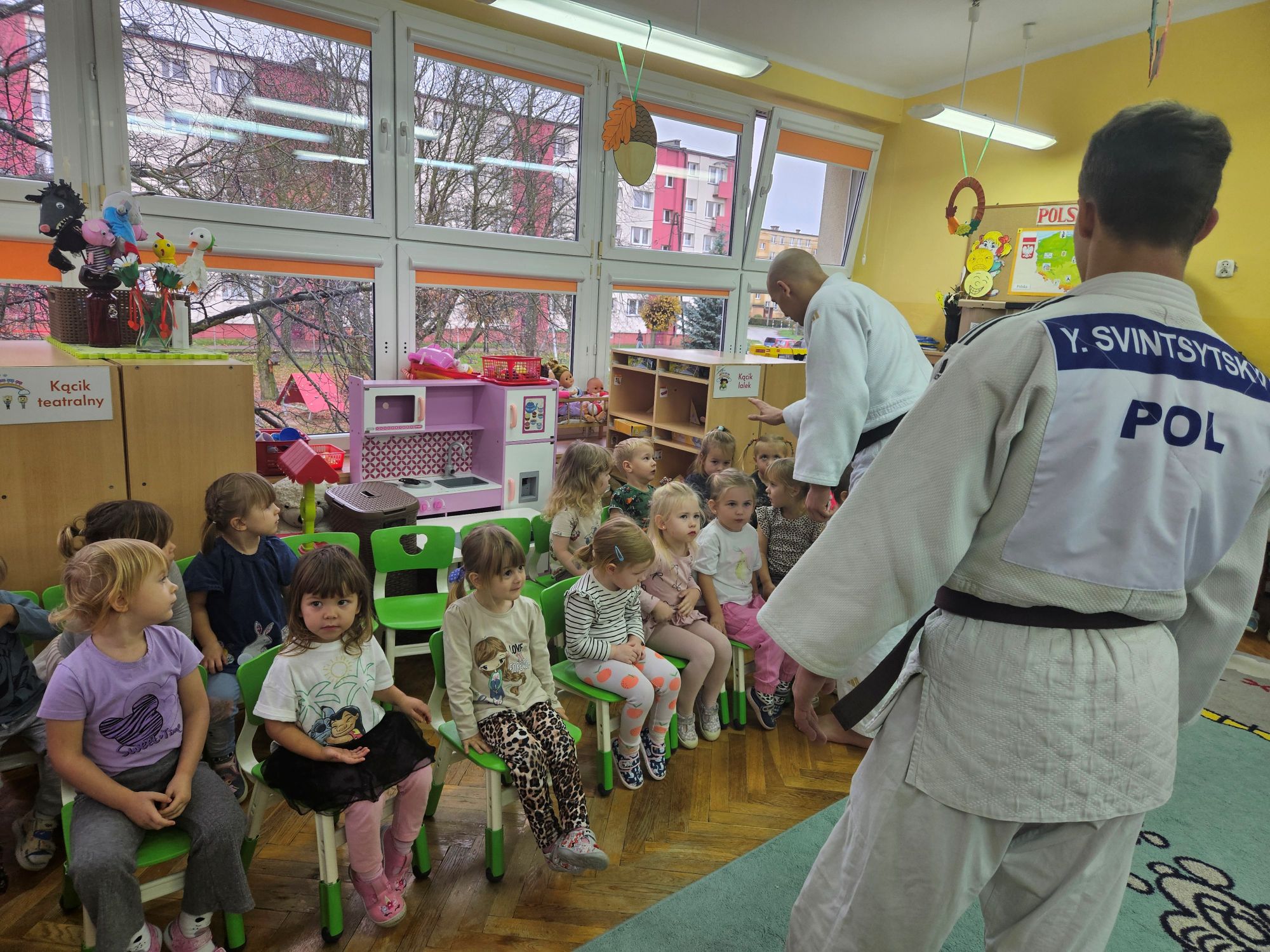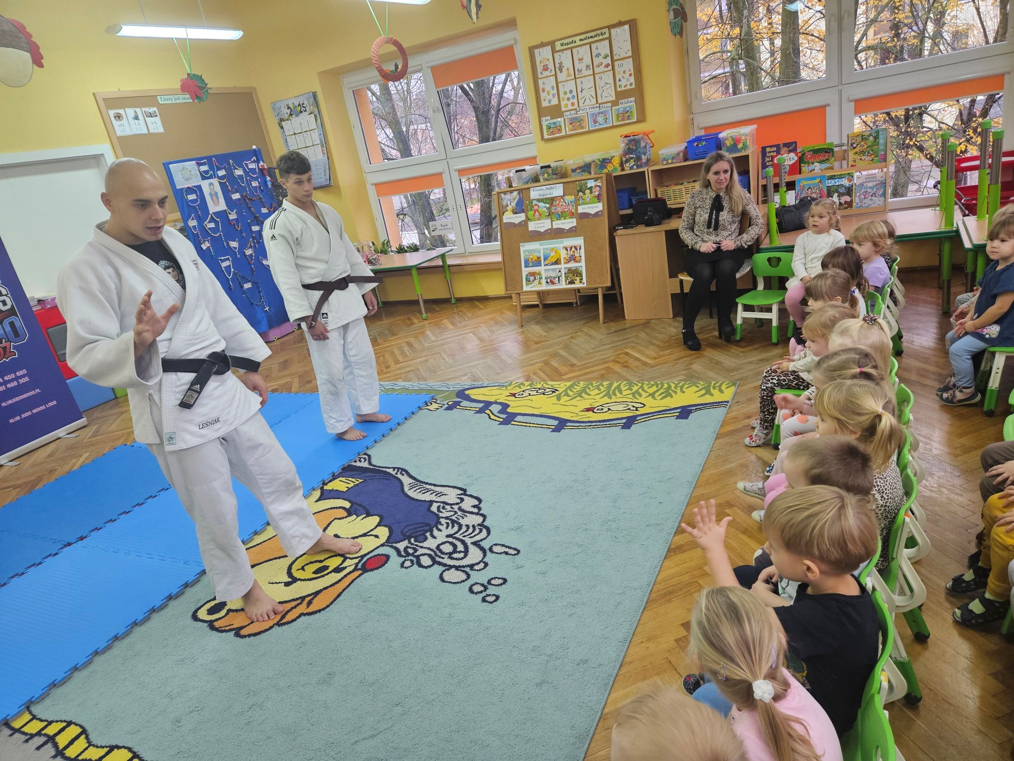 03.11.2025r –W ramach akcji „Spotkania ze sportowcem” nasze przedszkole odwiedzili dziś judocy z Klubu Sportowego HEROS JUDO ŁODŹ: pan Patryk Leśniak i pan Yehor Svintsytskyi. Pokazali dzieciom strój (judogi), który jest uszyty jak kimono, ale jest dużo grubsze i wytrzymalsze. Zwrócili uwagę dzieci na bezpieczne upadanie na matę podczas rzutów partnera. Pokaz był bardzo dynamiczny i zaskoczył nawet odważne dzieci. Nie wszystkie chciały brać w nim udział, odważniejsze okazały się dziewczynki. Judocy zwrócili uwagę, by ćwiczenia judo robić tylko na sali ćwiczeń, nie na kolegach. Panowie zaprosili dzieci na zajęcia klubu sportowego i rozdali wizytówki dla przedszkolaków, które pragną uczestniczyć w ćwiczeniach judo.