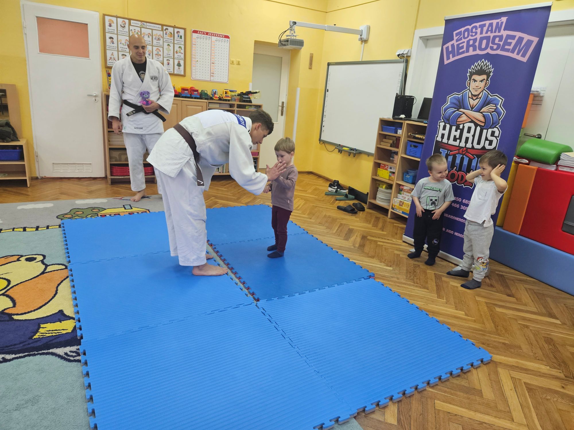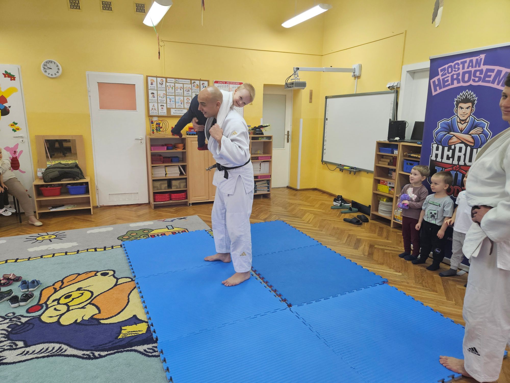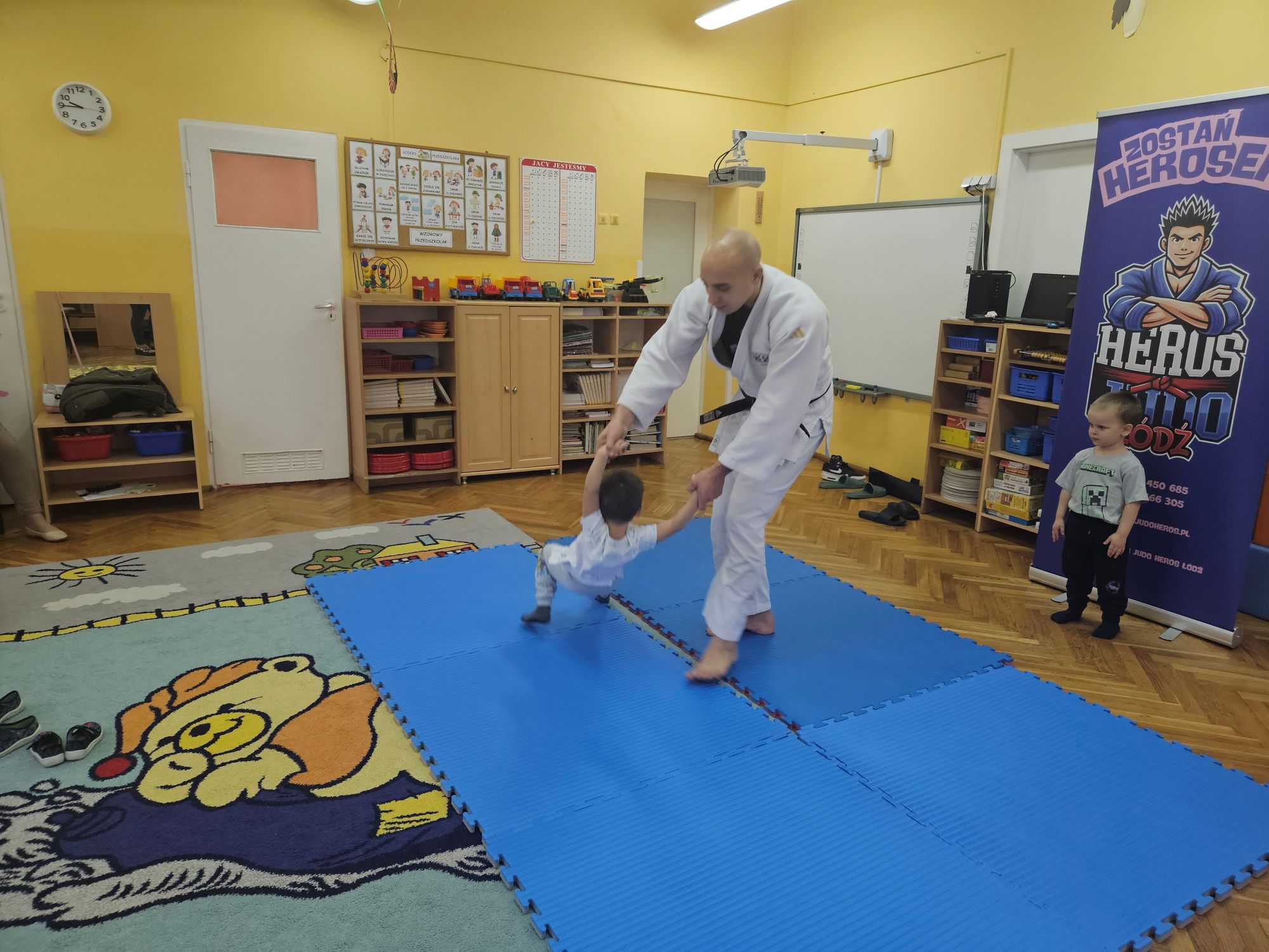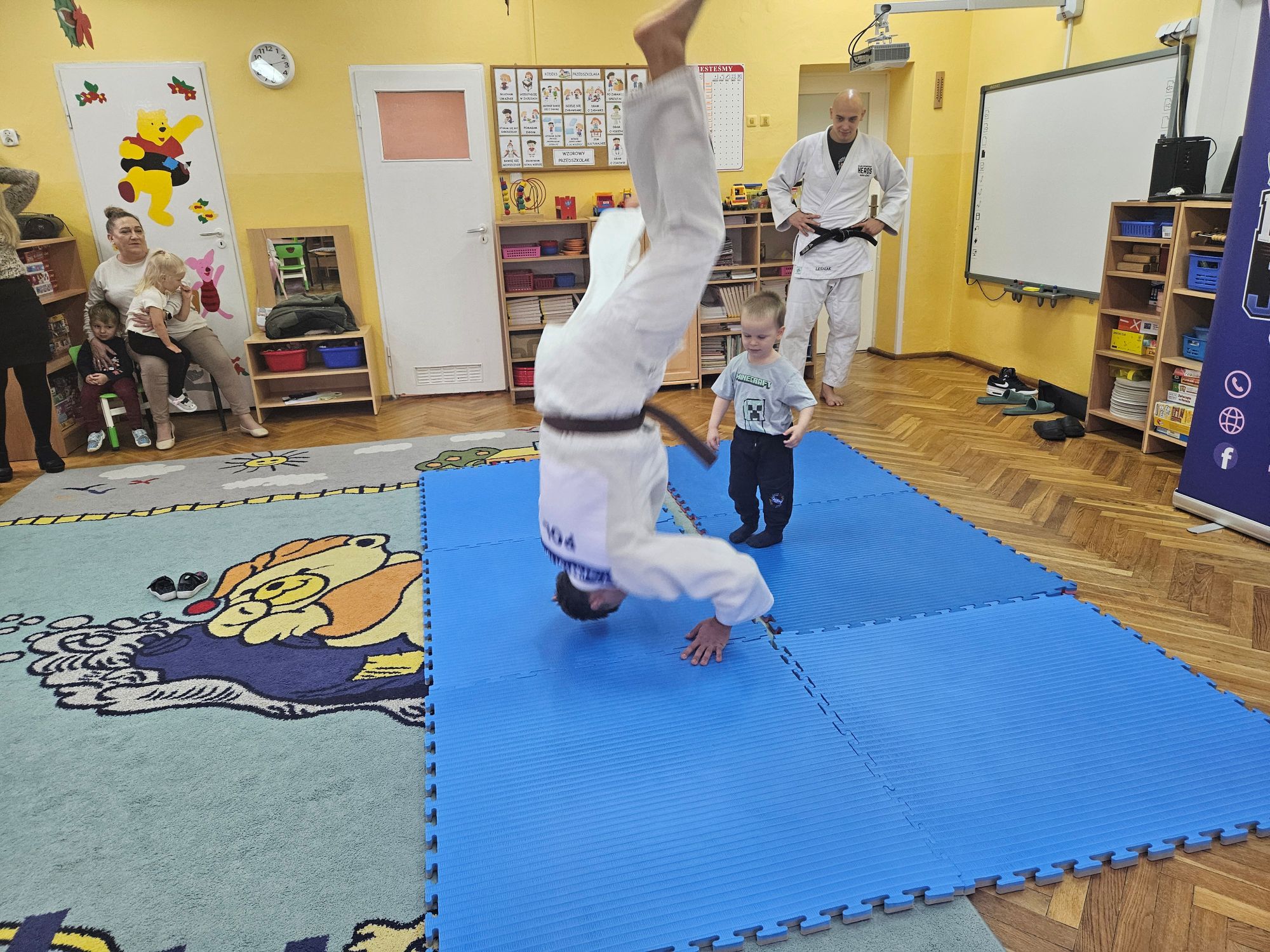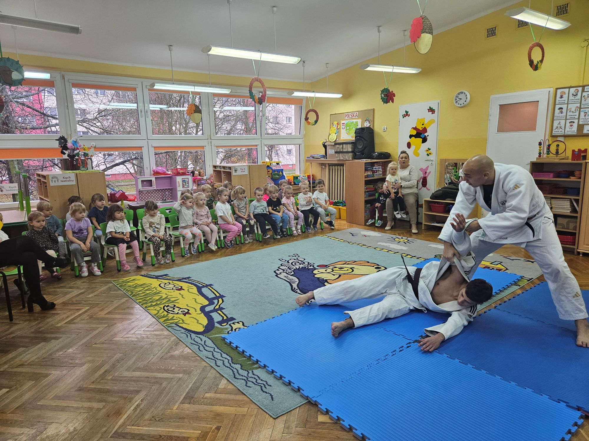 03.11.2025r –W ramach akcji „Spotkania ze sportowcem” nasze przedszkole odwiedzili dziś judocy z Klubu Sportowego HEROS JUDO ŁODŹ: pan Patryk Leśniak i pan Yehor Svintsytskyi. Pokazali dzieciom strój (judogi), który jest uszyty jak kimono, ale jest dużo grubsze i wytrzymalsze. Zwrócili uwagę dzieci na bezpieczne upadanie na matę podczas rzutów partnera. Pokaz był bardzo dynamiczny i zaskoczył nawet odważne dzieci. Nie wszystkie chciały brać w nim udział, odważniejsze okazały się dziewczynki. Judocy zwrócili uwagę, by ćwiczenia judo robić tylko na sali ćwiczeń, nie na kolegach. Panowie zaprosili dzieci na zajęcia klubu sportowego i rozdali wizytówki dla przedszkolaków, które pragną uczestniczyć w ćwiczeniach judo.