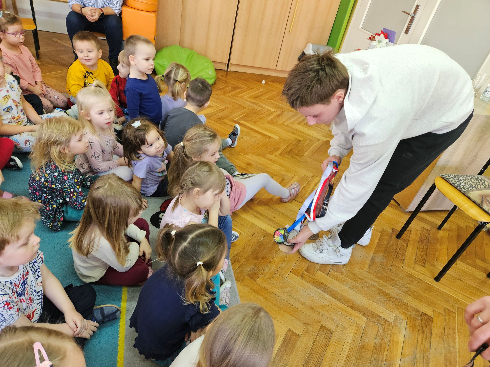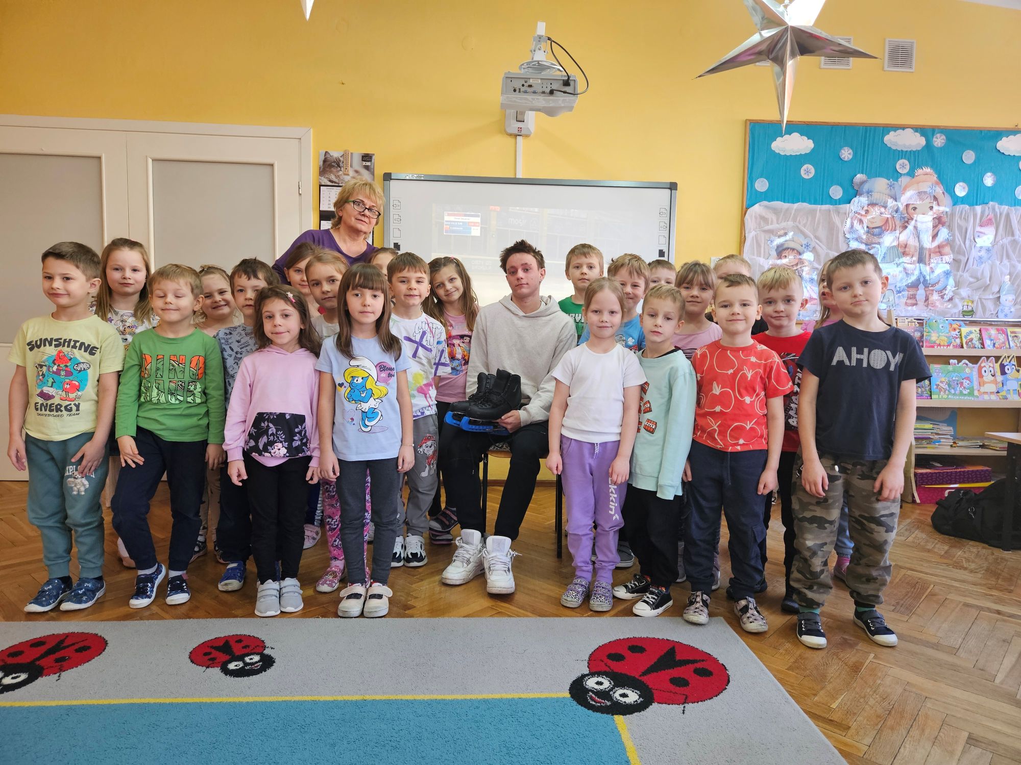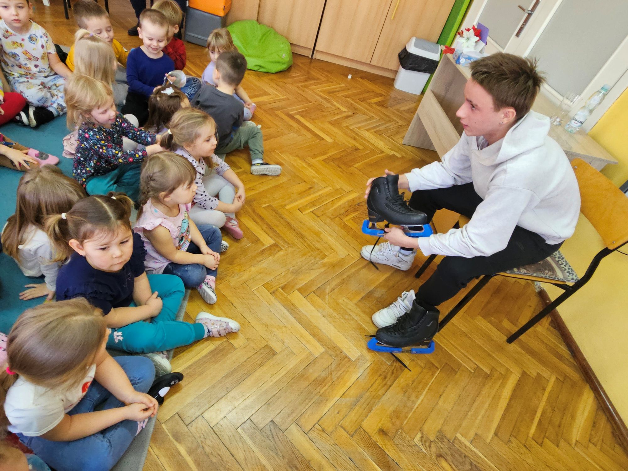 W ramach akcji „Spotkania ze sportowcem” nasze przedszkole 19 stycznia br. odwiedził 15-letni młody łyżwiarz – Bartosz Sobierajski. Po powitaniu przez dzieci, zaproszony gość przybliżył nam na czym polega uprawiana przez niego dyscyplina sportu, czyli łyżwiarstwo figurowe. Dowiedzieliśmy się, iż już w przedszkolu rozpoczęła się jego przygoda z łyżwiarstwem. Zaprezentował swój strój na występy oraz najważniejszy element do jazdy na lodzie, czyli łyżwy. Przedszkolaki podziwiały również medale, dyplomy i puchary, które przywiózł ze sobą nasz gość. Dzięki systematycznym i intensywnym treningom na hali „Bombonierka” w Łodzi , nastolatek zajmuje wysokie wyniki w różnego rodzaju konkursach. Mieliśmy również okazję obejrzeć filmiki z występów, na których dzieci podziwiały figury i skoki, takie jak podnoszenia czy piruety wykonywane przez Bartosza. Na zakończenie miłego spotkania, starszaki wręczyły pamiątkową laurkę i życzyły wielu sukcesów.