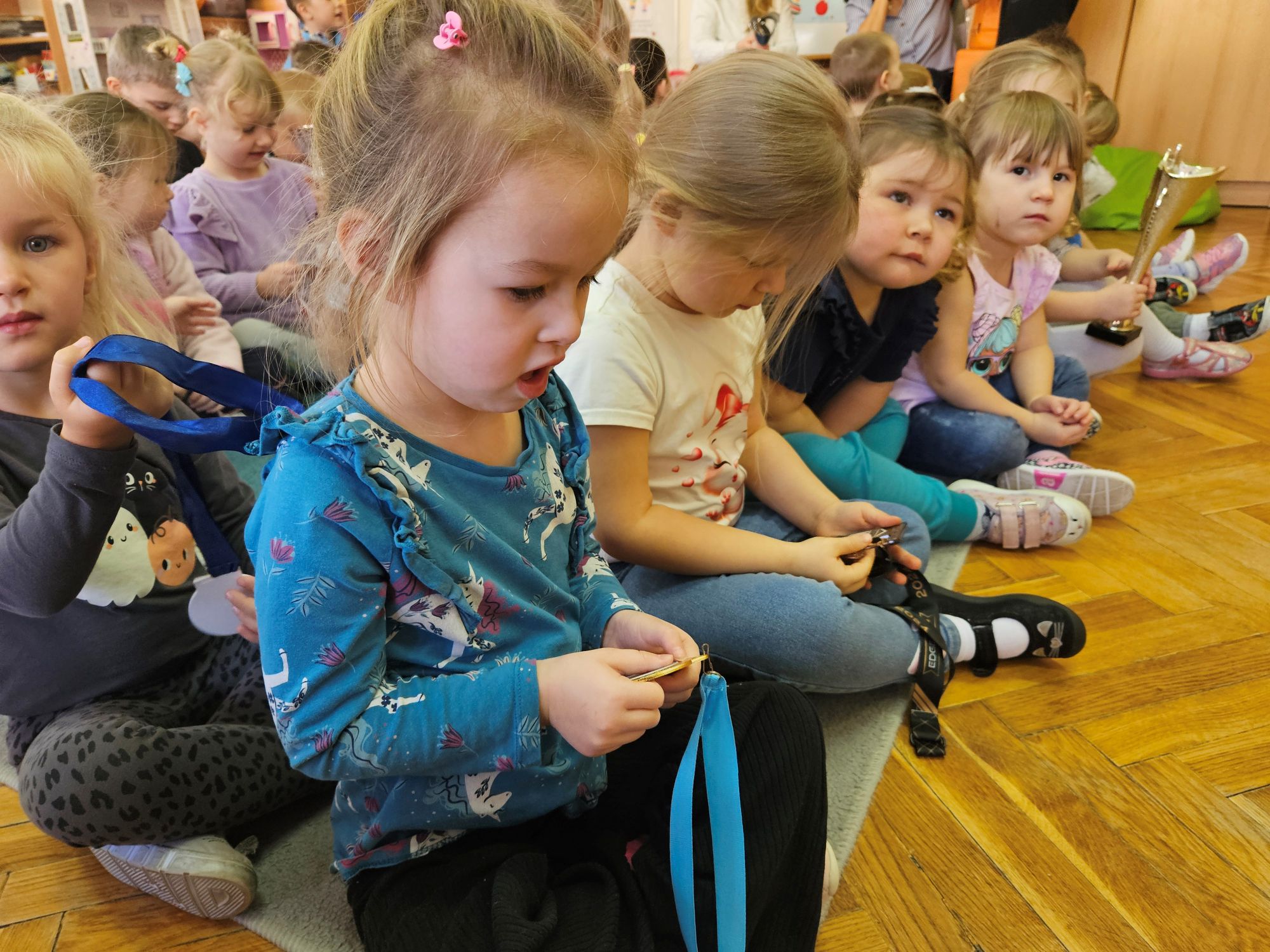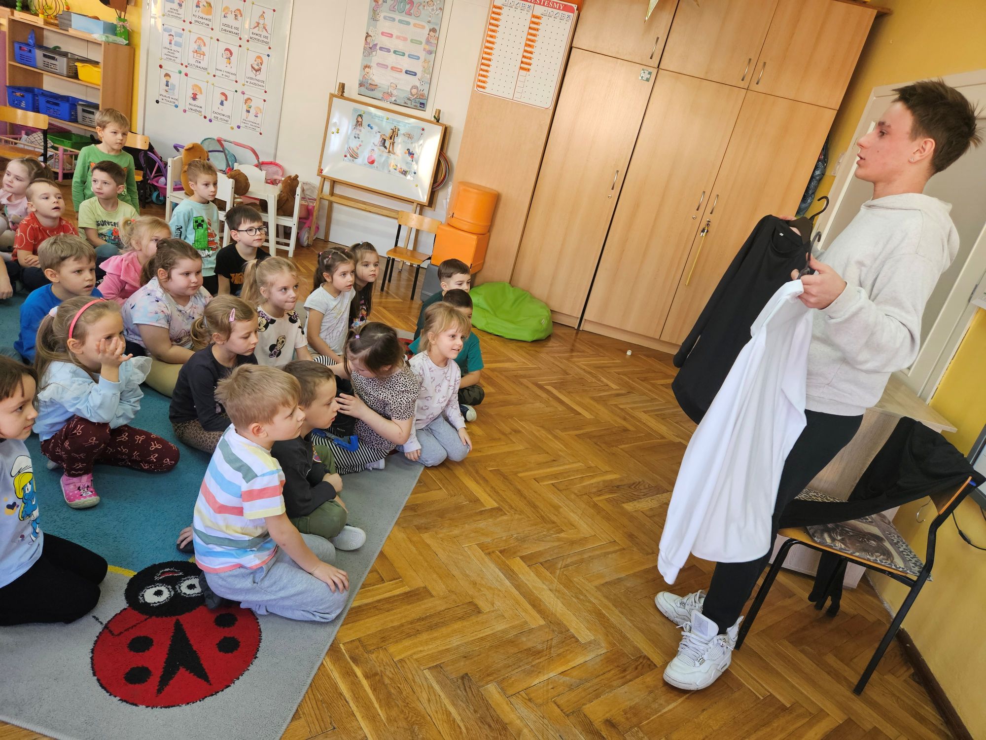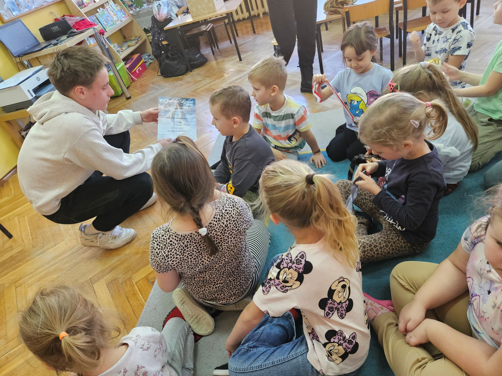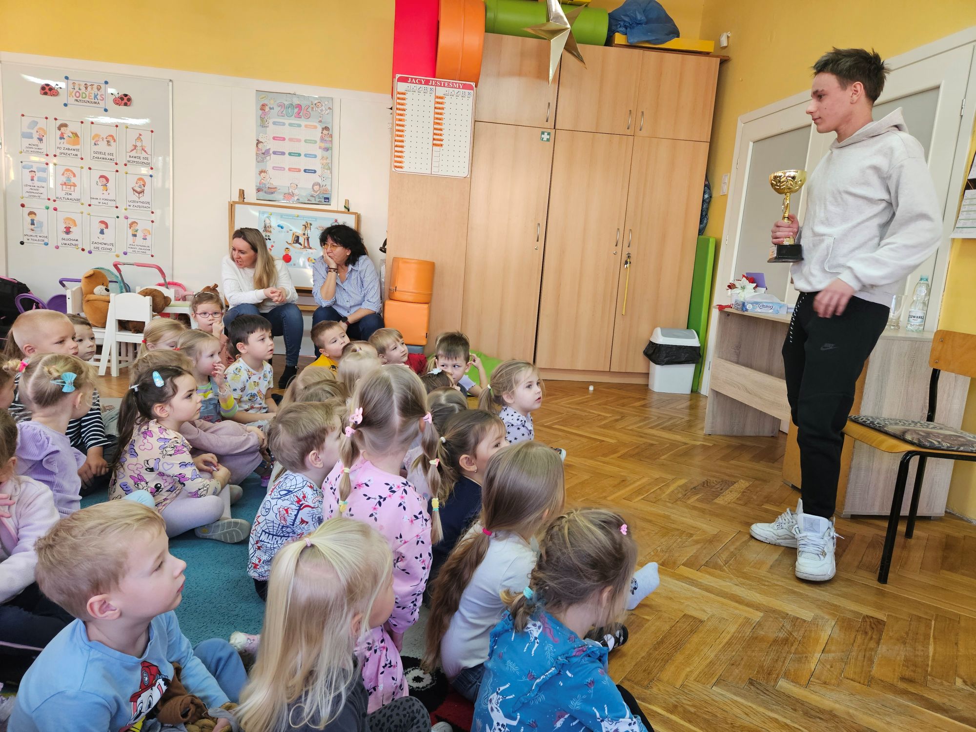 W ramach akcji „Spotkania ze sportowcem” nasze przedszkole 19 stycznia br. odwiedził 15-letni młody łyżwiarz – Bartosz Sobierajski. Po powitaniu przez dzieci, zaproszony gość przybliżył nam na czym polega uprawiana przez niego dyscyplina sportu, czyli łyżwiarstwo figurowe. Dowiedzieliśmy się, iż już w przedszkolu rozpoczęła się jego przygoda z łyżwiarstwem. Zaprezentował swój strój na występy oraz najważniejszy element do jazdy na lodzie, czyli łyżwy. Przedszkolaki podziwiały również medale, dyplomy i puchary, które przywiózł ze sobą nasz gość. Dzięki systematycznym i intensywnym treningom na hali „Bombonierka” w Łodzi , nastolatek zajmuje wysokie wyniki w różnego rodzaju konkursach. Mieliśmy również okazję obejrzeć filmiki z występów, na których dzieci podziwiały figury i skoki, takie jak podnoszenia czy piruety wykonywane przez Bartosza. Na zakończenie miłego spotkania, starszaki wręczyły pamiątkową laurkę i życzyły wielu sukcesów.