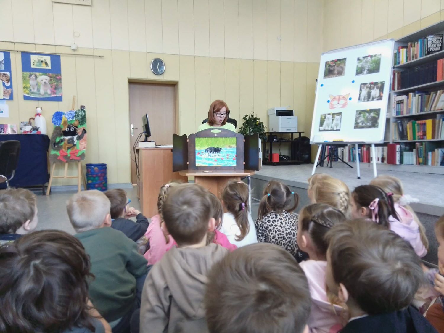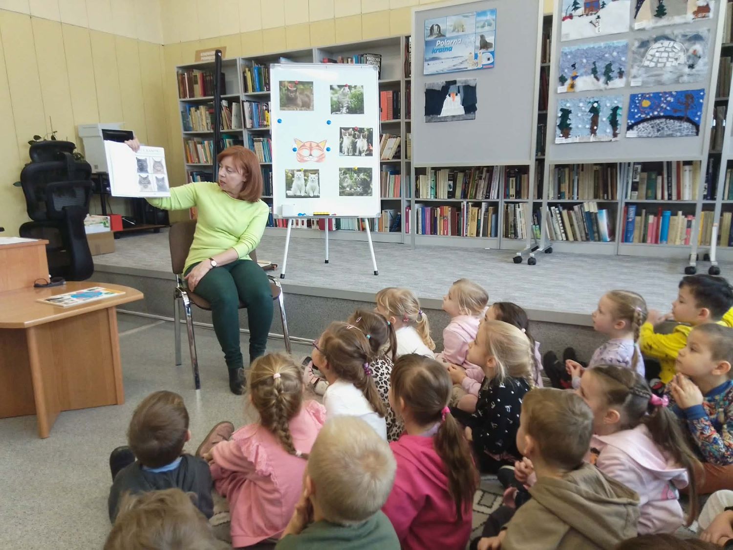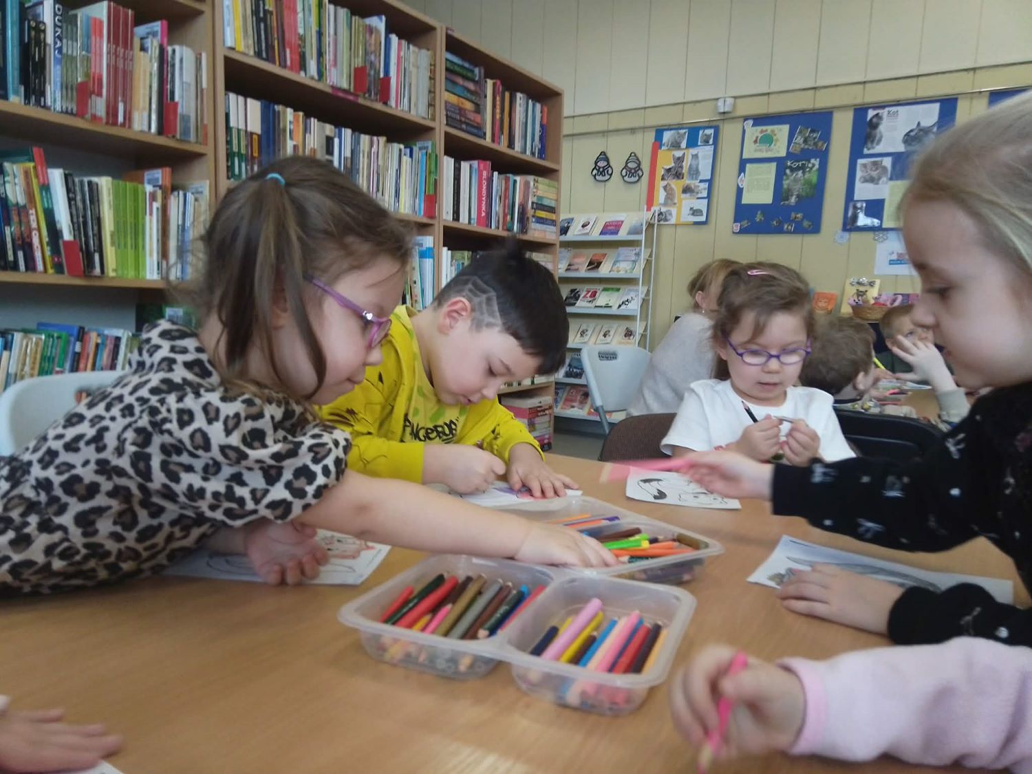 20.02.2026r –Grupa „Słoneczka” odwiedziła Bibliotekę Pedagogiczną w Łasku, by uczcić Dzień Kota. Dzieci wysłuchały wiersza” autorstwa Beaty Gabrat pt. „Kotka Psotka”, obejrzały go za pomocą kart narracyjnych teatrzyku kamishibai . Dzieci poznały jeden dzień z życia małej kotki, której przytrafiają się zabawne sytuacje. Po krótkiej rozmowie o zwyczajach i różnorodności tych zwierząt, przedszkolaki przystąpiły do wykonania zadań, które przygotowała dla nich pani Ilona. Na pamiątkę zabrały ze sobą stworzone przez siebie ilustracje do wiersza.