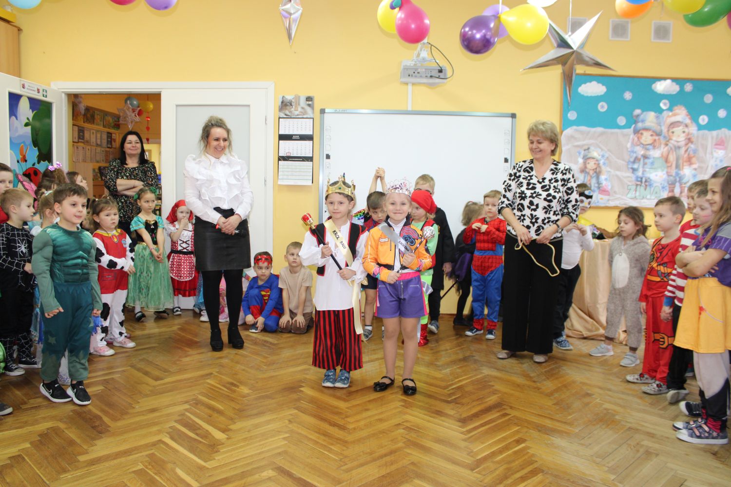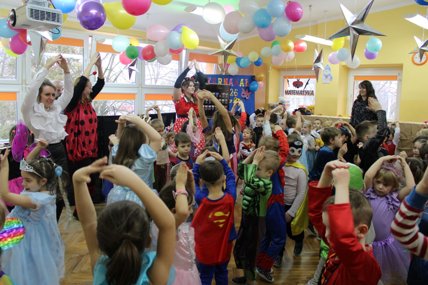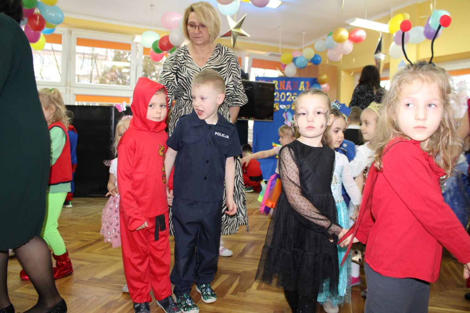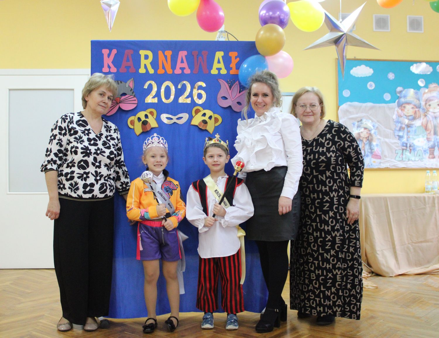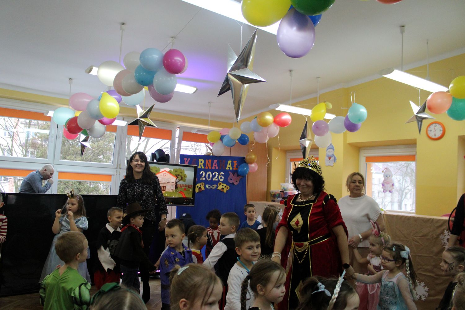 Dzień Uśmiechu i Karnawału to motto zabawy karnawałowej, która odbyła się 30.01.2026r.Kolorowe dekoracje sal i różnorodne stroje dzieci wprowadziły radosny nastrój wśród uczestników balu. Skocznym i wesołym zabawom nie było końca. Dzieci wraz z paniami i przedstawicielkami Rady Rodziców - Panią Arletą i Panią Karoliną tworzyły korowody, pociągi, kółeczka, węże, pary, które tańczyły w rytm piosenek i muzyki puszczanej przez DJ COLE – B Krzysztofa Samojednego. Była również przerwa na zaspokojenie pragnienia i konkursy prowadzone przez Panie Arletę i Karolinę, które wprowadziły element współzawodnictwa wśród uczestników. Na zakończenie zabawy została wybrana przez jury para królewska – Król Wojtek i Królowa Emilka z grupy Misiaczków. Koronacji dokonały Pani Dyrektor Zofia Molenda – Kimla oraz Pani Renia. Wspólny taniec pary królewskiej przy gromkich brawach zgromadzonych i ostatni taniec wszystkich dzieci były sygnałem końca zabawy. Za wspaniałą zabawę dzieci z każdej z grup otrzymały od Pani Dyrektor słodki upominek.