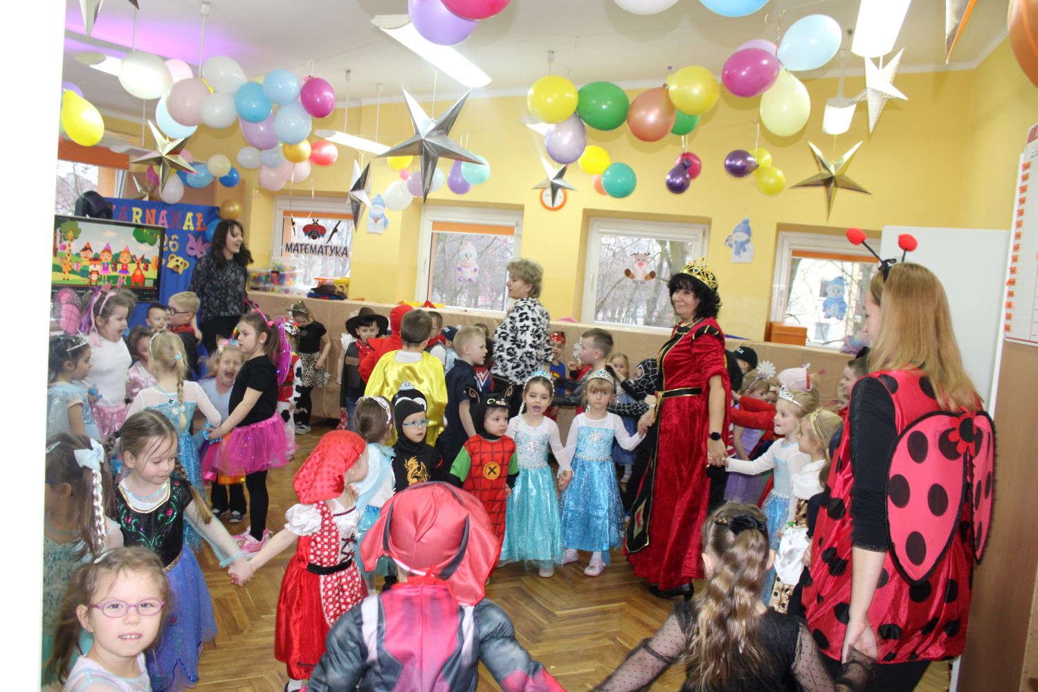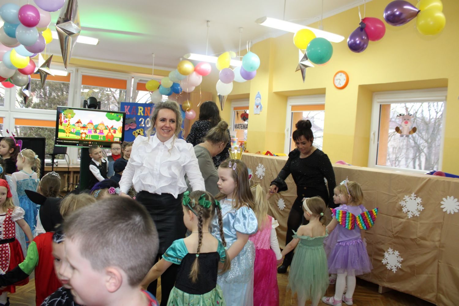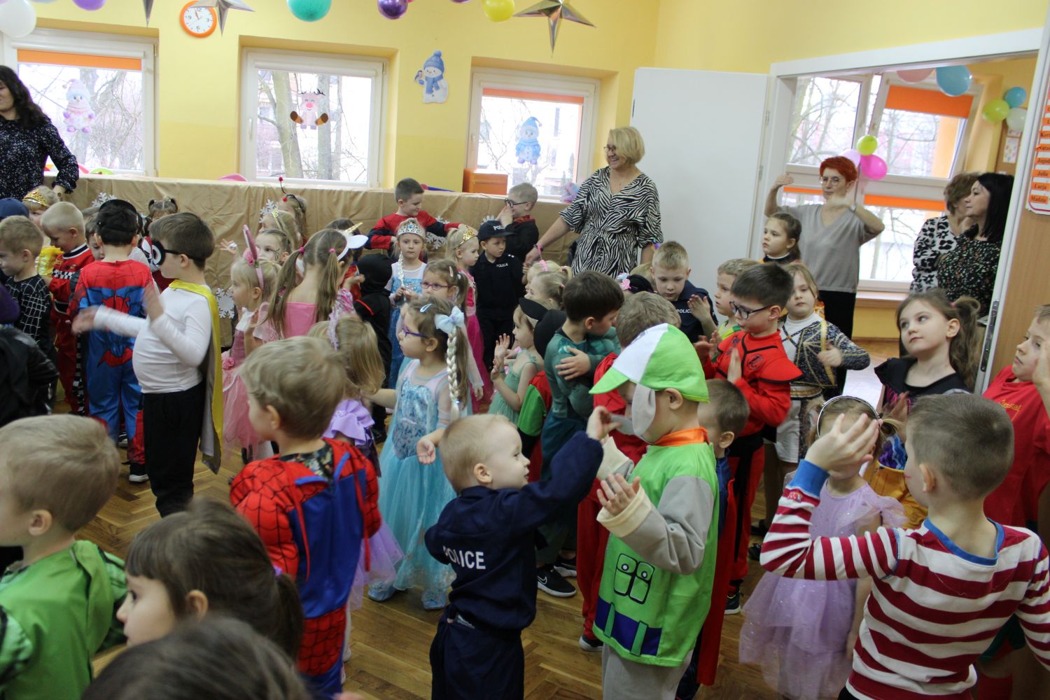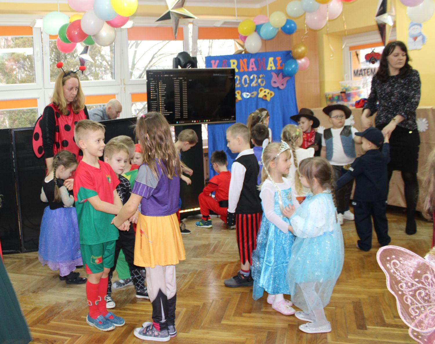 Dzień Uśmiechu i Karnawału to motto zabawy karnawałowej, która odbyła się 30.01.2026r.Kolorowe dekoracje sal i różnorodne stroje dzieci wprowadziły radosny nastrój wśród uczestników balu. Skocznym i wesołym zabawom nie było końca. Dzieci wraz z paniami i przedstawicielkami Rady Rodziców - Panią Arletą i Panią Karoliną tworzyły korowody, pociągi, kółeczka, węże, pary, które tańczyły w rytm piosenek i muzyki puszczanej przez DJ COLE – B Krzysztofa Samojednego. Była również przerwa na zaspokojenie pragnienia i konkursy prowadzone przez Panie Arletę i Karolinę, które wprowadziły element współzawodnictwa wśród uczestników. Na zakończenie zabawy została wybrana przez jury para królewska – Król Wojtek i Królowa Emilka z grupy Misiaczków. Koronacji dokonały Pani Dyrektor Zofia Molenda – Kimla oraz Pani Renia. Wspólny taniec pary królewskiej przy gromkich brawach zgromadzonych i ostatni taniec wszystkich dzieci były sygnałem końca zabawy. Za wspaniałą zabawę dzieci z każdej z grup otrzymały od Pani Dyrektor słodki upominek.