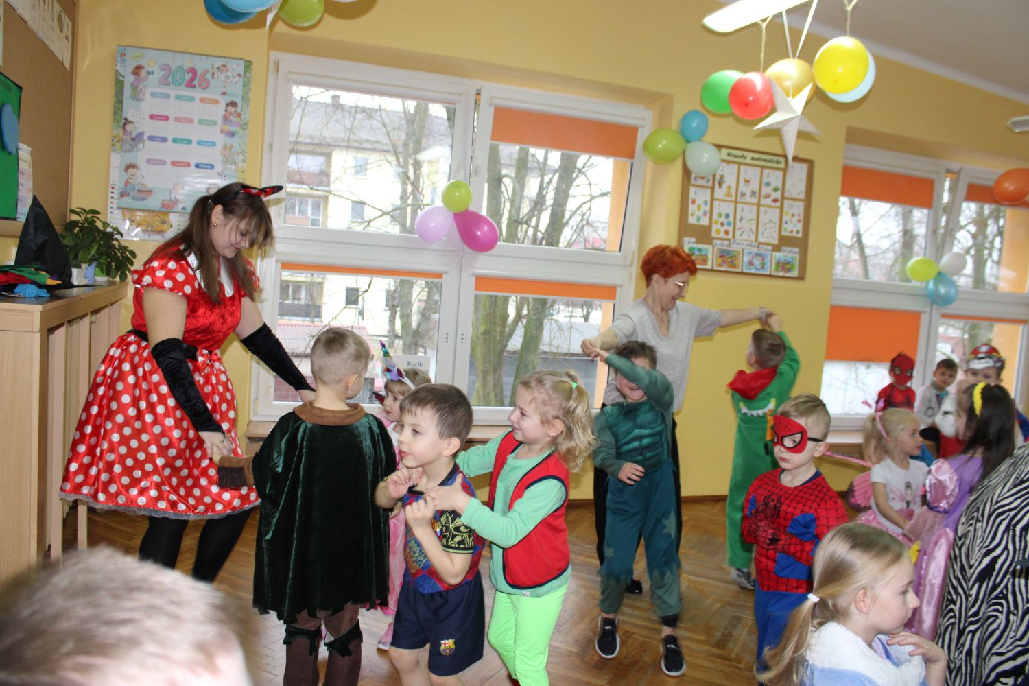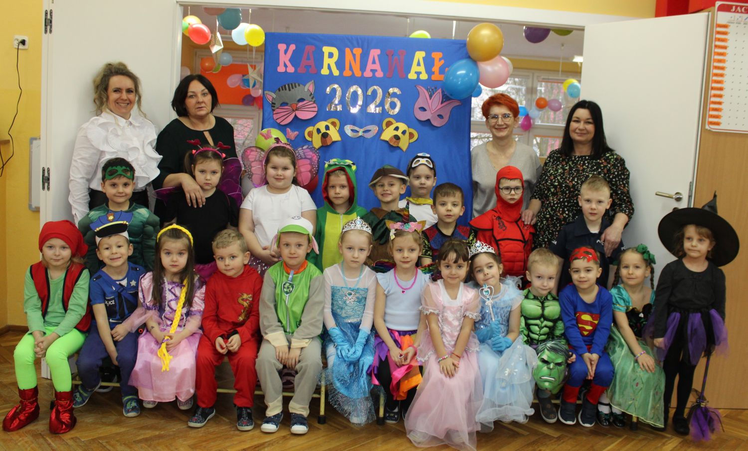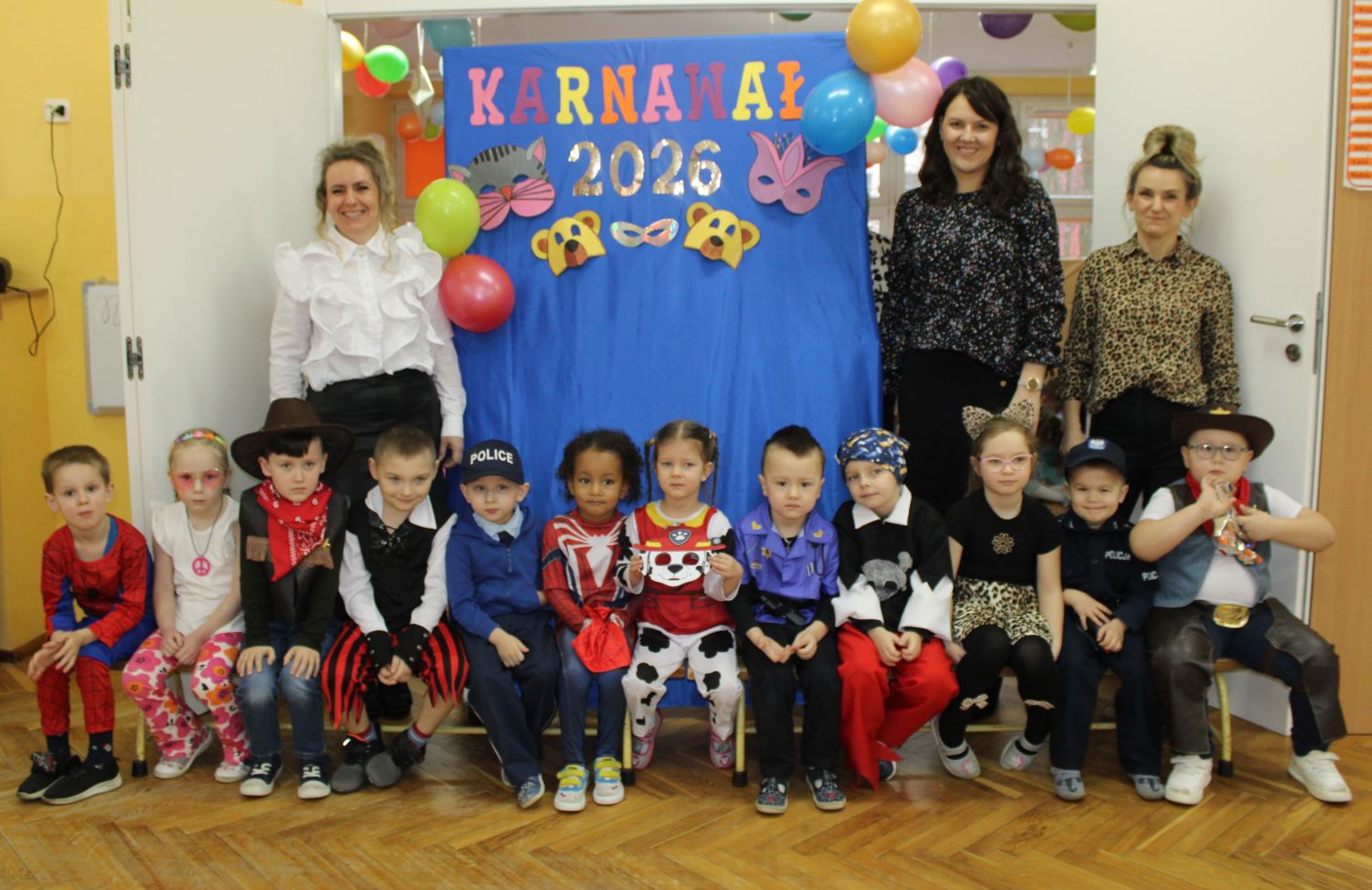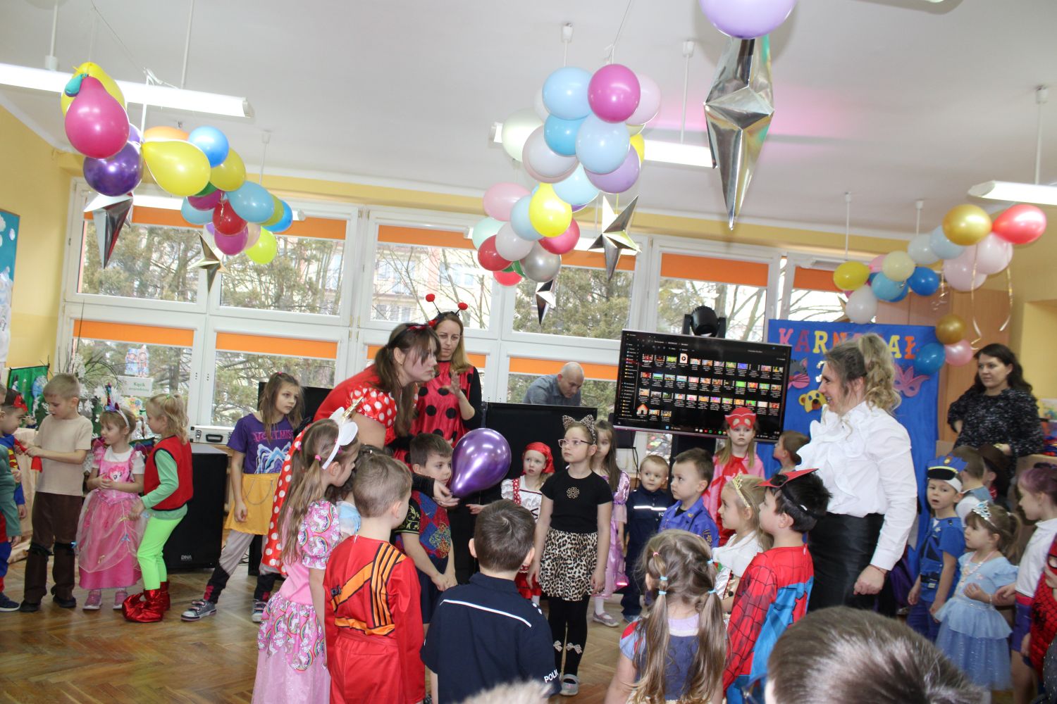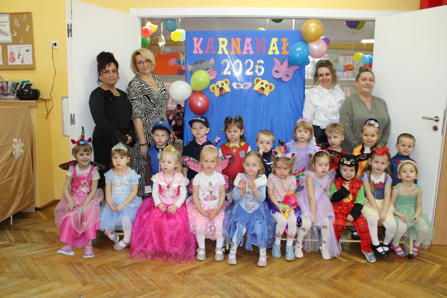 Dzień Uśmiechu i Karnawału to motto zabawy karnawałowej, która odbyła się 30.01.2026r.Kolorowe dekoracje sal i różnorodne stroje dzieci wprowadziły radosny nastrój wśród uczestników balu. Skocznym i wesołym zabawom nie było końca. Dzieci wraz z paniami i przedstawicielkami Rady Rodziców - Panią Arletą i Panią Karoliną tworzyły korowody, pociągi, kółeczka, węże, pary, które tańczyły w rytm piosenek i muzyki puszczanej przez DJ COLE – B Krzysztofa Samojednego. Była również przerwa na zaspokojenie pragnienia i konkursy prowadzone przez Panie Arletę i Karolinę, które wprowadziły element współzawodnictwa wśród uczestników. Na zakończenie zabawy została wybrana przez jury para królewska – Król Wojtek i Królowa Emilka z grupy Misiaczków. Koronacji dokonały Pani Dyrektor Zofia Molenda – Kimla oraz Pani Renia. Wspólny taniec pary królewskiej przy gromkich brawach zgromadzonych i ostatni taniec wszystkich dzieci były sygnałem końca zabawy. Za wspaniałą zabawę dzieci z każdej z grup otrzymały od Pani Dyrektor słodki upominek.