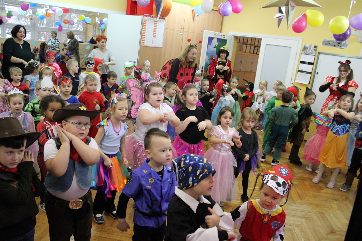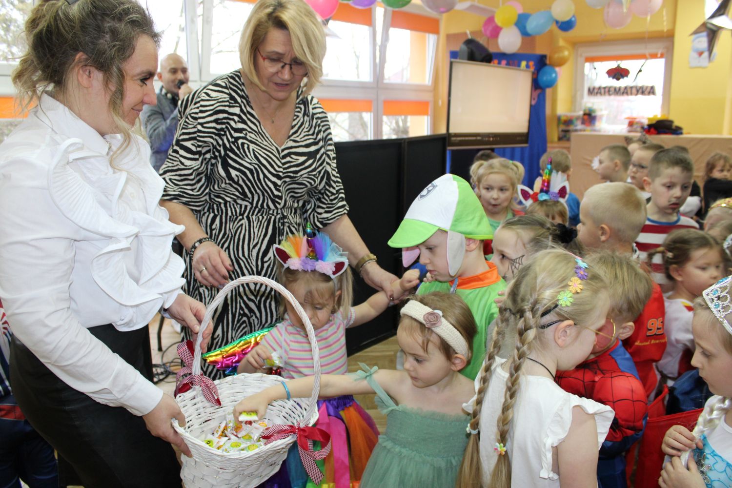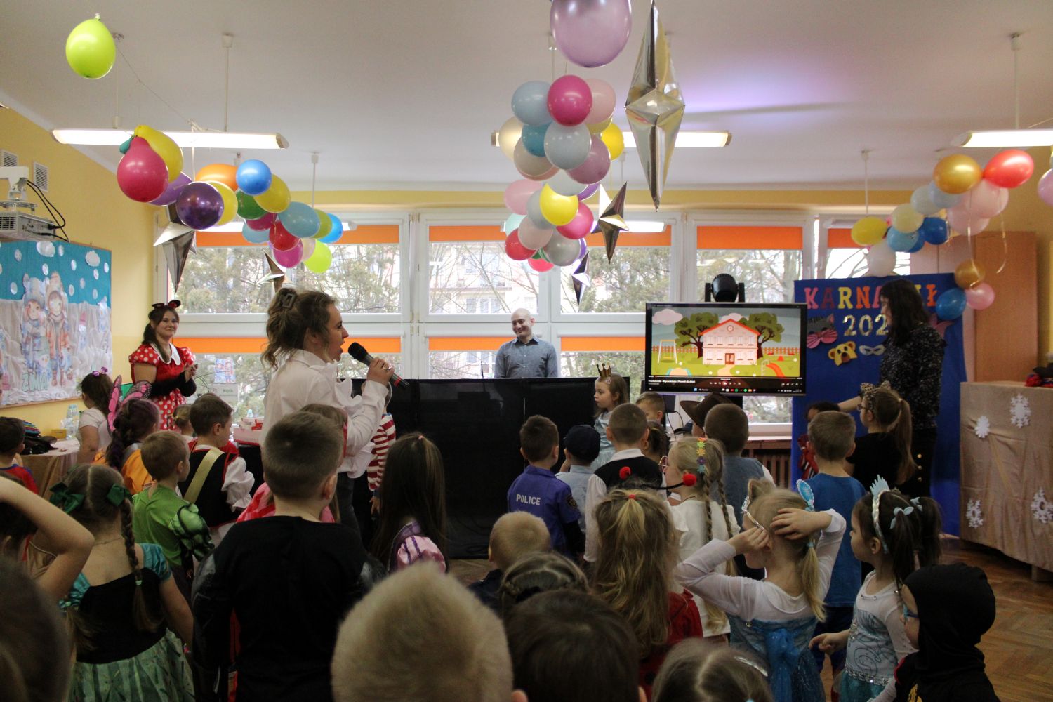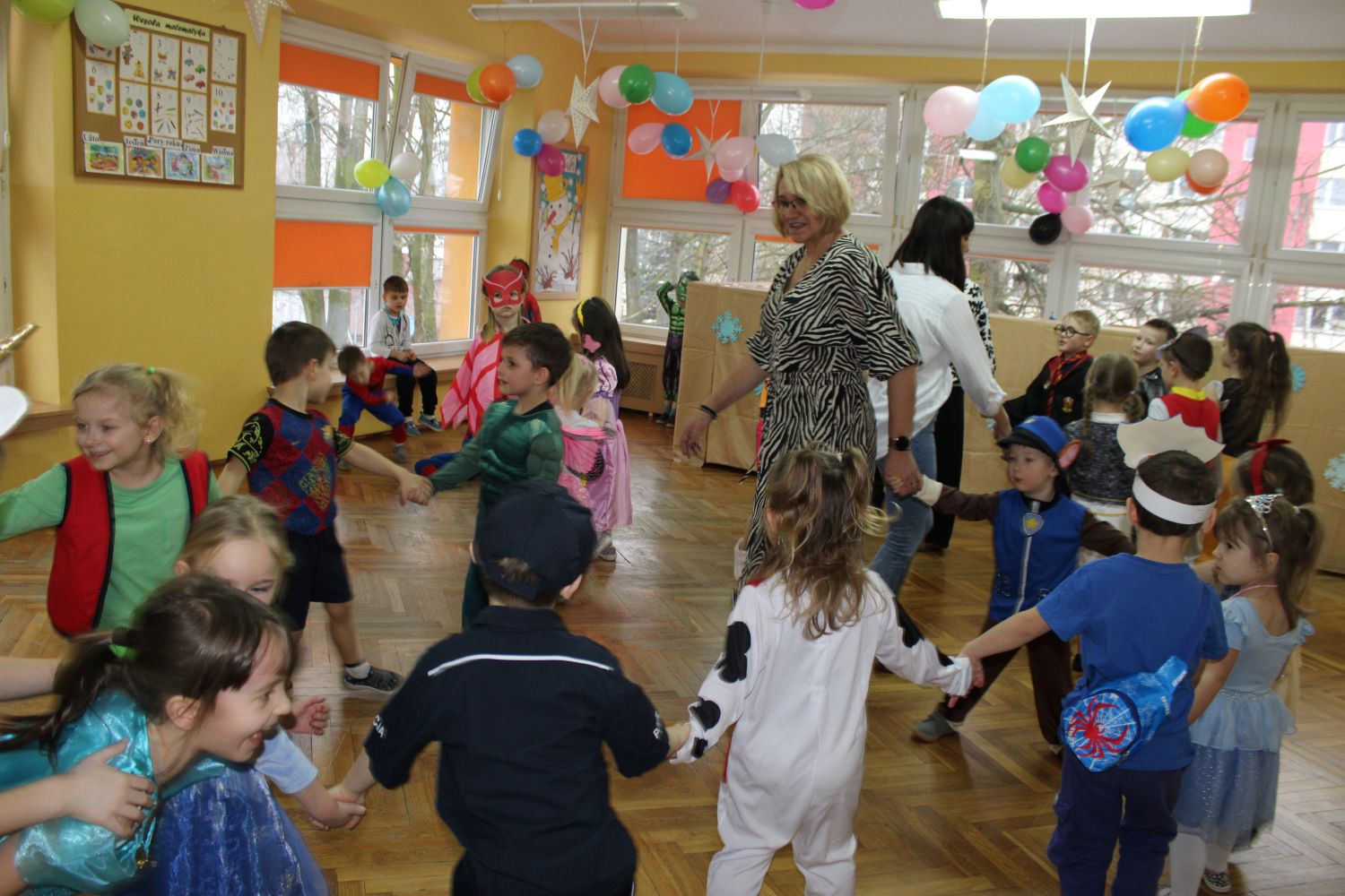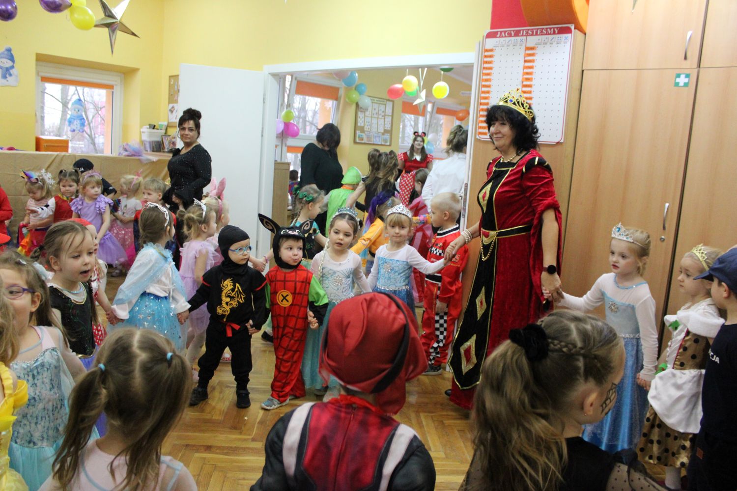 Dzień Uśmiechu i Karnawału to motto zabawy karnawałowej, która odbyła się 30.01.2026r.Kolorowe dekoracje sal i różnorodne stroje dzieci wprowadziły radosny nastrój wśród uczestników balu. Skocznym i wesołym zabawom nie było końca. Dzieci wraz z paniami i przedstawicielkami Rady Rodziców - Panią Arletą i Panią Karoliną tworzyły korowody, pociągi, kółeczka, węże, pary, które tańczyły w rytm piosenek i muzyki puszczanej przez DJ COLE – B Krzysztofa Samojednego. Była również przerwa na zaspokojenie pragnienia i konkursy prowadzone przez Panie Arletę i Karolinę, które wprowadziły element współzawodnictwa wśród uczestników. Na zakończenie zabawy została wybrana przez jury para królewska – Król Wojtek i Królowa Emilka z grupy Misiaczków. Koronacji dokonały Pani Dyrektor Zofia Molenda – Kimla oraz Pani Renia. Wspólny taniec pary królewskiej przy gromkich brawach zgromadzonych i ostatni taniec wszystkich dzieci były sygnałem końca zabawy. Za wspaniałą zabawę dzieci z każdej z grup otrzymały od Pani Dyrektor słodki upominek.