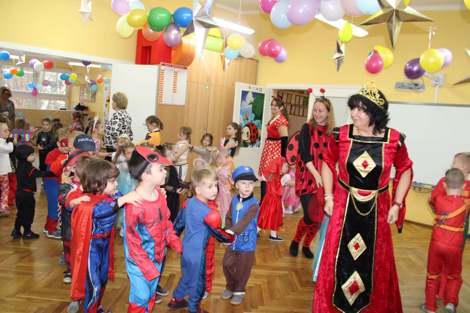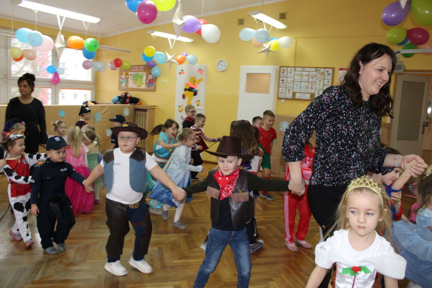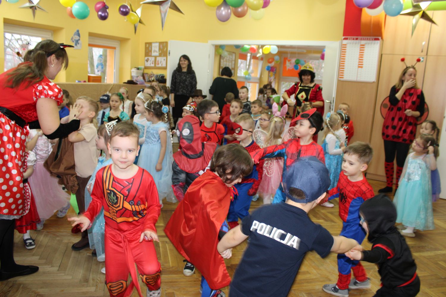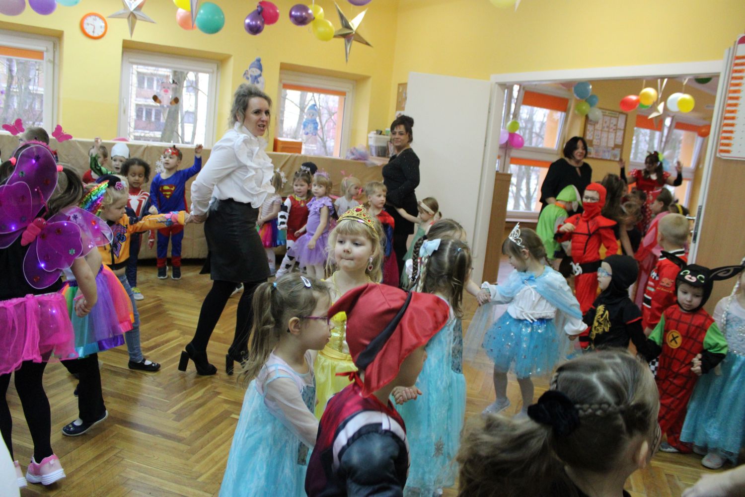 Dzień Uśmiechu i Karnawału to motto zabawy karnawałowej, która odbyła się 30.01.2026r.Kolorowe dekoracje sal i różnorodne stroje dzieci wprowadziły radosny nastrój wśród uczestników balu. Skocznym i wesołym zabawom nie było końca. Dzieci wraz z paniami i przedstawicielkami Rady Rodziców - Panią Arletą i Panią Karoliną tworzyły korowody, pociągi, kółeczka, węże, pary, które tańczyły w rytm piosenek i muzyki puszczanej przez DJ COLE – B Krzysztofa Samojednego. Była również przerwa na zaspokojenie pragnienia i konkursy prowadzone przez Panie Arletę i Karolinę, które wprowadziły element współzawodnictwa wśród uczestników. Na zakończenie zabawy została wybrana przez jury para królewska – Król Wojtek i Królowa Emilka z grupy Misiaczków. Koronacji dokonały Pani Dyrektor Zofia Molenda – Kimla oraz Pani Renia. Wspólny taniec pary królewskiej przy gromkich brawach zgromadzonych i ostatni taniec wszystkich dzieci były sygnałem końca zabawy. Za wspaniałą zabawę dzieci z każdej z grup otrzymały od Pani Dyrektor słodki upominek.