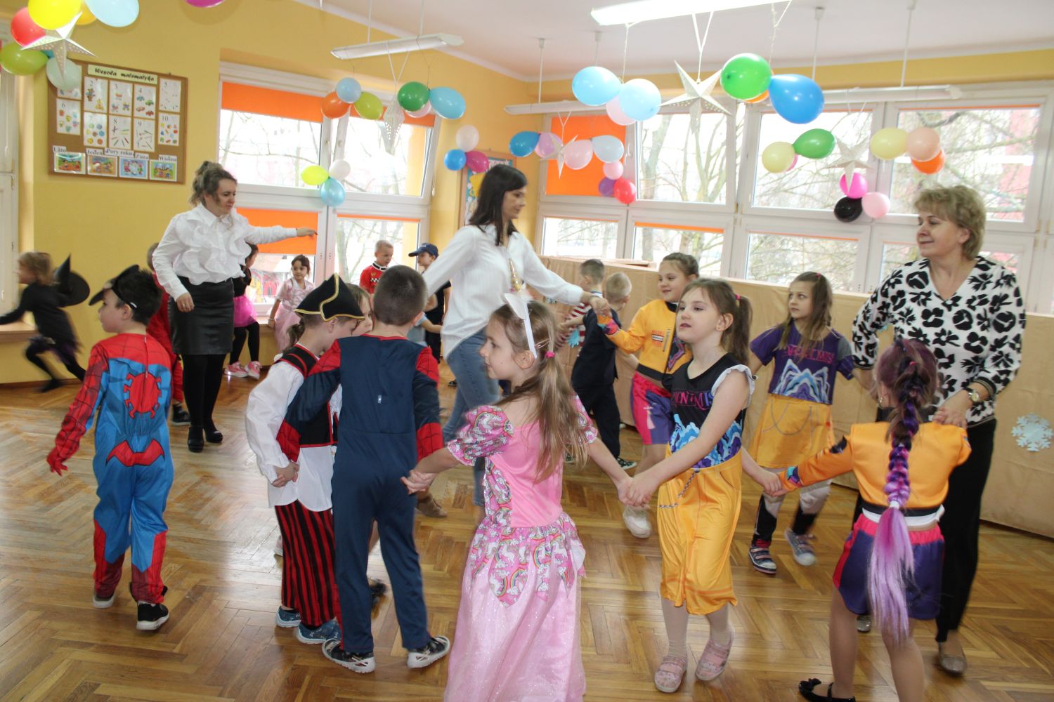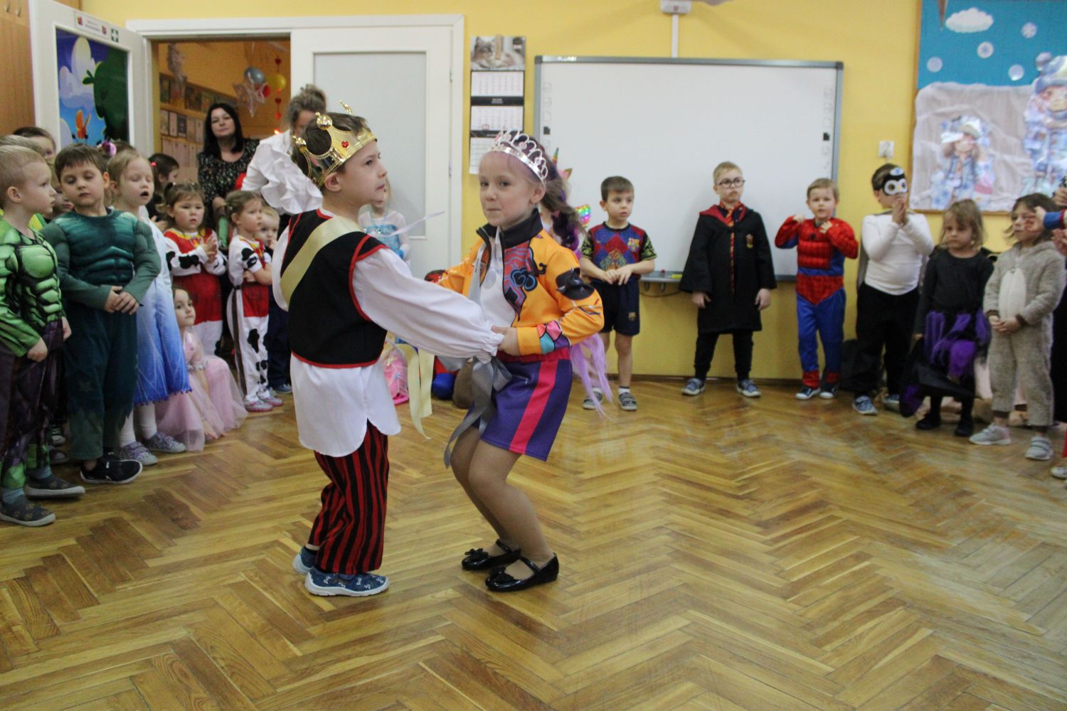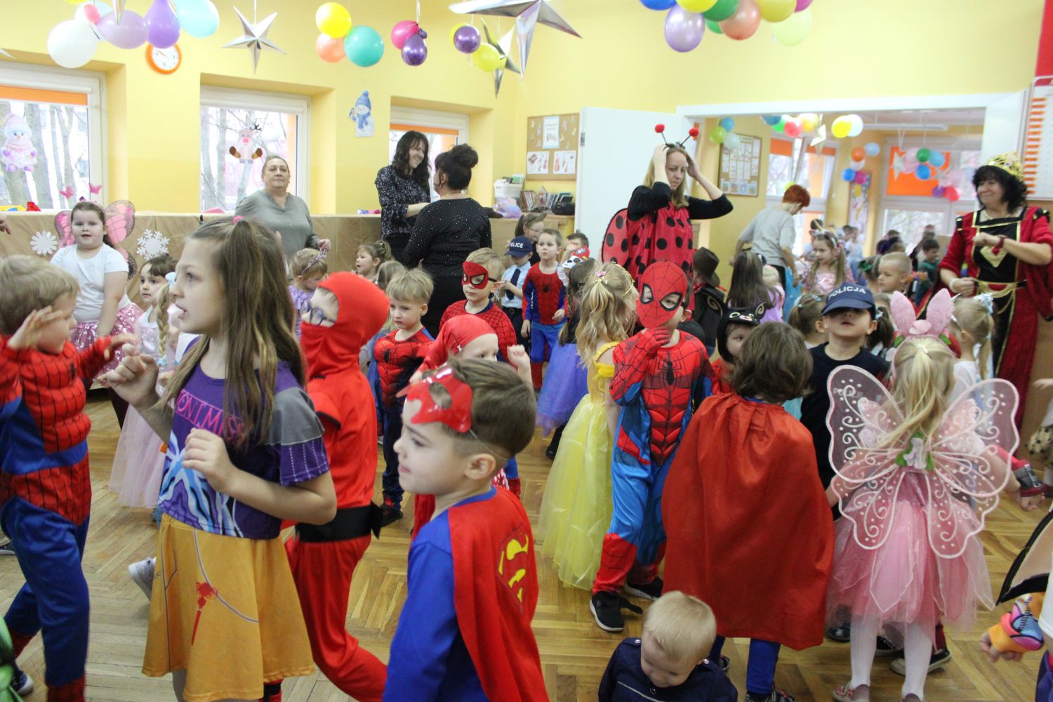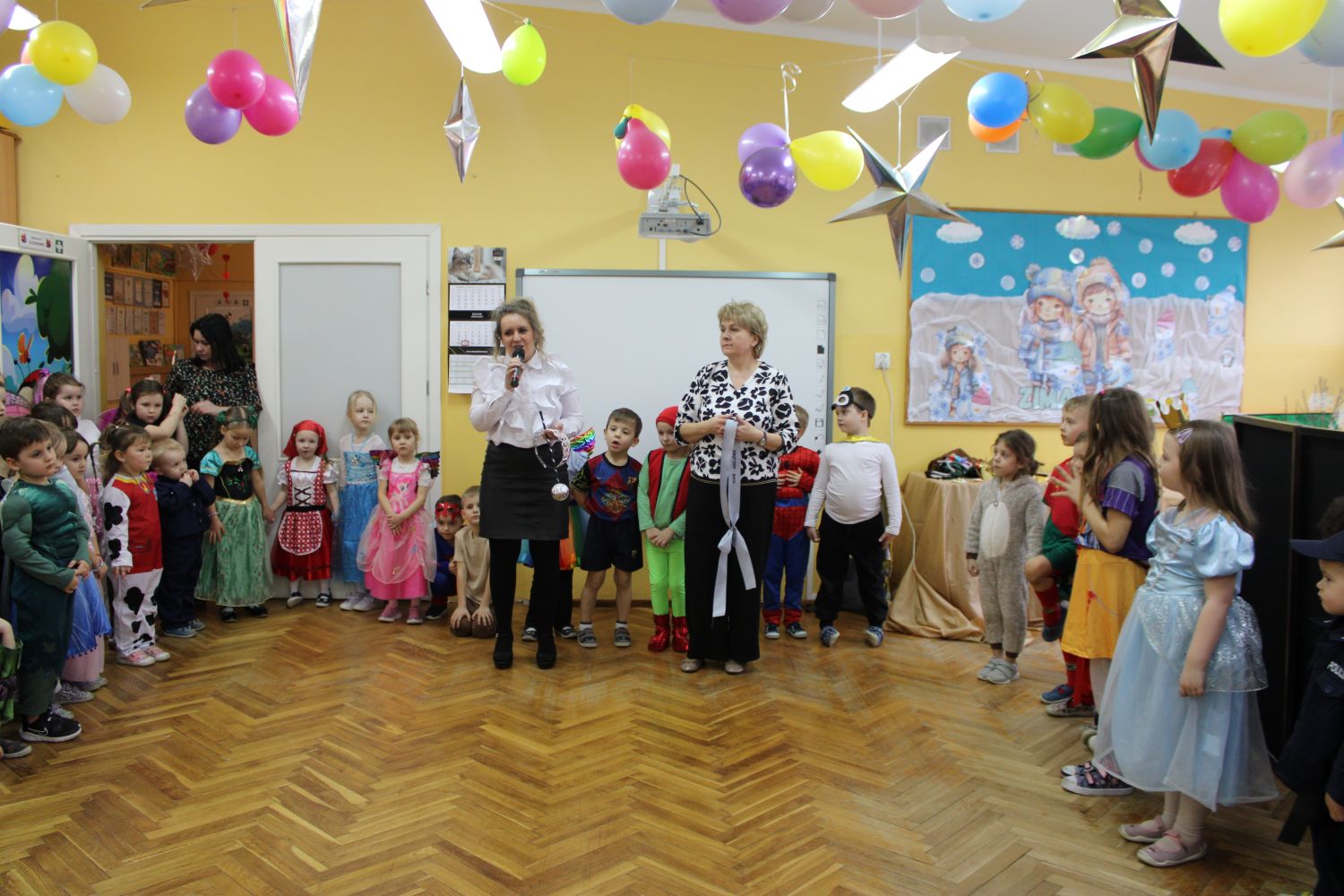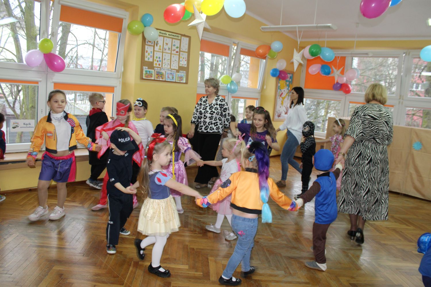 Dzień Uśmiechu i Karnawału to motto zabawy karnawałowej, która odbyła się 30.01.2026r.Kolorowe dekoracje sal i różnorodne stroje dzieci wprowadziły radosny nastrój wśród uczestników balu. Skocznym i wesołym zabawom nie było końca. Dzieci wraz z paniami i przedstawicielkami Rady Rodziców - Panią Arletą i Panią Karoliną tworzyły korowody, pociągi, kółeczka, węże, pary, które tańczyły w rytm piosenek i muzyki puszczanej przez DJ COLE – B Krzysztofa Samojednego. Była również przerwa na zaspokojenie pragnienia i konkursy prowadzone przez Panie Arletę i Karolinę, które wprowadziły element współzawodnictwa wśród uczestników. Na zakończenie zabawy została wybrana przez jury para królewska – Król Wojtek i Królowa Emilka z grupy Misiaczków. Koronacji dokonały Pani Dyrektor Zofia Molenda – Kimla oraz Pani Renia. Wspólny taniec pary królewskiej przy gromkich brawach zgromadzonych i ostatni taniec wszystkich dzieci były sygnałem końca zabawy. Za wspaniałą zabawę dzieci z każdej z grup otrzymały od Pani Dyrektor słodki upominek.