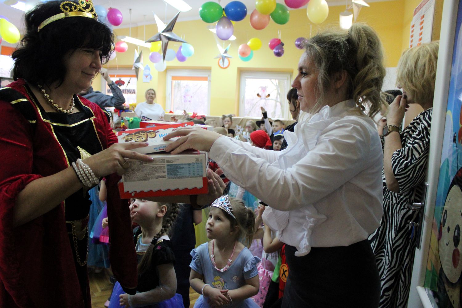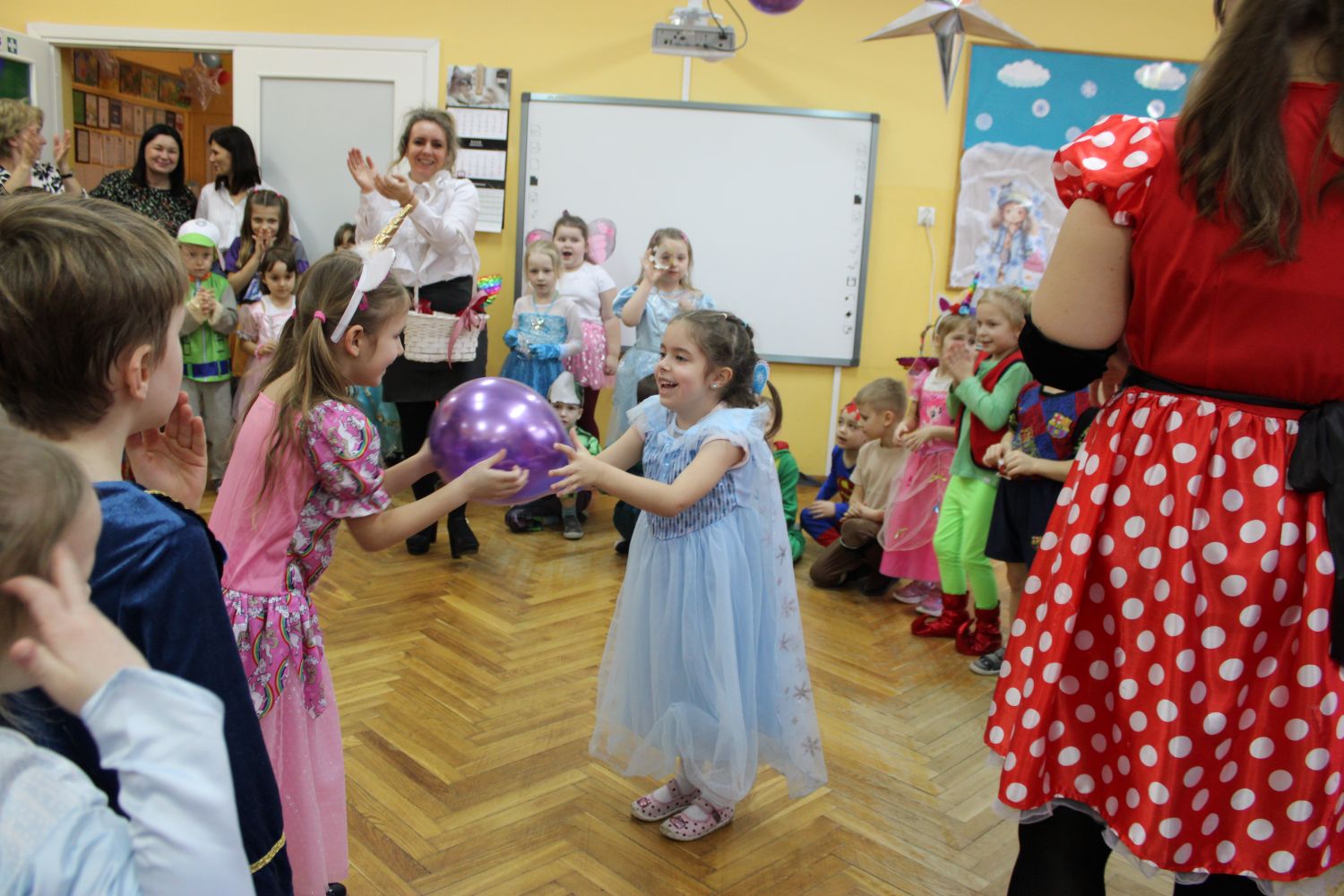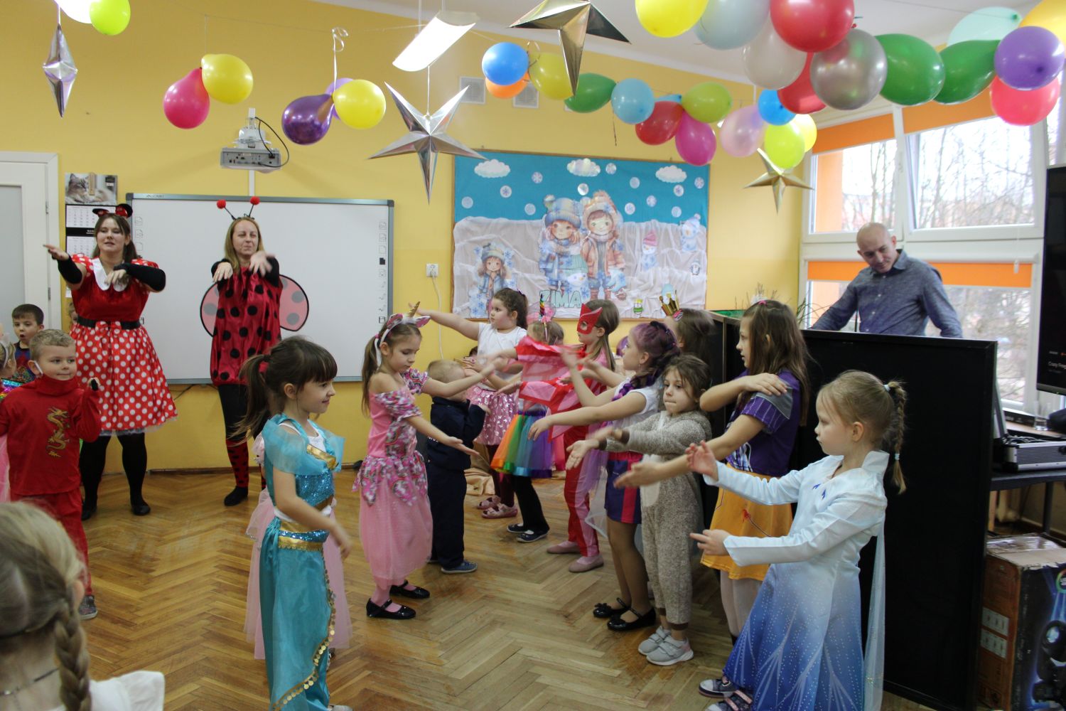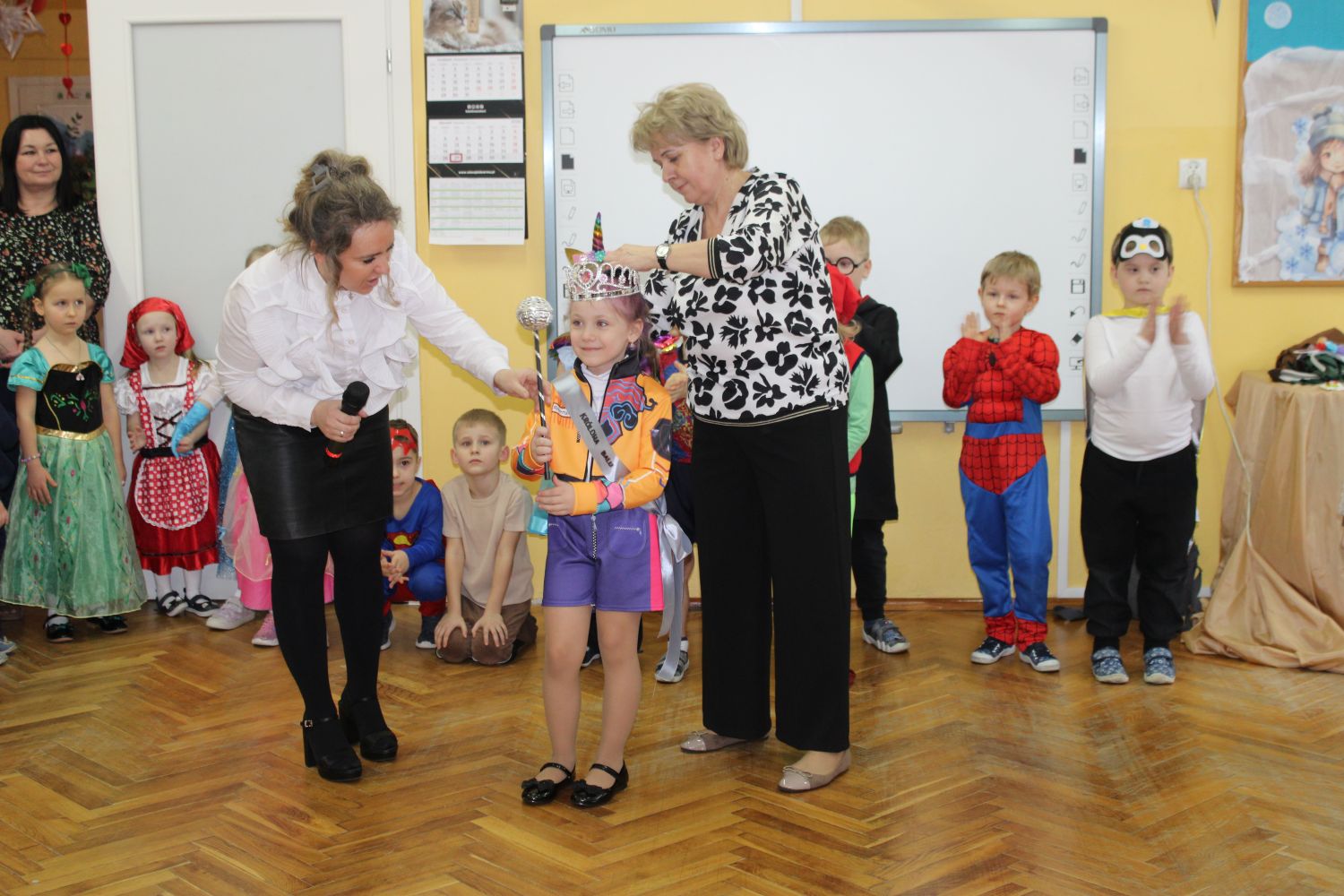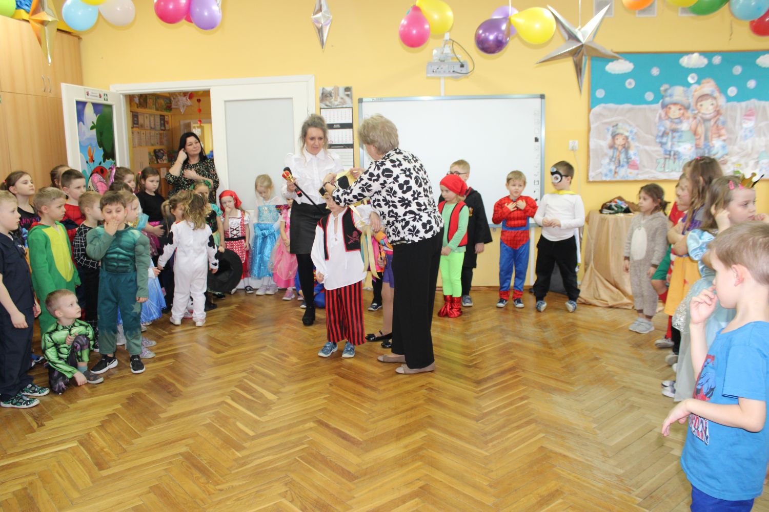 Dzień Uśmiechu i Karnawału to motto zabawy karnawałowej, która odbyła się 30.01.2026r.Kolorowe dekoracje sal i różnorodne stroje dzieci wprowadziły radosny nastrój wśród uczestników balu. Skocznym i wesołym zabawom nie było końca. Dzieci wraz z paniami i przedstawicielkami Rady Rodziców - Panią Arletą i Panią Karoliną tworzyły korowody, pociągi, kółeczka, węże, pary, które tańczyły w rytm piosenek i muzyki puszczanej przez DJ COLE – B Krzysztofa Samojednego. Była również przerwa na zaspokojenie pragnienia i konkursy prowadzone przez Panie Arletę i Karolinę, które wprowadziły element współzawodnictwa wśród uczestników. Na zakończenie zabawy została wybrana przez jury para królewska – Król Wojtek i Królowa Emilka z grupy Misiaczków. Koronacji dokonały Pani Dyrektor Zofia Molenda – Kimla oraz Pani Renia. Wspólny taniec pary królewskiej przy gromkich brawach zgromadzonych i ostatni taniec wszystkich dzieci były sygnałem końca zabawy. Za wspaniałą zabawę dzieci z każdej z grup otrzymały od Pani Dyrektor słodki upominek.