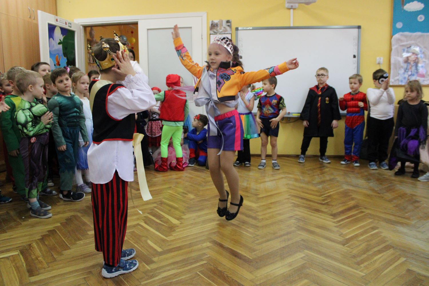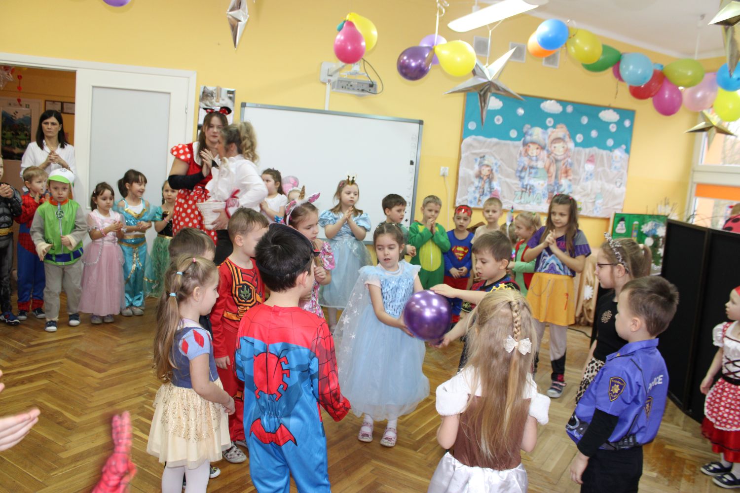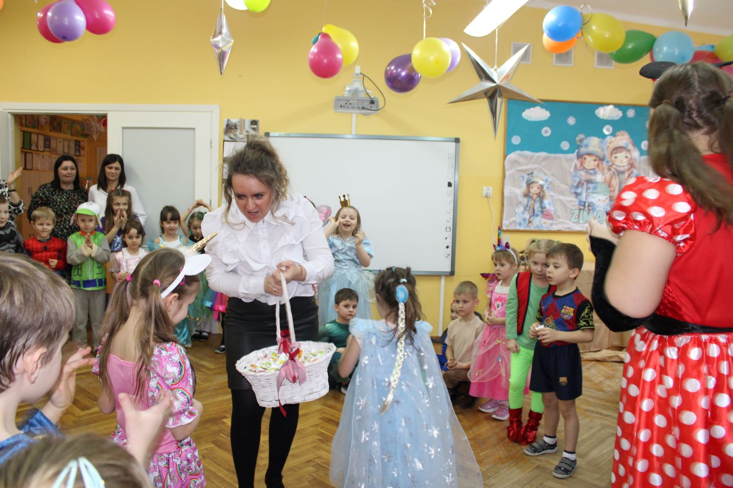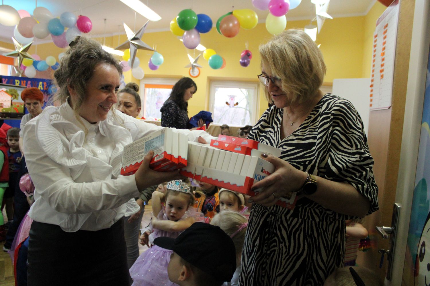 Dzień Uśmiechu i Karnawału to motto zabawy karnawałowej, która odbyła się 30.01.2026r.Kolorowe dekoracje sal i różnorodne stroje dzieci wprowadziły radosny nastrój wśród uczestników balu. Skocznym i wesołym zabawom nie było końca. Dzieci wraz z paniami i przedstawicielkami Rady Rodziców - Panią Arletą i Panią Karoliną tworzyły korowody, pociągi, kółeczka, węże, pary, które tańczyły w rytm piosenek i muzyki puszczanej przez DJ COLE – B Krzysztofa Samojednego. Była również przerwa na zaspokojenie pragnienia i konkursy prowadzone przez Panie Arletę i Karolinę, które wprowadziły element współzawodnictwa wśród uczestników. Na zakończenie zabawy została wybrana przez jury para królewska – Król Wojtek i Królowa Emilka z grupy Misiaczków. Koronacji dokonały Pani Dyrektor Zofia Molenda – Kimla oraz Pani Renia. Wspólny taniec pary królewskiej przy gromkich brawach zgromadzonych i ostatni taniec wszystkich dzieci były sygnałem końca zabawy. Za wspaniałą zabawę dzieci z każdej z grup otrzymały od Pani Dyrektor słodki upominek.