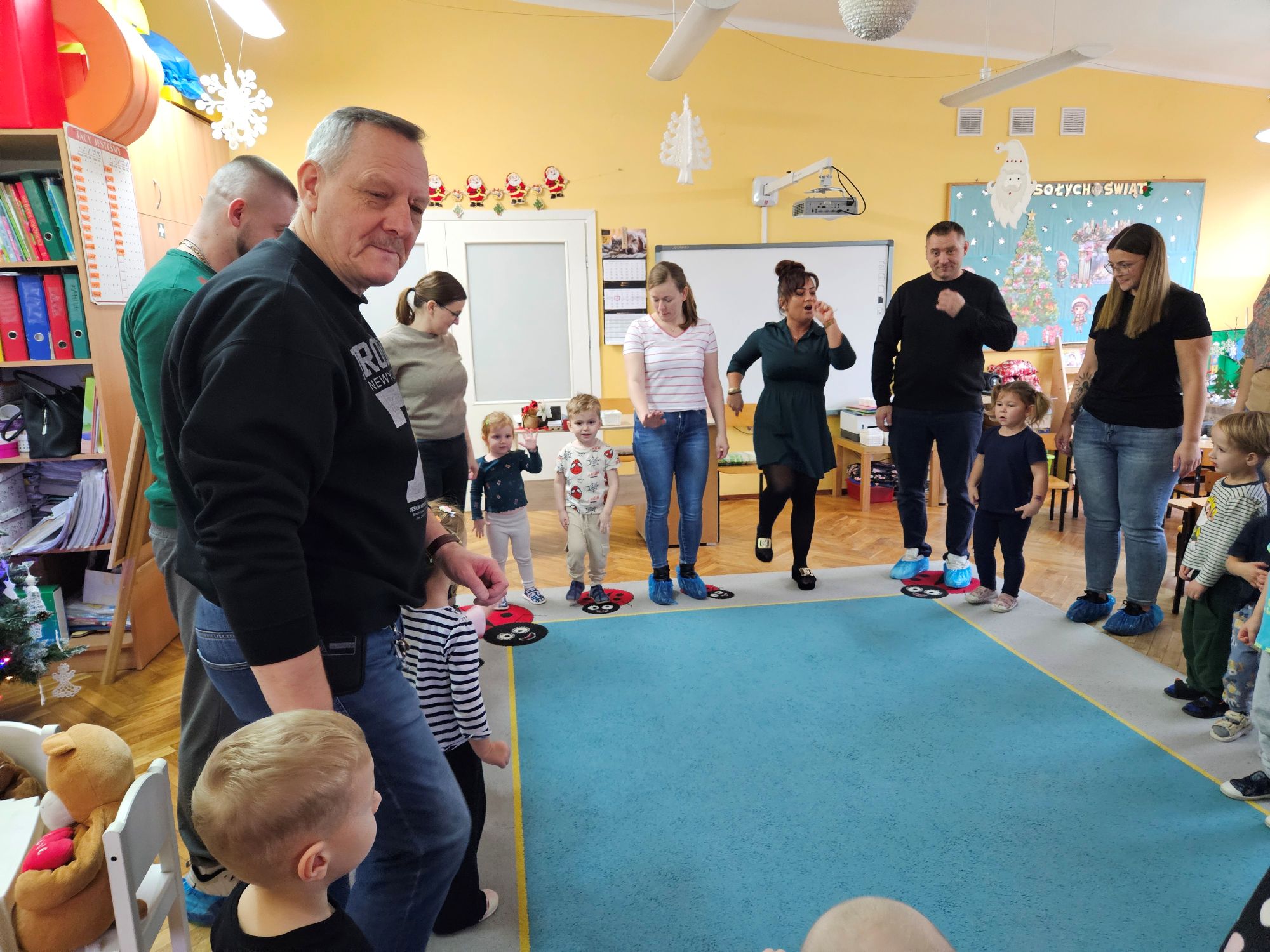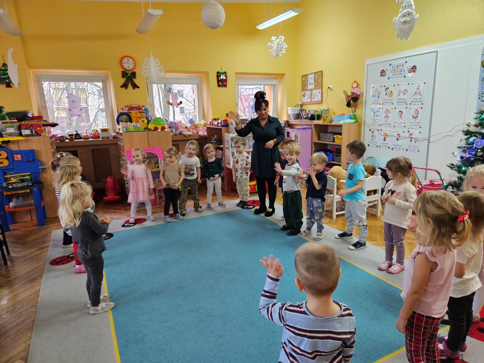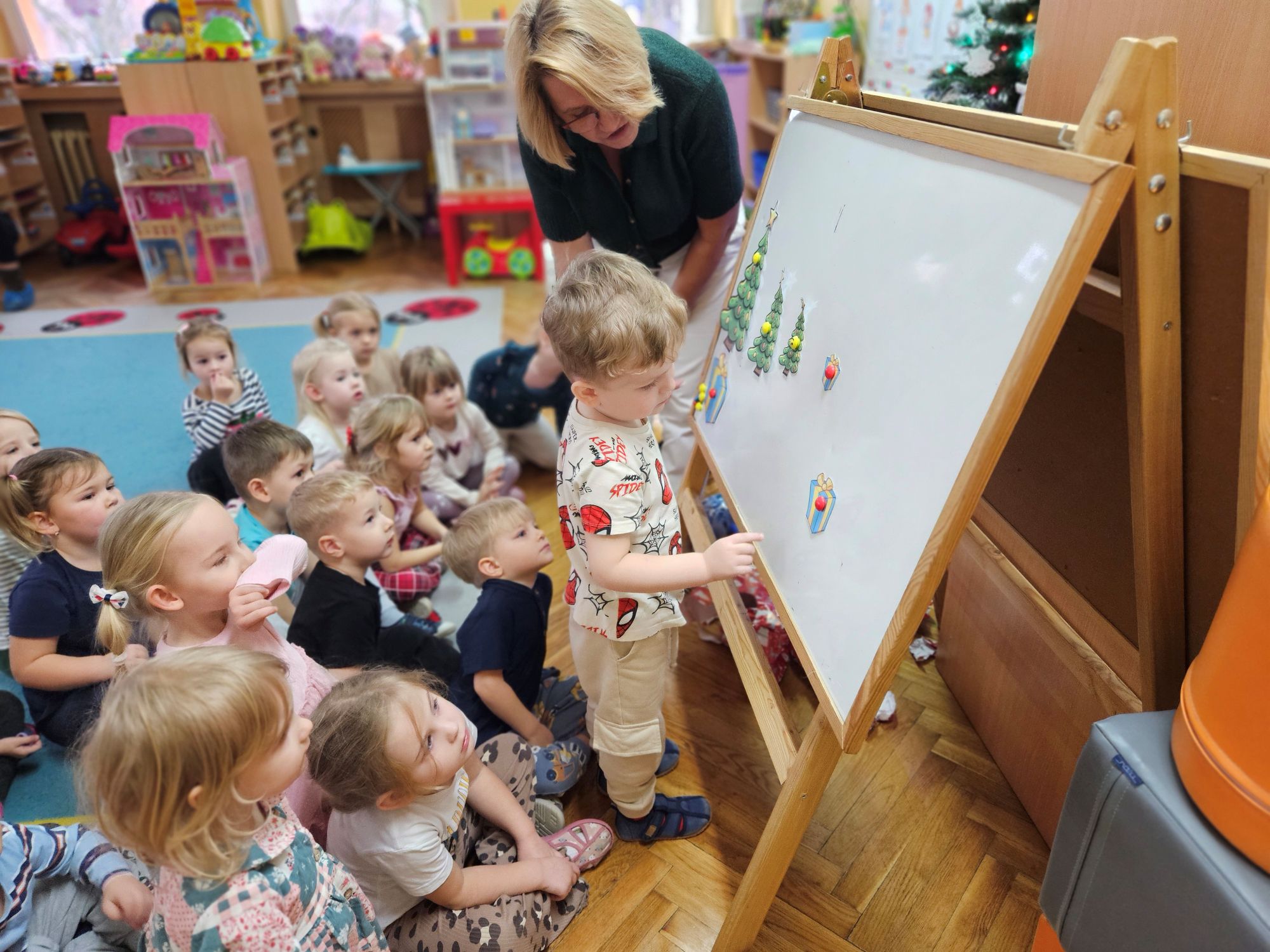 12 grudnia w grupie „Biedronek” odbyło się zajęcie otwarte i warsztaty dla rodziców pt. „Bajki pomagajki – krótka bajka o św. Mikołaju. Dzieci rozpoczęły zajęcia zabawą Powitanką , a potem zaprosiły swoich rodziców do wspólnych zabaw muzyczno – ruchowych "Chodzę sobie chodzę" oraz "Reniferowe zaprzęgi". Po wspólnej zabawie wszyscy wysłuchali bajki o przygotowaniach Mikołaja do świąt. Później dzieci miały za zadanie rozpoznać po kształcie zapakowane prezenty, ułożyć w odpowiedniej kolejności choinki i dopasować do nich prezenty. Po zabawie „Skacze piłka” nauczycielka zaprosiła wszystkich do wykonania prac odzwierciedlających przeczytane opowiadanie. Praca przyniosła wszystkim dużo radości a efekt był niesamowity. Serdecznie dziękujemy.
