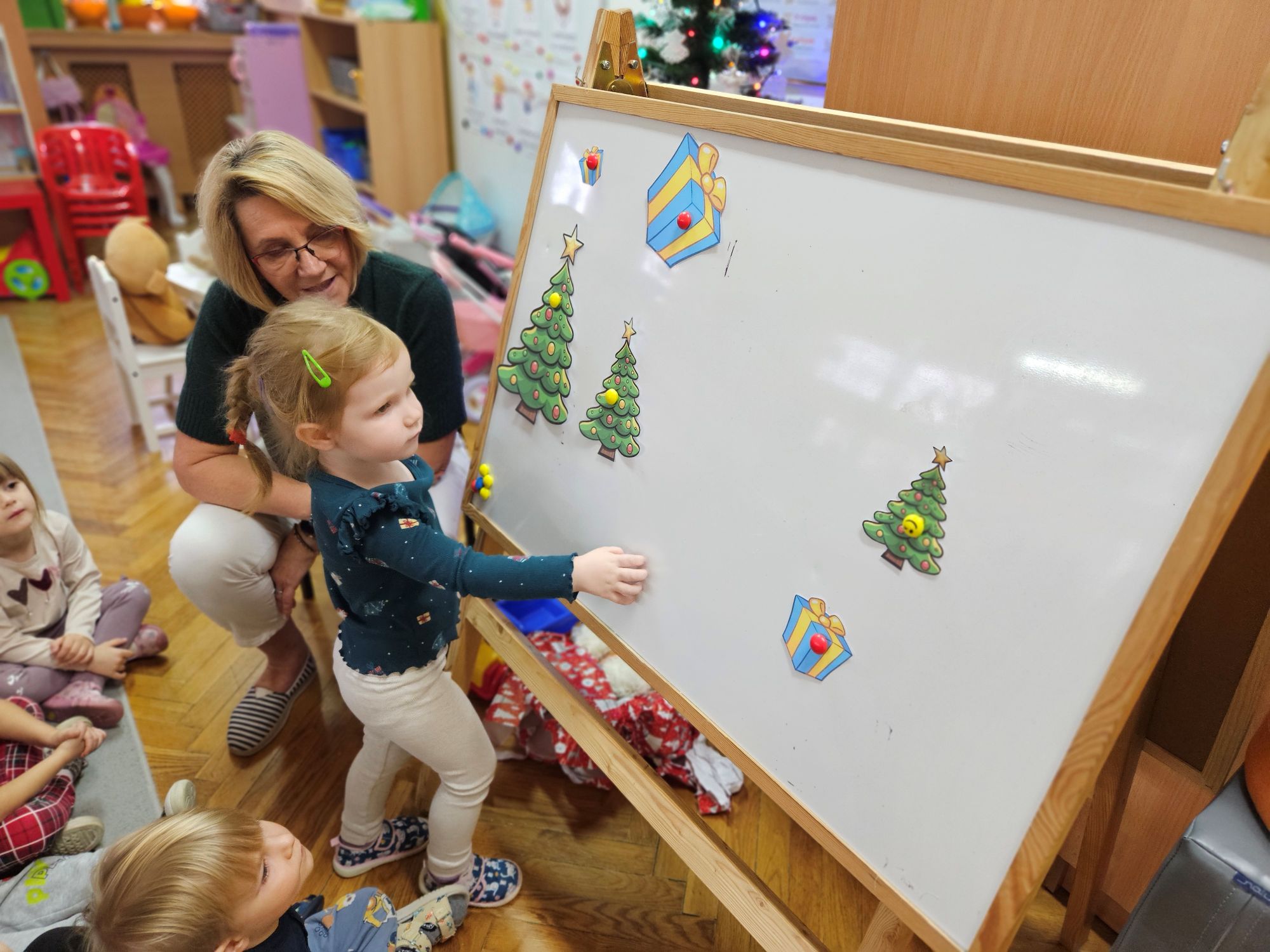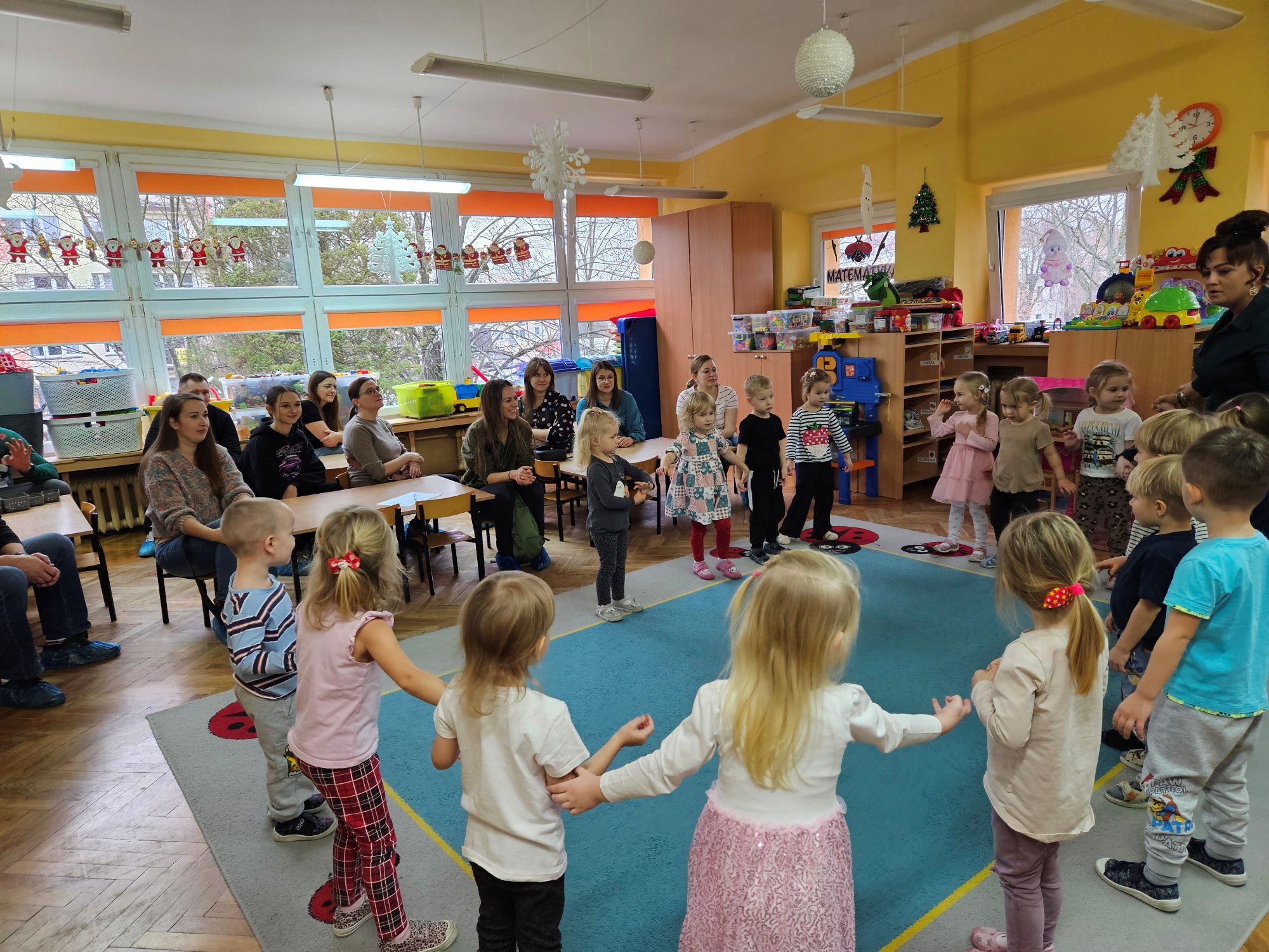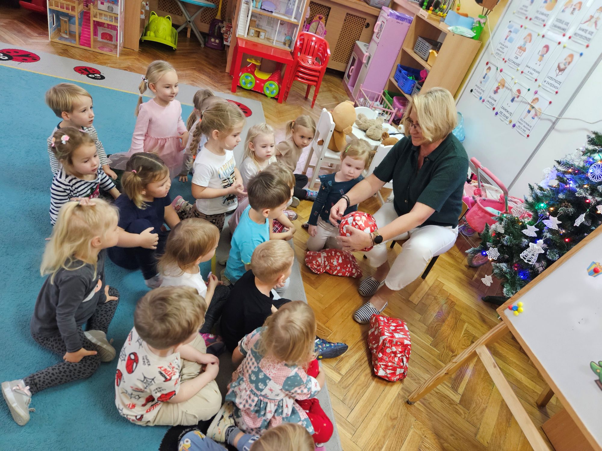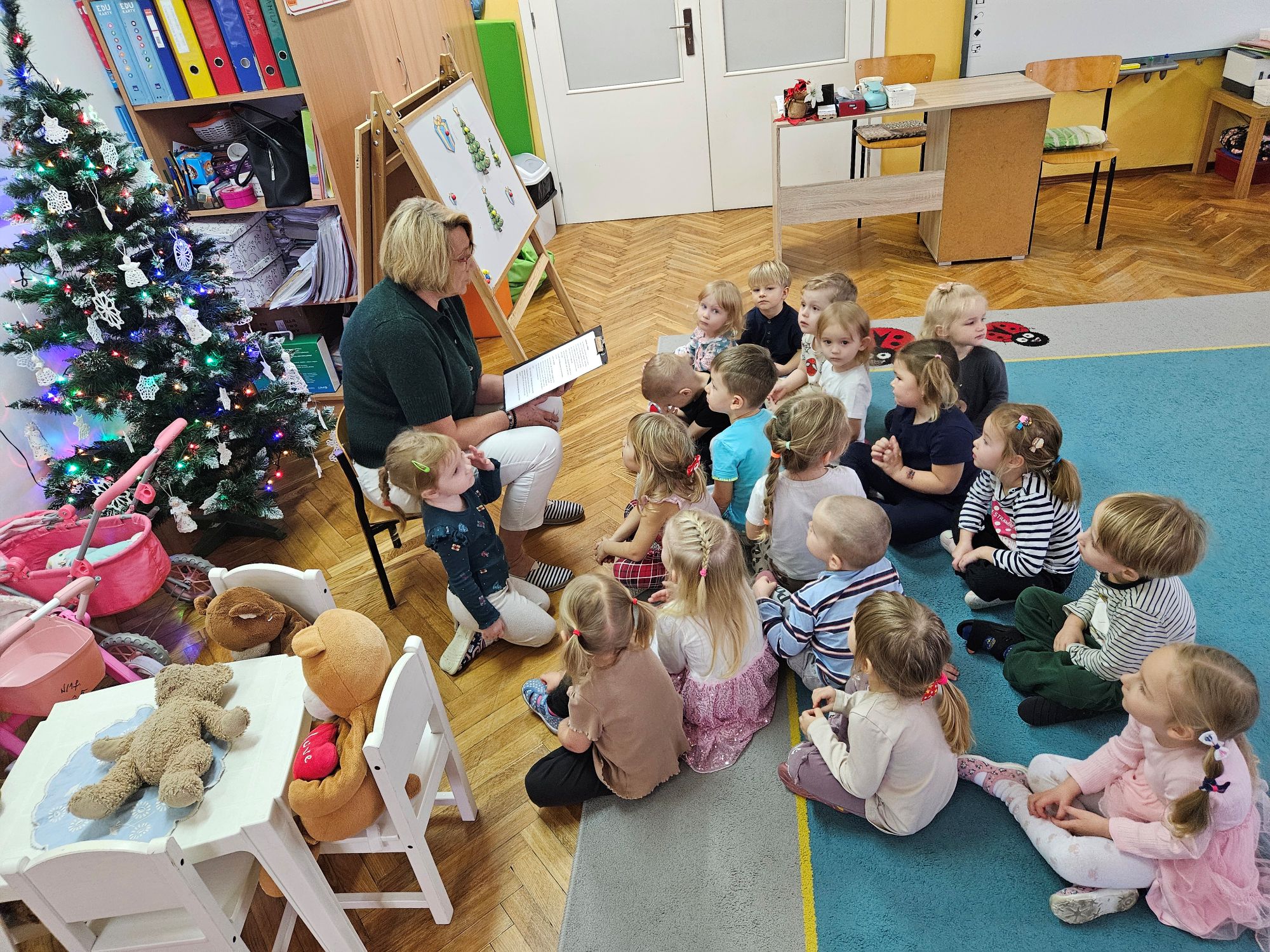 12 grudnia w grupie „Biedronek” odbyło się zajęcie otwarte i warsztaty dla rodziców pt. „Bajki pomagajki – krótka bajka o św. Mikołaju. Dzieci rozpoczęły zajęcia zabawą Powitanką , a potem zaprosiły swoich rodziców do wspólnych zabaw muzyczno – ruchowych "Chodzę sobie chodzę" oraz "Reniferowe zaprzęgi". Po wspólnej zabawie wszyscy wysłuchali bajki o przygotowaniach Mikołaja do świąt. Później dzieci miały za zadanie rozpoznać po kształcie zapakowane prezenty, ułożyć w odpowiedniej kolejności choinki i dopasować do nich prezenty. Po zabawie „Skacze piłka” nauczycielka zaprosiła wszystkich do wykonania prac odzwierciedlających przeczytane opowiadanie. Praca przyniosła wszystkim dużo radości a efekt był niesamowity. Serdecznie dziękujemy.