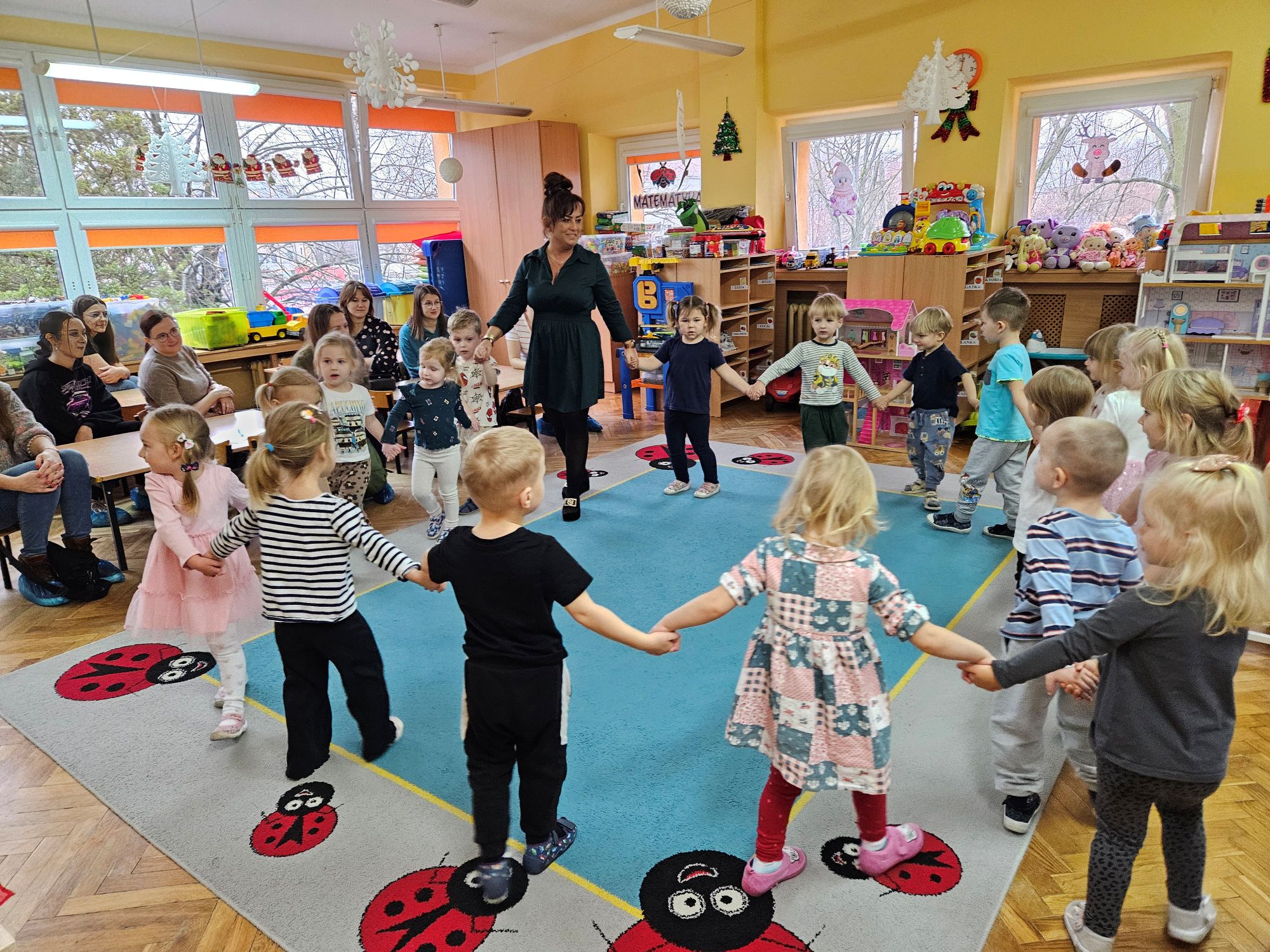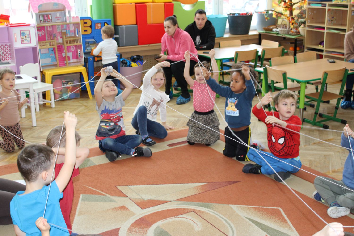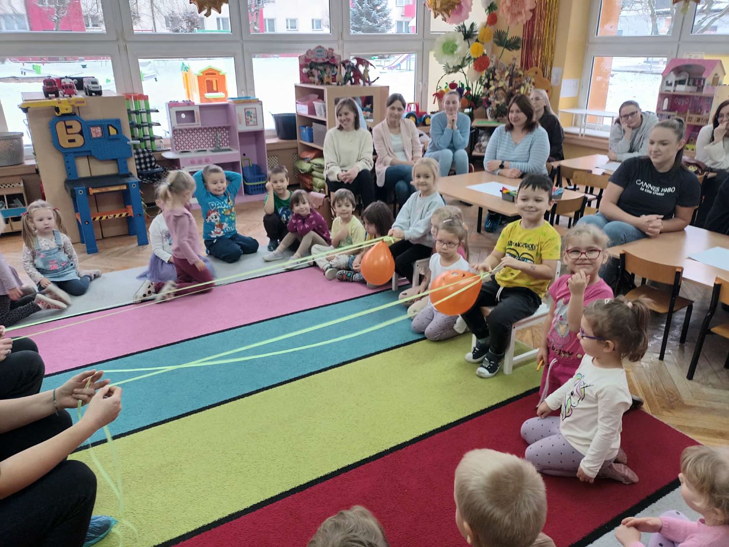 W dniu 27 listopada 2025 r. w grupie III „Żabek” odbyły się zajęcia otwarte dla rodziców pod hasłem „Bajki pomagajki”. Tematem spotkania była terapeutyczna „Bajka o Pajączku” autorstwa M. Molickiej, która stała się punktem wyjścia do rozmów o akceptacji, szacunku i budowaniu pozytywnych relacji między dziećmi. Spotkanie rozpoczęło się radosnym powitaniem „Iskierką przyjaźni”, a następnie dzieci zastanawiały się nad pytaniem: „Czy wszyscy jesteśmy tacy sami?”. Przy pomocy zestawu butów, rękawiczek i czapek w różnych rozmiarach odkrywały, że różnice są naturalne i nie świadczą o czyjejkolwiek wartości. Przedszkolaki uczyły się rozpoznawać zachowania pozytywne i negatywne, a także zastanawiały się nad tym, jak słowa i gesty mogą wpływać na drugiego człowieka. Nie zabrakło także ruchu – dzieci bawiły się przy piosence „Pajączki i jesień”. Centralnym punktem spotkania było wysłuchanie bajki terapeutycznej. Pięknym momentem była również „Pajęczynka przyjaźni” – zabawa, w której dzieci przekazywały sobie kłębek wełny, mówiąc sobie nawzajem coś miłego i wzmacniającego. Wspólna aktywność rodziców i dzieci zaowocowała także stworzeniem ilustracji do grupowej książeczki o Pajączku. Pod koniec warsztatów powstała „Pajęczyna Dobra” – dzieci przyklejali papierowe pajączki. Spotkanie zakończyło się podziękowaniem dla rodziców za obecność, współpracę i zaangażowanie. Jeszcze raz dziękujemy rodzicom za obecność i aktywne uczestnictwo w zajęciach.