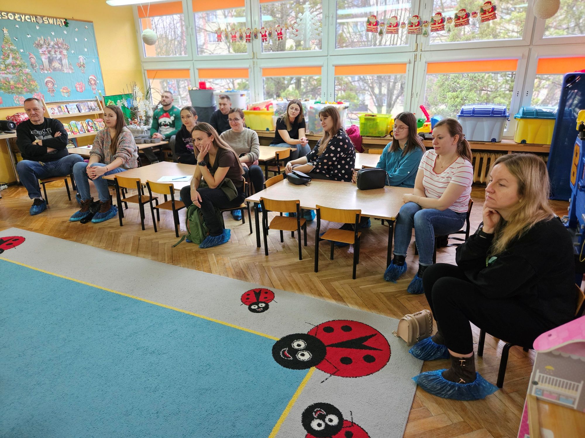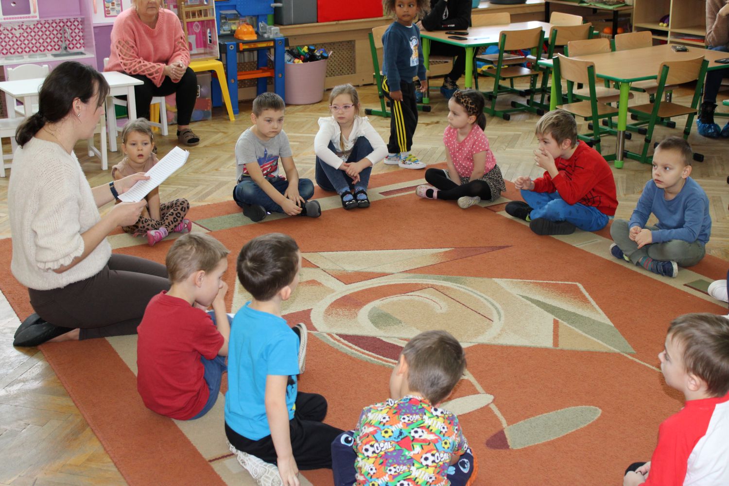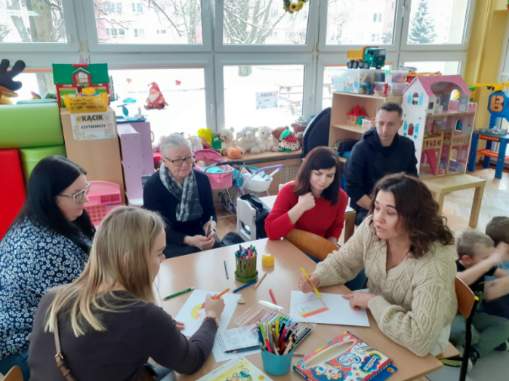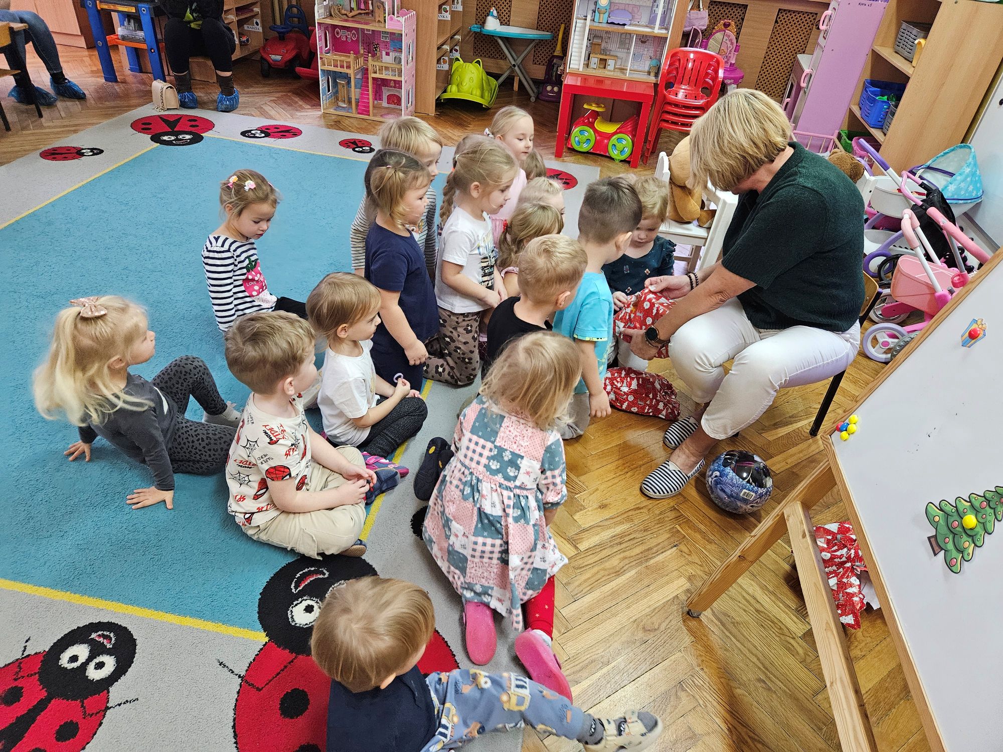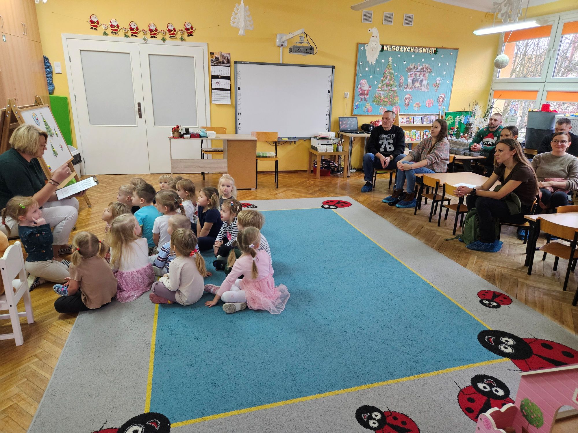 Tradycją naszego przedszkola i zarazem jedną z form współpracy z rodzicami jest prowadzenie zajęć otwartych. Możliwość uczestniczenia w tego rodzaju zajęciach daje rodzicom obraz pracy nauczyciela z dzieckiem, pokazuje stosowane metody i formy pracy oraz każdy z rodziców ma możliwość zaobserwowania swojego dziecka na tle grupy rówieśniczej. Grupa „ Krasnoludków” zaprosiła swoich rodziców na zajęcie i warsztaty w poniedziałek 24.11.2025 r. Tematem zajęcia było opowiadanie „ Markotek z wyspy Smutku” czyli poznawanie różnorodnych sposobów na radzenie sobie z emocjami, które są zbyt intensywne lub trwają za długo oraz dbanie o dobre samopoczucie i pozytywne relacje z innymi. Dzieci wypowiadały się na temat treści opowiadania, dowiedziały się, że wszystkie emocje – także trudne – są naturalne i potrzebne, tylko trzeba znaleźć sposób aby zapanować nad nimi. „ Krasnoludki” zaprosiły również swoich rodziców do wspólnej zabawy integracyjnej „ Gdy dopada smutek”. W drugiej części zajęcia rodzice tworzyli książeczkę nt. „Sposoby na smutek” - co pomaga dzieciom na smutek. Propozycje rodziców na pewno pomogą przedszkolakom w smutnych dla nich chwilach. Zajęcia przebiegły w miłej atmosferze, przedszkolaki chętnie pracowały pod kierunkiem nauczyciela oraz ze zrozumieniem słuchały poleceń. Dziękujemy rodzicom za to, iż mimo wielu obowiązków przybyli do przedszkola, aby towarzyszyć swoim dzieciom.
