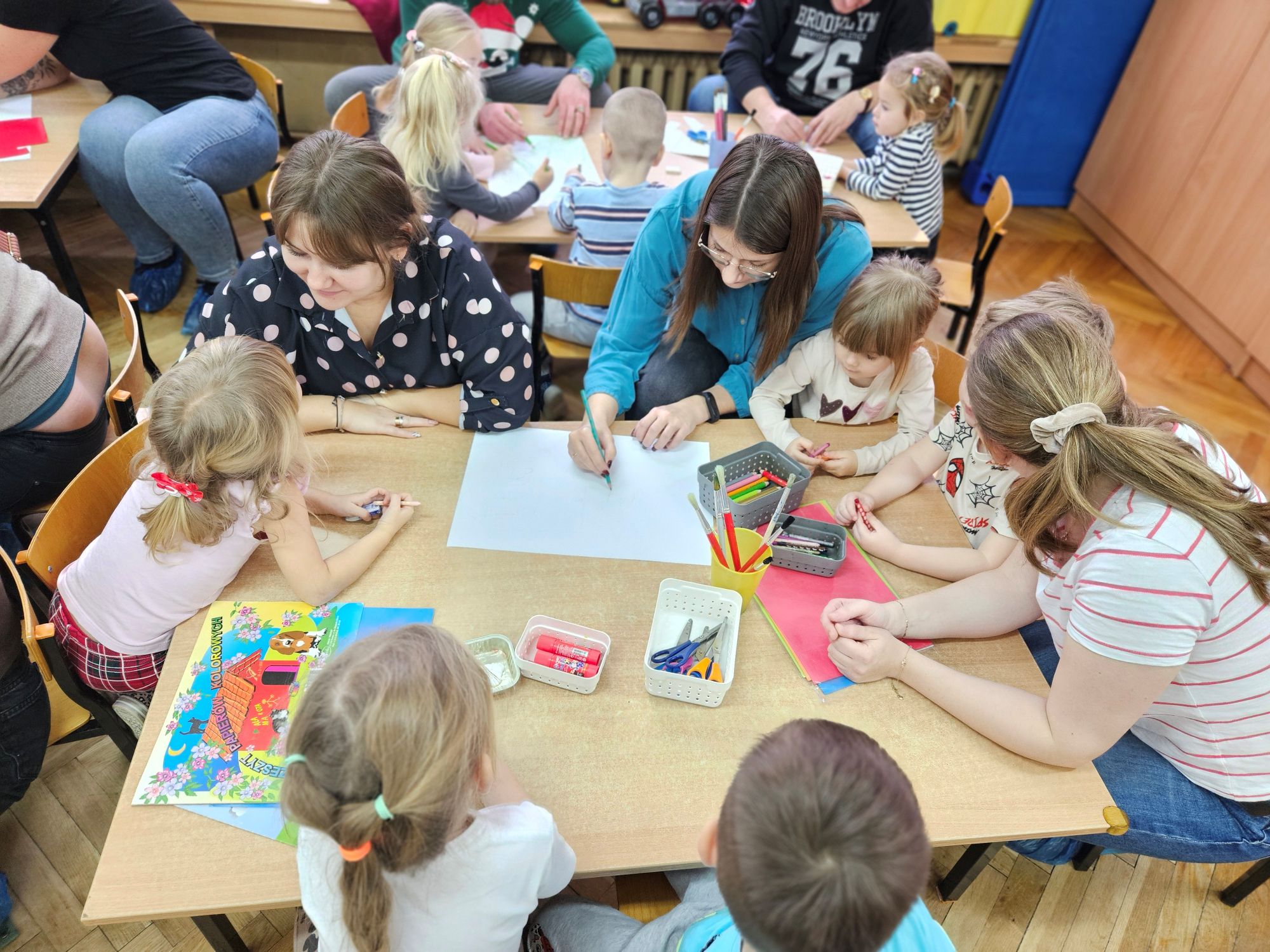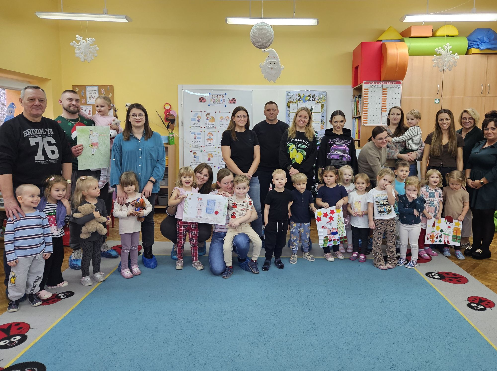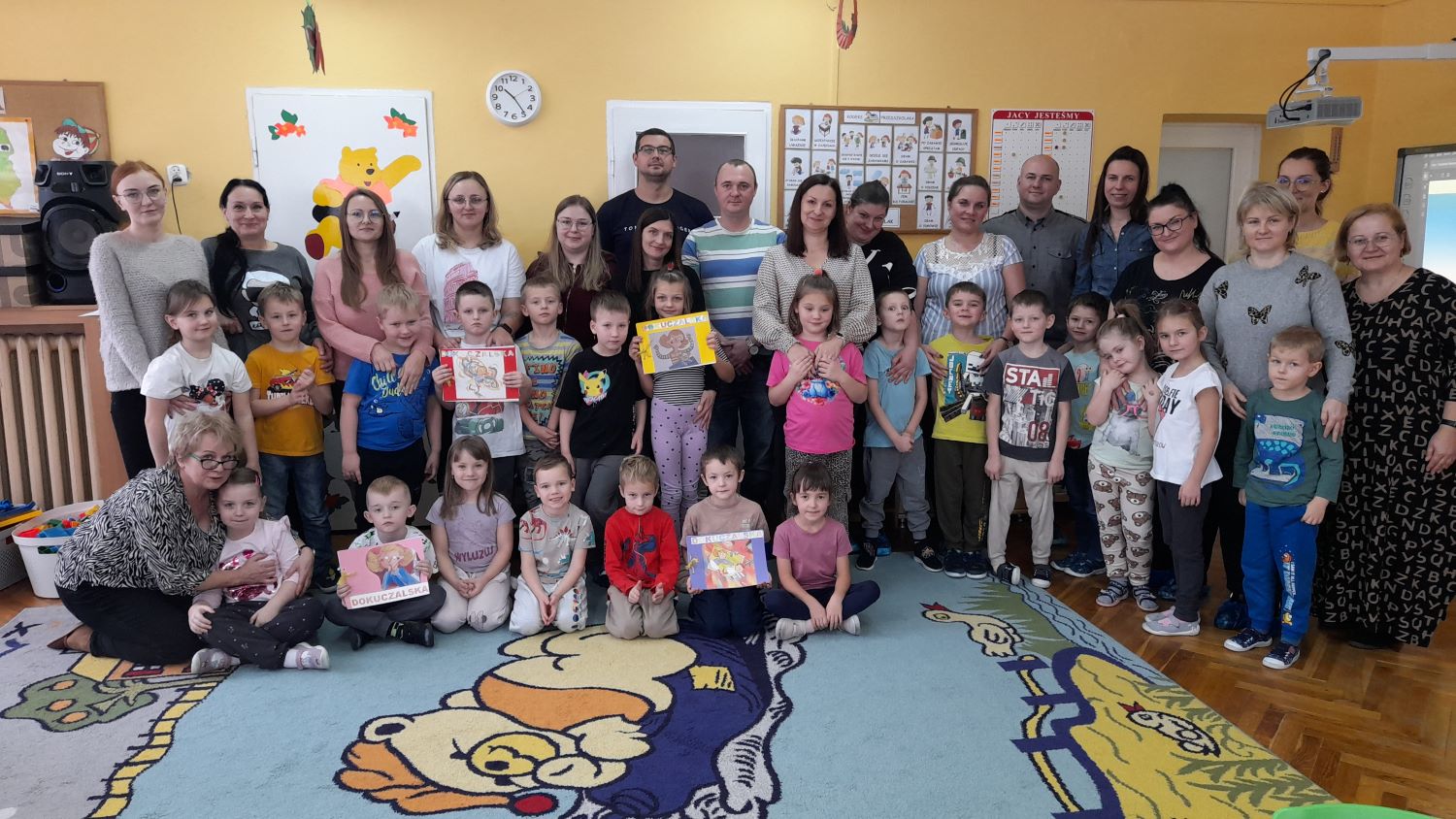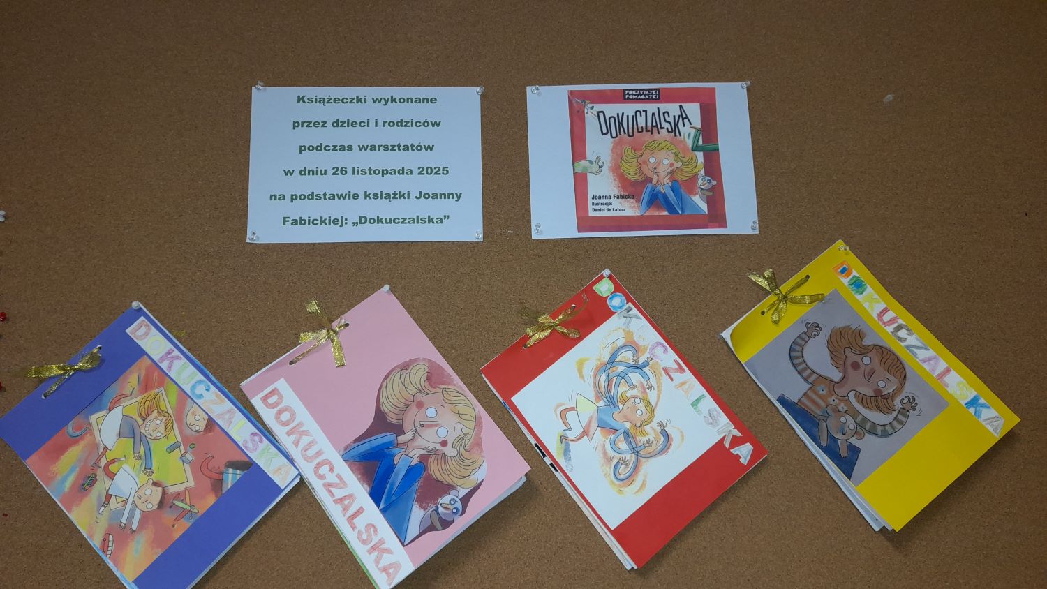 W środę, 26 listopada 2025 r. w grupie „Misiaczków”odbyły się zajęcia otwarte, podczas których dzieci z wraz z Rodzicami wyruszyły w literacko - plastyczną podróż inspirowaną książką Joanny Fabickiej: „Dokuczalska”. Po krótkim wprowadzeniu przez Panią Beatę w tematykę zajęć, jeden z rodziców chętnie zgłosił się do przeczytania książki. Dzieci z radością słuchały treści opowieści, angażując się w historię i losy bohaterów. W trakcie czytania przedszkolaki z zaciekawieniem oglądały prezentowane ilustracje. „Misiaczki” chętnie zgłaszały się do odpowiedzi na pytania dotyczące wysłuchanej historii, dzieląc się swoimi spostrzeżeniami na temat bohaterów utworu. Kolejnym punktem zajęć było obejrzenie krótkiego filmiku edukacyjnego z kampanii Cartoon Network z Robertem Lewandowskim „Bądź kumplem, nie dokuczaj”, który pomógł dzieciom jeszcze lepiej zrozumieć, jak ważne jest życzliwe traktowanie innych i dobre relacje rówieśnicze. Następnym elementem zajęć było wspólne zaśpiewanie piosenki: „Świat emocji”. W czasie zabaw ruchowych „Misiaczki” pokazywały za pomocą mimiki i gestów takie uczucia jak: radość, smutek, złość i strach. Najbardziej twórczą częścią zajęć było wspólne przygotowanie ilustracji do własnych, autorskich książeczek. W atmosferze skupienia i radości „Misiaczki” wraz z Rodzicami z zapałem ilustrowały treść opowiadania, tworząc kolorowe obrazki, które – z niewielką pomocą dorosłych – zamieniały się w piękne, małe dzieła sztuki. Wspólna praca przyniosła wiele satysfakcji, dzieci chętnie składały razem swoje ilustracje i okładki, tworząc barwne książeczki. Każdy zespół z dumą demonstrował swoje dzieła. Na zakończenie wszyscy uczestnicy – dzieci, rodzice i panie – pozowali do wspólnego, pamiątkowego zdjęcia. Książeczki wykonane podczas zajęć, będące pięknym dowodem kreatywności i współpracy, zostały umieszczone na tablicy grupy Misiaczków, a później zostaną włączone do biblioteczki w sali, by dzieci mogły korzystać na co dzień z efektów swojej pracy.