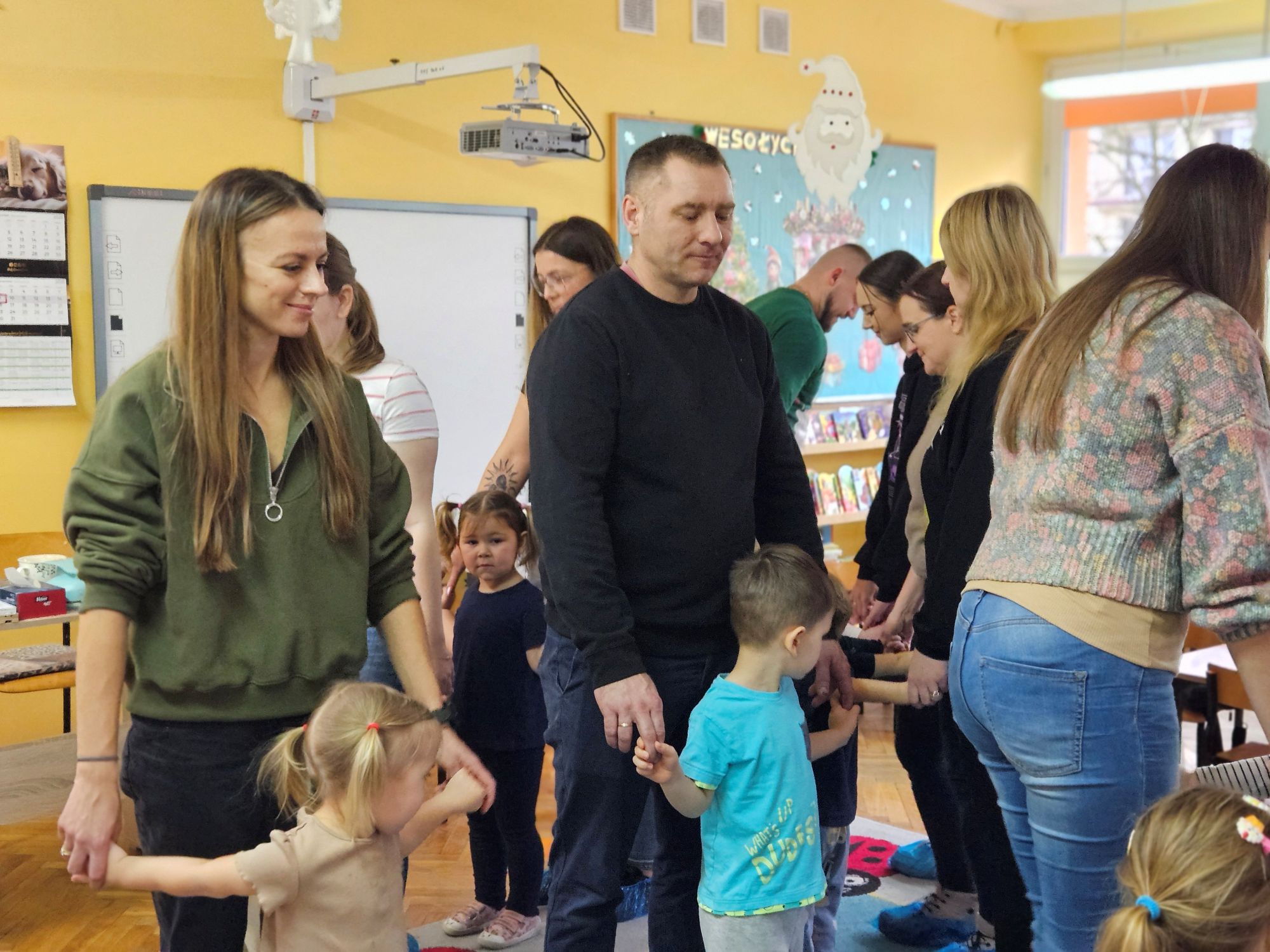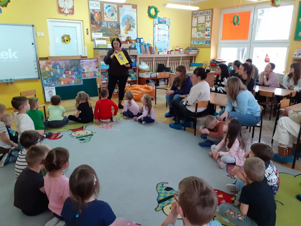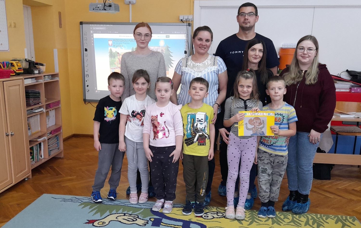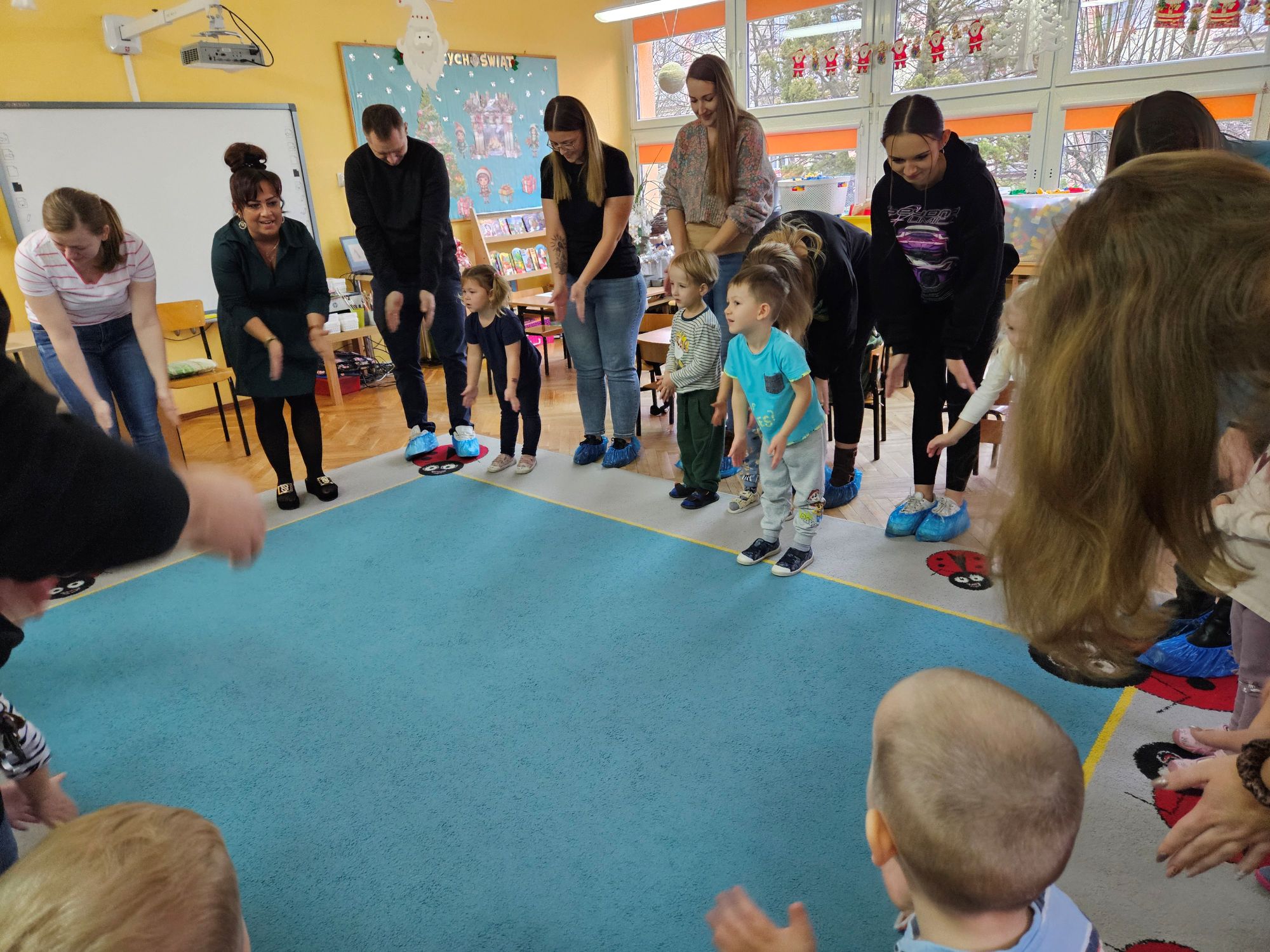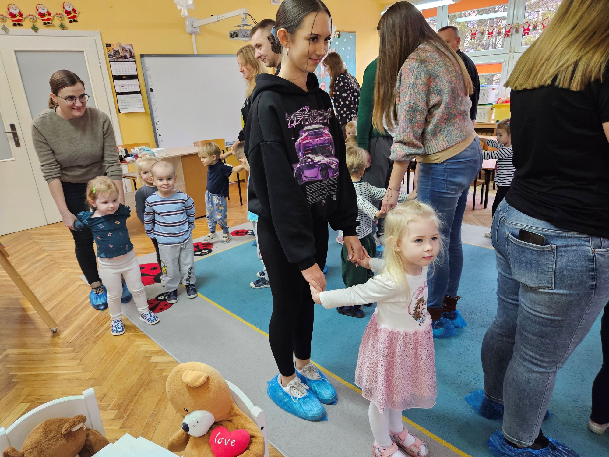 W środę, 26 listopada 2025 r. w grupie „Misiaczków”odbyły się zajęcia otwarte, podczas których dzieci z wraz z Rodzicami wyruszyły w literacko - plastyczną podróż inspirowaną książką Joanny Fabickiej: „Dokuczalska”. Po krótkim wprowadzeniu przez Panią Beatę w tematykę zajęć, jeden z rodziców chętnie zgłosił się do przeczytania książki. Dzieci z radością słuchały treści opowieści, angażując się w historię i losy bohaterów. W trakcie czytania przedszkolaki z zaciekawieniem oglądały prezentowane ilustracje. „Misiaczki” chętnie zgłaszały się do odpowiedzi na pytania dotyczące wysłuchanej historii, dzieląc się swoimi spostrzeżeniami na temat bohaterów utworu. Kolejnym punktem zajęć było obejrzenie krótkiego filmiku edukacyjnego z kampanii Cartoon Network z Robertem Lewandowskim „Bądź kumplem, nie dokuczaj”, który pomógł dzieciom jeszcze lepiej zrozumieć, jak ważne jest życzliwe traktowanie innych i dobre relacje rówieśnicze. Następnym elementem zajęć było wspólne zaśpiewanie piosenki: „Świat emocji”. W czasie zabaw ruchowych „Misiaczki” pokazywały za pomocą mimiki i gestów takie uczucia jak: radość, smutek, złość i strach. Najbardziej twórczą częścią zajęć było wspólne przygotowanie ilustracji do własnych, autorskich książeczek. W atmosferze skupienia i radości „Misiaczki” wraz z Rodzicami z zapałem ilustrowały treść opowiadania, tworząc kolorowe obrazki, które – z niewielką pomocą dorosłych – zamieniały się w piękne, małe dzieła sztuki. Wspólna praca przyniosła wiele satysfakcji, dzieci chętnie składały razem swoje ilustracje i okładki, tworząc barwne książeczki. Każdy zespół z dumą demonstrował swoje dzieła. Na zakończenie wszyscy uczestnicy – dzieci, rodzice i panie – pozowali do wspólnego, pamiątkowego zdjęcia. Książeczki wykonane podczas zajęć, będące pięknym dowodem kreatywności i współpracy, zostały umieszczone na tablicy grupy Misiaczków, a później zostaną włączone do biblioteczki w sali, by dzieci mogły korzystać na co dzień z efektów swojej pracy.
