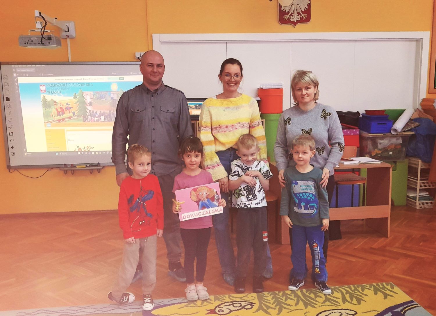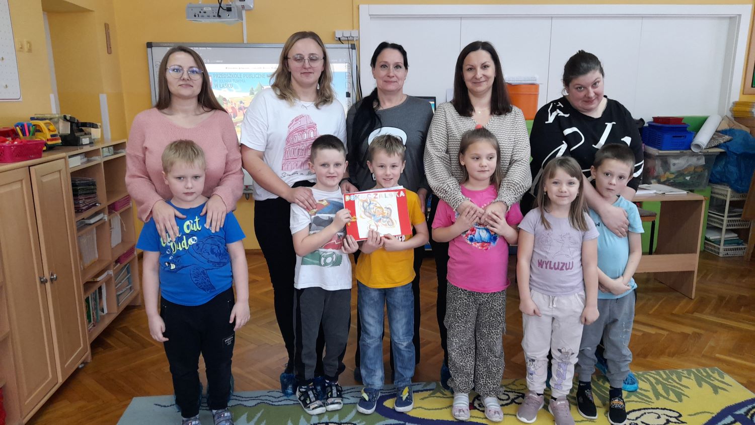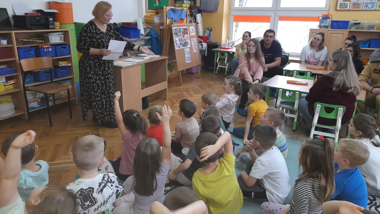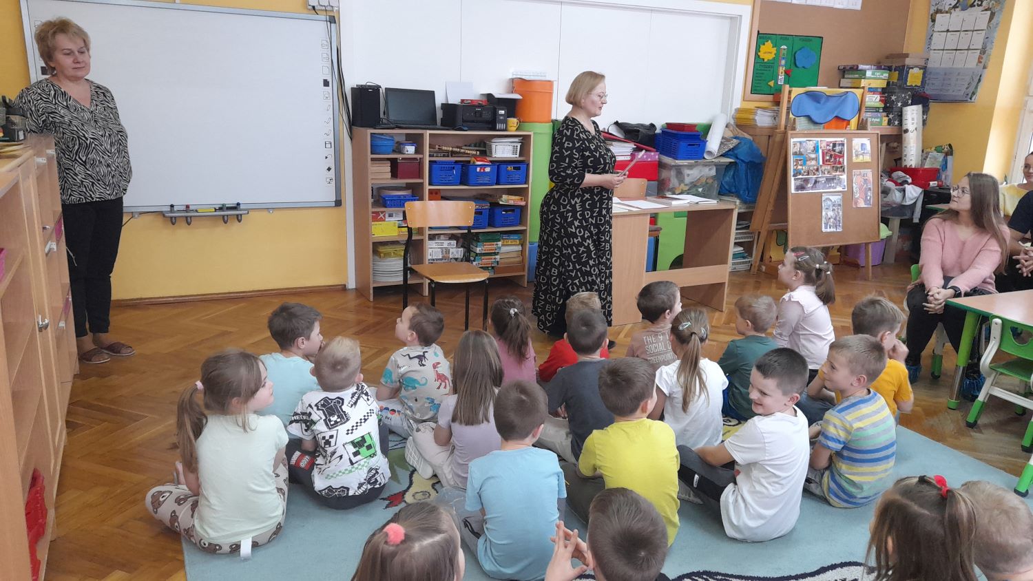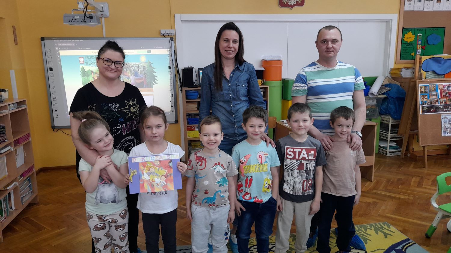 W środę, 26 listopada 2025 r. w grupie „Misiaczków”odbyły się zajęcia otwarte, podczas których dzieci z wraz z Rodzicami wyruszyły w literacko - plastyczną podróż inspirowaną książką Joanny Fabickiej: „Dokuczalska”. Po krótkim wprowadzeniu przez Panią Beatę w tematykę zajęć, jeden z rodziców chętnie zgłosił się do przeczytania książki. Dzieci z radością słuchały treści opowieści, angażując się w historię i losy bohaterów. W trakcie czytania przedszkolaki z zaciekawieniem oglądały prezentowane ilustracje. „Misiaczki” chętnie zgłaszały się do odpowiedzi na pytania dotyczące wysłuchanej historii, dzieląc się swoimi spostrzeżeniami na temat bohaterów utworu. Kolejnym punktem zajęć było obejrzenie krótkiego filmiku edukacyjnego z kampanii Cartoon Network z Robertem Lewandowskim „Bądź kumplem, nie dokuczaj”, który pomógł dzieciom jeszcze lepiej zrozumieć, jak ważne jest życzliwe traktowanie innych i dobre relacje rówieśnicze. Następnym elementem zajęć było wspólne zaśpiewanie piosenki: „Świat emocji”. W czasie zabaw ruchowych „Misiaczki” pokazywały za pomocą mimiki i gestów takie uczucia jak: radość, smutek, złość i strach. Najbardziej twórczą częścią zajęć było wspólne przygotowanie ilustracji do własnych, autorskich książeczek. W atmosferze skupienia i radości „Misiaczki” wraz z Rodzicami z zapałem ilustrowały treść opowiadania, tworząc kolorowe obrazki, które – z niewielką pomocą dorosłych – zamieniały się w piękne, małe dzieła sztuki. Wspólna praca przyniosła wiele satysfakcji, dzieci chętnie składały razem swoje ilustracje i okładki, tworząc barwne książeczki. Każdy zespół z dumą demonstrował swoje dzieła. Na zakończenie wszyscy uczestnicy – dzieci, rodzice i panie – pozowali do wspólnego, pamiątkowego zdjęcia. Książeczki wykonane podczas zajęć, będące pięknym dowodem kreatywności i współpracy, zostały umieszczone na tablicy grupy Misiaczków, a później zostaną włączone do biblioteczki w sali, by dzieci mogły korzystać na co dzień z efektów swojej pracy.