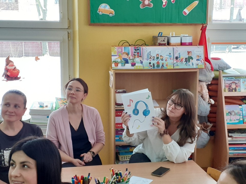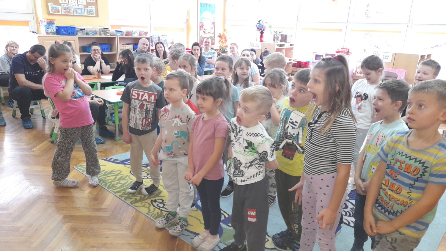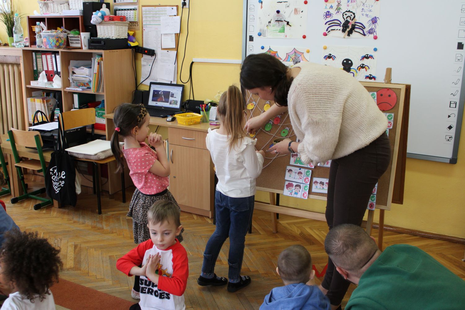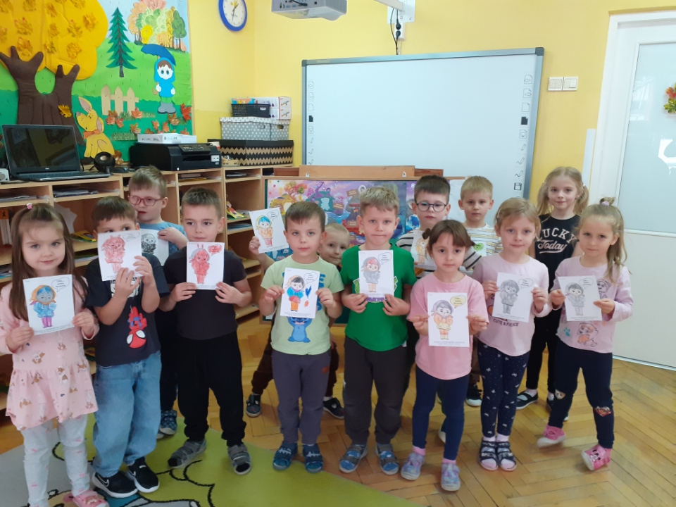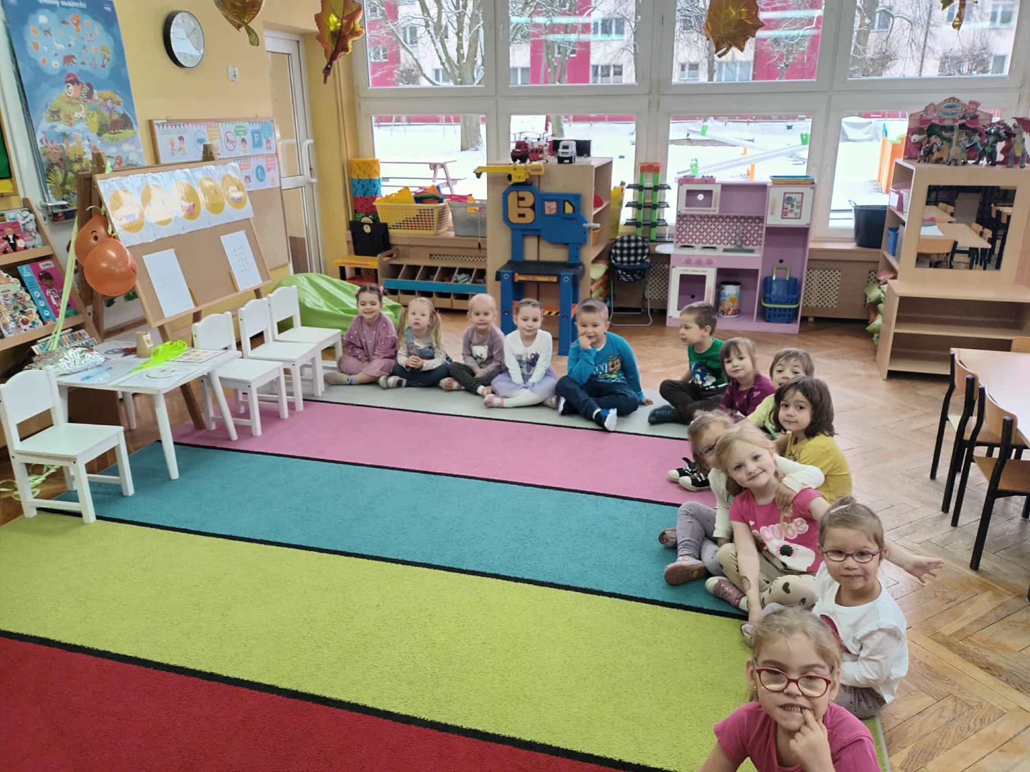 W środę, 26 listopada 2025 r. w grupie „Misiaczków”odbyły się zajęcia otwarte, podczas których dzieci z wraz z Rodzicami wyruszyły w literacko - plastyczną podróż inspirowaną książką Joanny Fabickiej: „Dokuczalska”. Po krótkim wprowadzeniu przez Panią Beatę w tematykę zajęć, jeden z rodziców chętnie zgłosił się do przeczytania książki. Dzieci z radością słuchały treści opowieści, angażując się w historię i losy bohaterów. W trakcie czytania przedszkolaki z zaciekawieniem oglądały prezentowane ilustracje. „Misiaczki” chętnie zgłaszały się do odpowiedzi na pytania dotyczące wysłuchanej historii, dzieląc się swoimi spostrzeżeniami na temat bohaterów utworu. Kolejnym punktem zajęć było obejrzenie krótkiego filmiku edukacyjnego z kampanii Cartoon Network z Robertem Lewandowskim „Bądź kumplem, nie dokuczaj”, który pomógł dzieciom jeszcze lepiej zrozumieć, jak ważne jest życzliwe traktowanie innych i dobre relacje rówieśnicze. Następnym elementem zajęć było wspólne zaśpiewanie piosenki: „Świat emocji”. W czasie zabaw ruchowych „Misiaczki” pokazywały za pomocą mimiki i gestów takie uczucia jak: radość, smutek, złość i strach. Najbardziej twórczą częścią zajęć było wspólne przygotowanie ilustracji do własnych, autorskich książeczek. W atmosferze skupienia i radości „Misiaczki” wraz z Rodzicami z zapałem ilustrowały treść opowiadania, tworząc kolorowe obrazki, które – z niewielką pomocą dorosłych – zamieniały się w piękne, małe dzieła sztuki. Wspólna praca przyniosła wiele satysfakcji, dzieci chętnie składały razem swoje ilustracje i okładki, tworząc barwne książeczki. Każdy zespół z dumą demonstrował swoje dzieła. Na zakończenie wszyscy uczestnicy – dzieci, rodzice i panie – pozowali do wspólnego, pamiątkowego zdjęcia. Książeczki wykonane podczas zajęć, będące pięknym dowodem kreatywności i współpracy, zostały umieszczone na tablicy grupy Misiaczków, a później zostaną włączone do biblioteczki w sali, by dzieci mogły korzystać na co dzień z efektów swojej pracy.