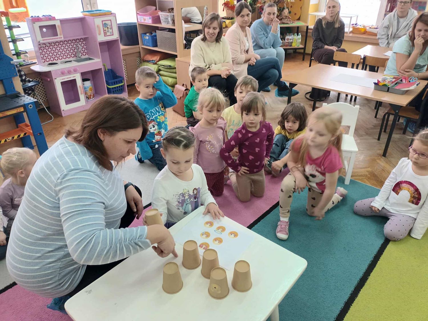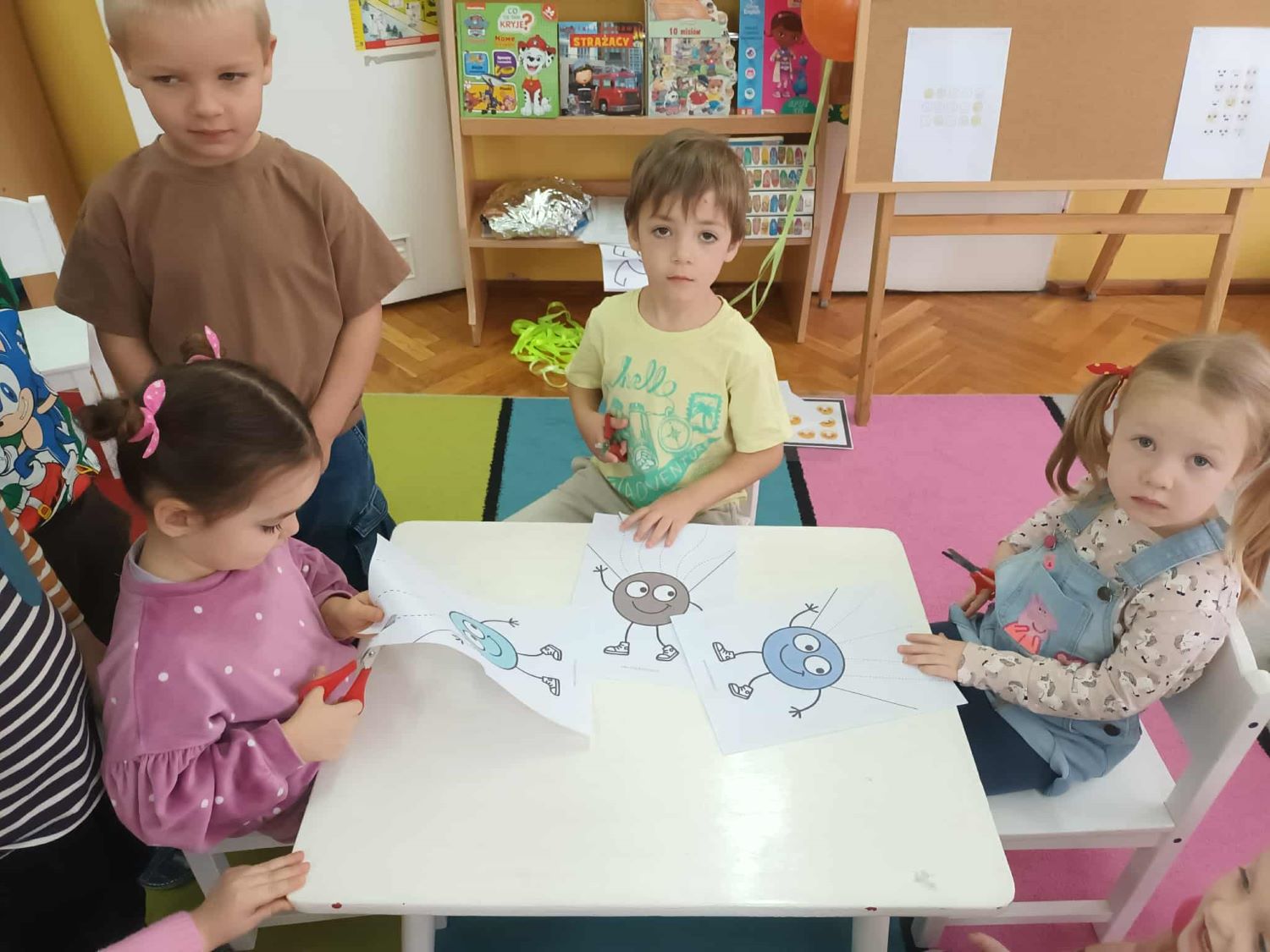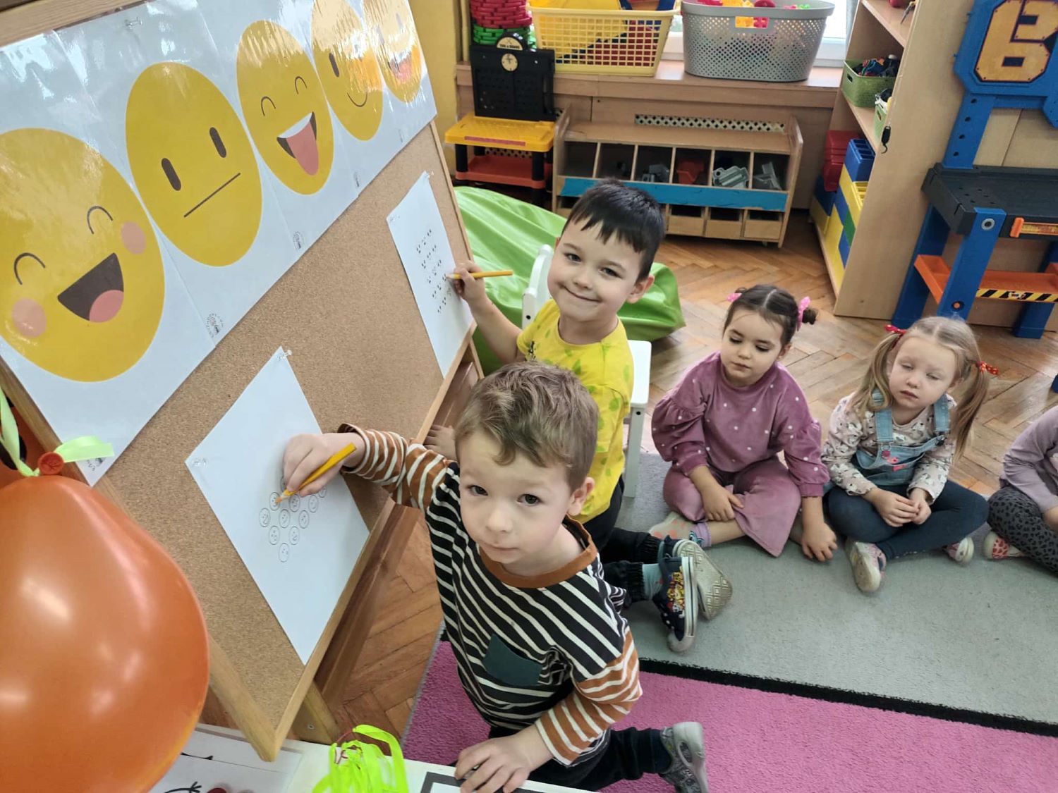 24.11.2025 r -Jesienne warsztaty z rodzicami rozpoczęły przedszkolaki z grupy „”Słoneczka”. Dzieci powitały rodziców rozmową o emocjach pozytywnych i negatywnych. Następnie ułożyły puzzle XXL i odnalazły właściwy obrazek do nich. Sprawdziły swoją spostrzegawczość podczas odnajdywania wesołej emotki, ścigały się w przeciąganiu wesołych balonów. Wykazały się dużym skupieniem uwagi podczas układania kubeczkowych piramid według wzoru. Trudnym zadaniem na współpracę z dorosłym okazało się budowanie wieży z kubków przy pomocy sznurków na gumce. Wycinanie to nie jest najmocniejsza strona maluchów, ale przy strzyżeniu wesołych emotek wyszło im to nawet sprawnie. Pani Renia zaskoczyła dzieci niespodzianką –wesołymi ciasteczkami, które umiliły słuchanie opowiadania Jerzego Jarka pt.”Bajka o kłótliwej Emilce”. Do tego opowiadania dzieci wspólnie z rodzicami stworzyli w zespołach 4 ilustracje, które mają przypominać dzieciom, że lepsza od kłótni jest współpraca.